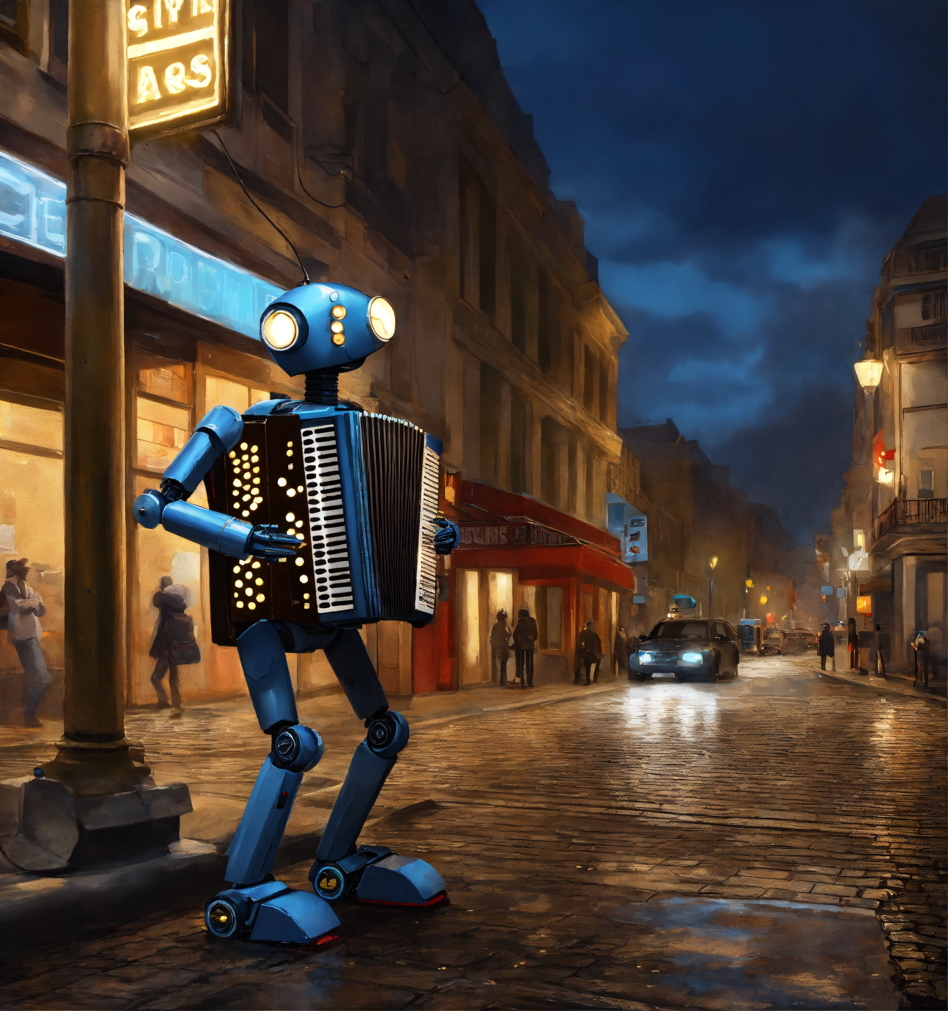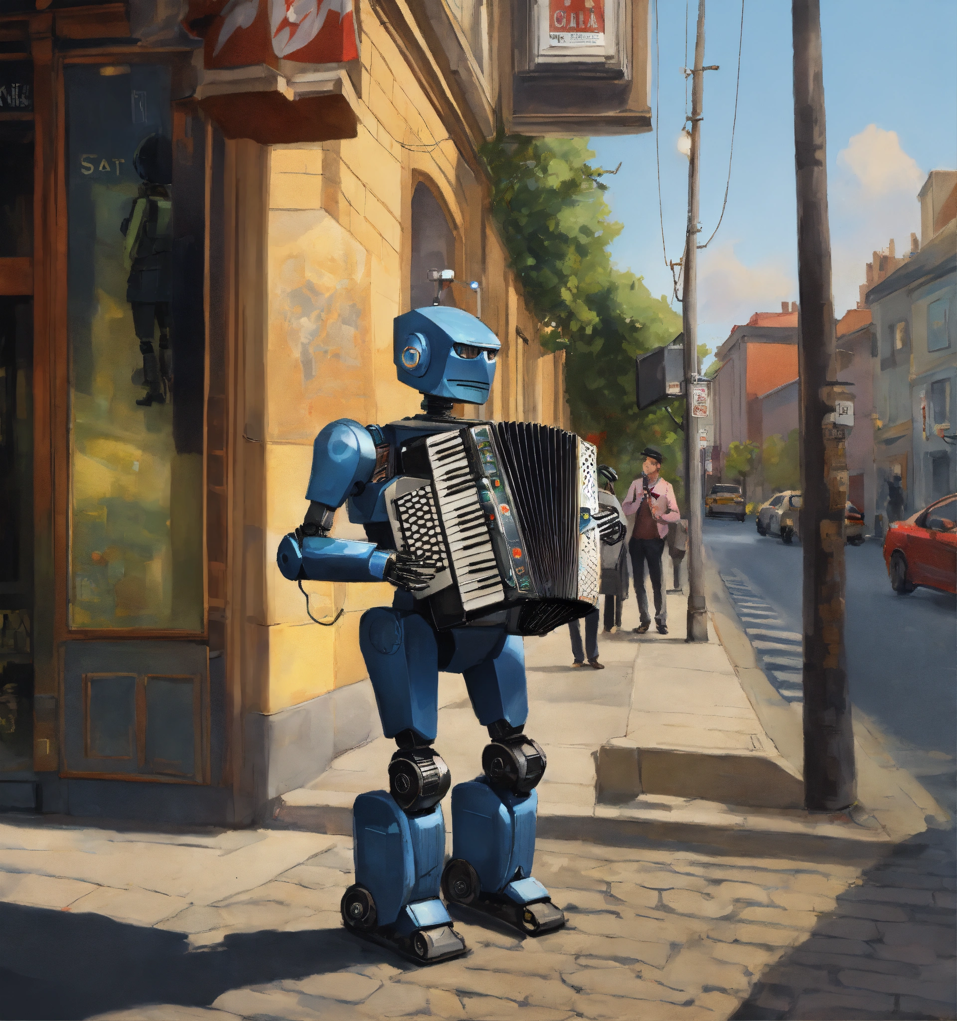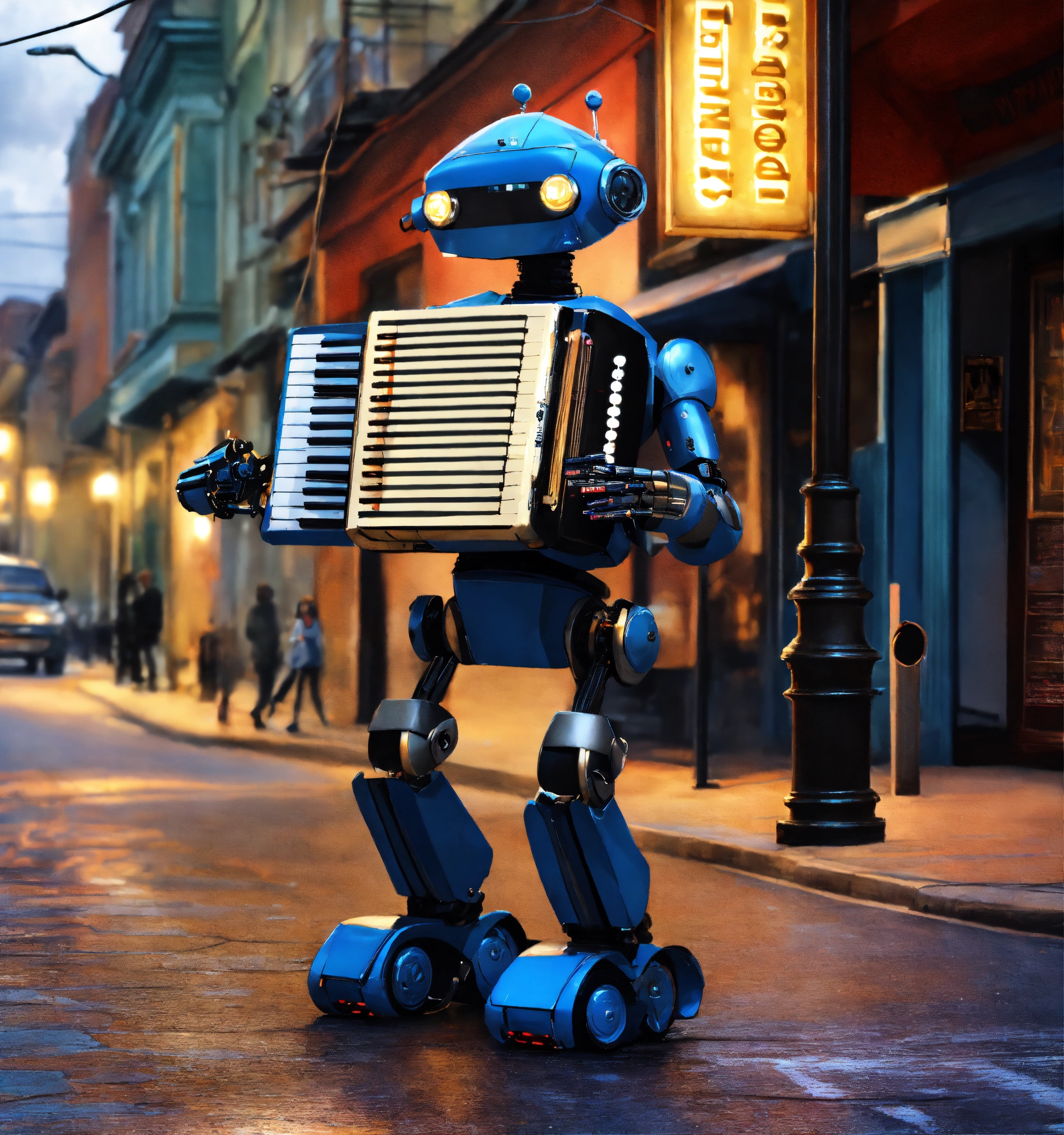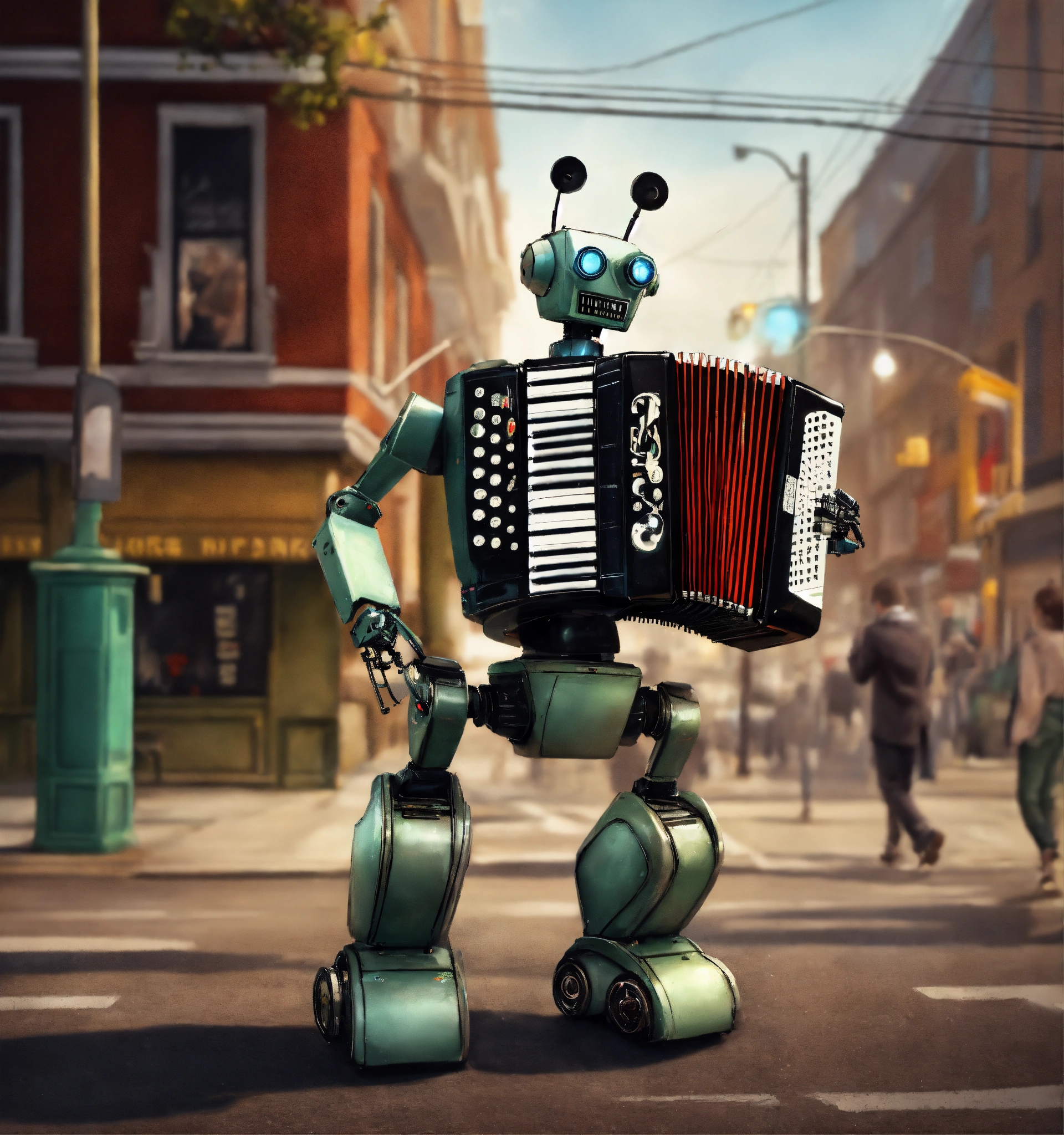A robot playing an electric accordion on a street corner realism
