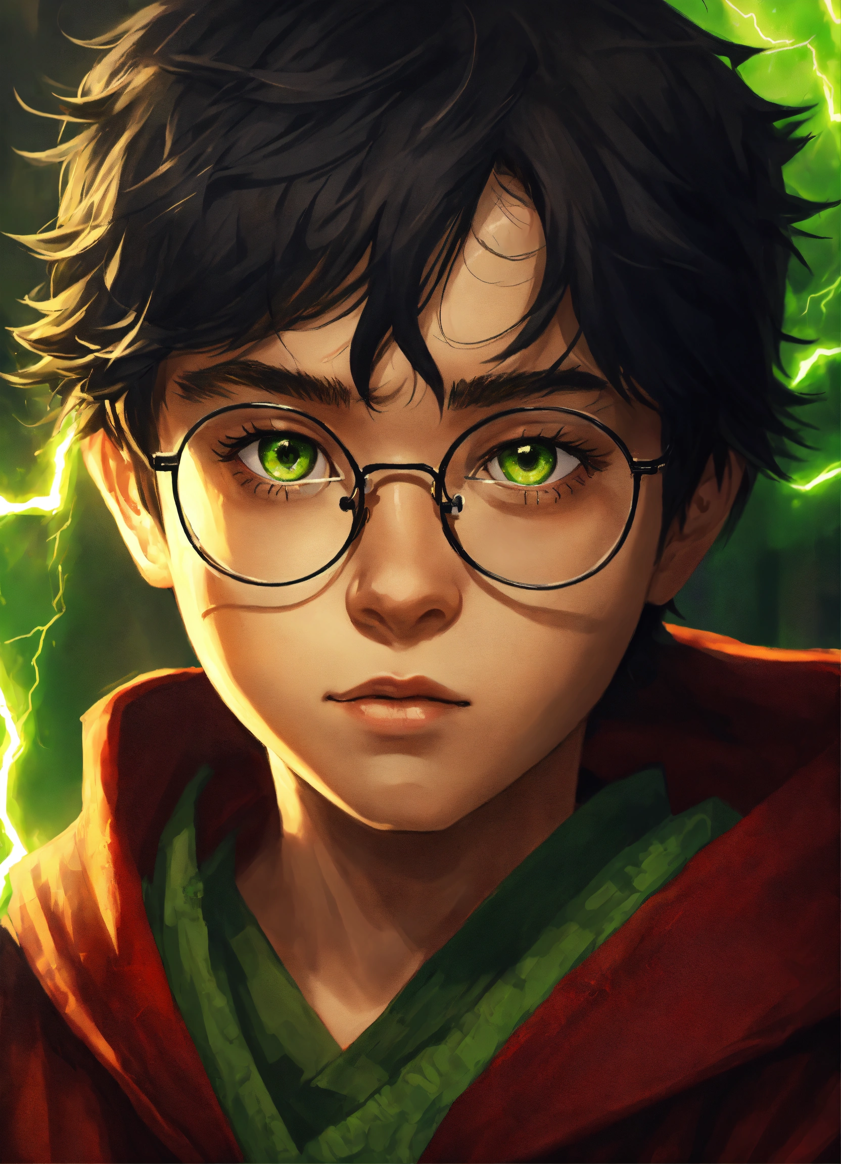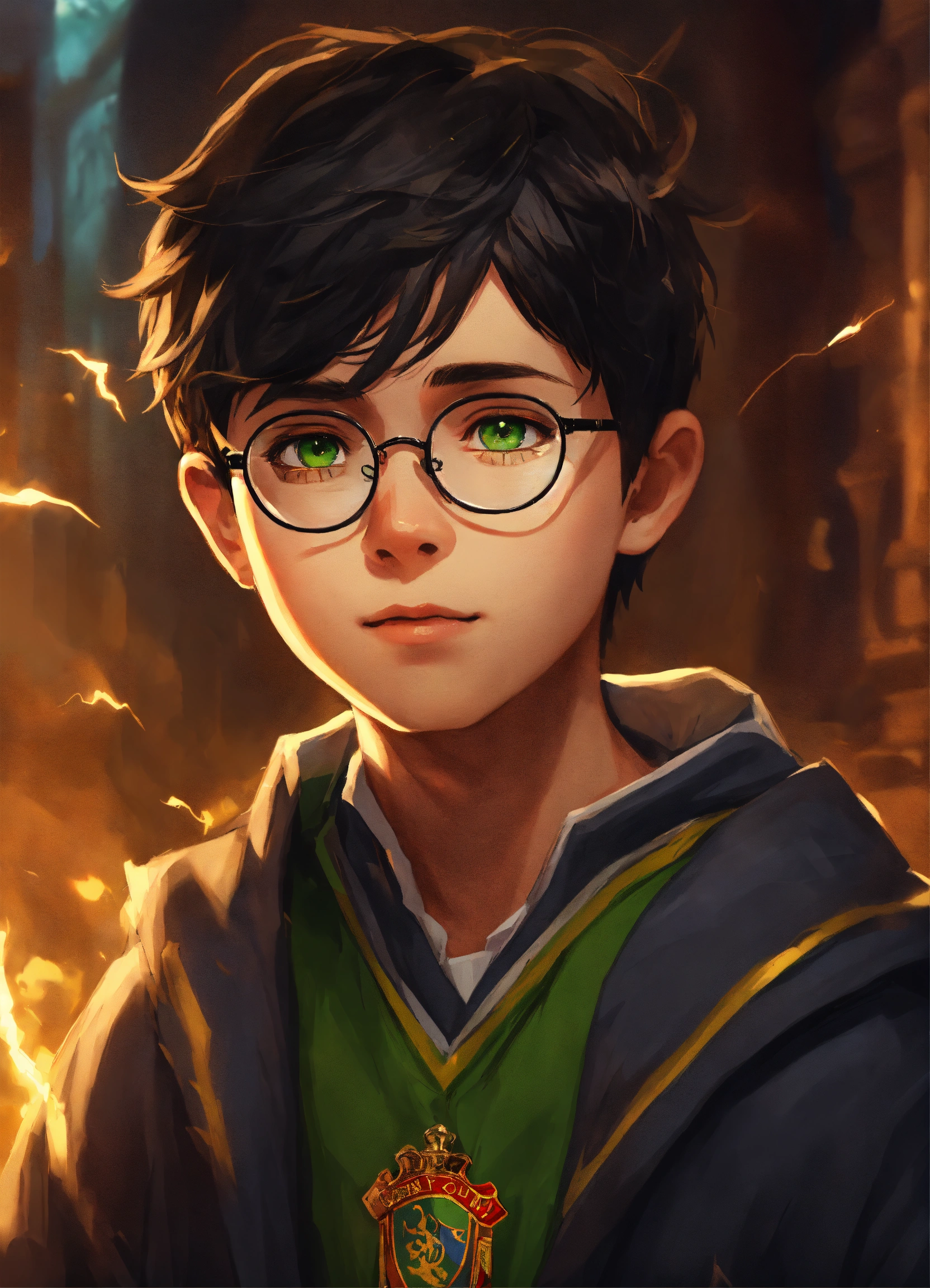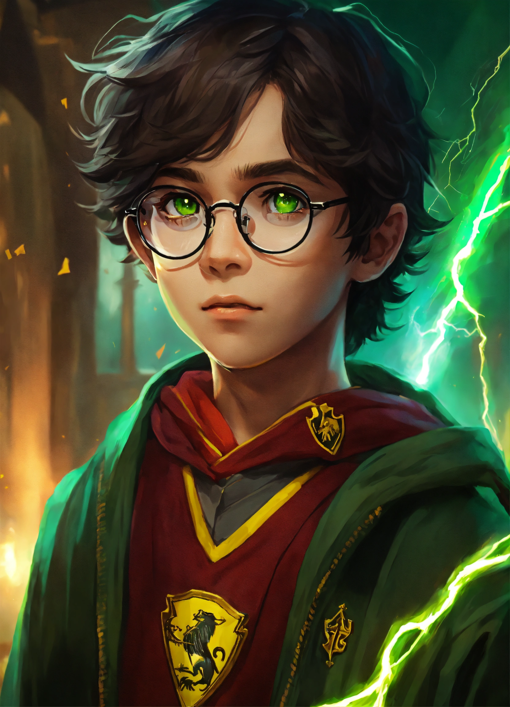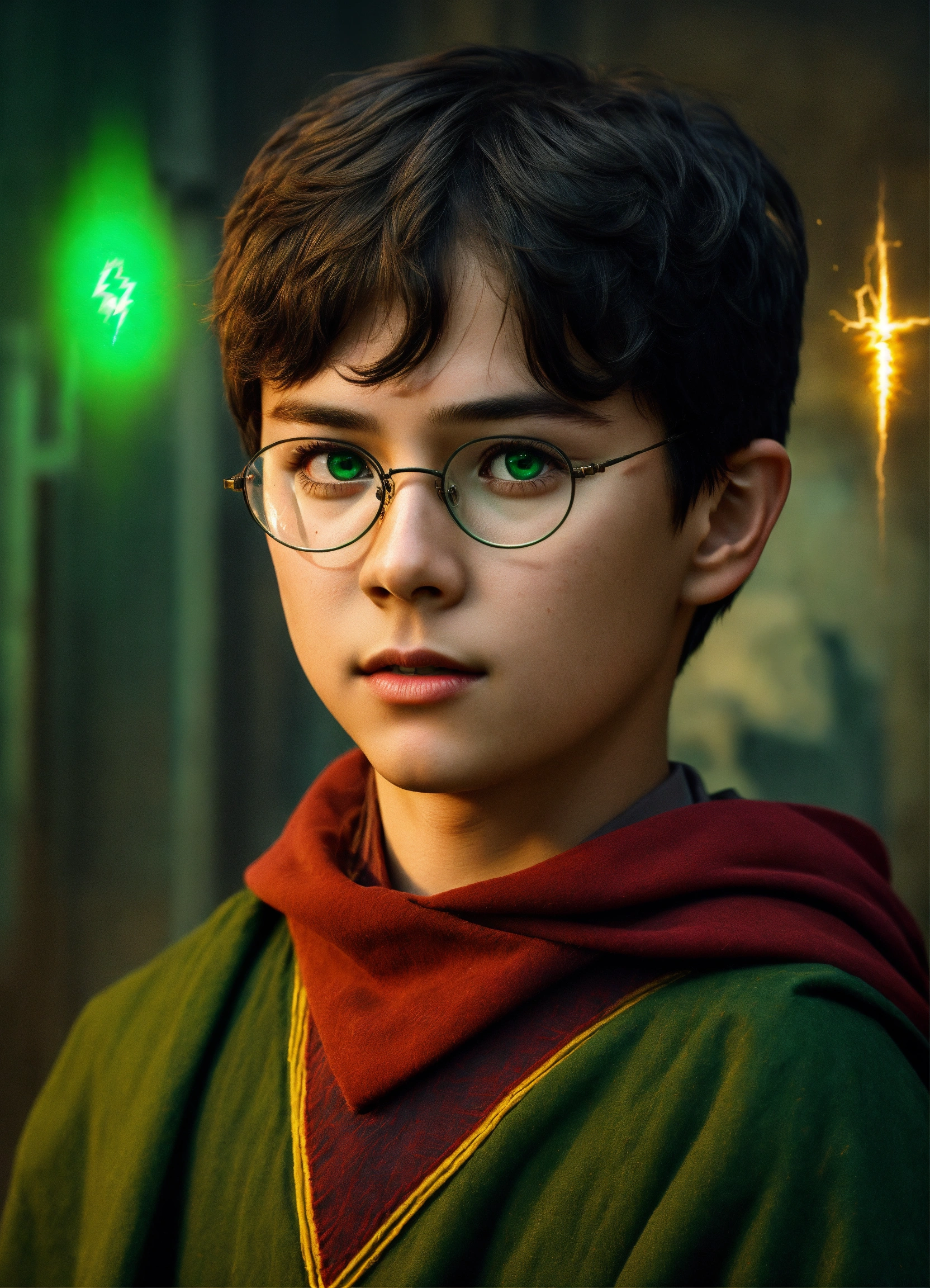 11-year-old male, untidy black hair, bright green eyes, thin face, round rimmed glasses, lightning scar on his forehead, gryffindor