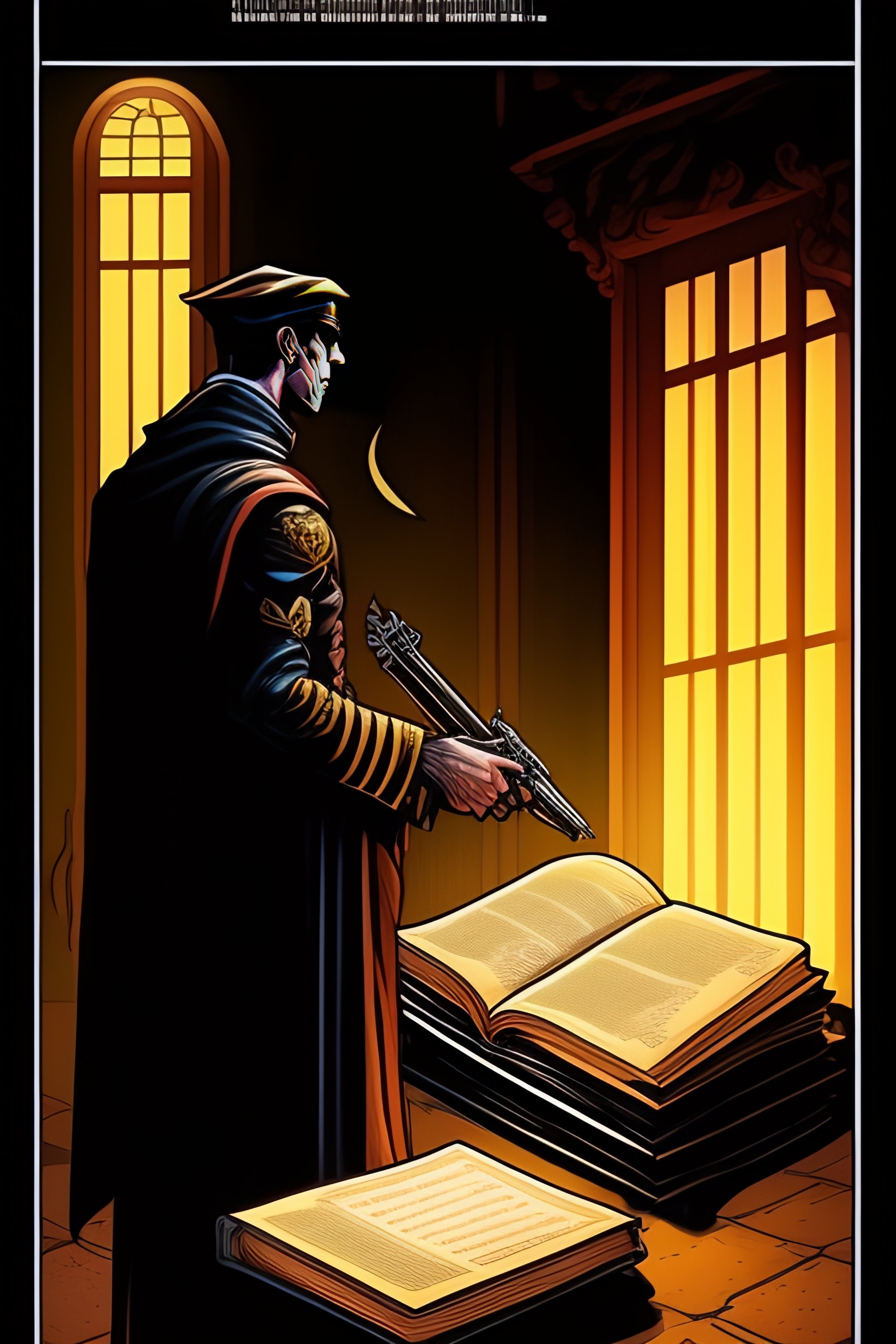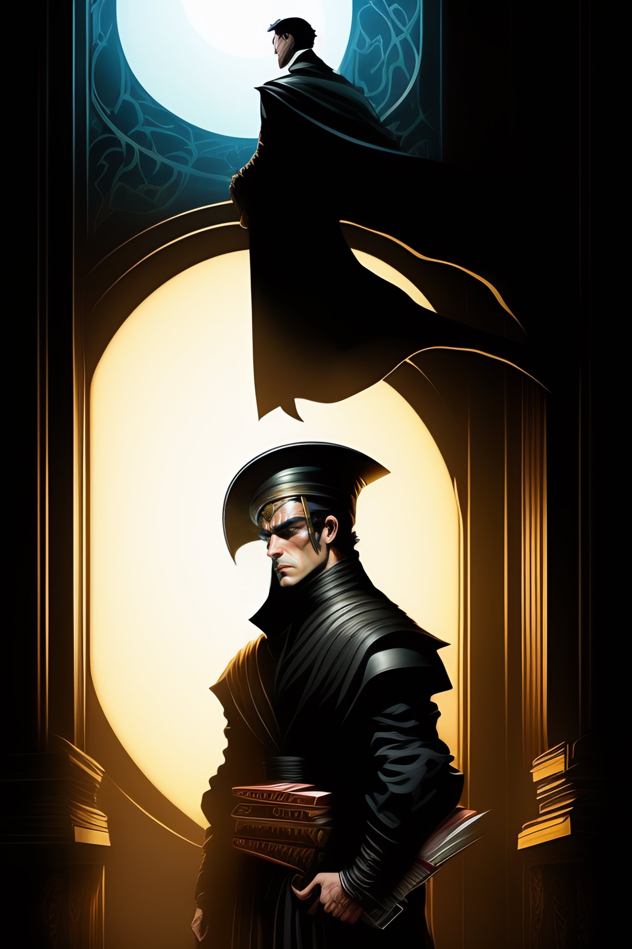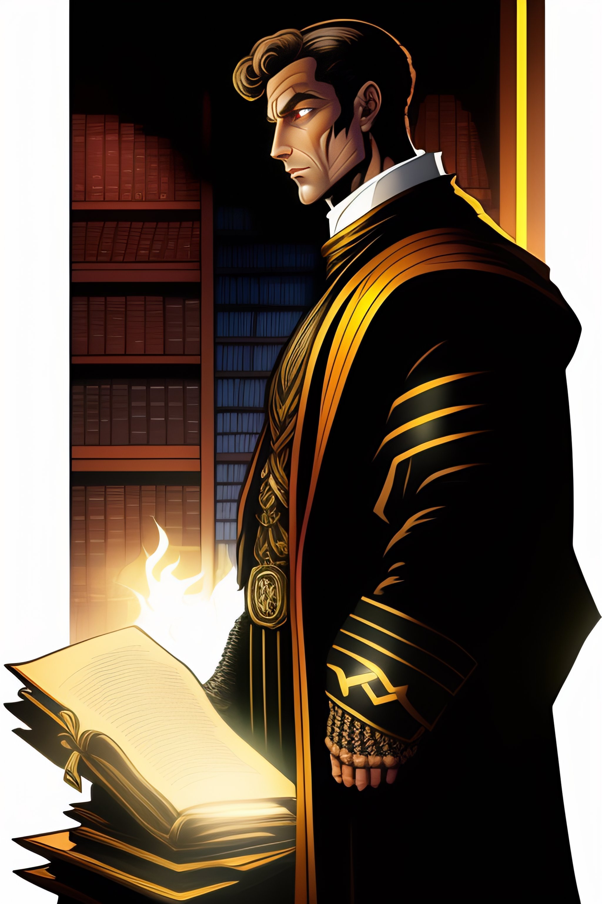 The bookkeeper is a supervillain with a book-like appearance. he has thin, papery skin that is a pale off-white color and is covered in intricate, swirling patterns that resemble the lines of text on a page. his eyes are dark and beady, and his nose and mouth are small and almost non-existent, giving him a skeletal appearance. the bookkeeper stands at an imposing height of six and a half feet tall and has a thin, wiry frame. he has long, bony fingers tipped with sharp, black nails that resemble ink pens. his outfit is simple yet striking, consisting of a black robe adorned with golden book patterns. the bookkeeper's main power is the ability to control and manipulate books, using them as weapons or as a means of transportation. he also has superhuman intelligence and the ability to absorb knowledge from any book he touches.