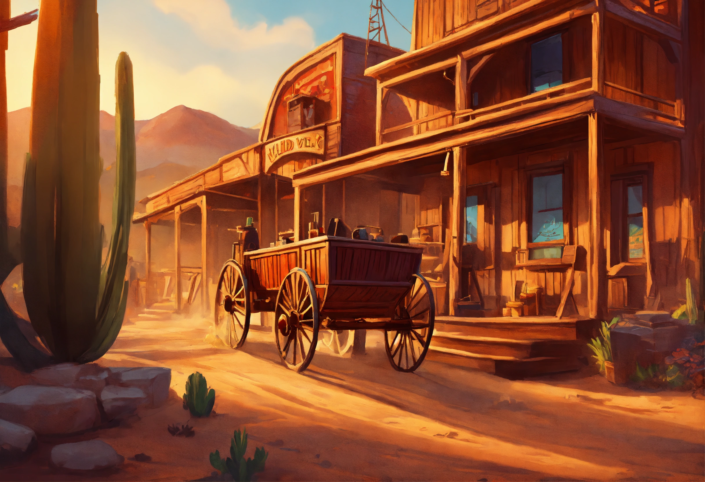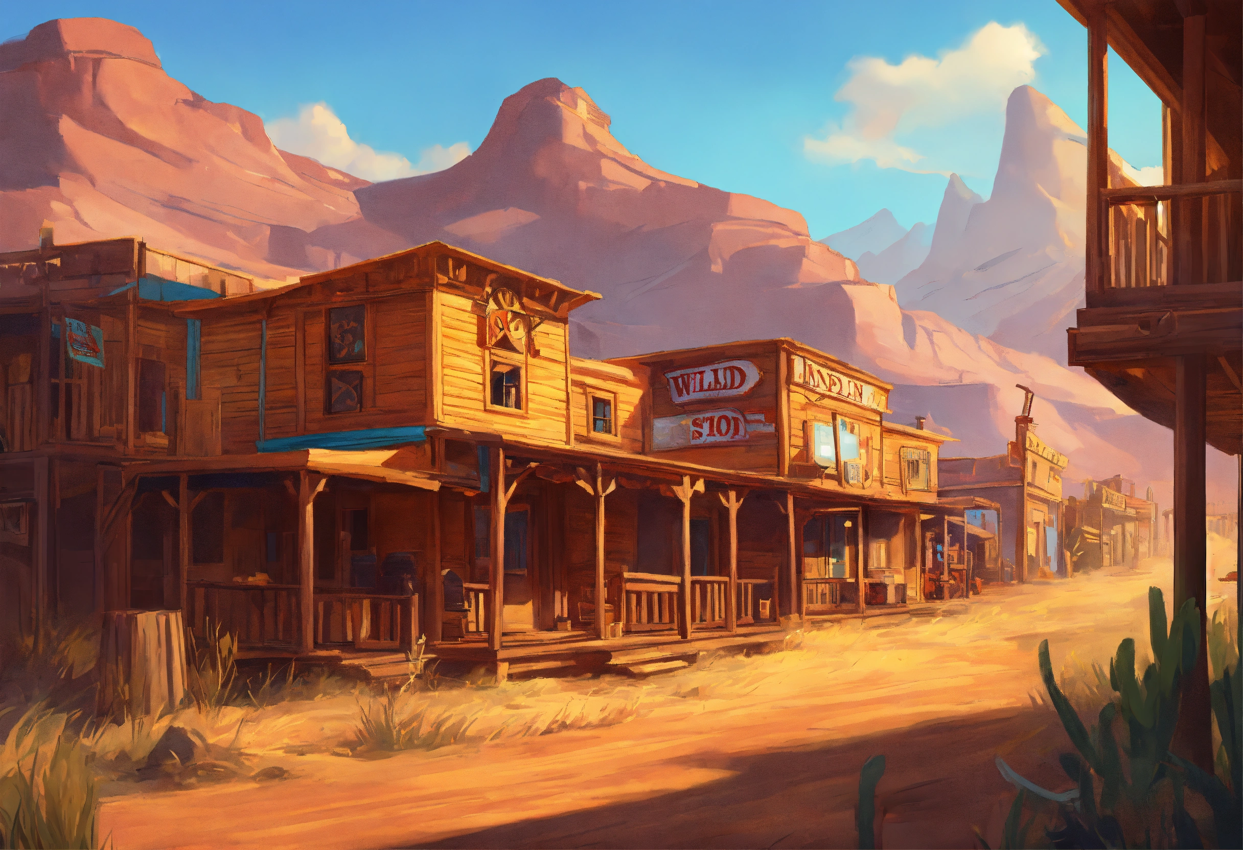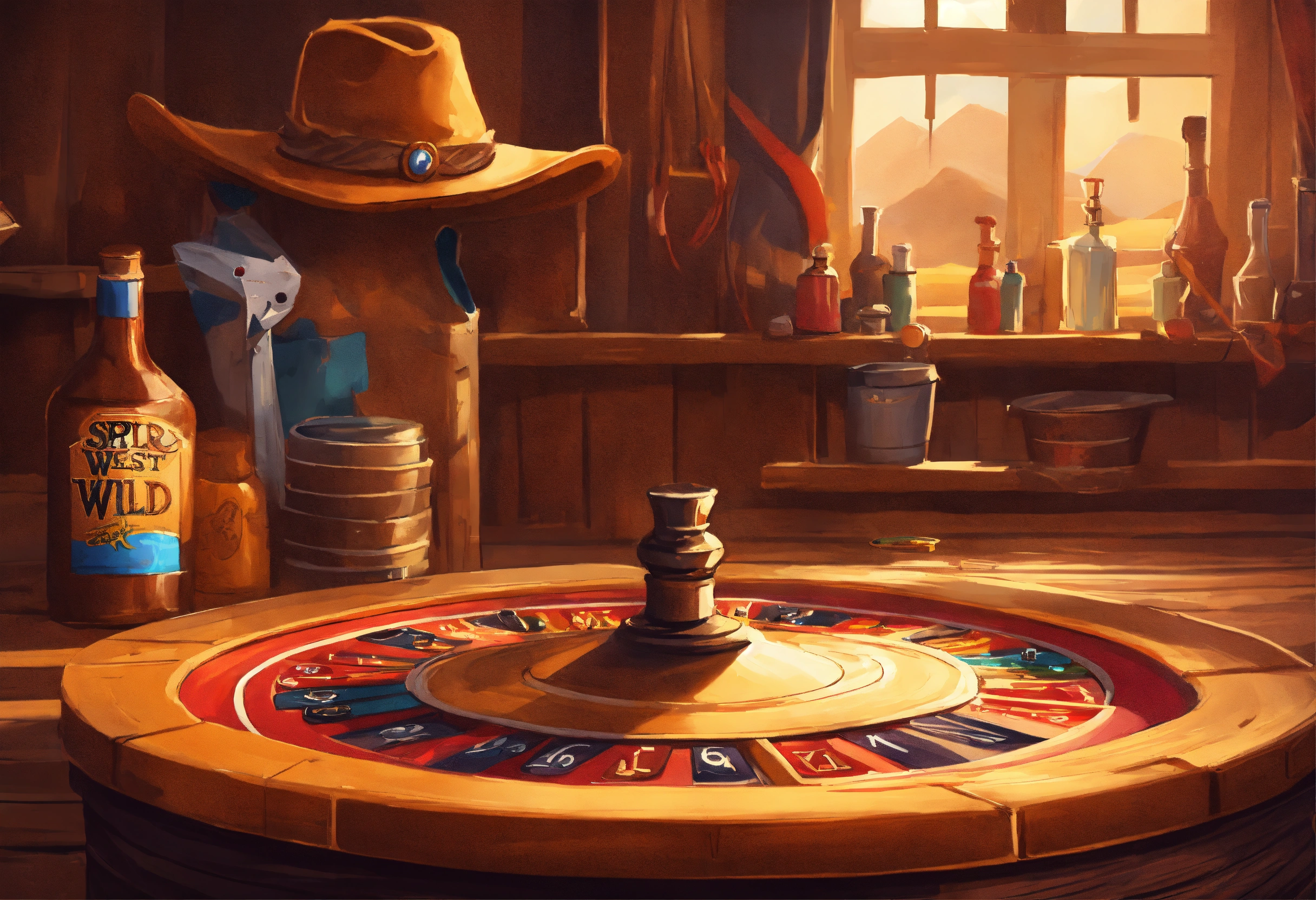 Wild west, spin background for the slot game, realistic cartoon oil paint, 2d illustration style, sharp focus, bright color, digital paint design, trending on artstation, high details, simple lines, art by josé luis ágreda and camilla d'errico.