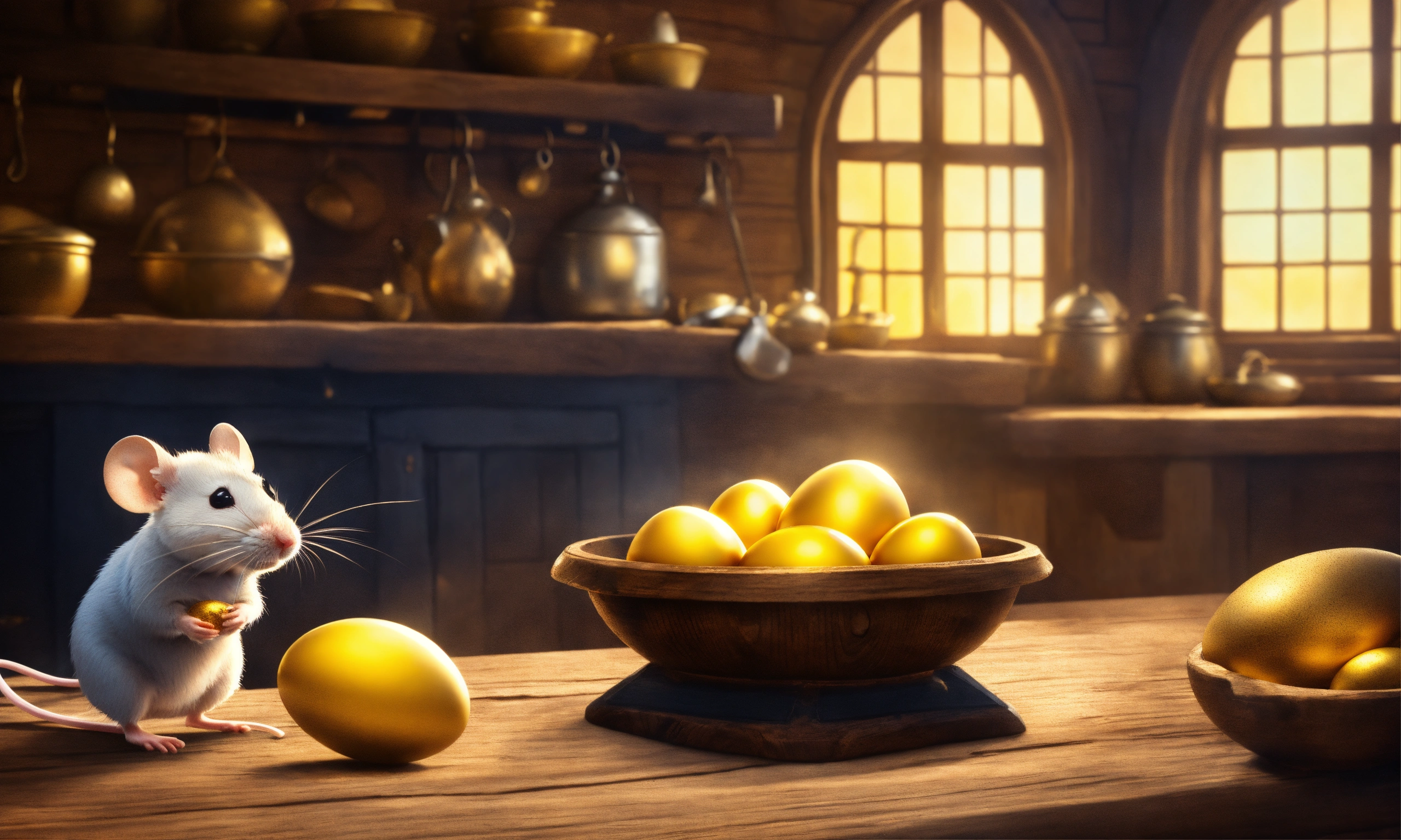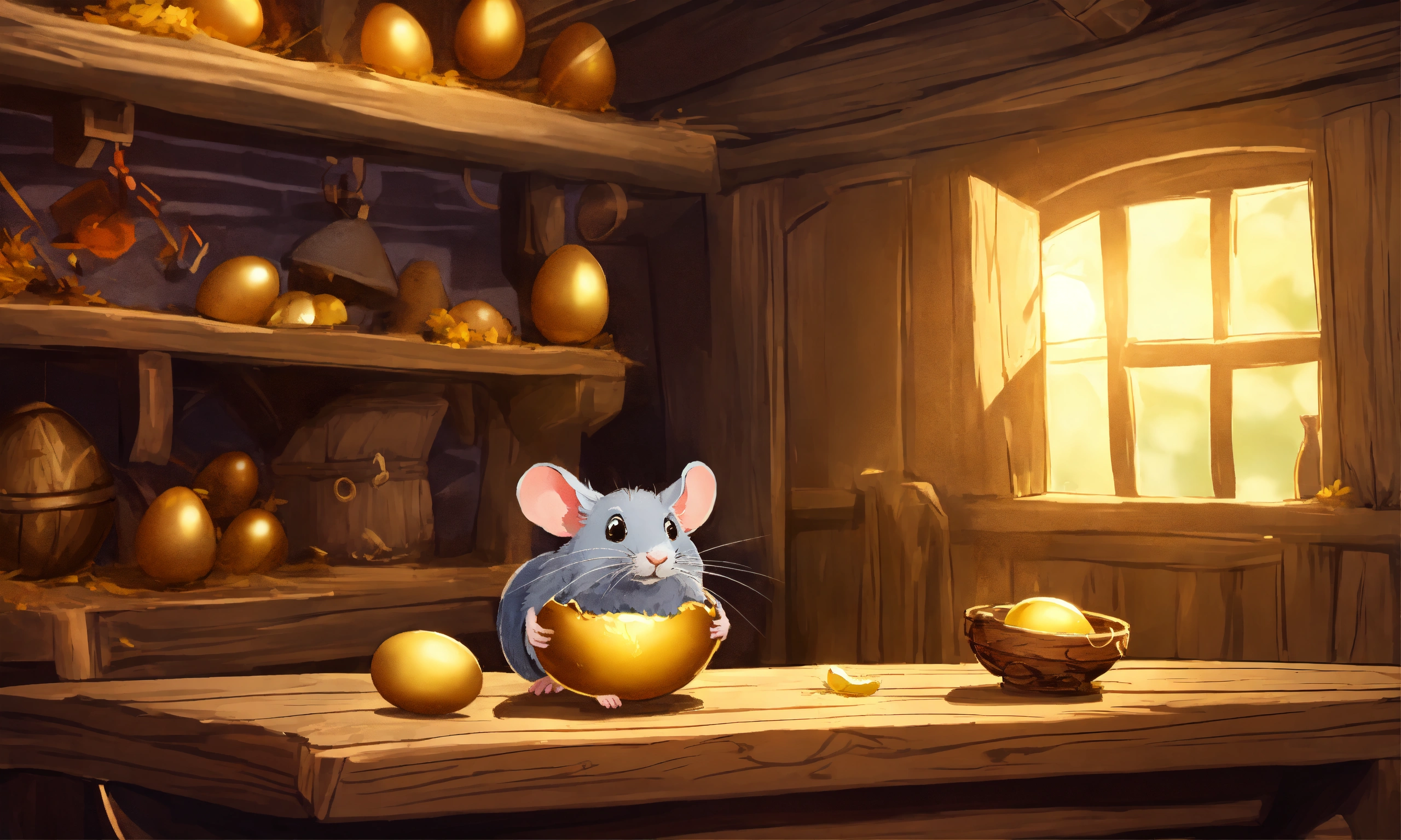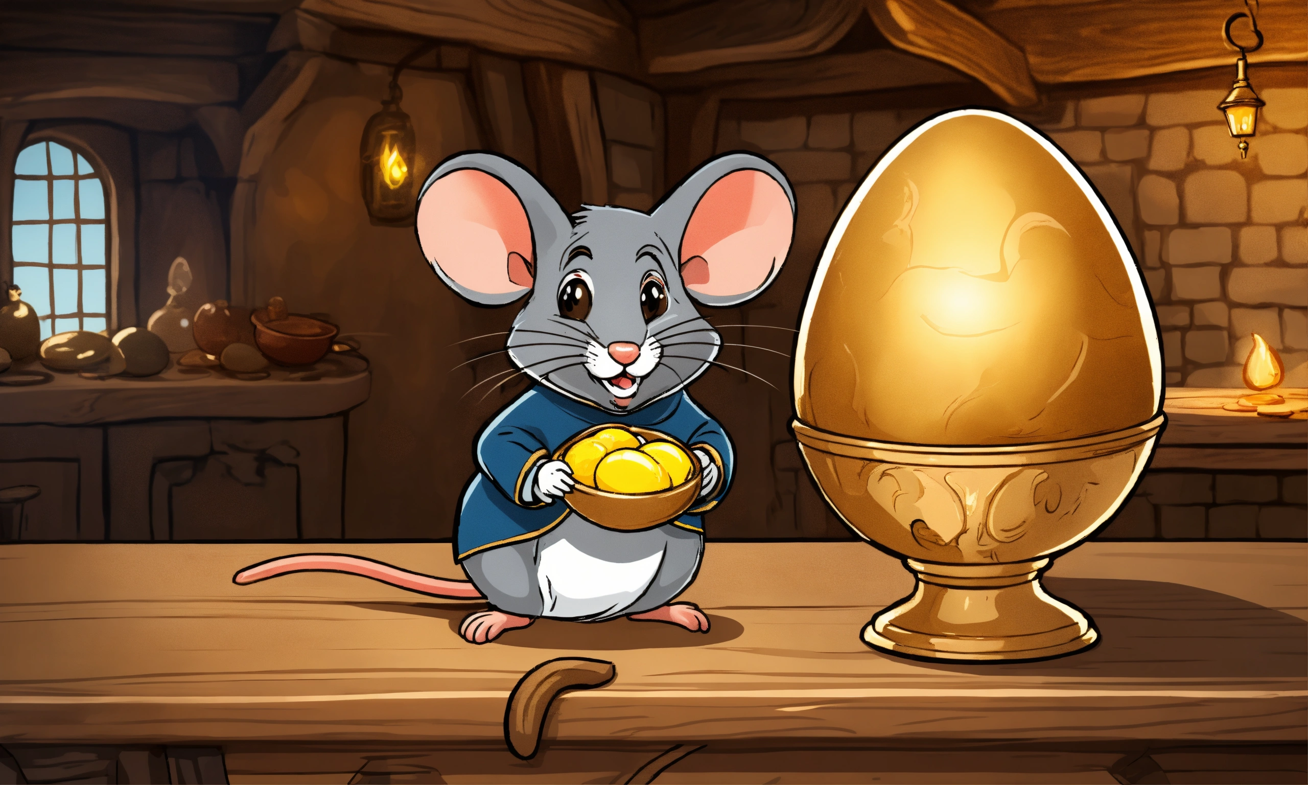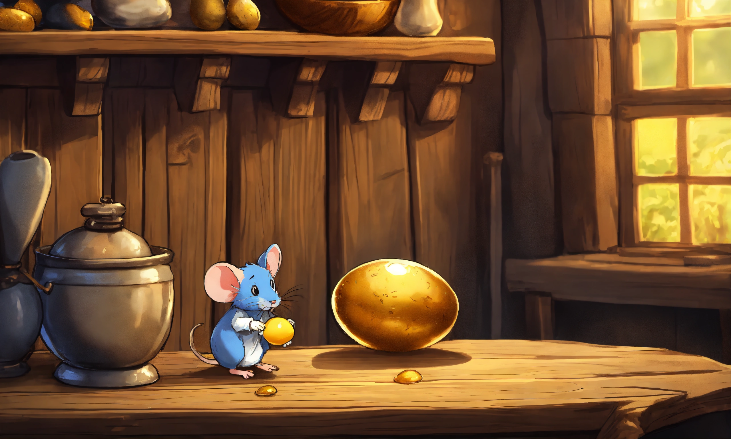 Cartoon style a mouse and a brocken golden egg in a wooden table in a medieval kitchen