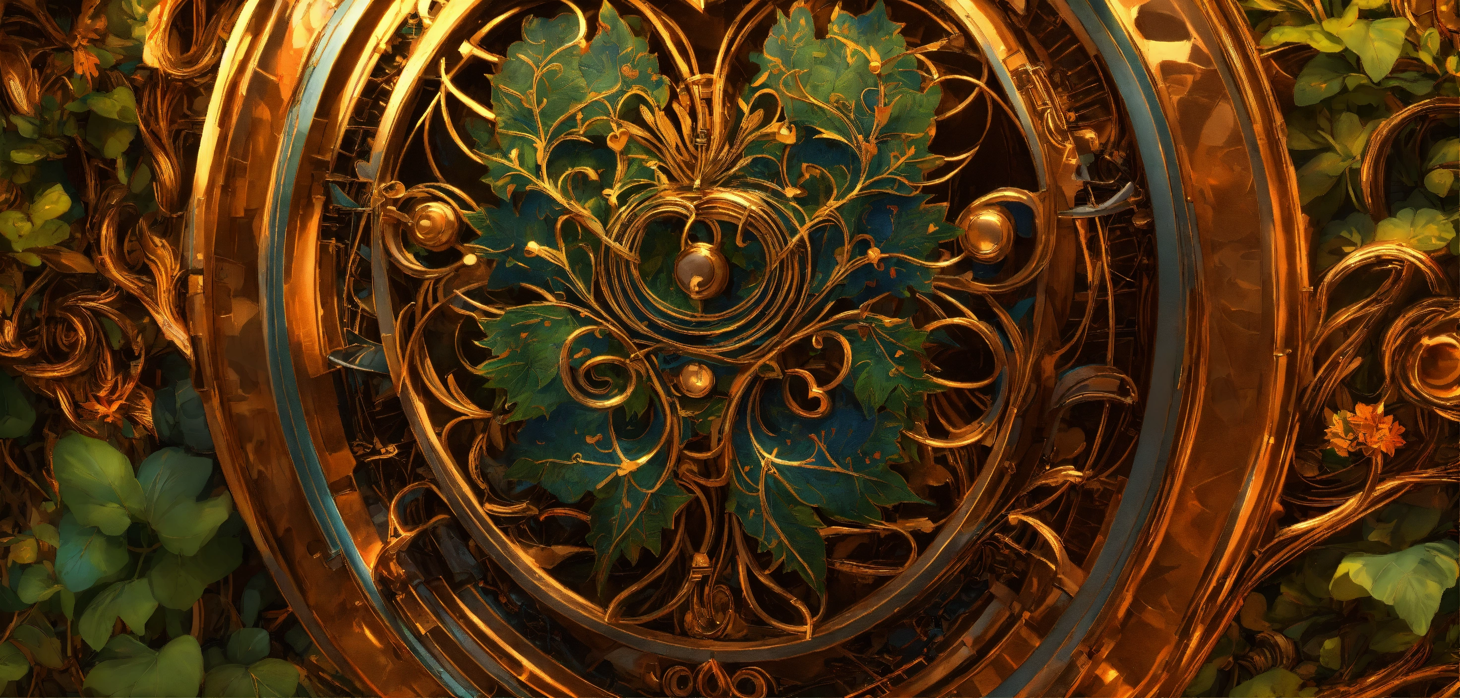 Realistc metal, heart, wire, realist ornamental, realist music symbol, g clef upright by the gates of heaven, grid, steampunk by walter crane and william morris, closeup, twisting leaves, realistc tiny fine realist flowing lines, abstract psychedelic, 8 k, artstation, neon