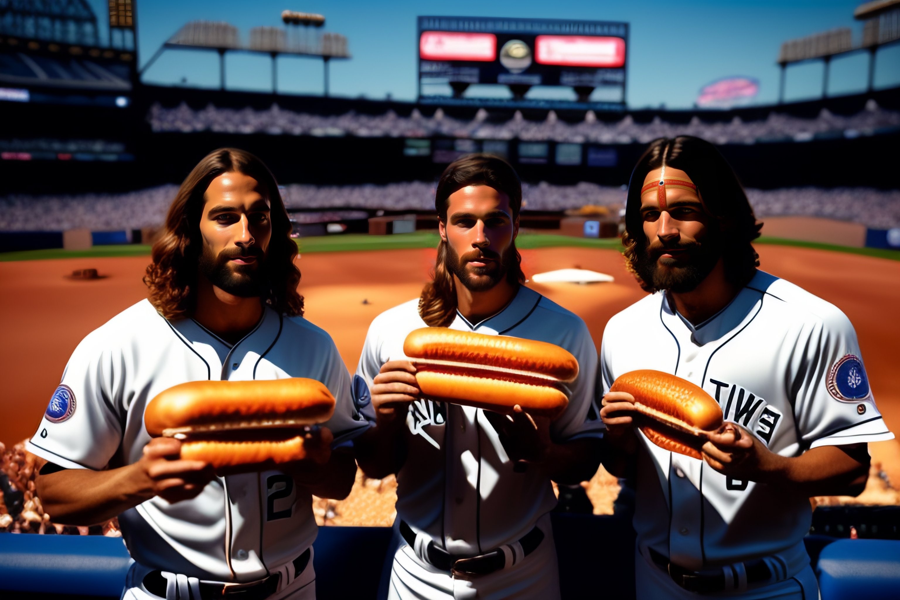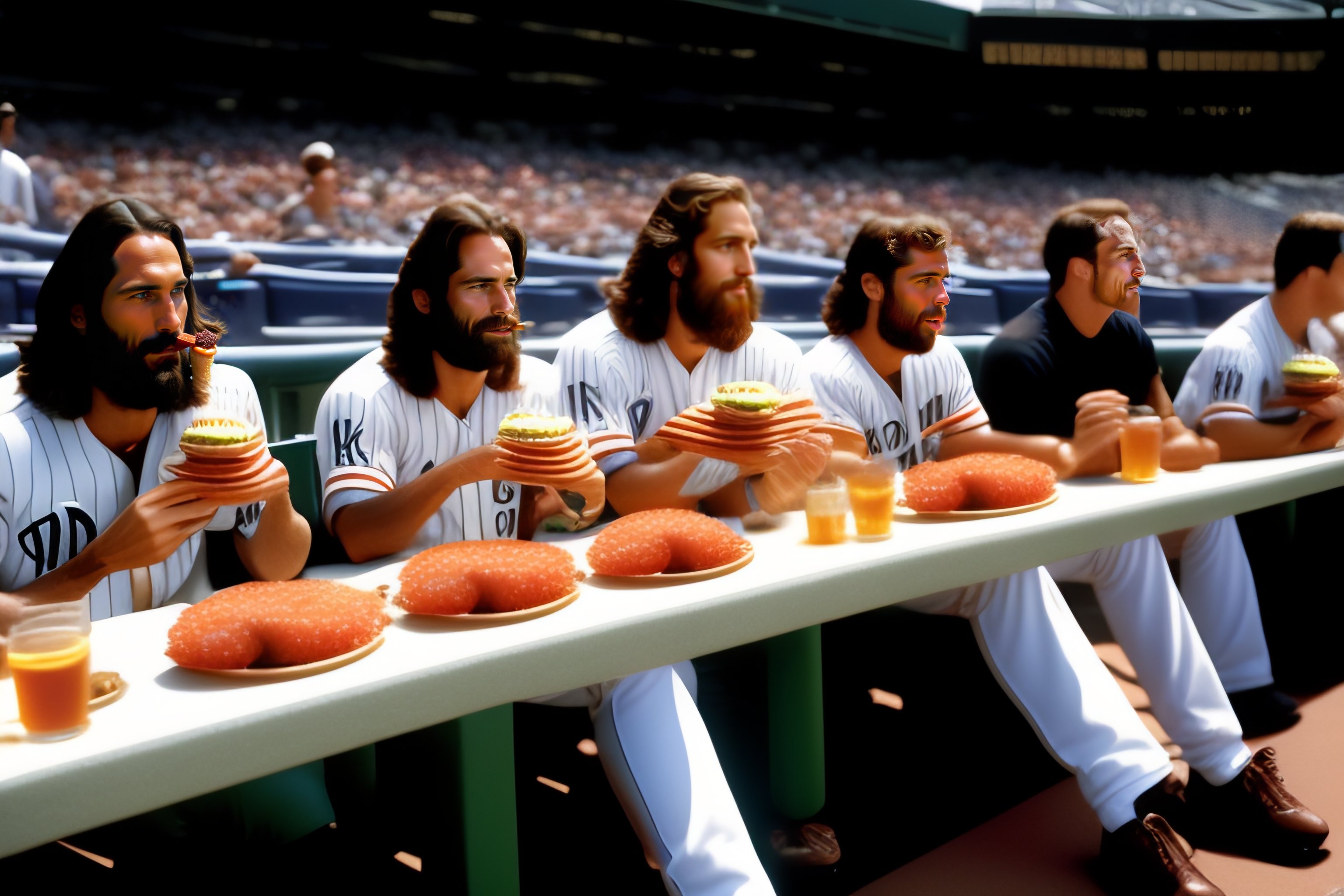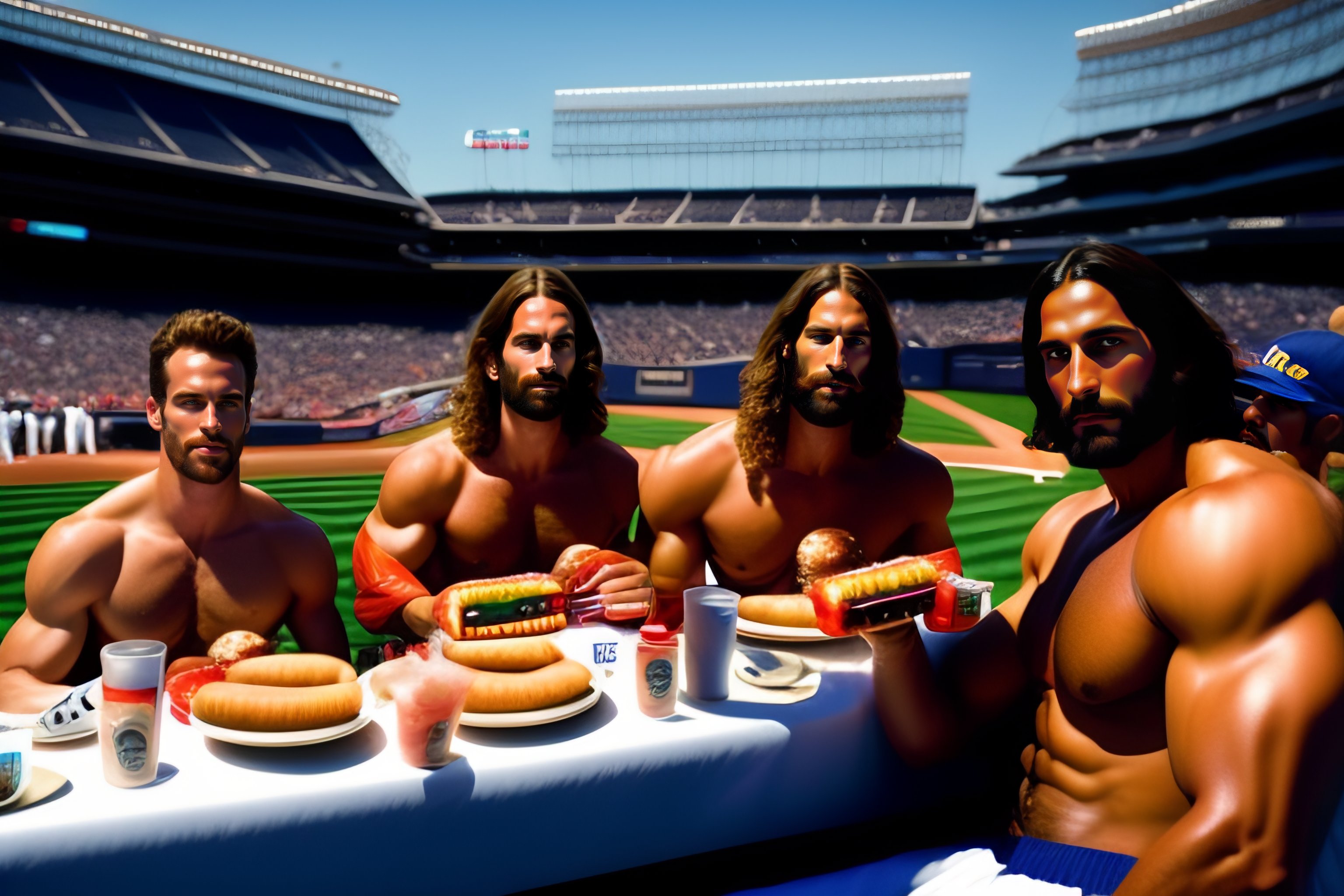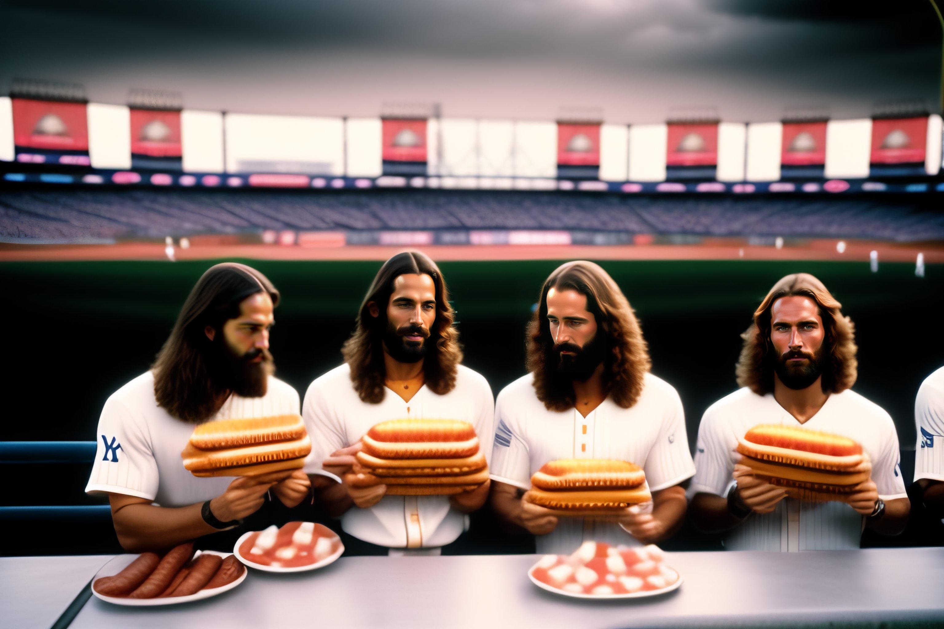 Photo of jesus christ and the 12 apostles eating hot dogs at yankee stadium in new york