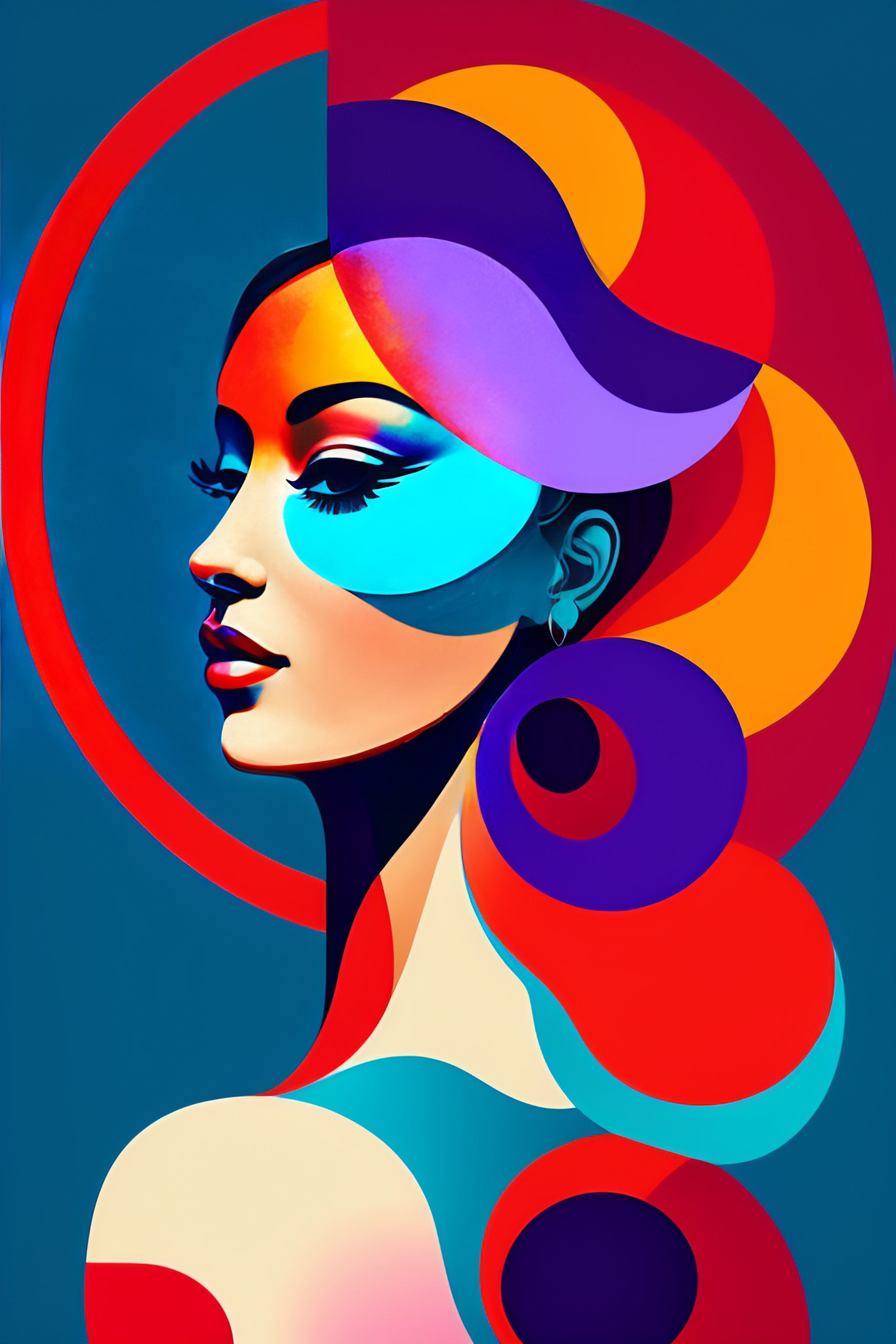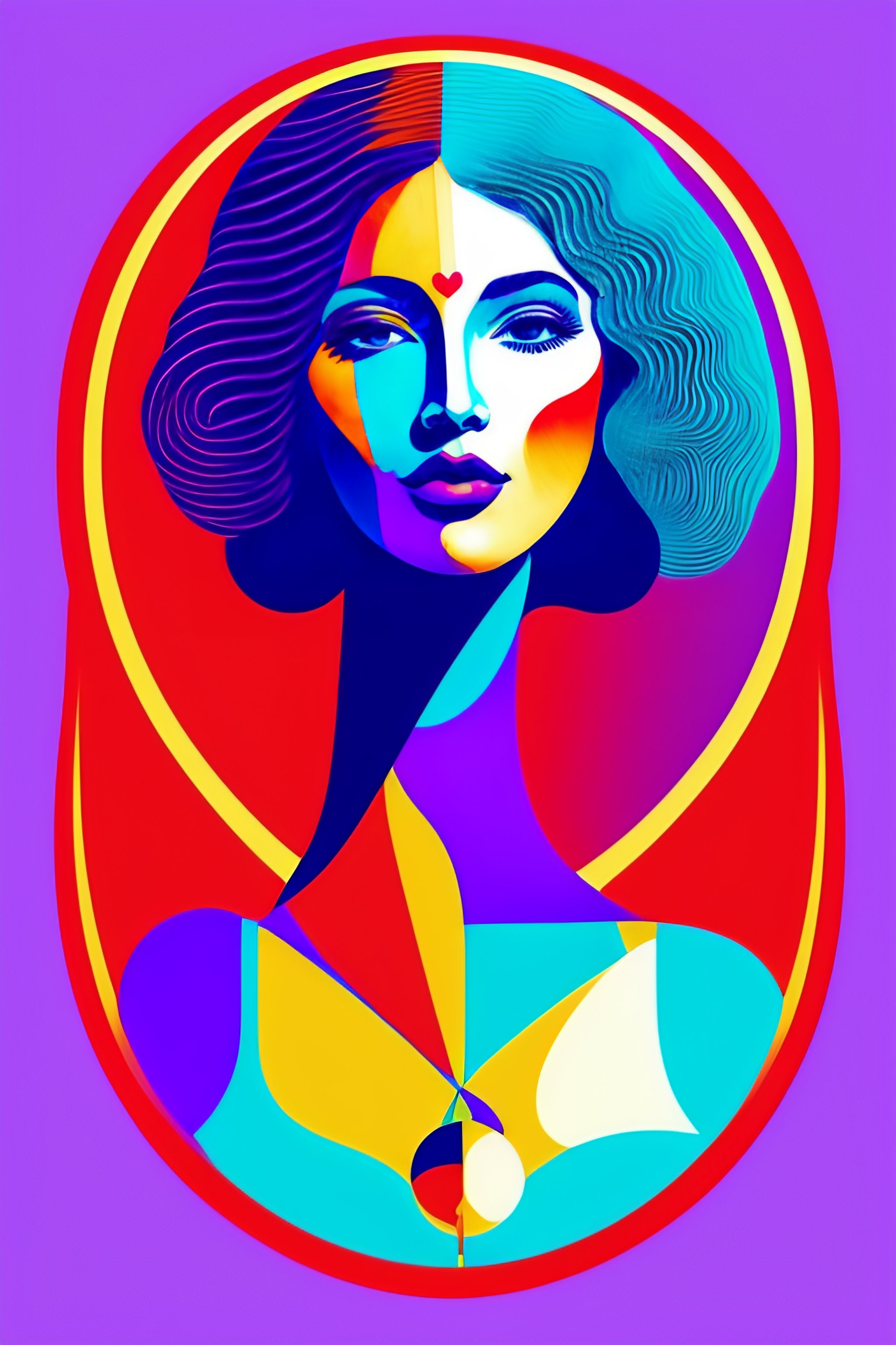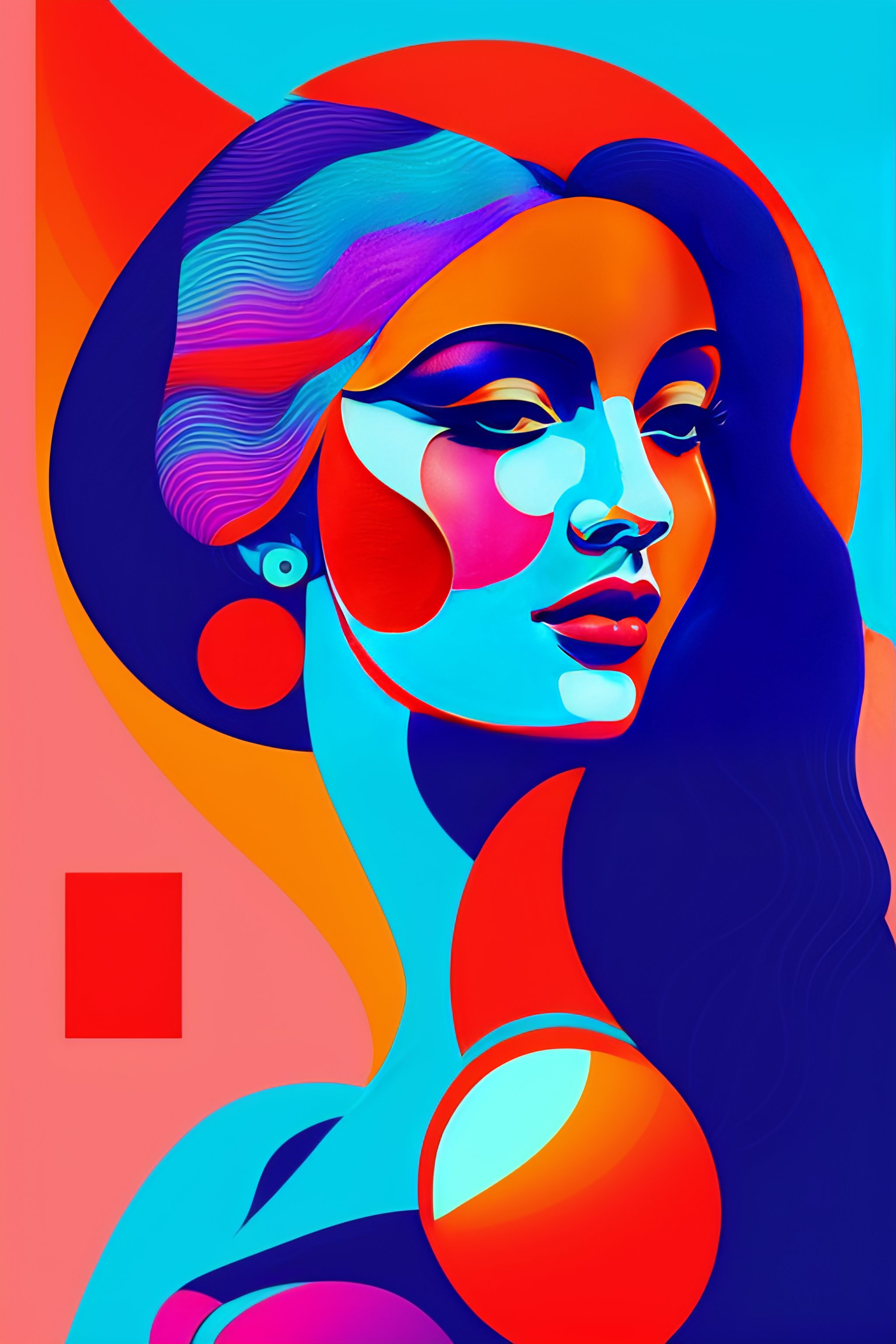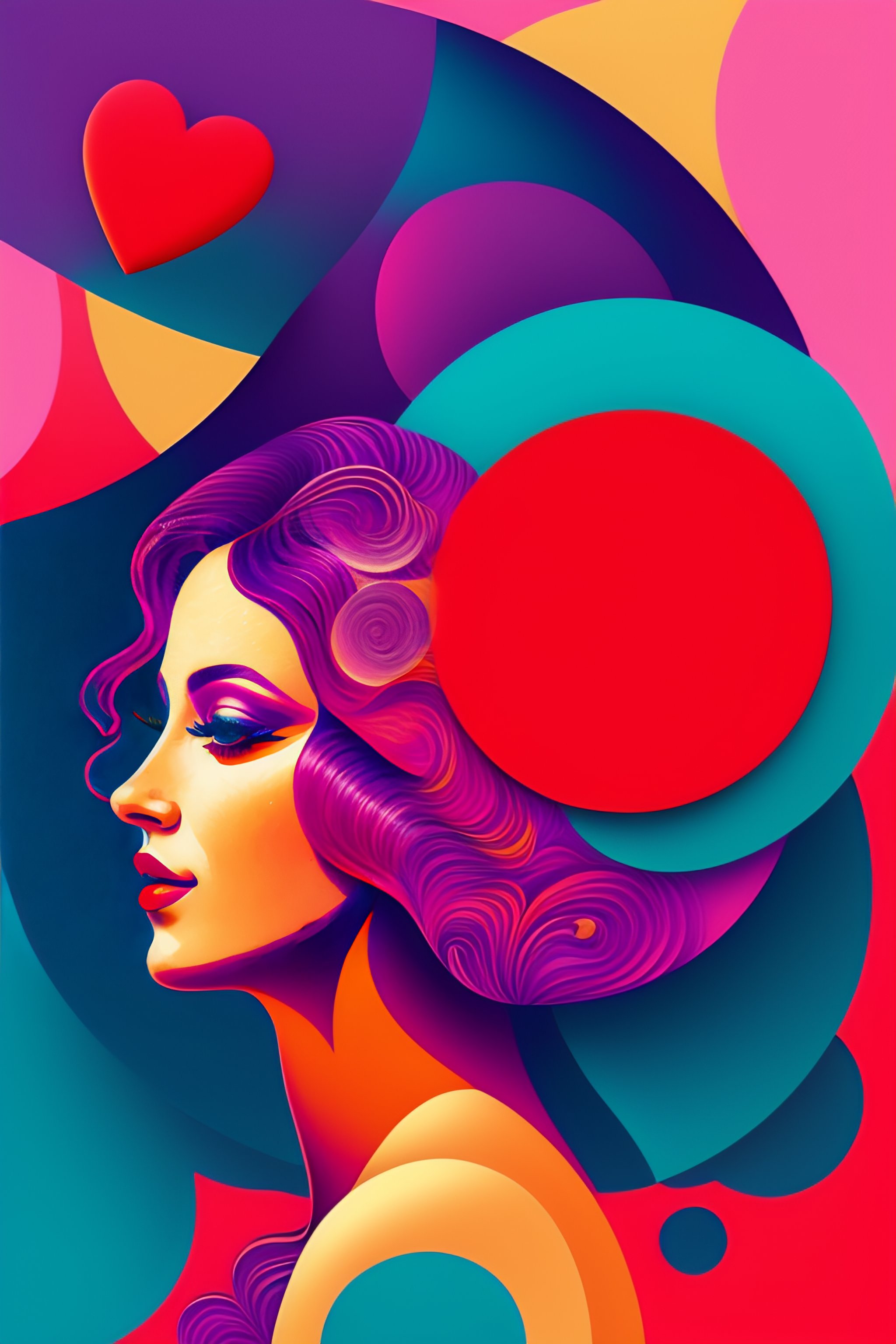 Graphic flyer, with a 2d vectorial illustration of a happy woman, digital lavender, luscious red, sundial, tranquil blue and verdigris colors, happy woman picasso style for valentine's day collage, pablo picasso style, hawaiian style girl with big orchid in her hair, head tilted