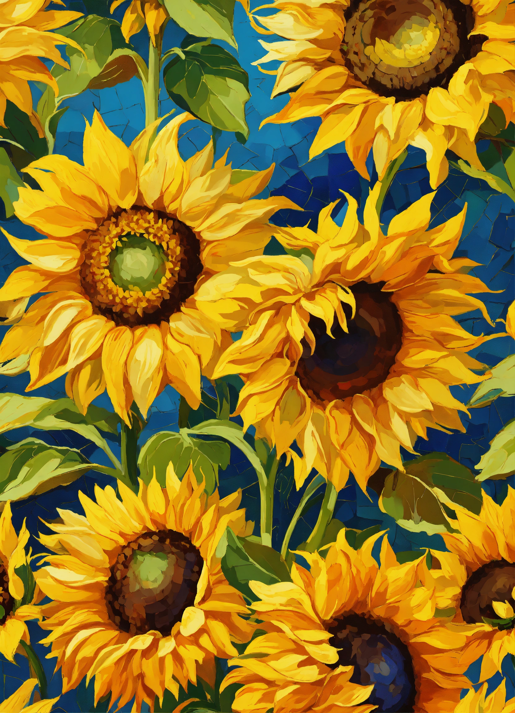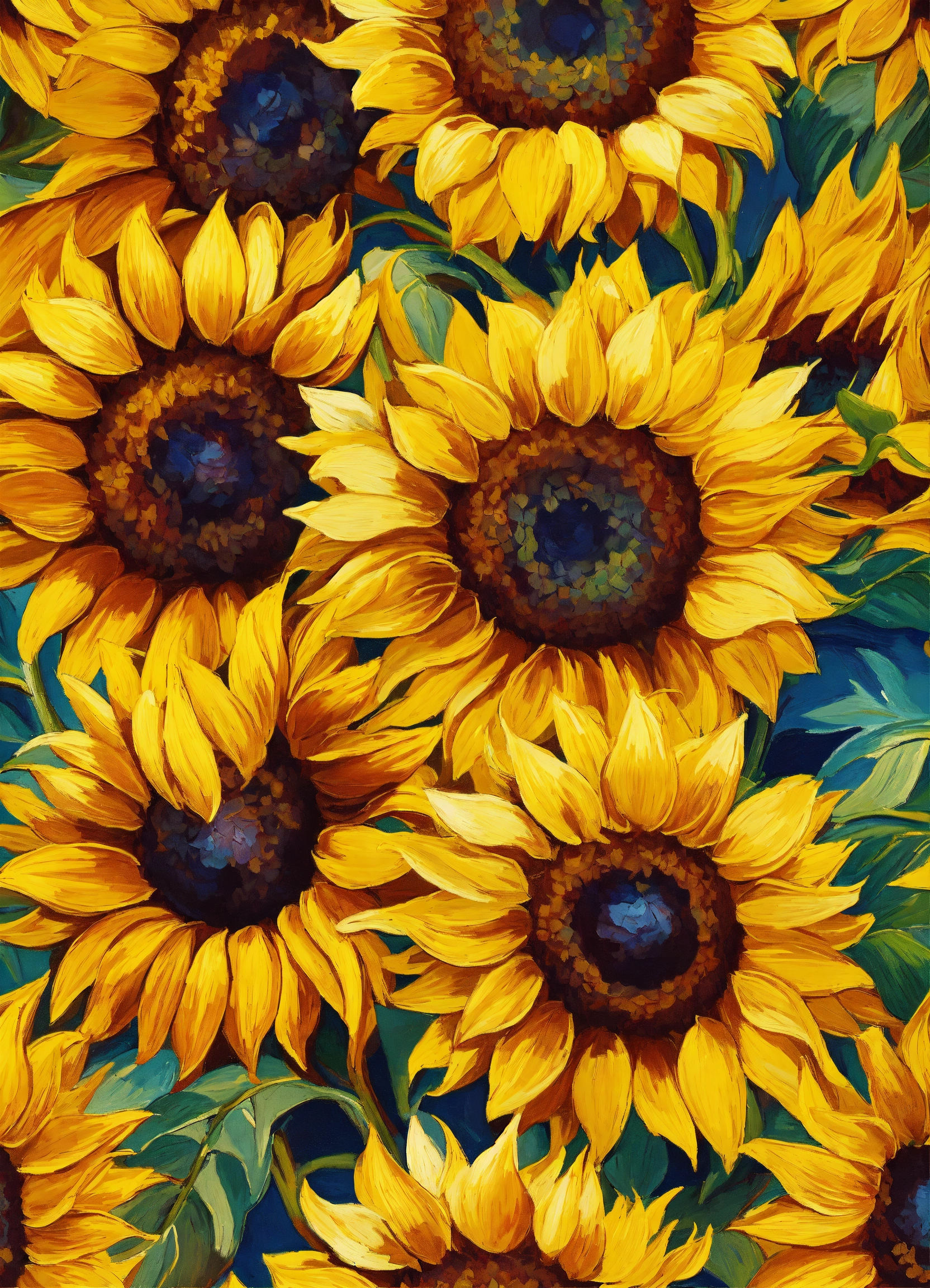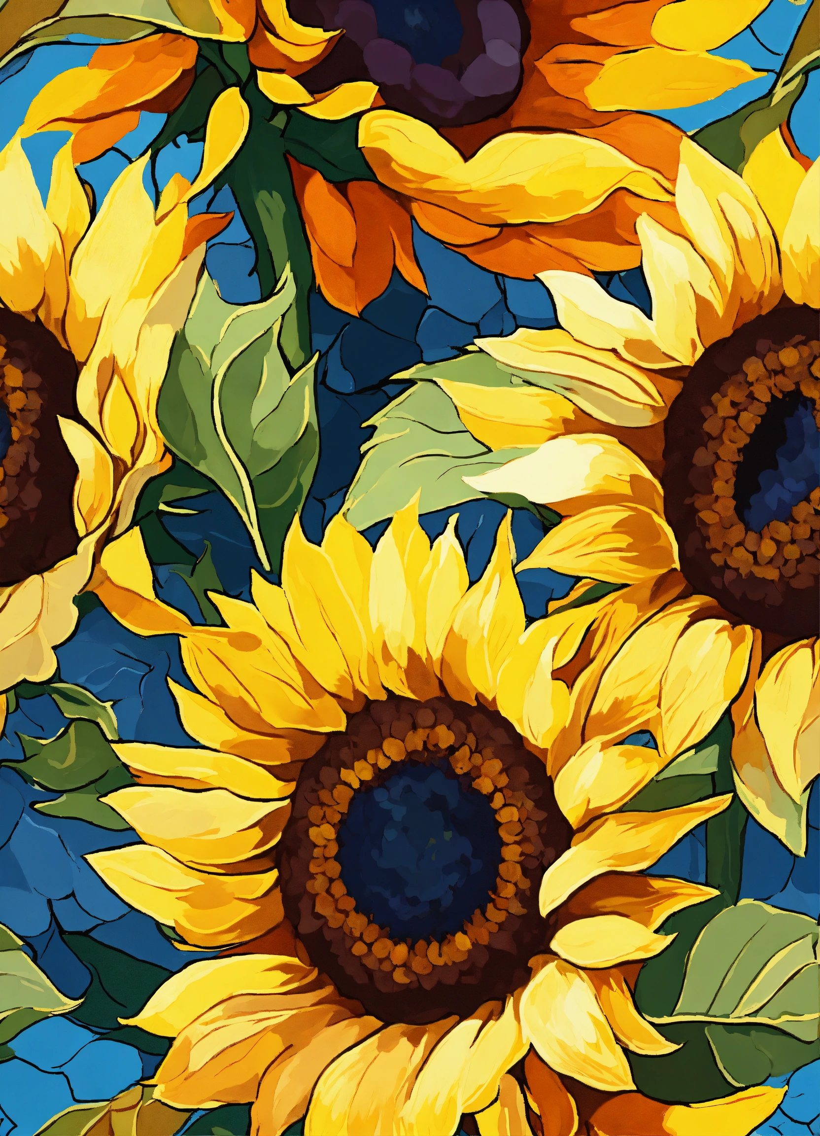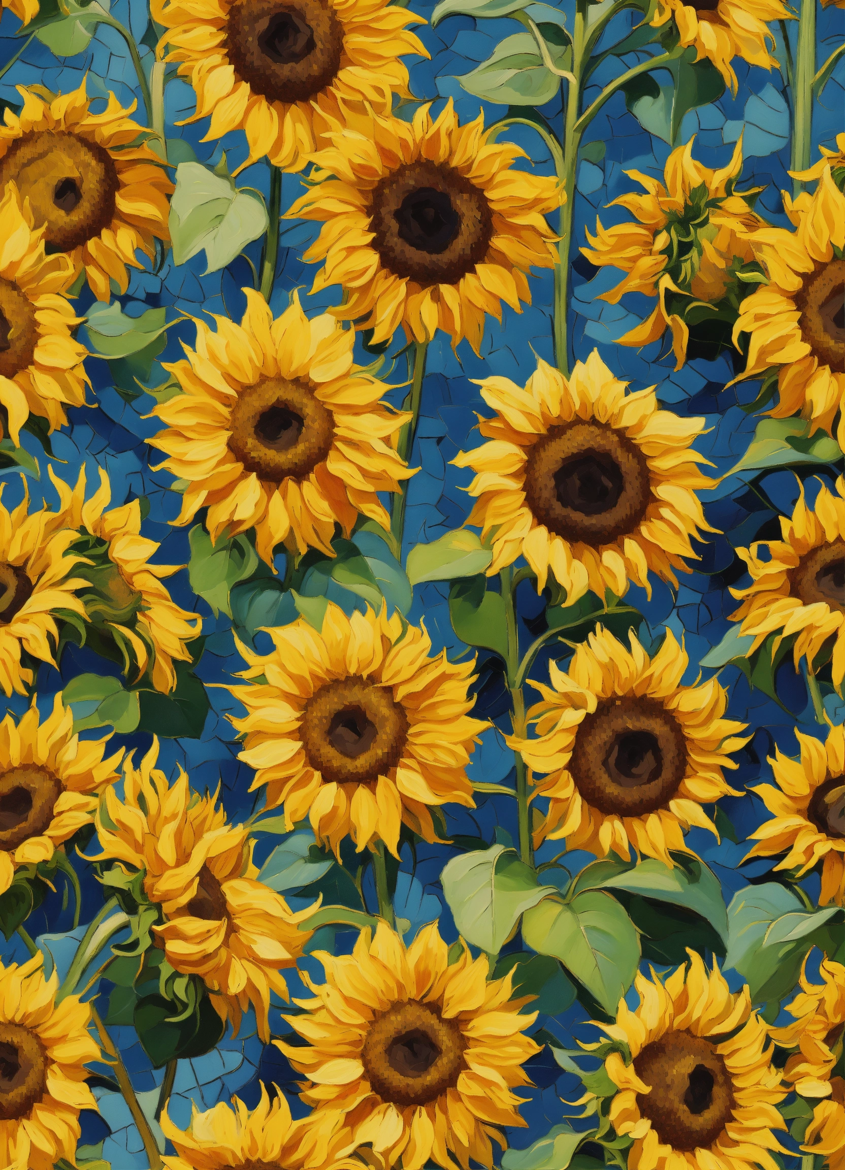 Sunflower by van gogh, lenoid afremov style, meticulous precision, clear, clean lines, intricate details, flat, vector, blank placeholder with an ultra hd detailed painting of many different types of colorful sunflower, seamless pattern