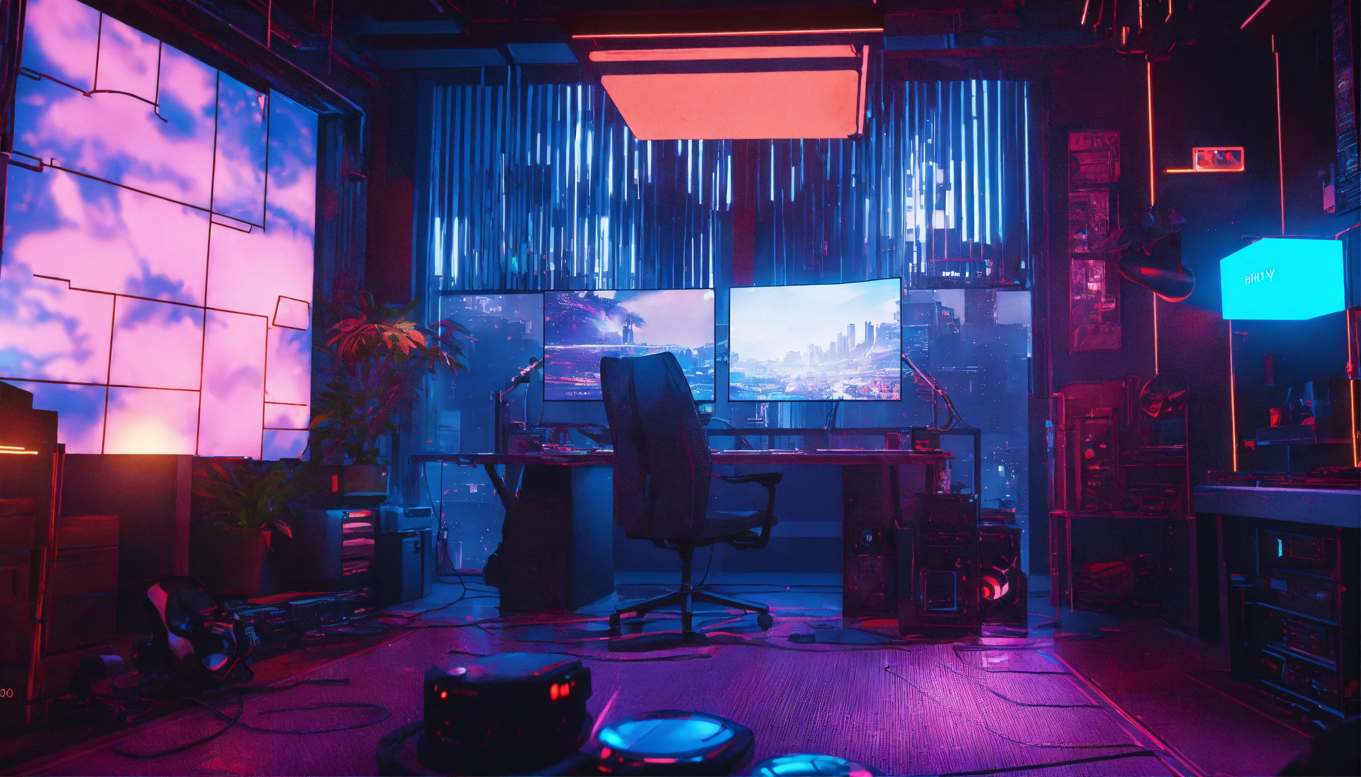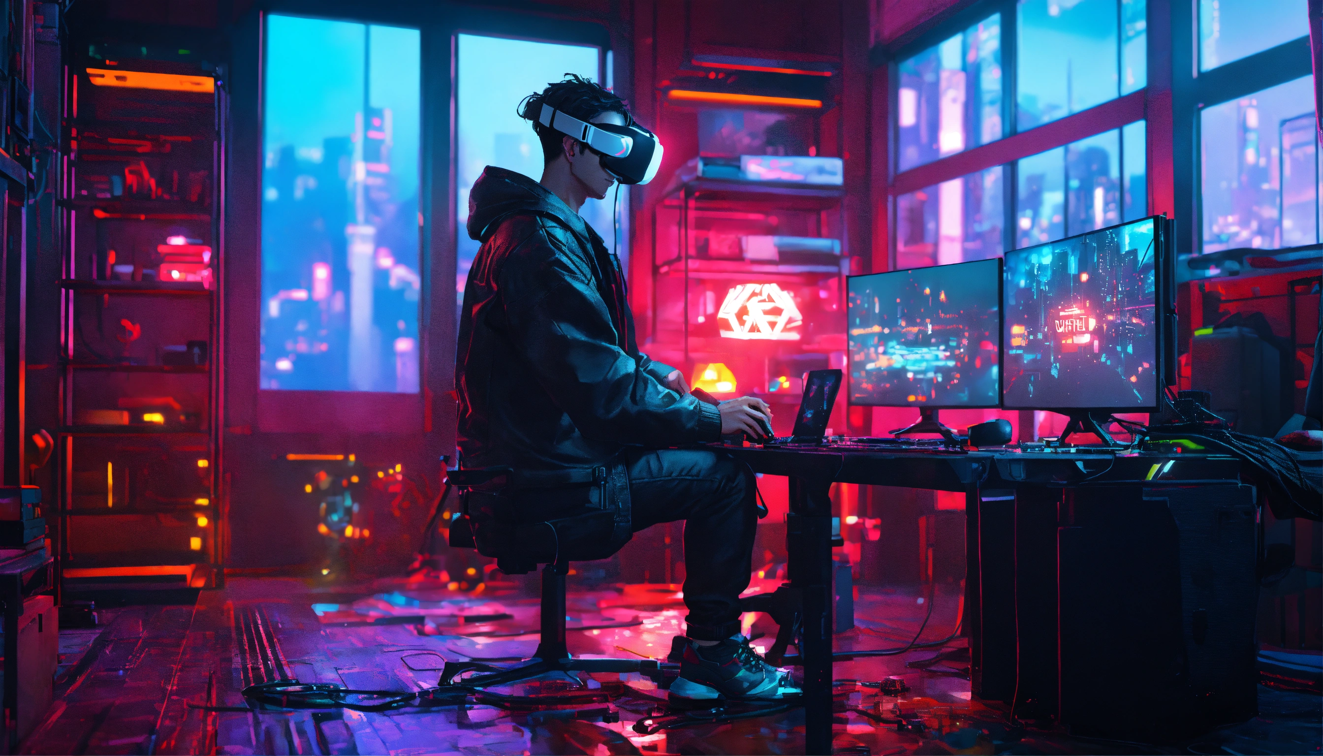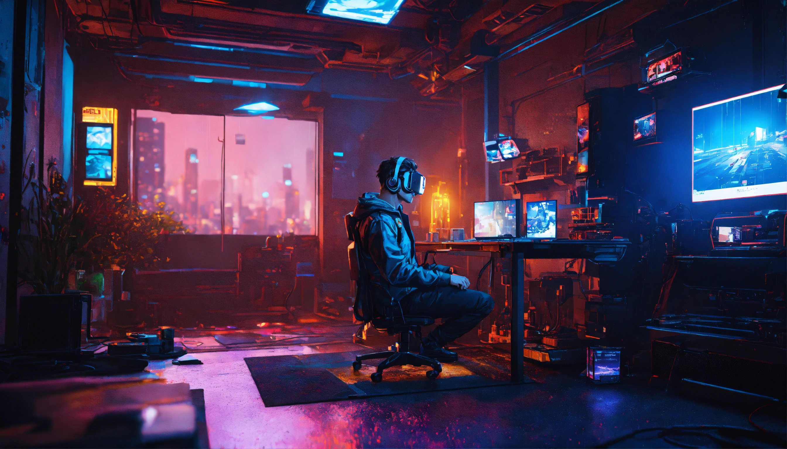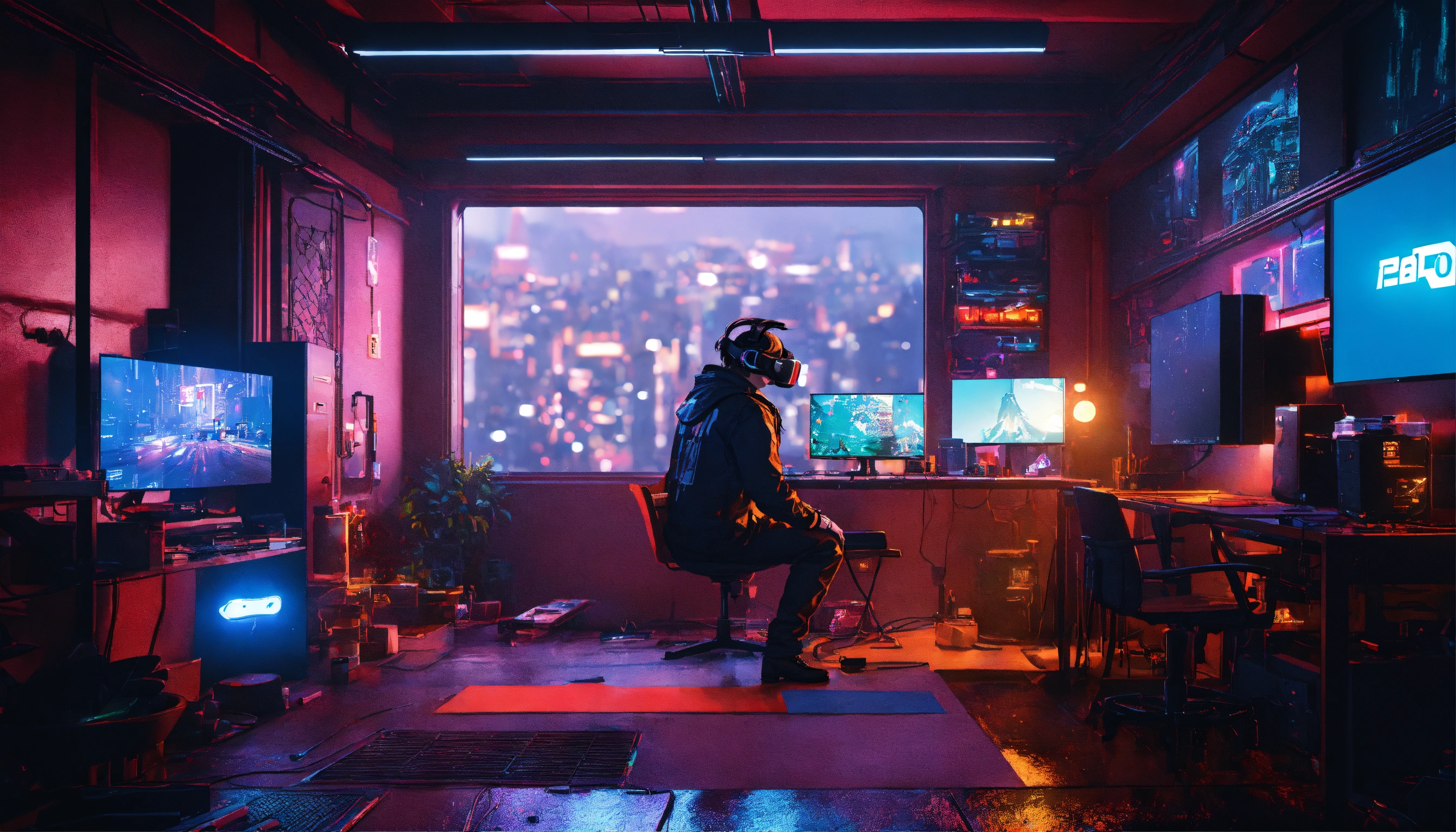 Guy with vr headset in cyberpunk room with pc setup, rainy outside, unreal engine 5 render, gorgeous lighting, 8k render, realistic scenic render. detailed, cyberpunk room in tokyo, night, in the style of tin-tin comics, vibrant colors, detailed, ray tracing, attention to detail, 8k