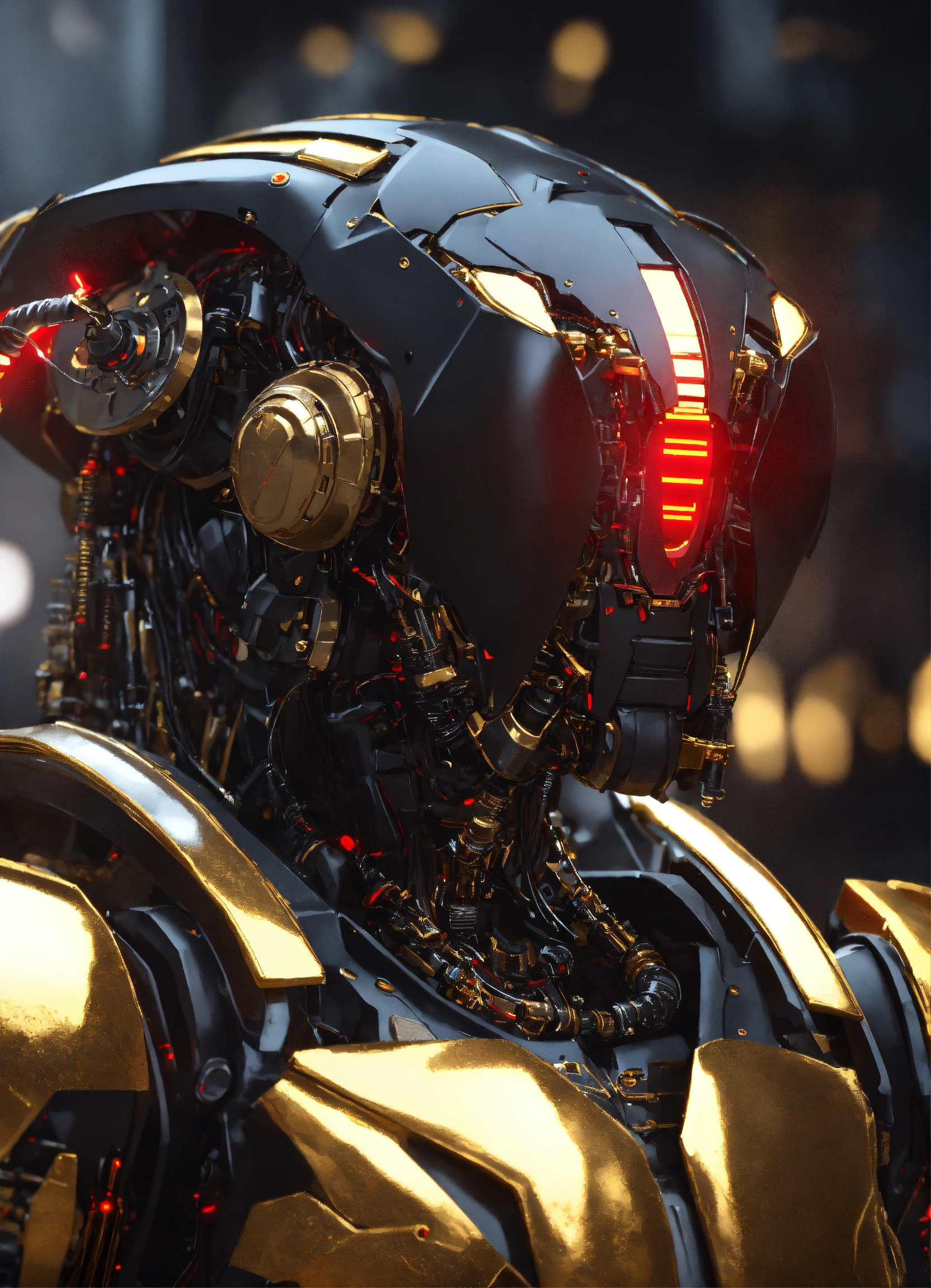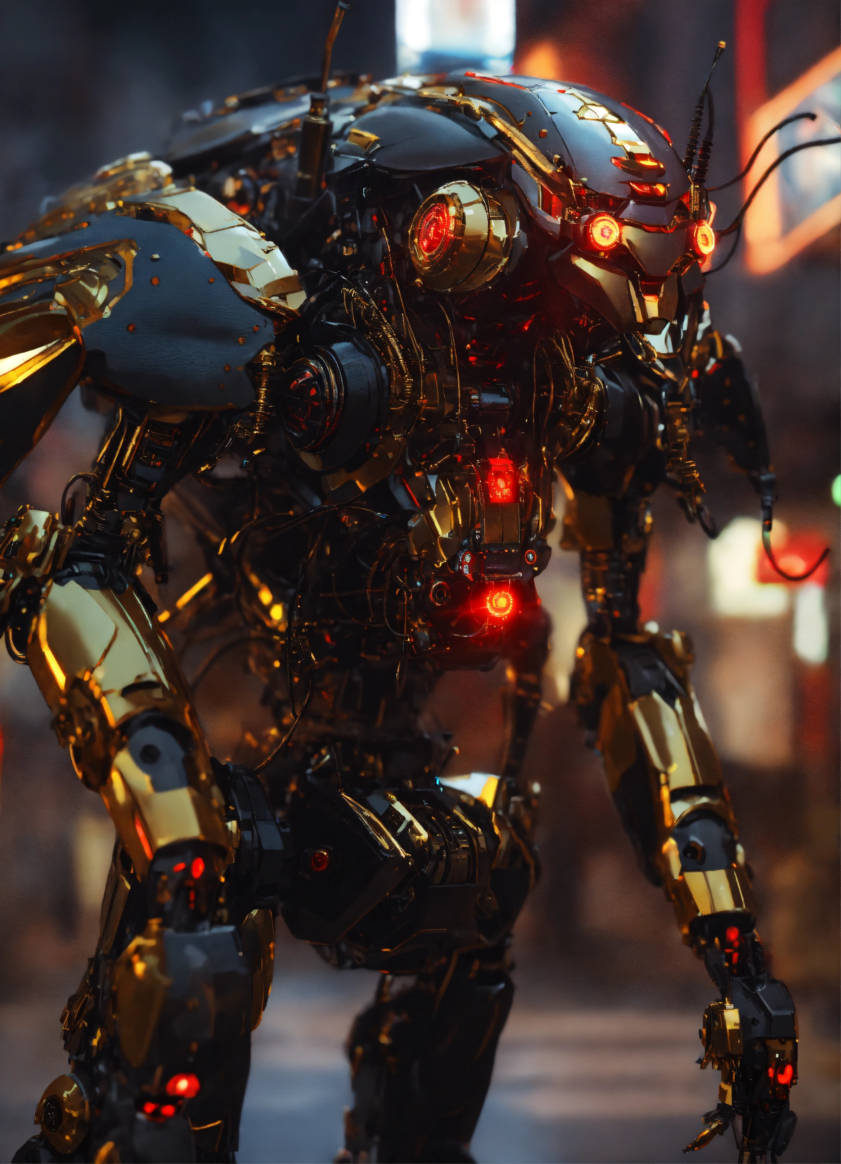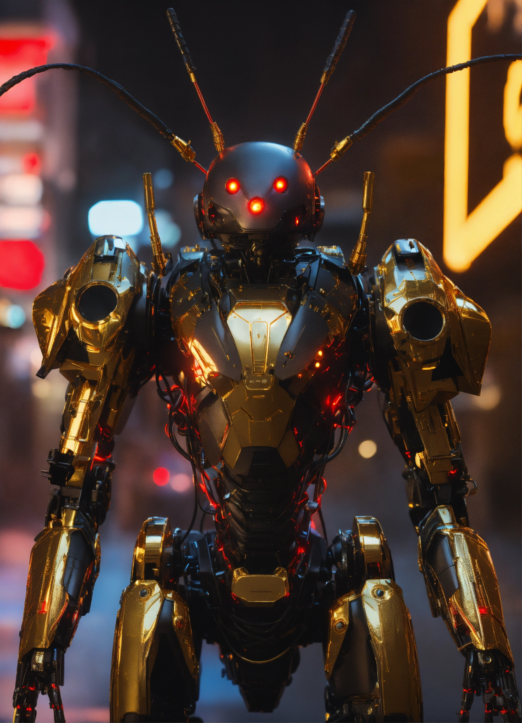 Zoom out of black cockroach faced humanoid robot with red glowing eyes, detailed gold circuitry on it's armor. standing and shooting electricity from his powerful antenna attacking, realistic, 8k