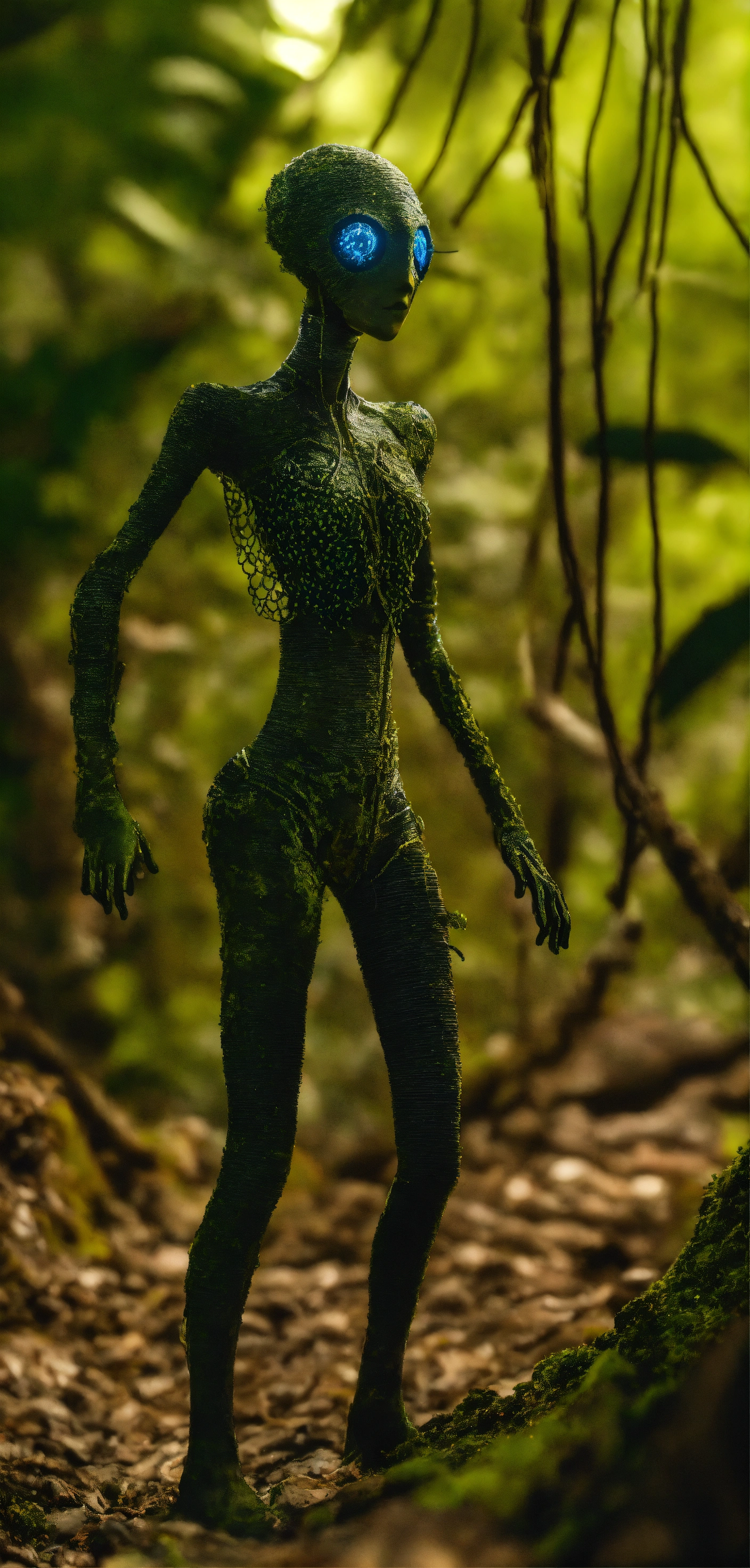 Fotografia de cuerpo entero humanoide extraterrestre femenina con piel de escamas de 21 años, muy alta y delgada sin rasurar en la jungla, detalles fotográficos hiperrealistas, plano general, f2.8, enfoque en los ojos, 1/250, iso 3200, nikon z9, angulo de cámara de 120 grados