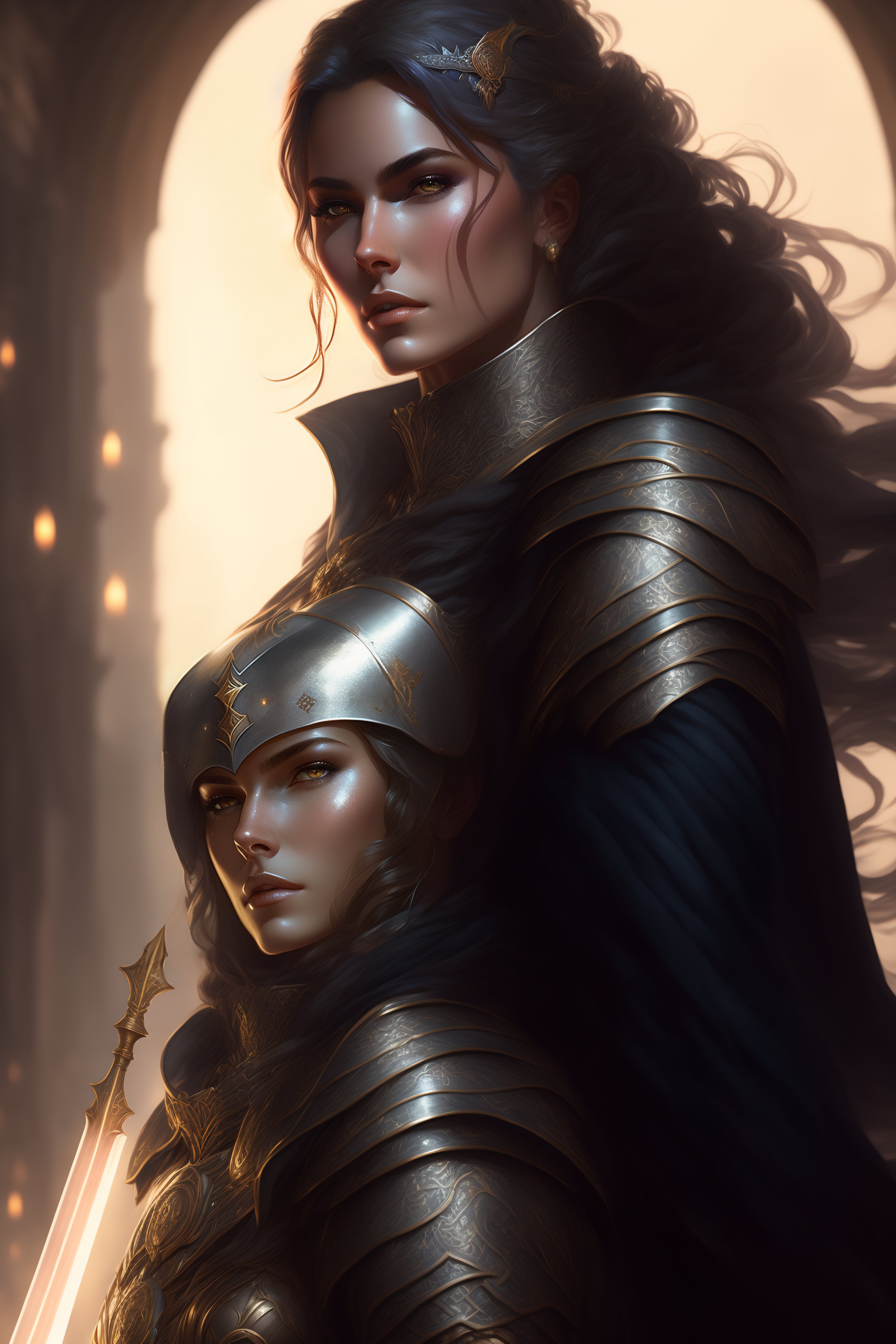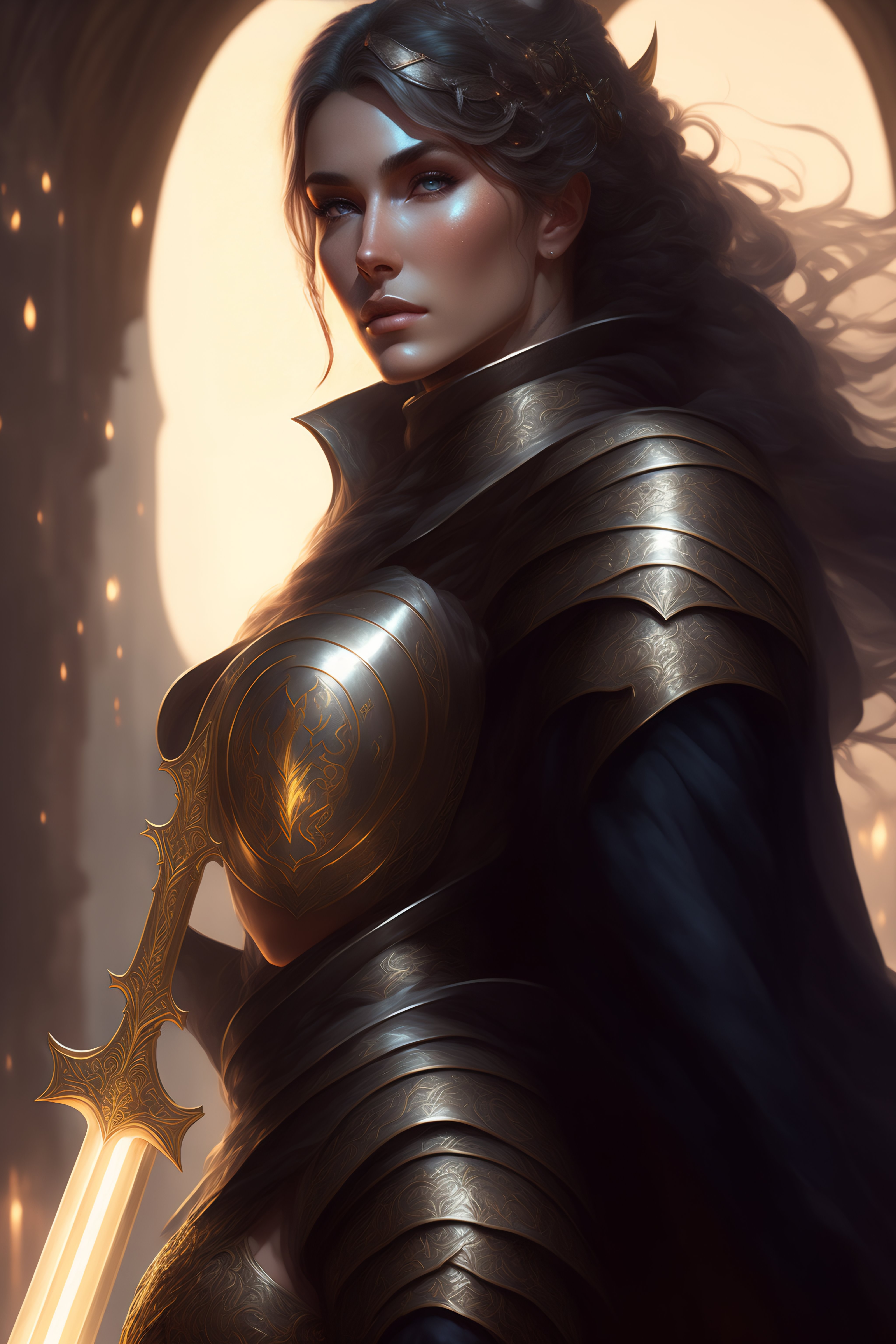 Female paladin in center, dnd, fantasy, short gray hair, holding sword, dark light night, intricate, elegant, sharp focus, illustration, highly detailed, dark lighting, full body, digital painting, concept art, matte, art by wlop and artgerm and greg rutkowski and alphonse mucha, masterpiece