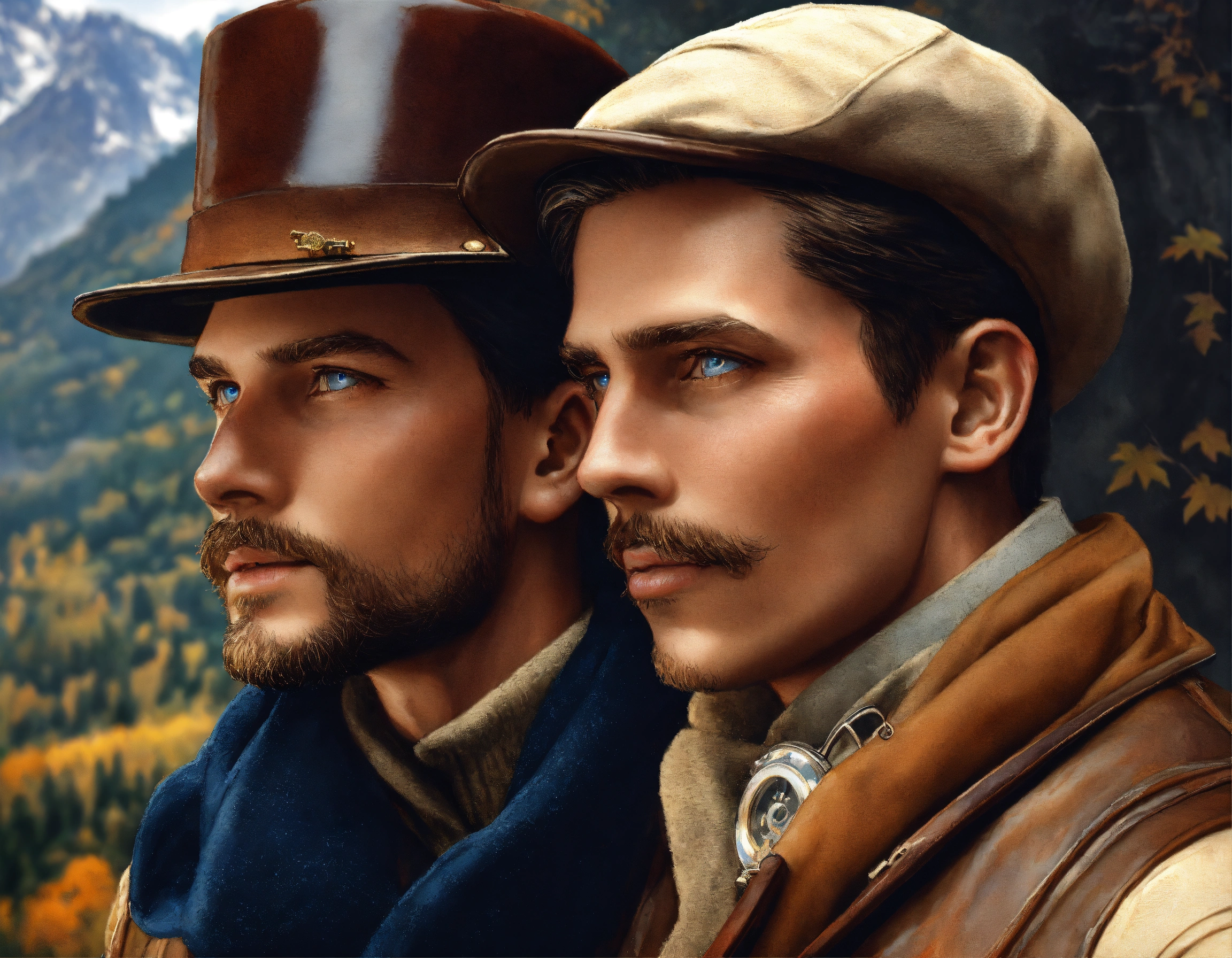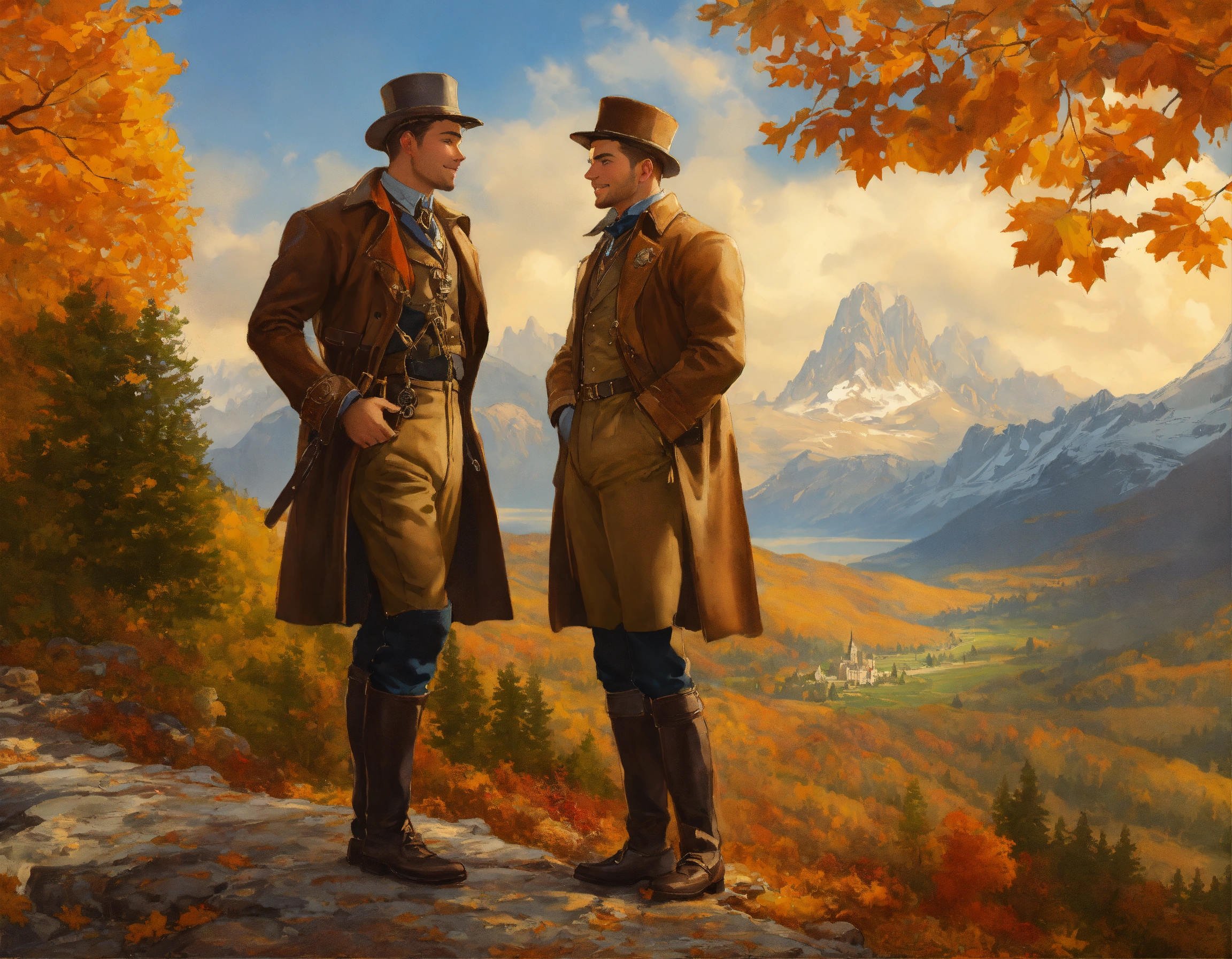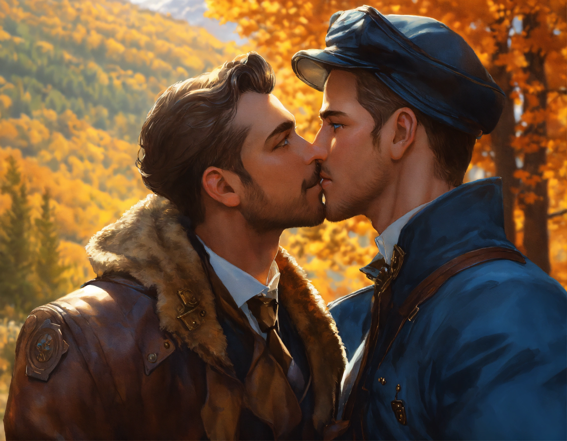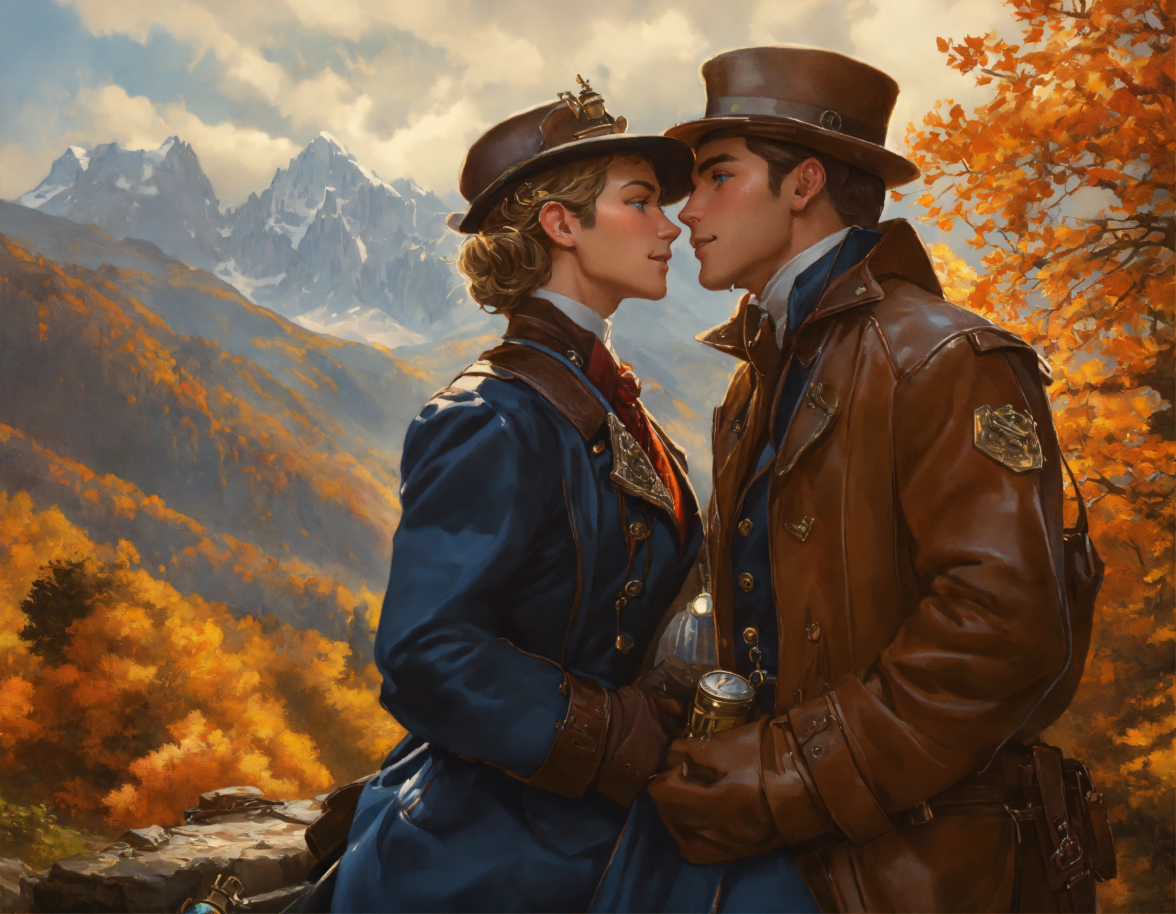 Smiling men in solid warm wool and wet oil rainwear kissing man, he is looking into the mans tender blue eyes, surrounded by tall peaks and crisp clear air, nostalgic, detailed, high detail, autumn landscape, beautiful photorealistic illustration, intricate details, natural lighting, 8 k, artstation, by andres rocha and albert bierstadt and greg rutkowski, by j.c. leyendecker, steampunk, perfectly detailed image, close-up, excellent lighting, photorealistic, digital illustration, realism, by tom of finland, bastien lecouffe-deharme, norman rockwell, daniel ridgway knight, mike dargas, lucio amitrano, omar ortiz, disney