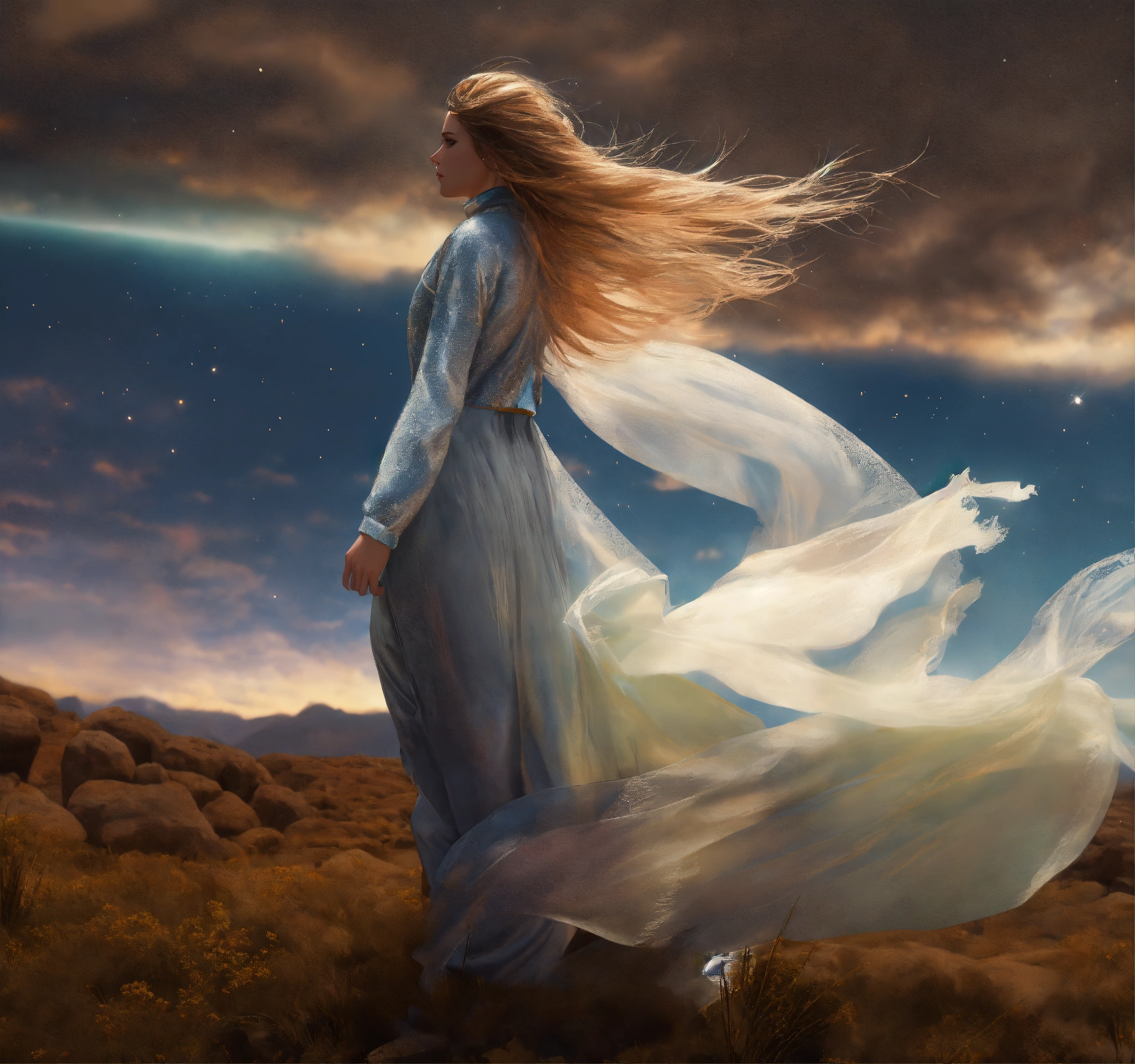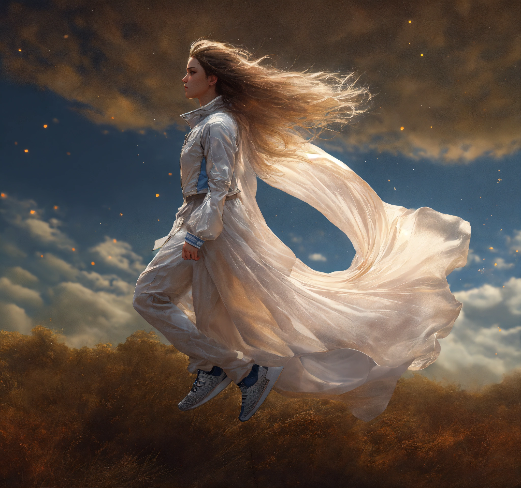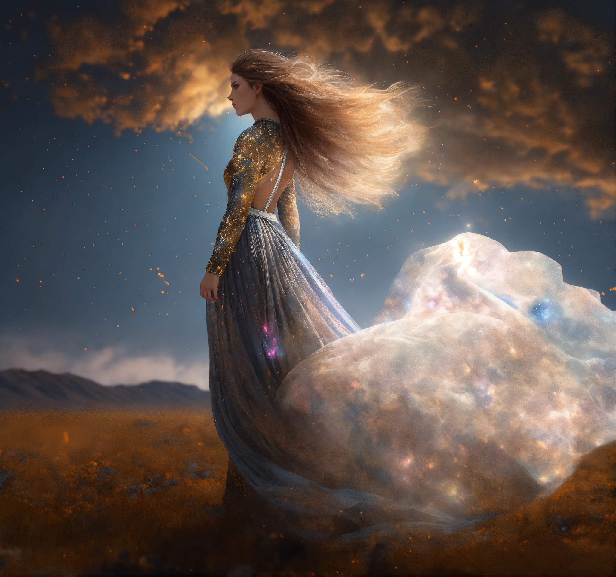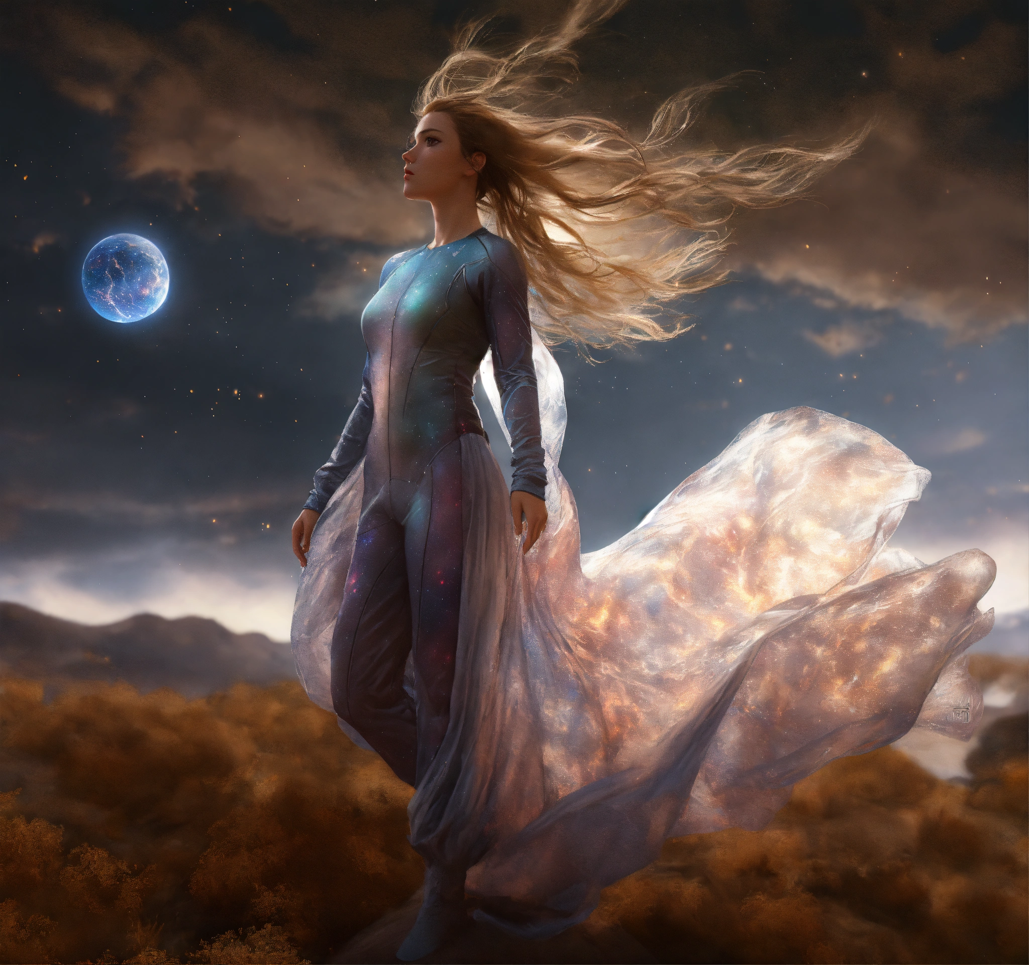 Headless, hair in the wind, full body, hyper realism, poetic, romantic, sport suit, realistic shading, realistic render, detailed textures, photorealistic, wide shot, nebula landscape