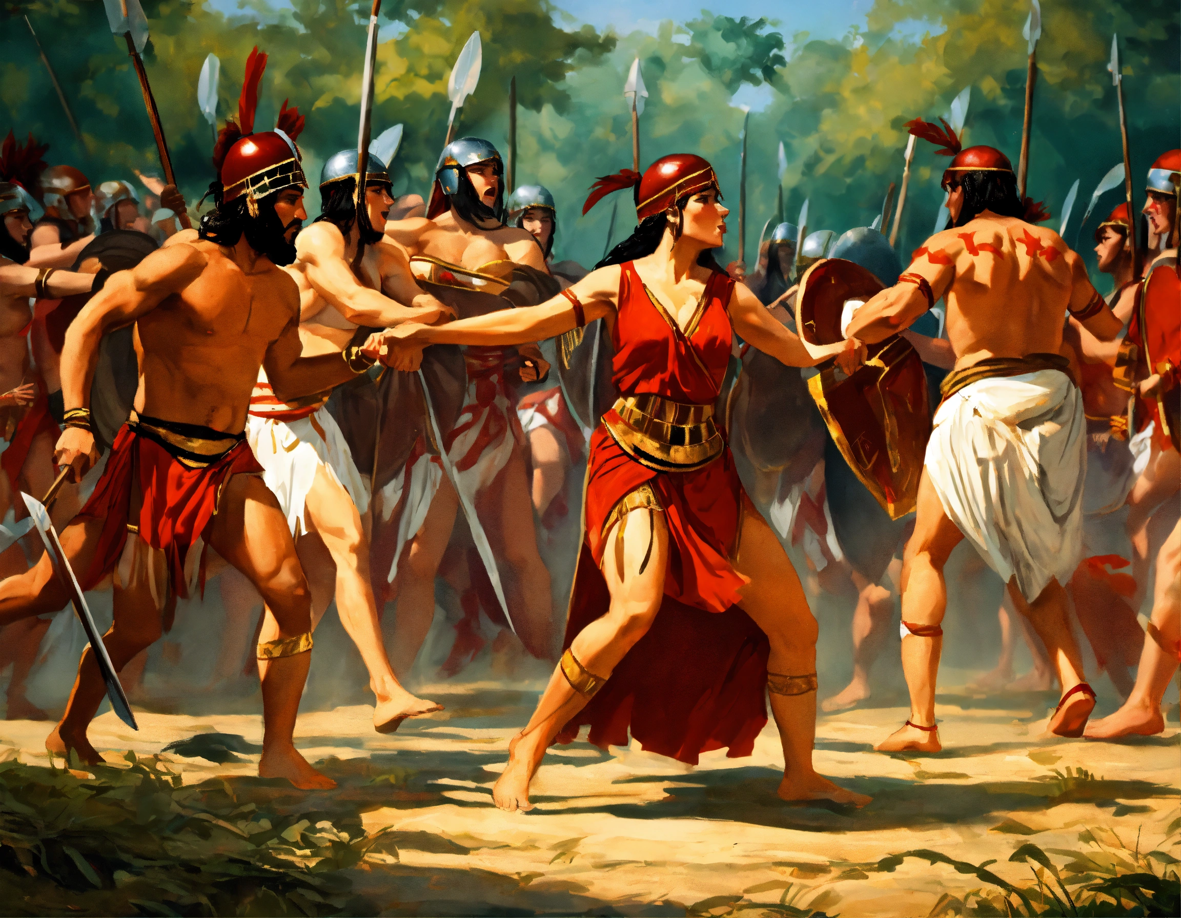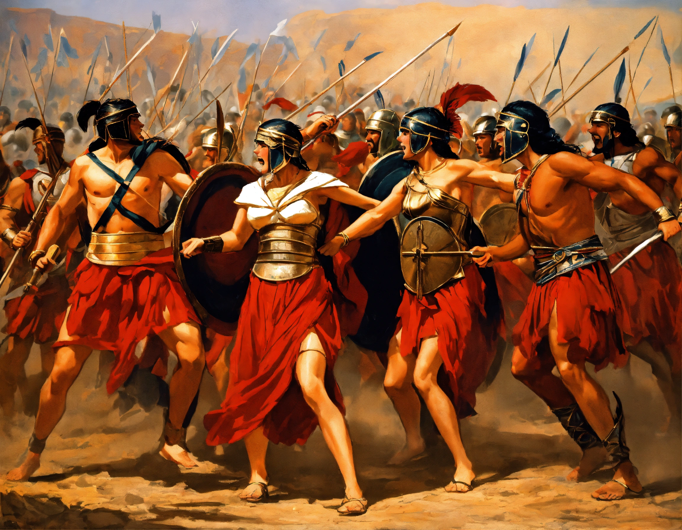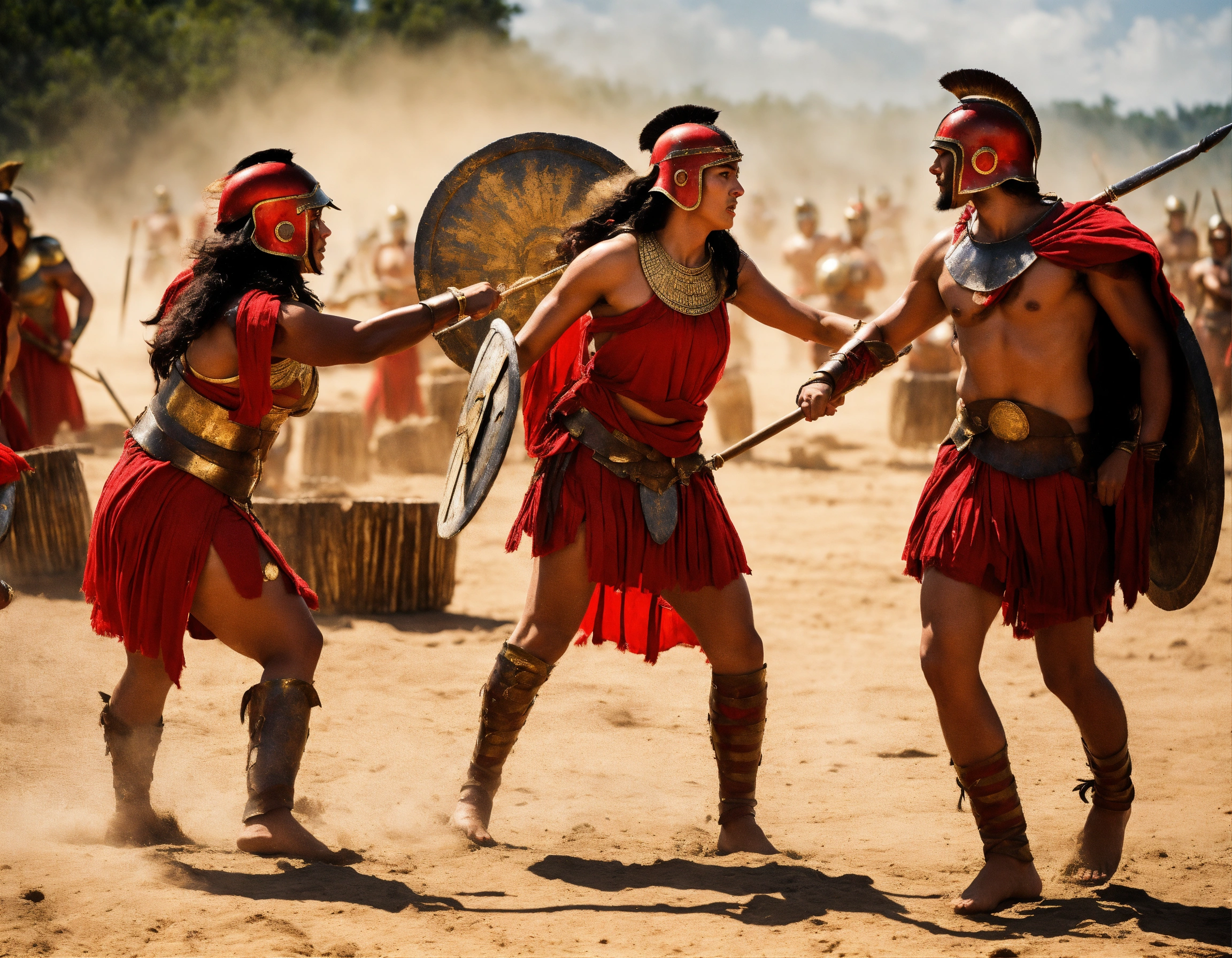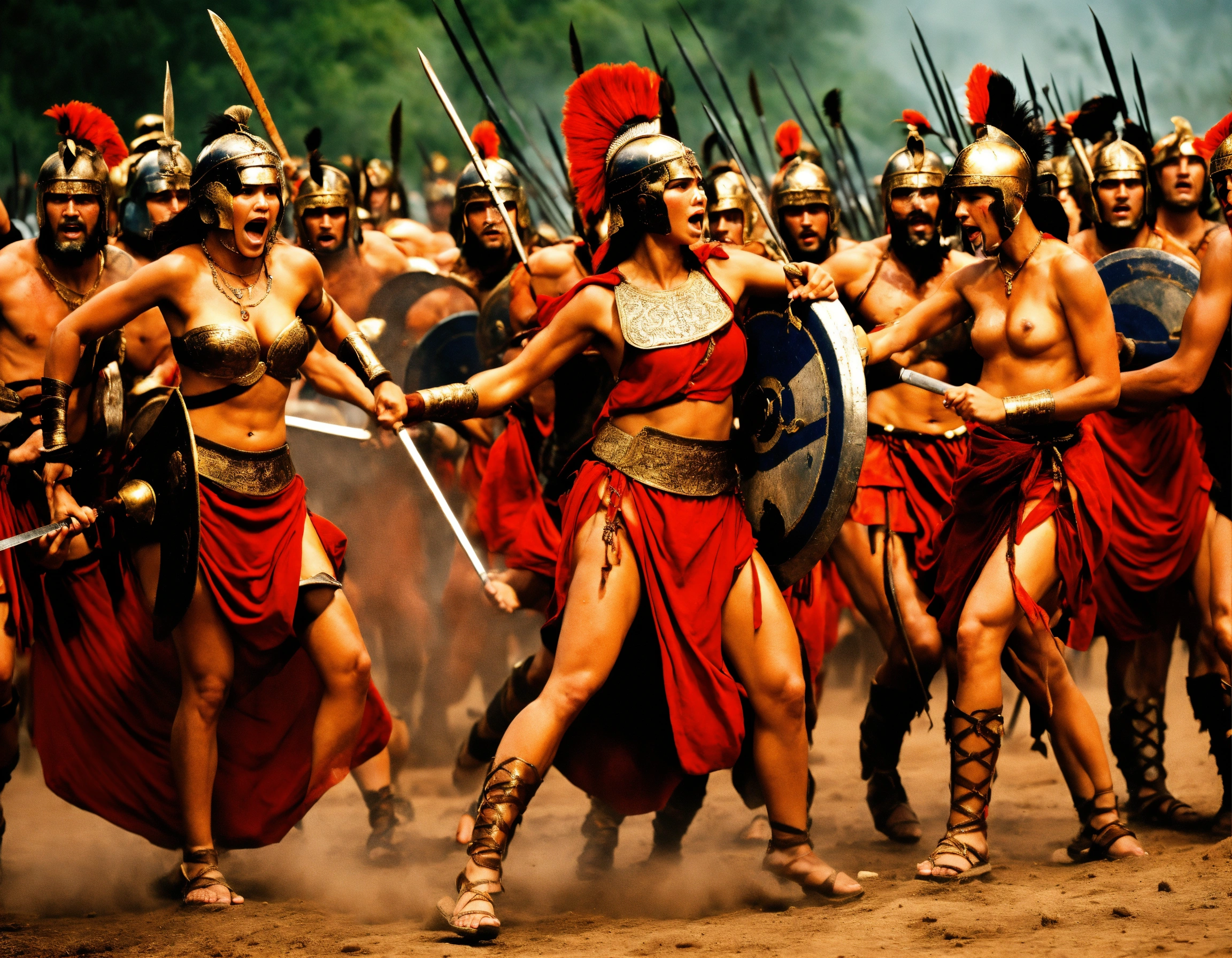 Amazonian women (in full-length amazonian clothing) fight against spartans (men in spartan costumes) red jam on the body, 8 people in full height, ancient greece 1st century bc
