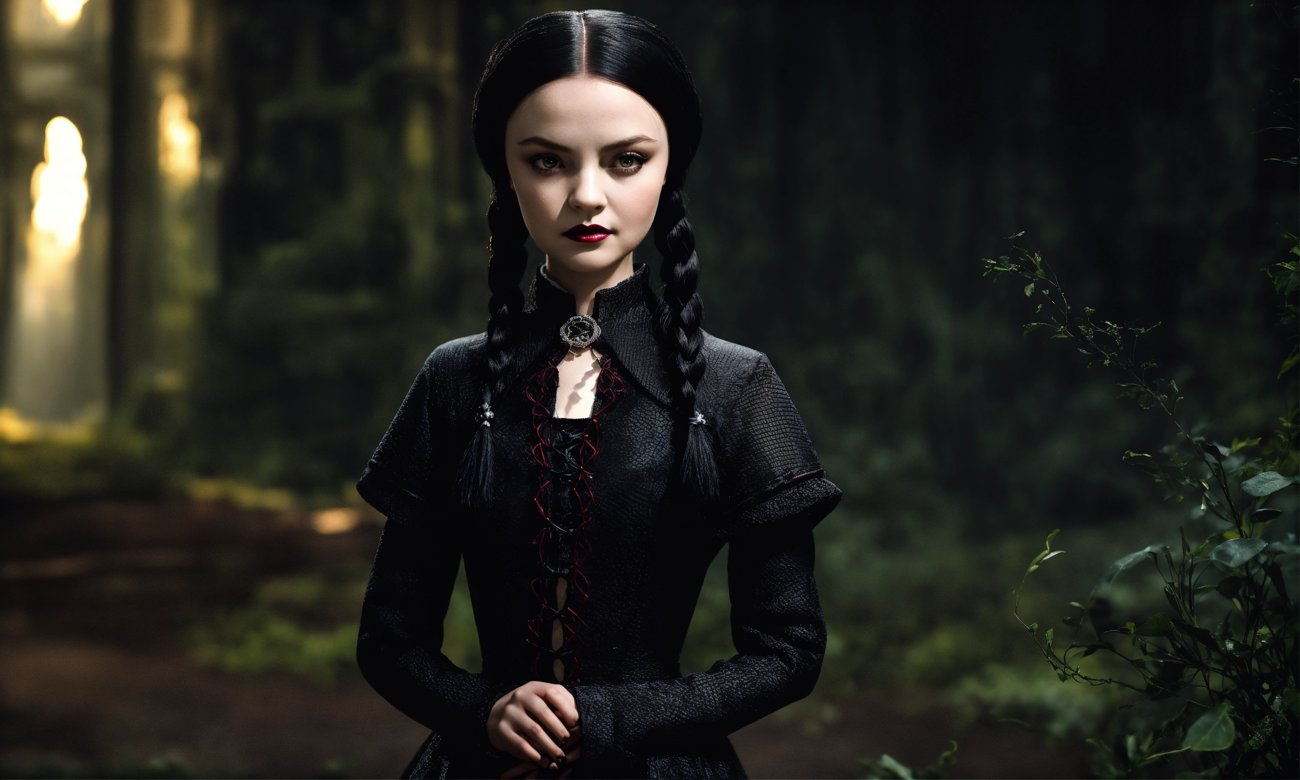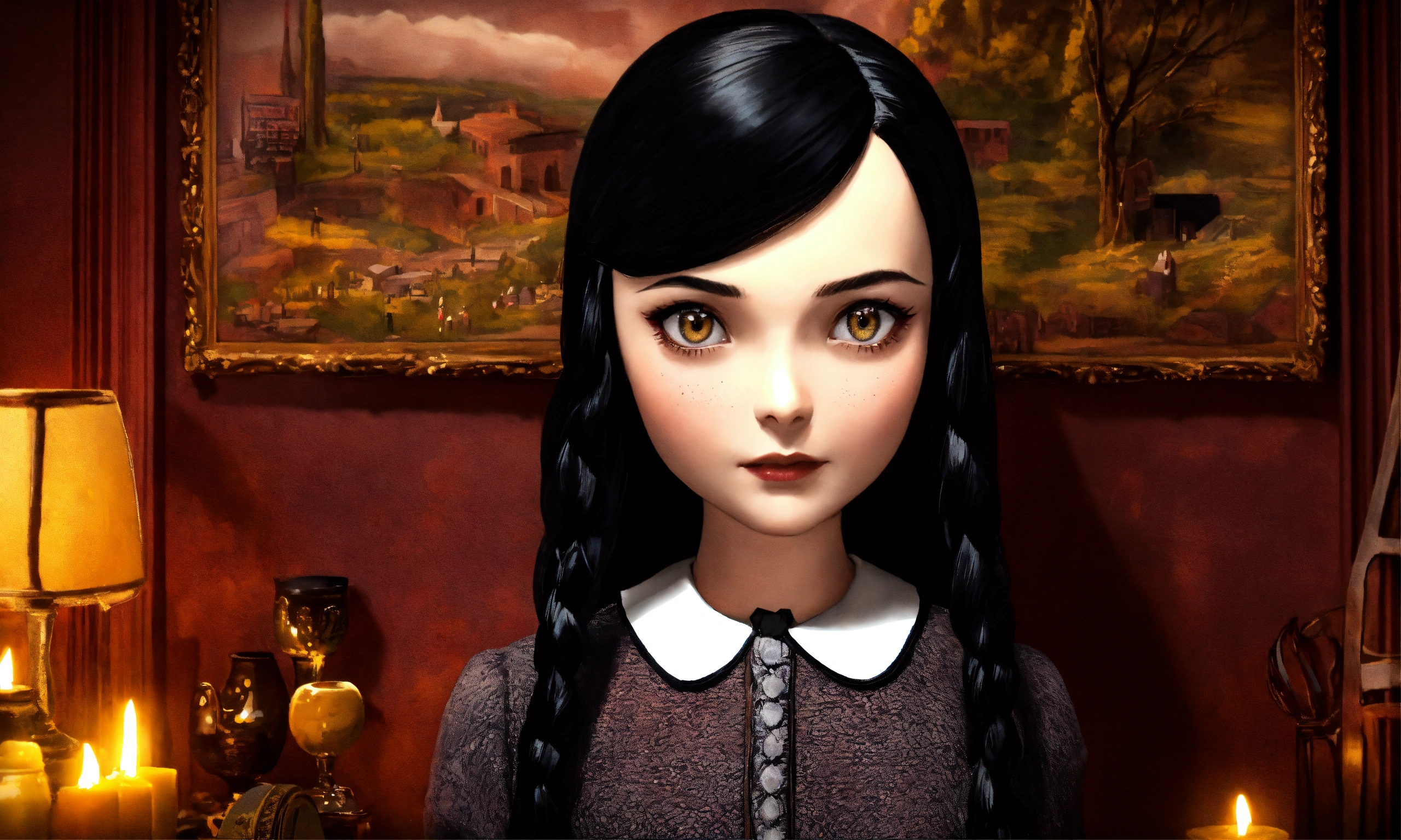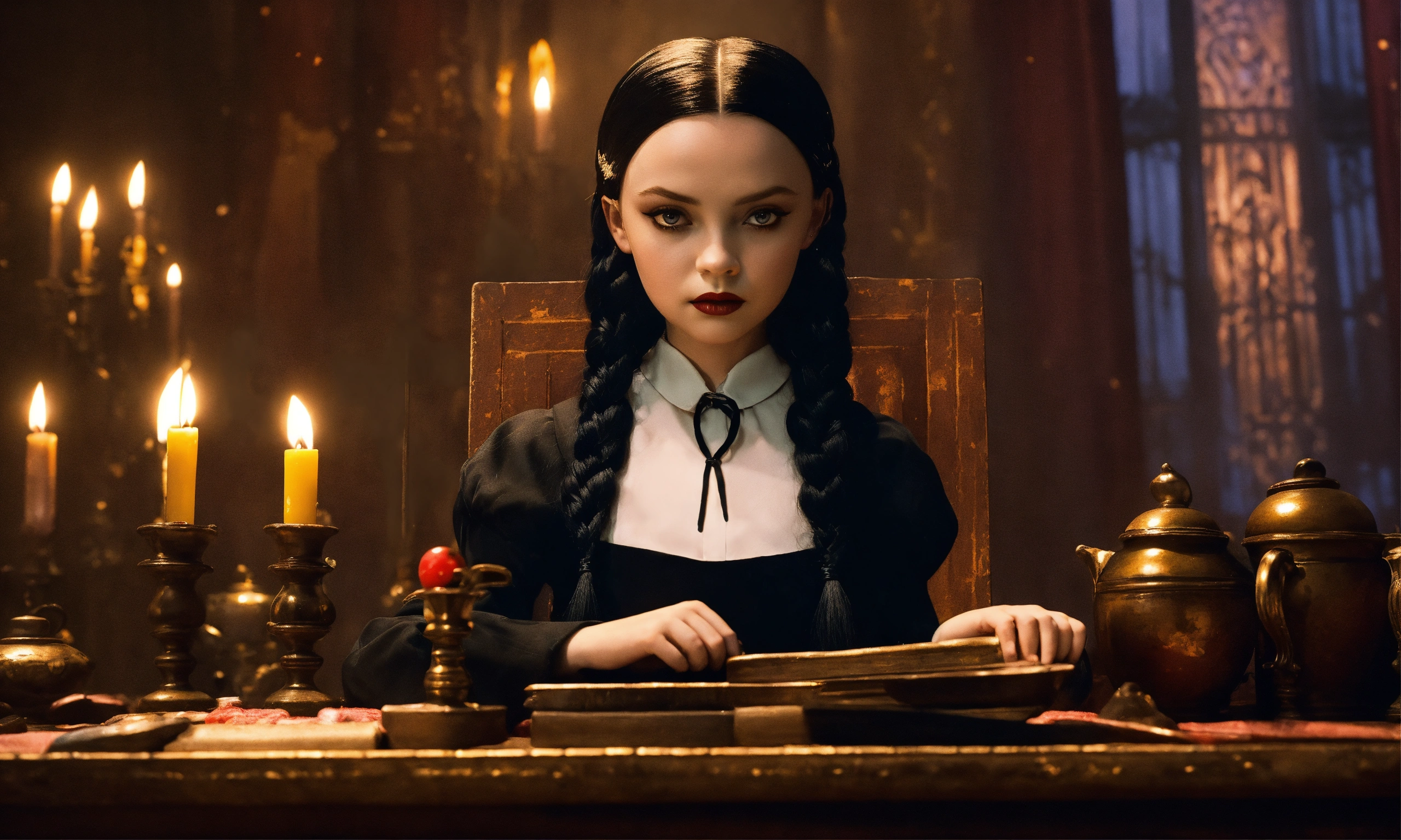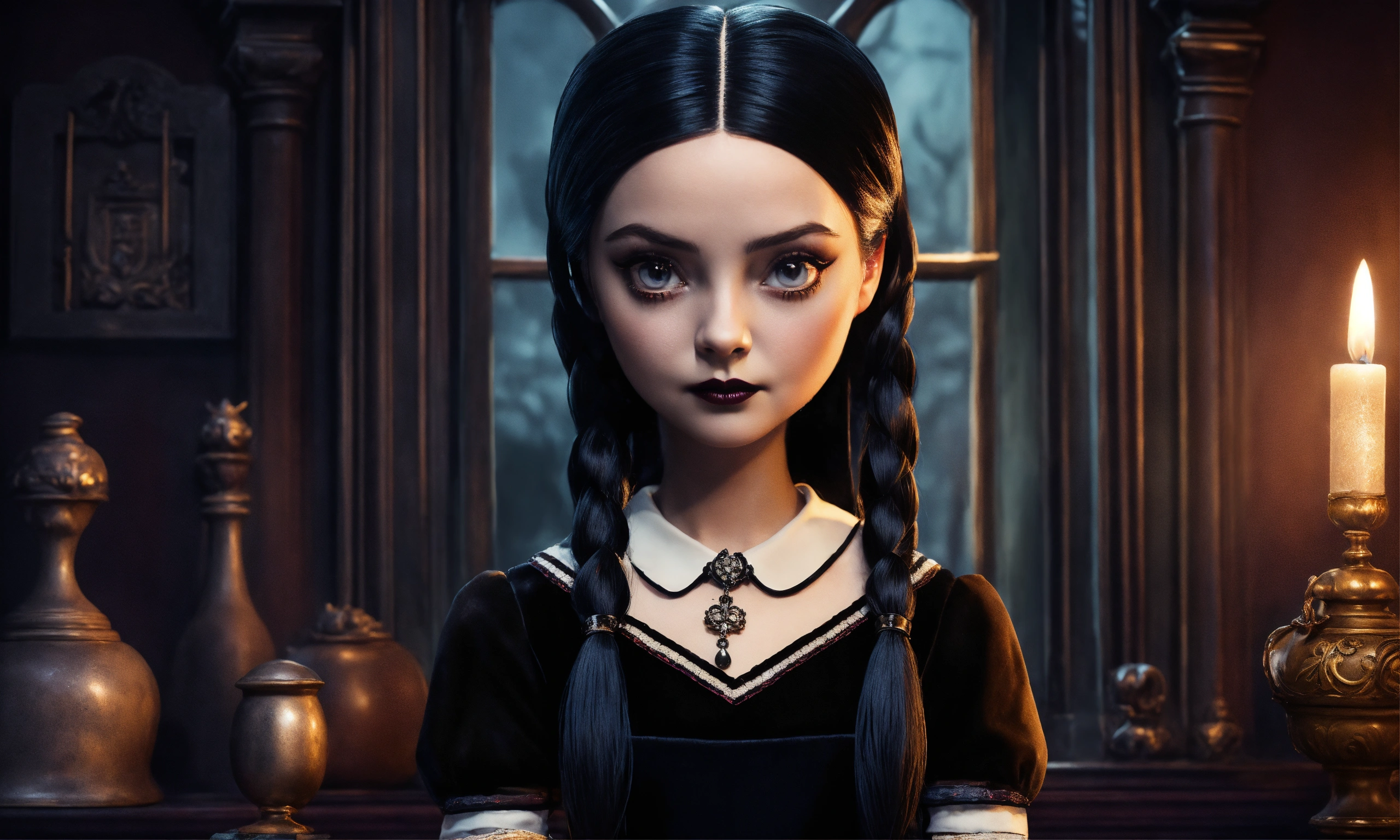 Draw wednesday addams, the daughter of gomez and morticia, with their characteristic facial features and attire. position her in a pose that reflects her characteristic eccentricity and enigmatic nature. create a background that corresponds to the dark and mysterious atmosphere of the addams family. include distinctive elements such as antique objects, dark colors, and ominous shadows. incorporate details that emphasize her unique personality, such as her favorite toys or items she typically uses. ensure that her cold and ominous character is reflected in her facial expression and posture. make sure the color, need like real photo, like real life