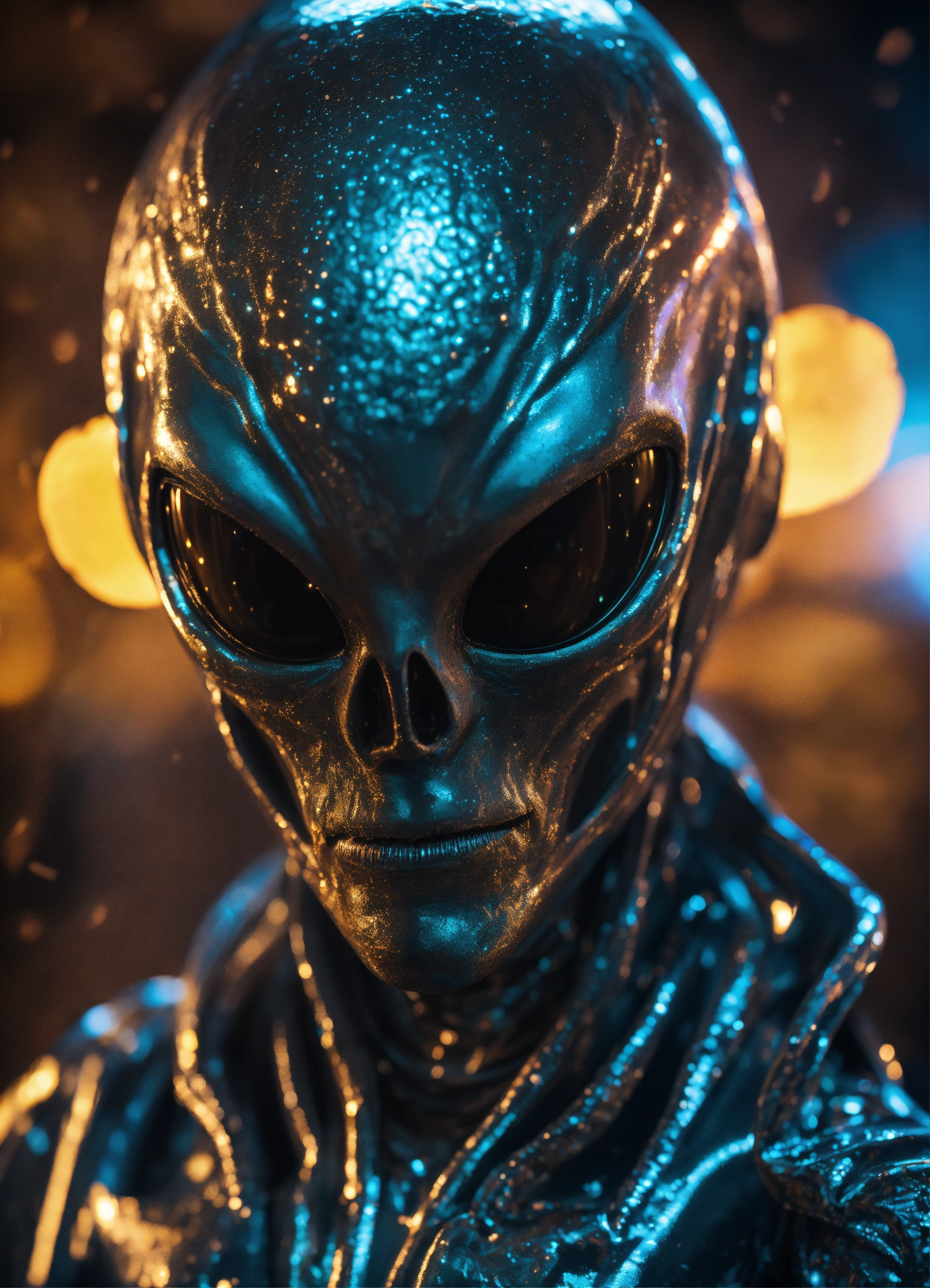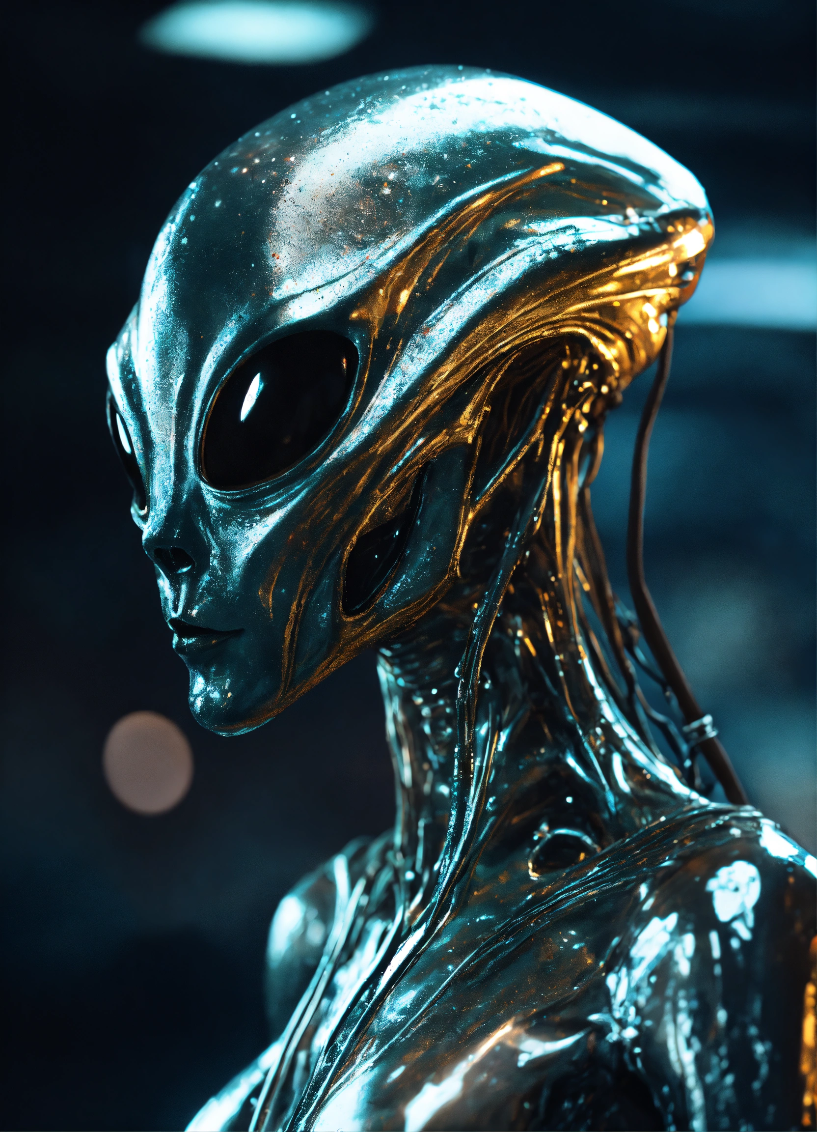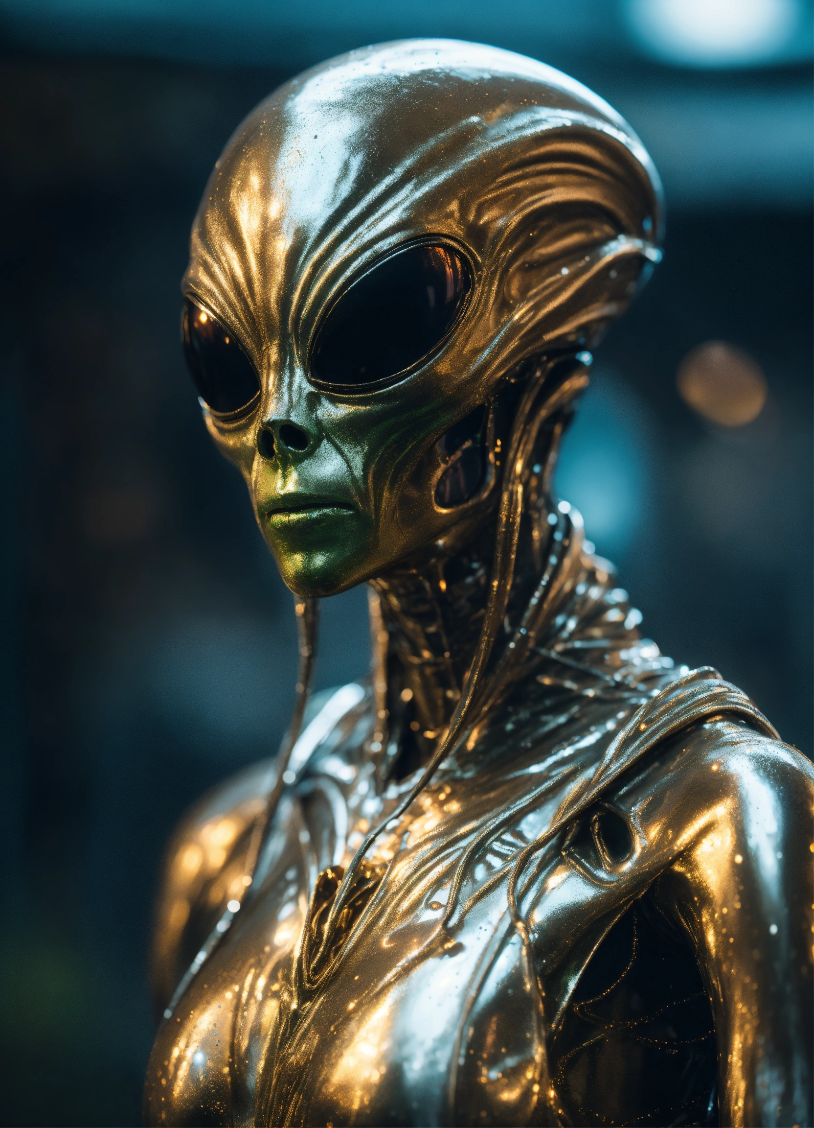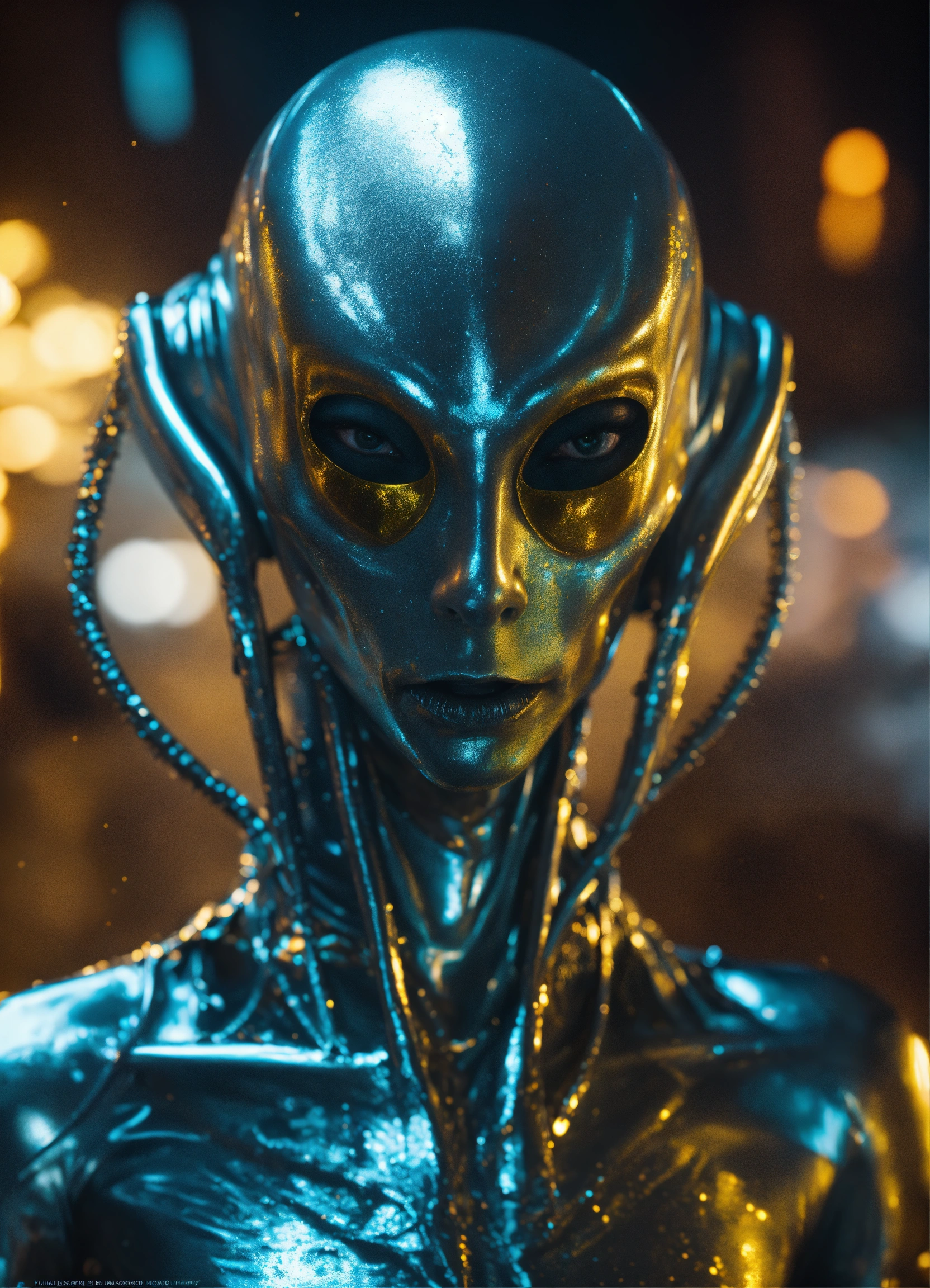 An alien dressed up like a human for halloween, in the style of liquid metal, vray tracing, raw character, 32k uhd, schlieren photography, conceptual portraiture, wet - on - wet blending