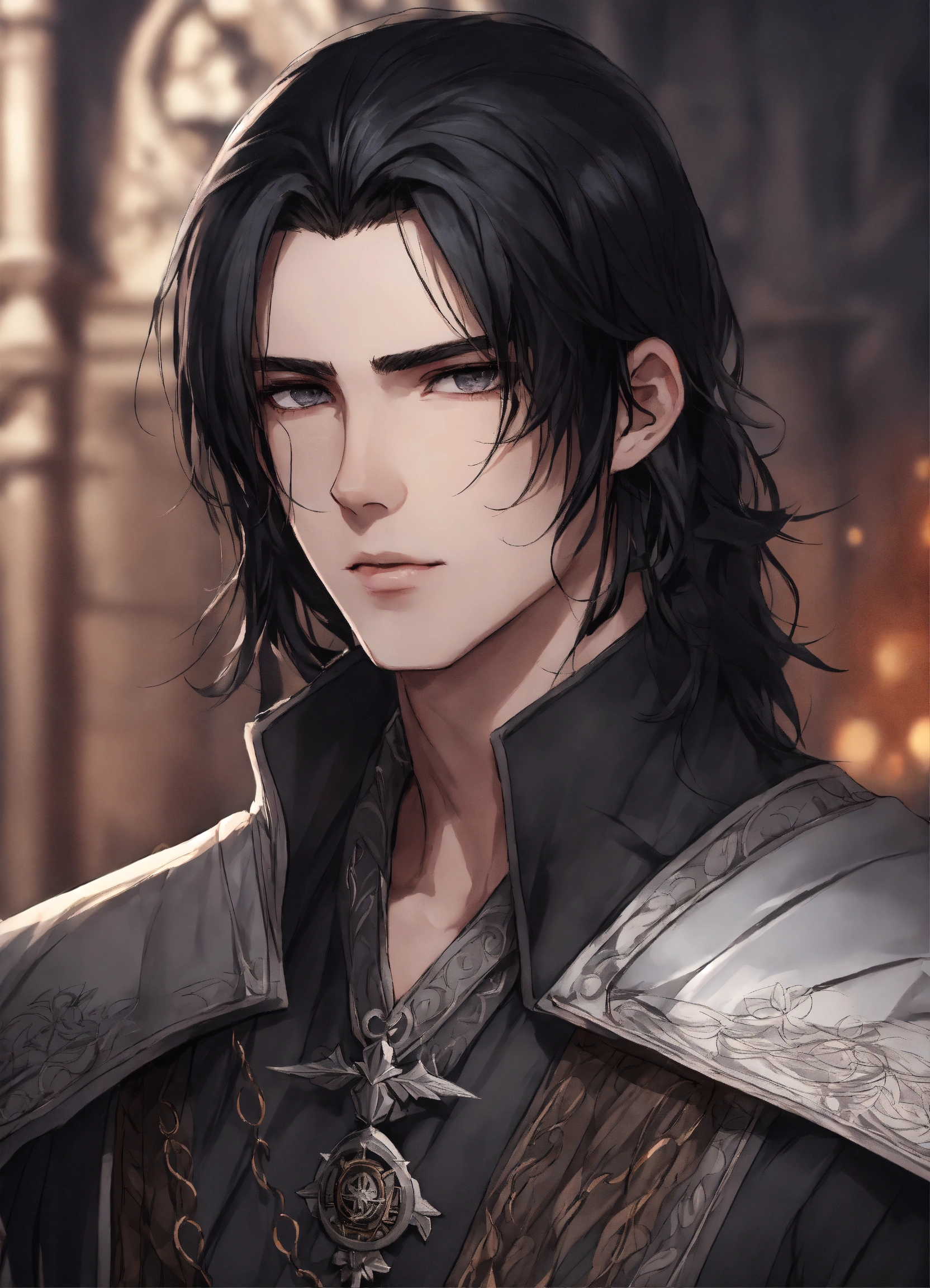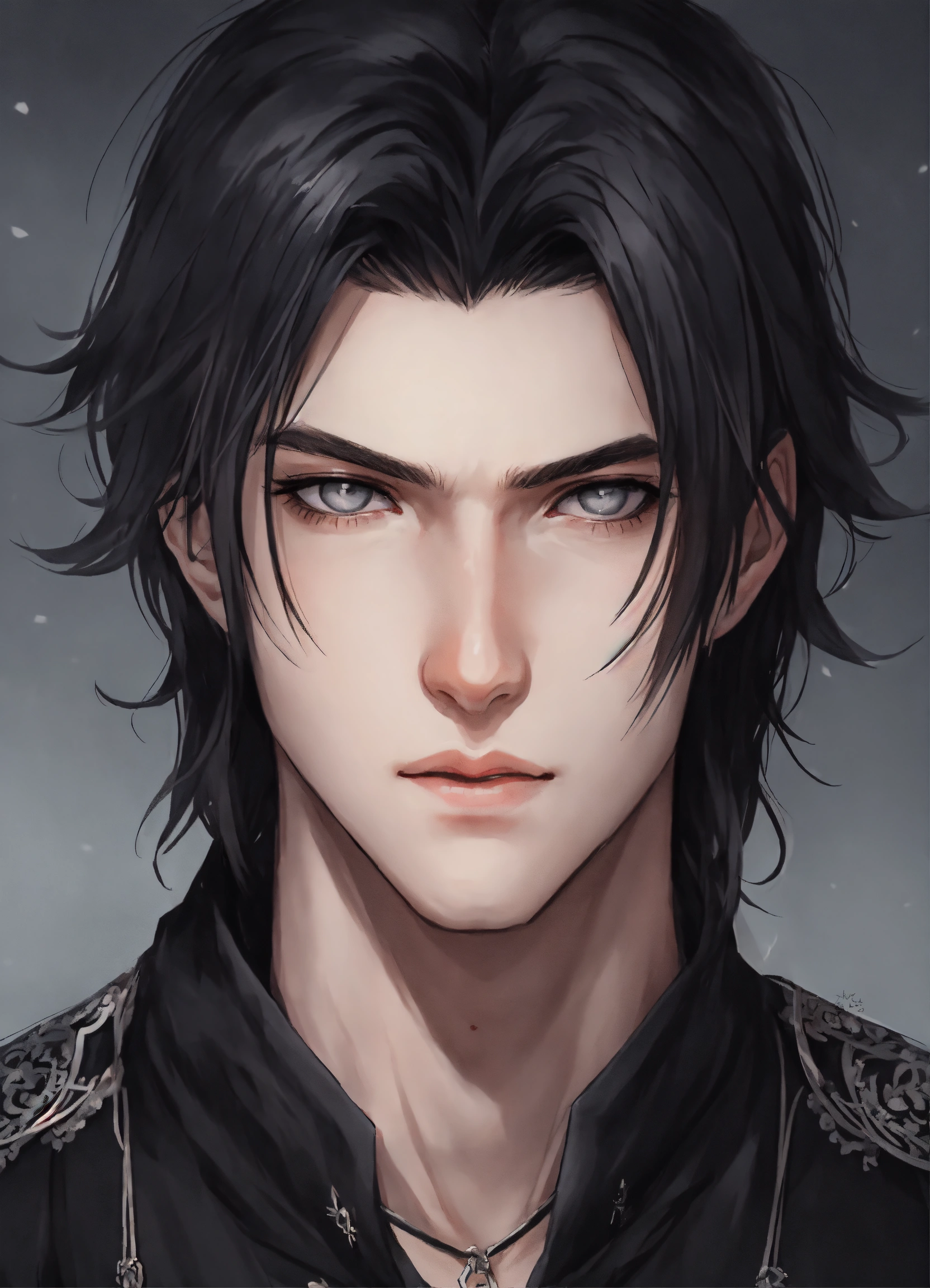 20-year-old slavic man, dark black straight shoulder length hair, grey eyes, deathly pale skin, slvic clothing, anime drawing