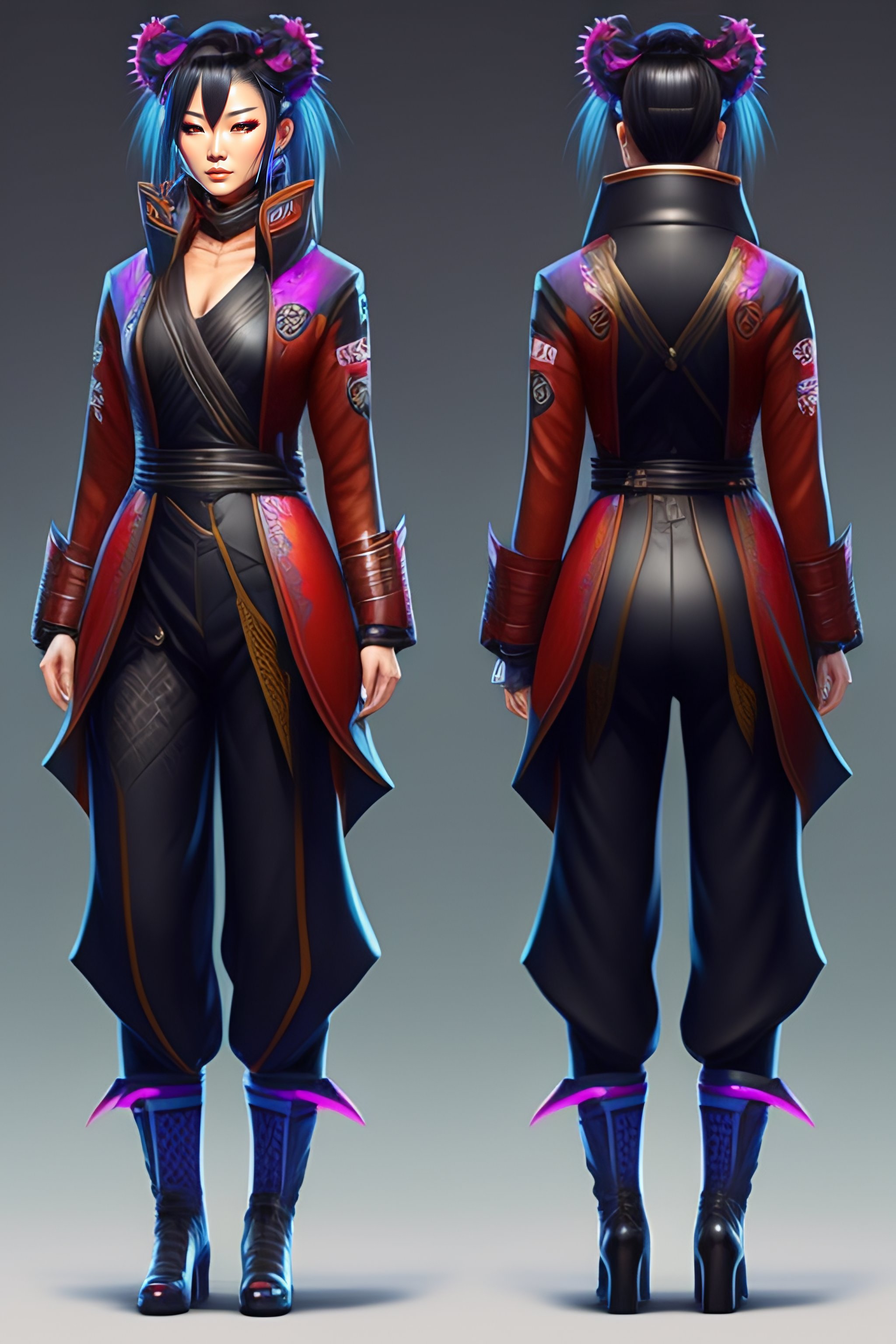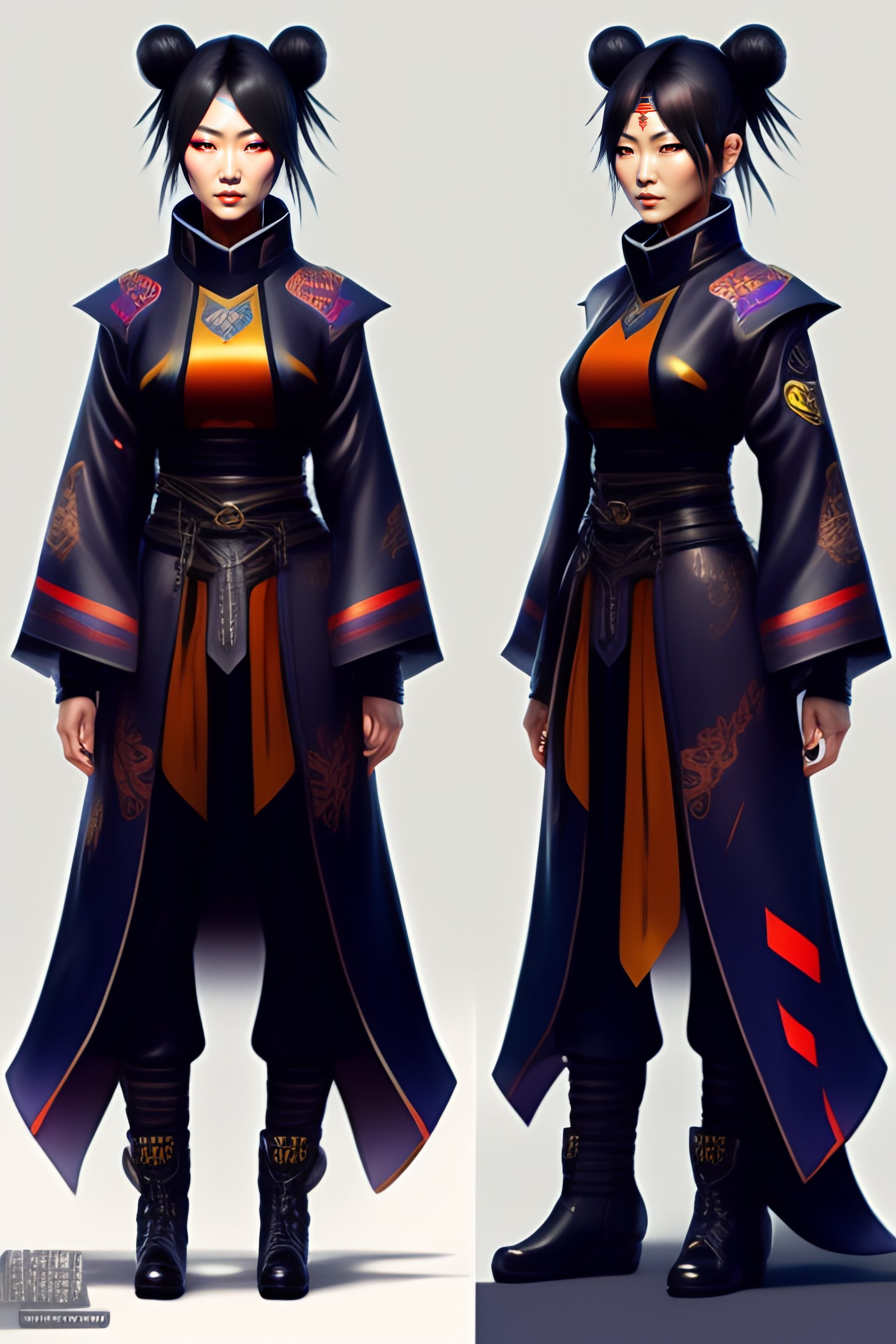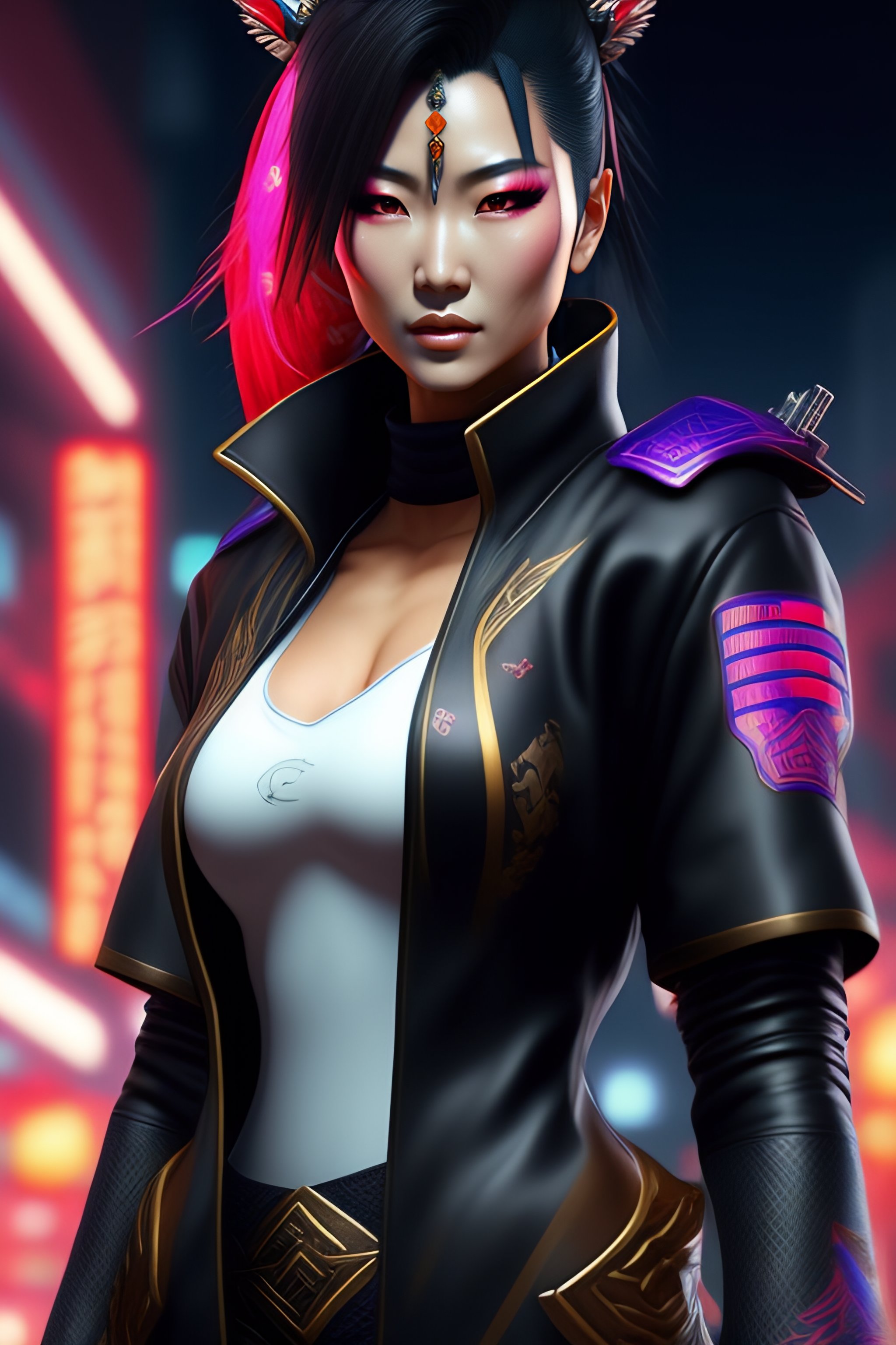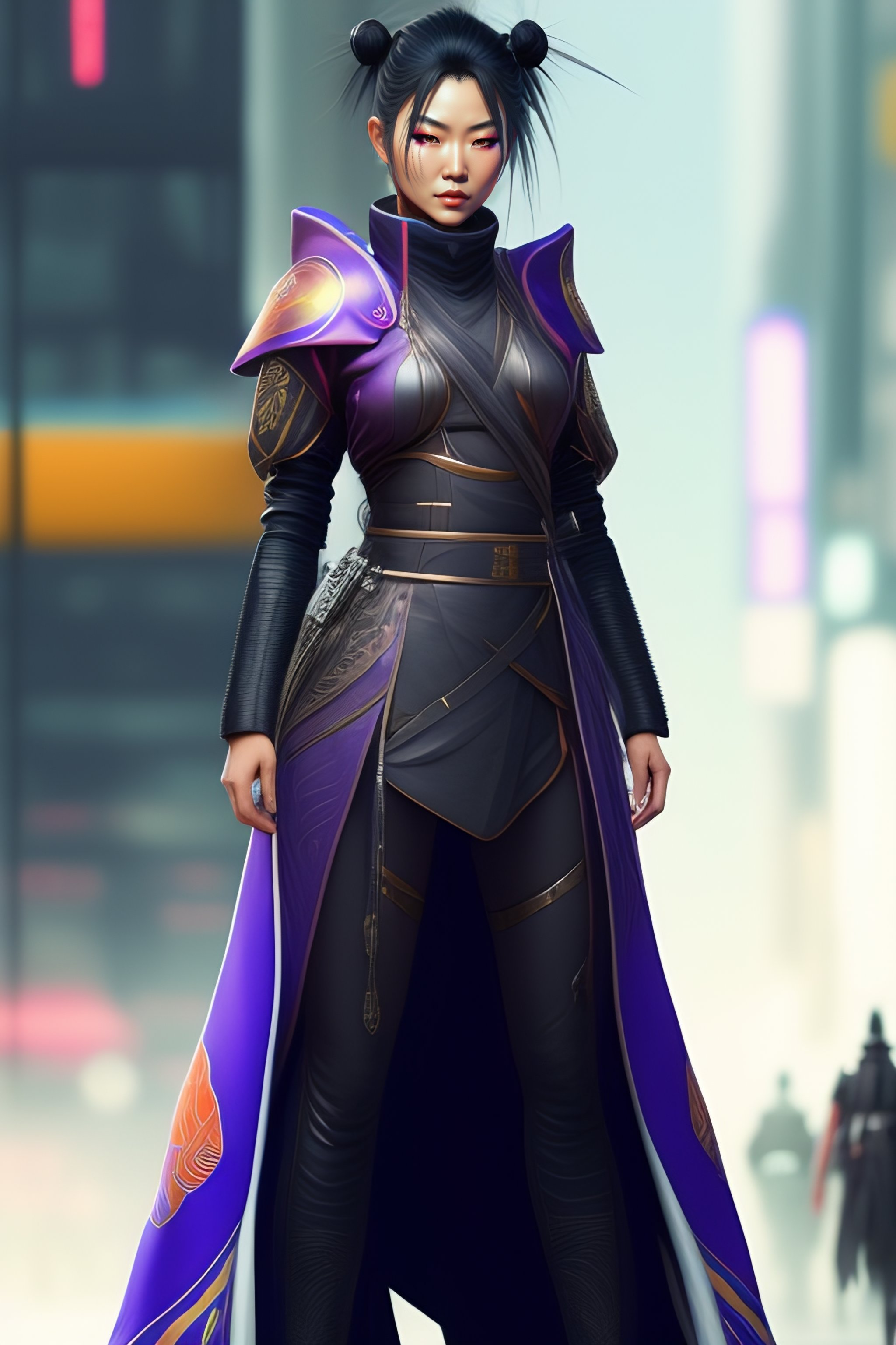 Concept art of a japanese cyberpunk ninja woman, clothing with high detail, a full height, hyper realistic style