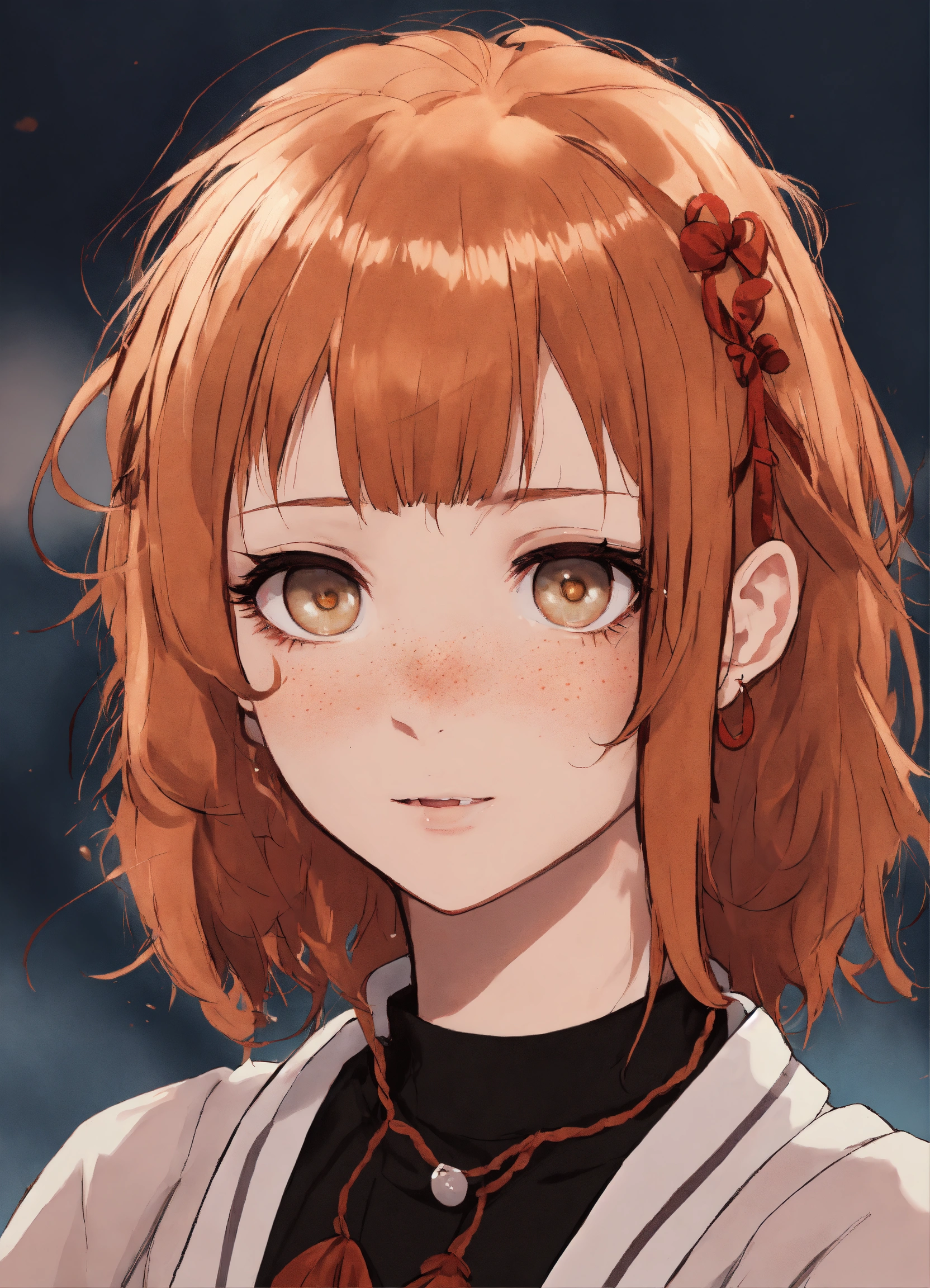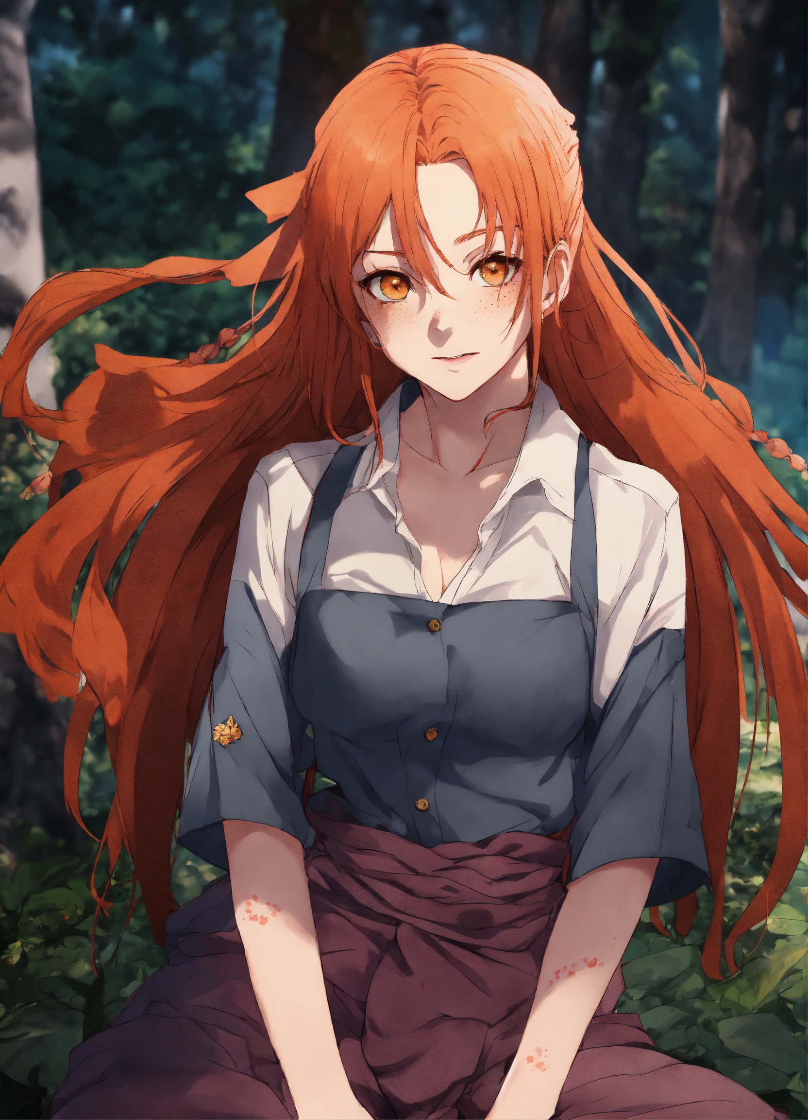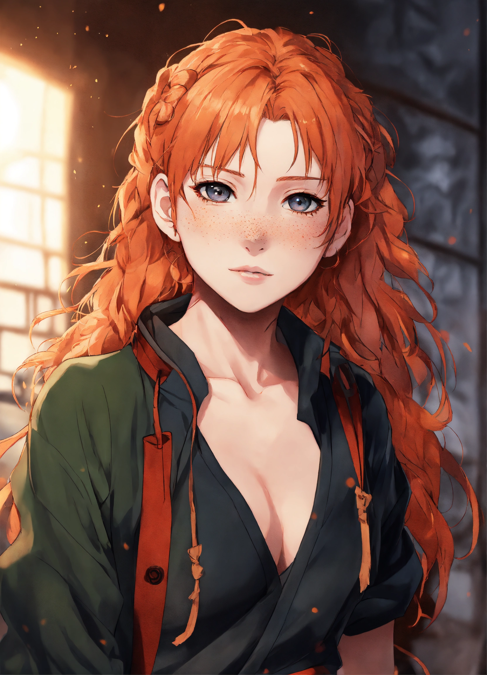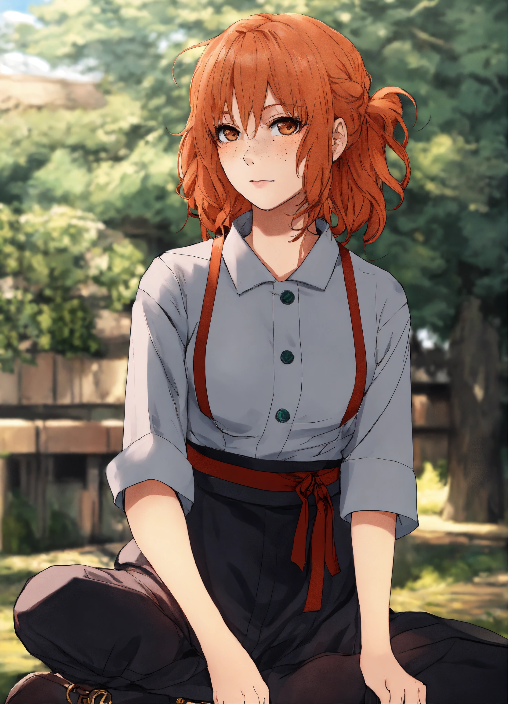 Jujutsu kaisen-style art, gege akutami art, jujutsu kaisen, anime, oc, original character, pretty young woman, ginger hair, pale skin, freckles, full body, feminine outfit, cute outfit, cute clothes, long hair
