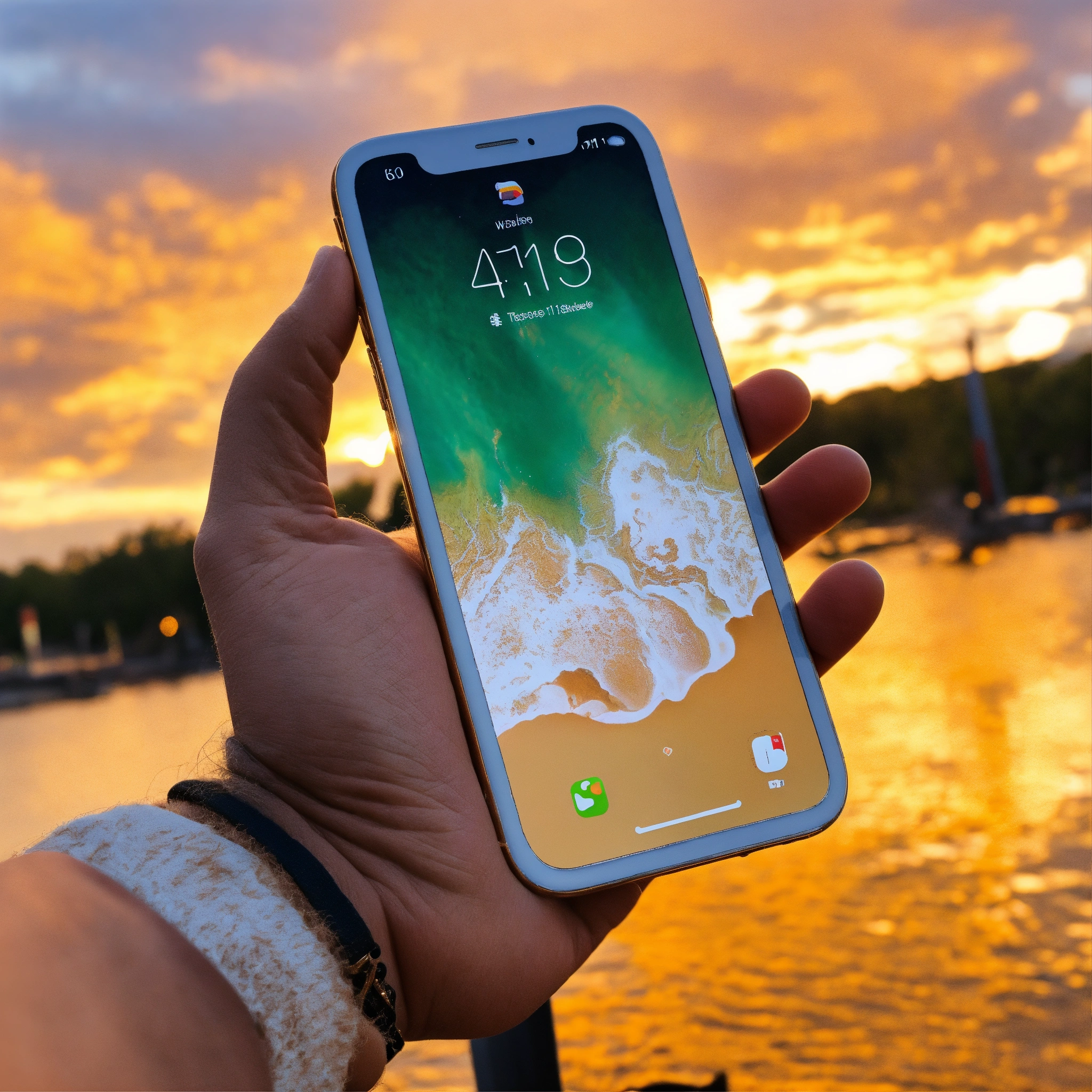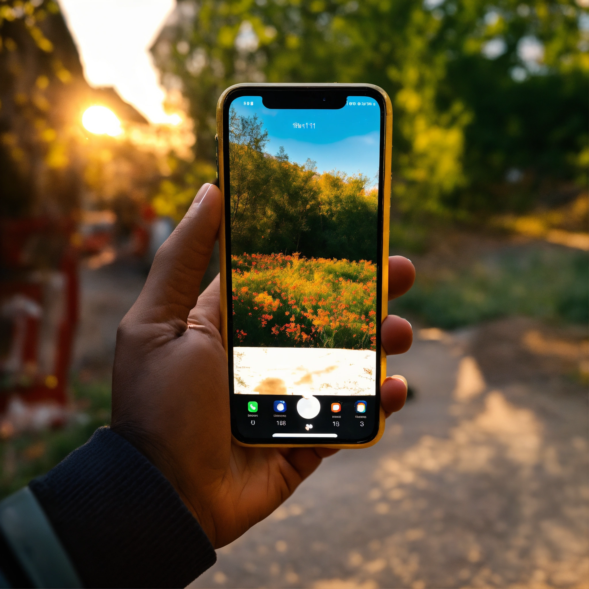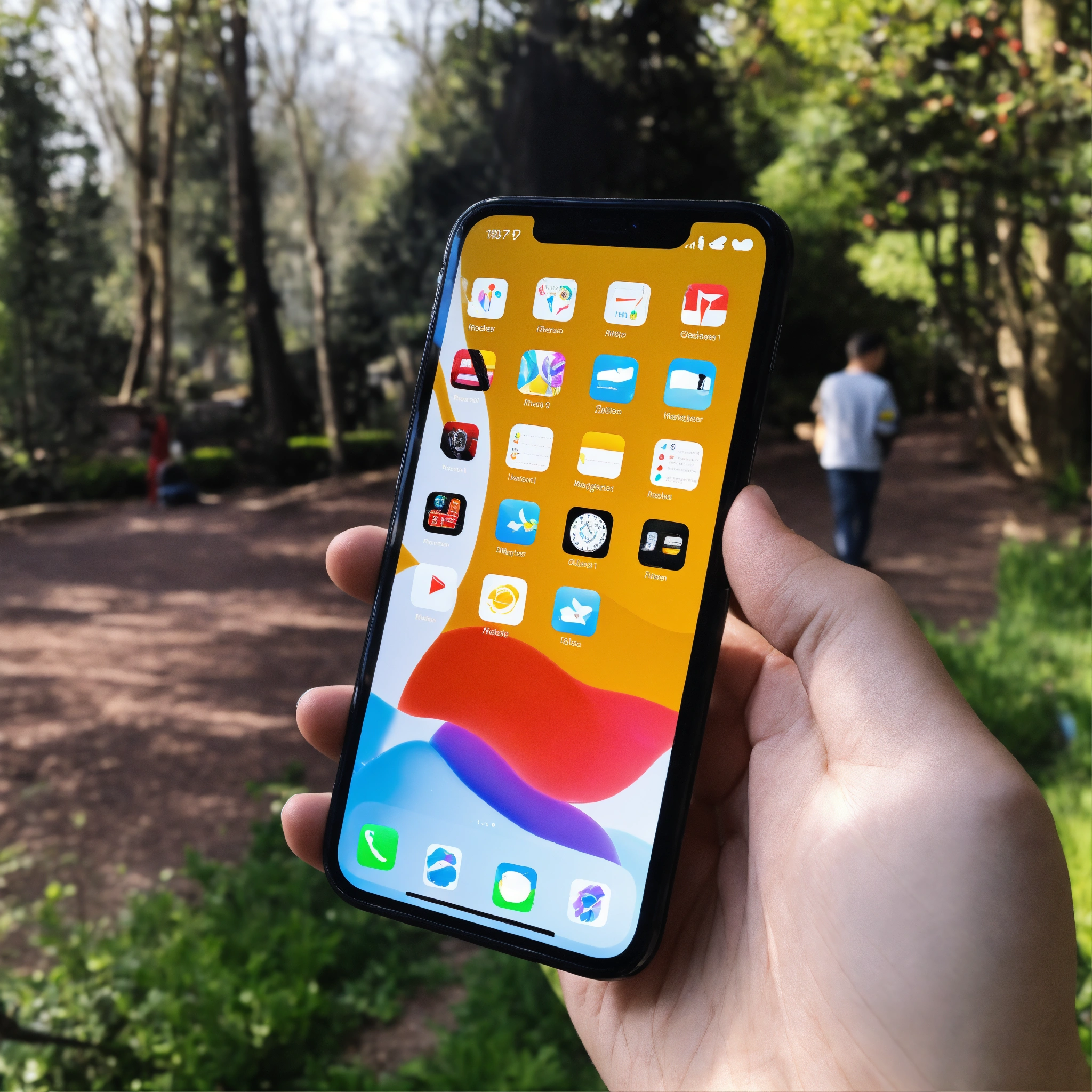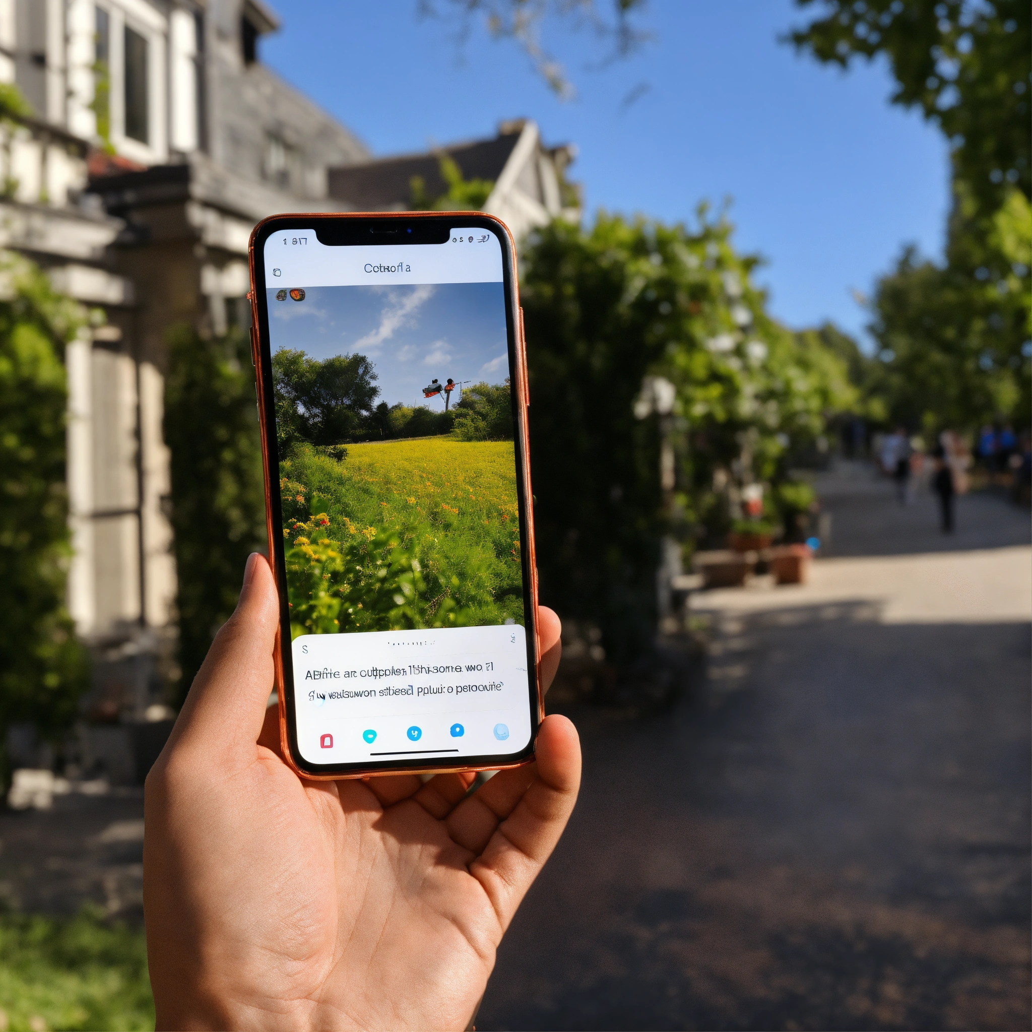 A photo of a person holding a smartphone, the smartphone is a white iphone 14 plus, the person is outdoors on a sunny day