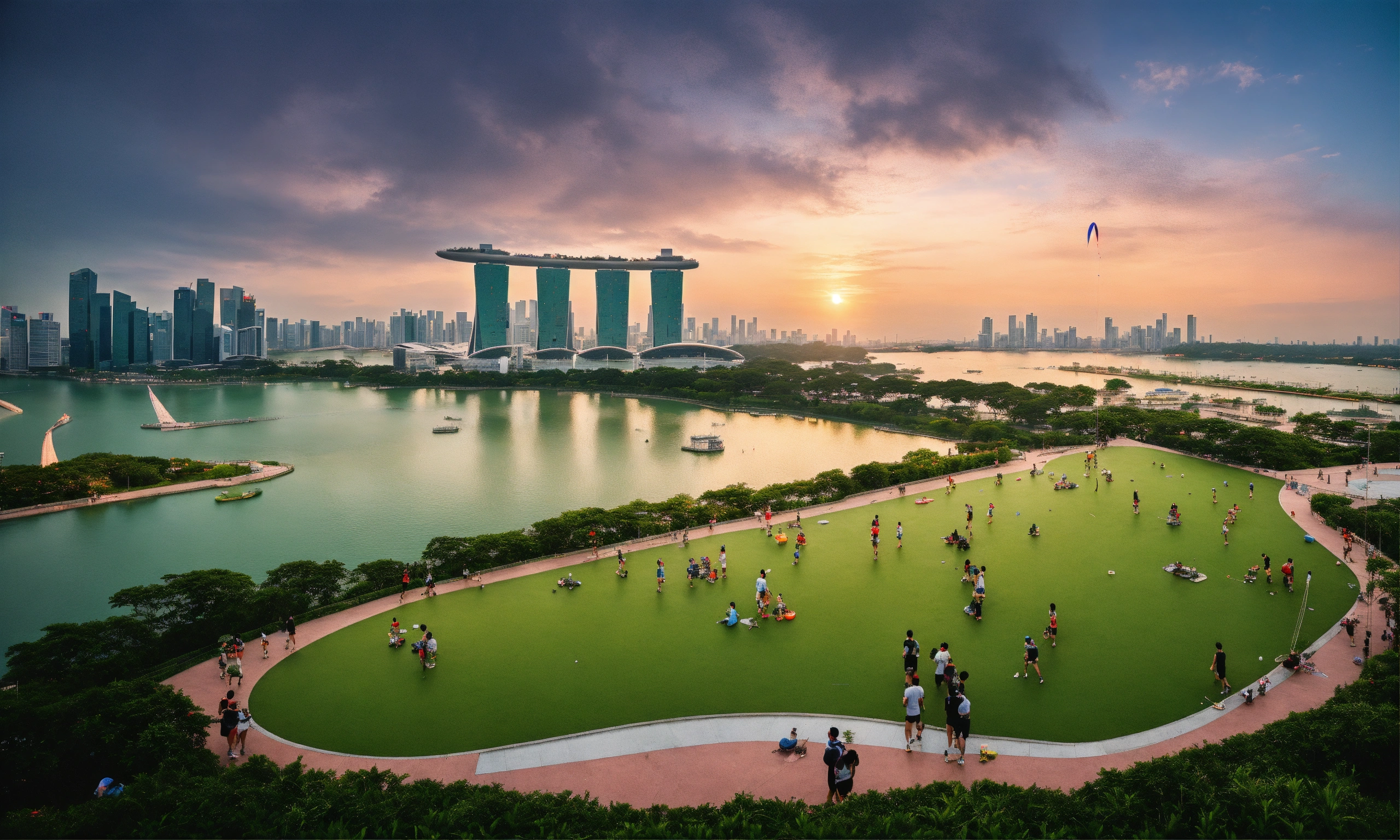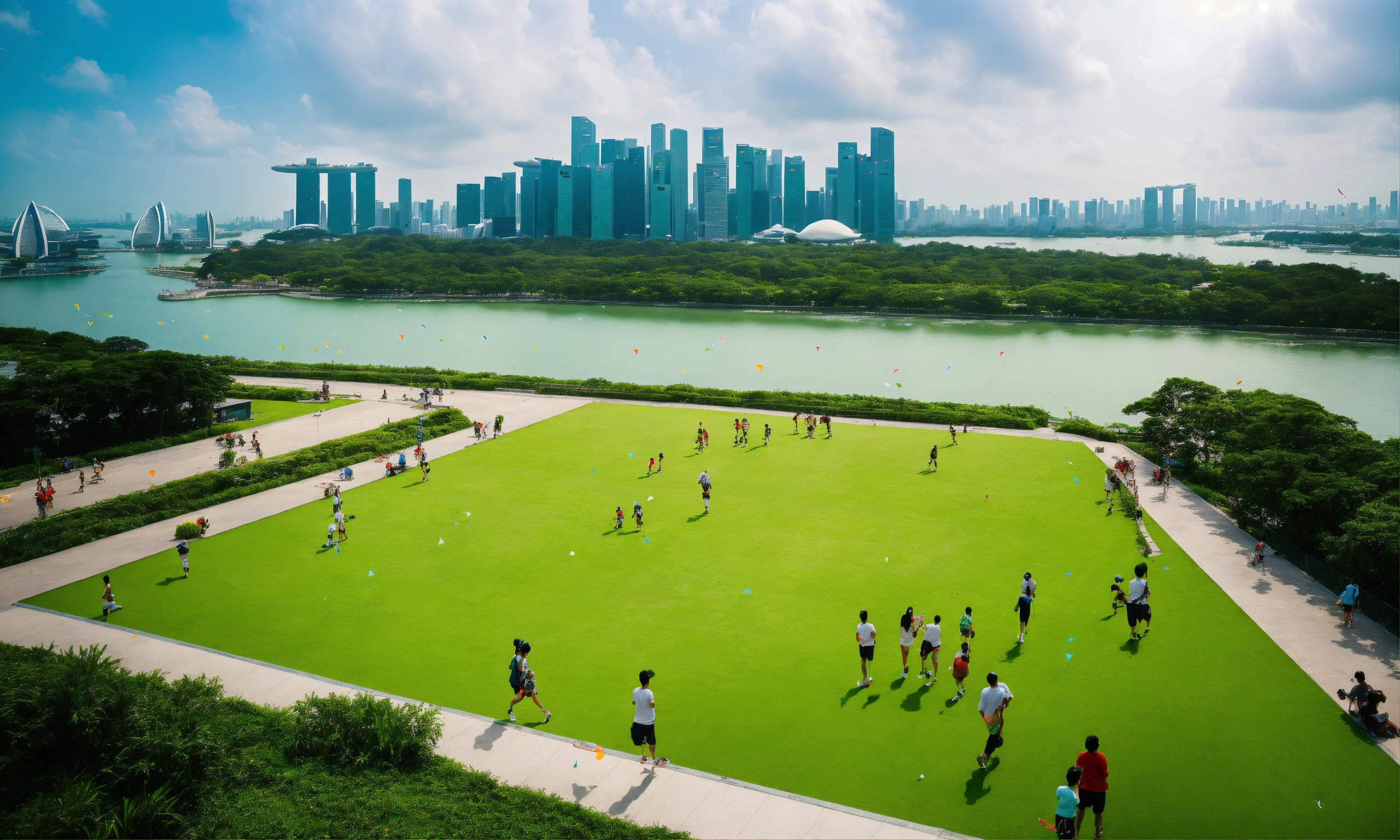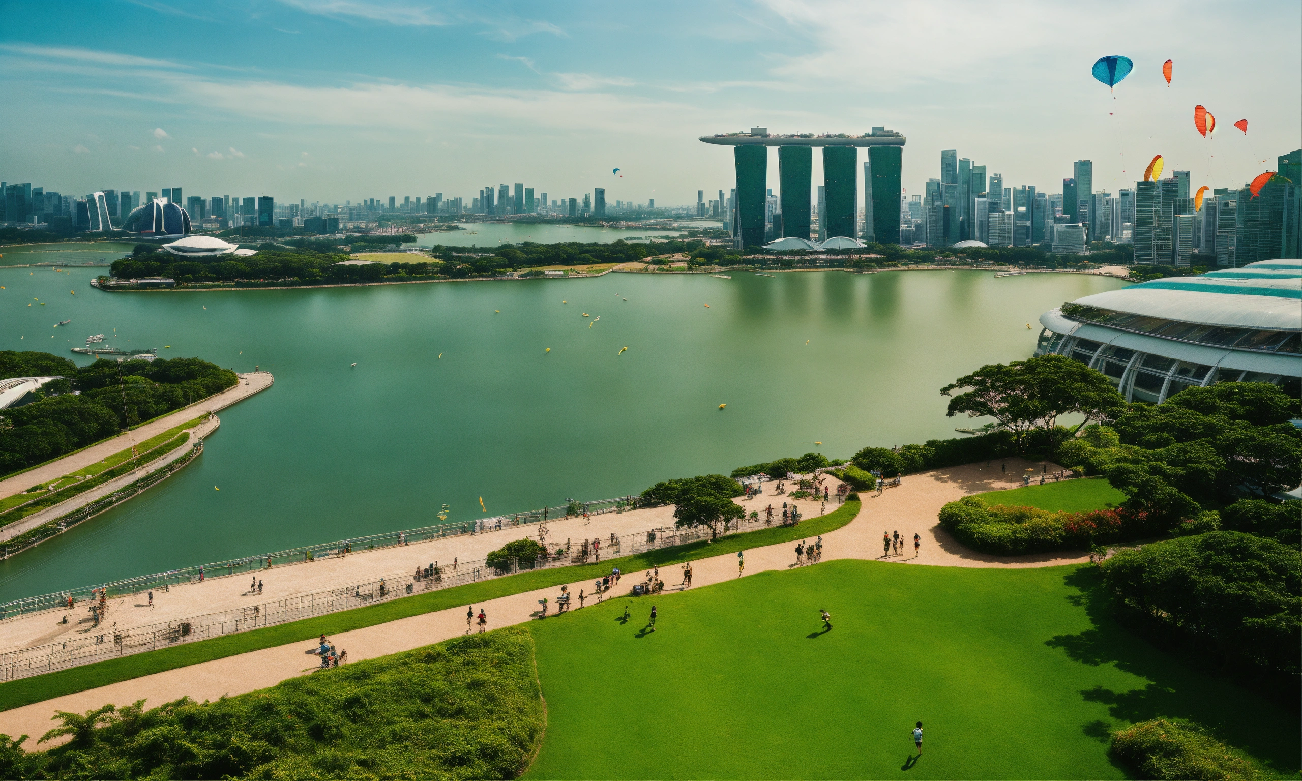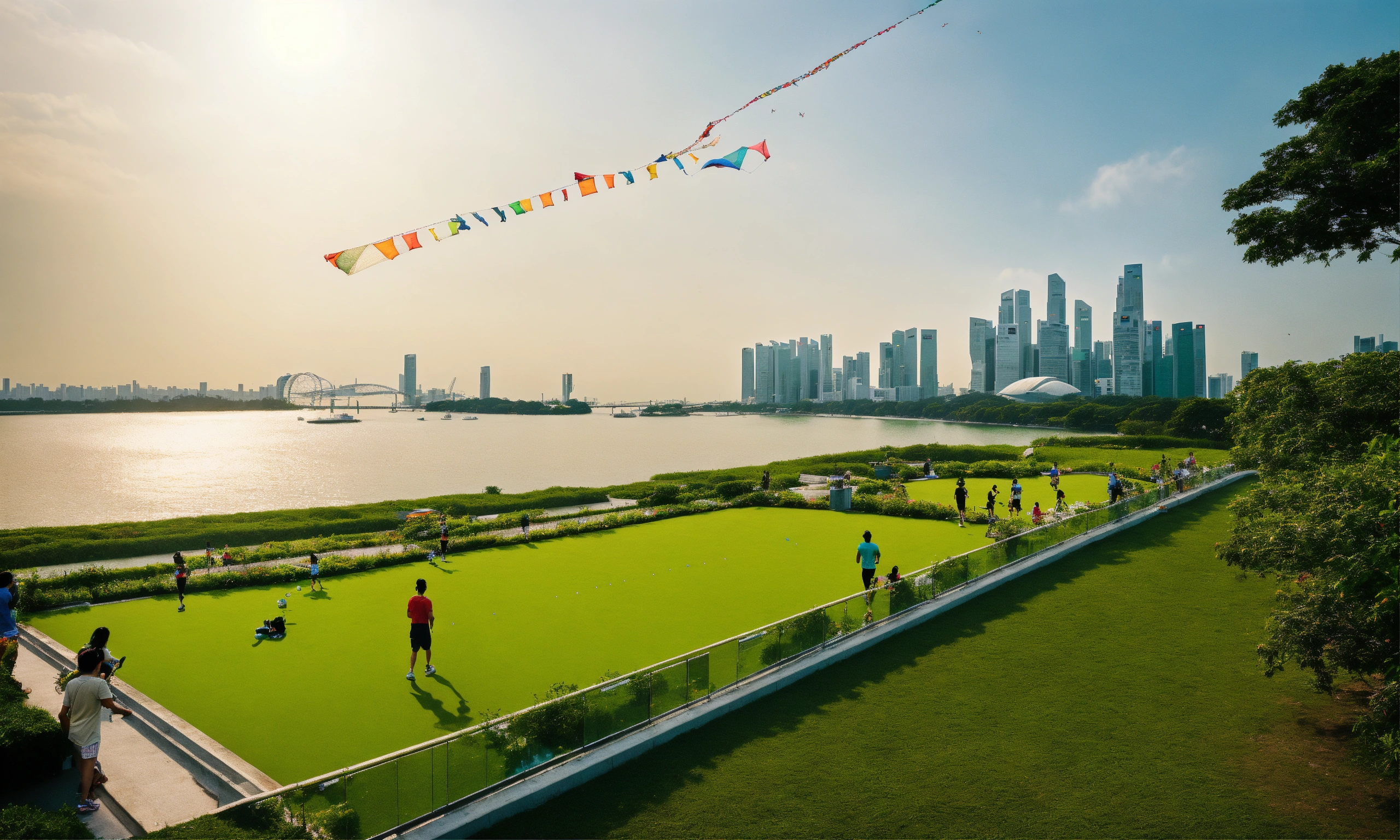 Ultra-realistic photo, cinematic quality, afternoon setting, aerial view capturing the activity on the vast green rooftop singapore's marina barrage families flying kites, joggers taking in the view, and tourists snapping photos; modern urban attire, expressions of awe and relaxation. under the bright afternoon sun, the barrage gleams, showcasing its marvel of modern engineering. in the backdrop, the lush east coast park and shimmering waters of the bay contrast beautifully with the green rooftop. themes modern nostalgia, juxtaposition of nature, sustainable infrastructure, and recreation, reflections on the water's surface, 70mm camera to capture vast expanse, portra 400 film for rich contrasts and colors, slight film grain for added texture
