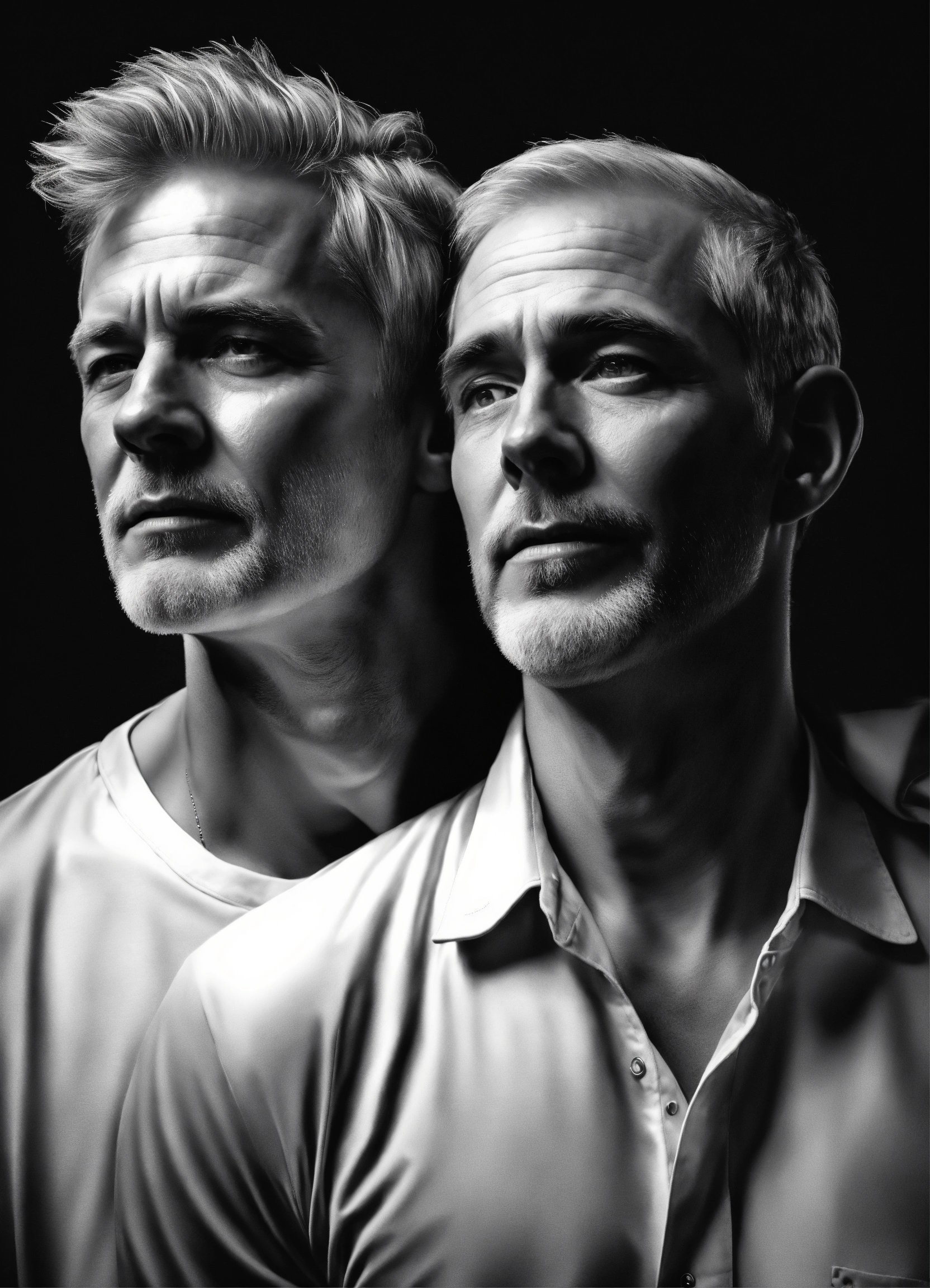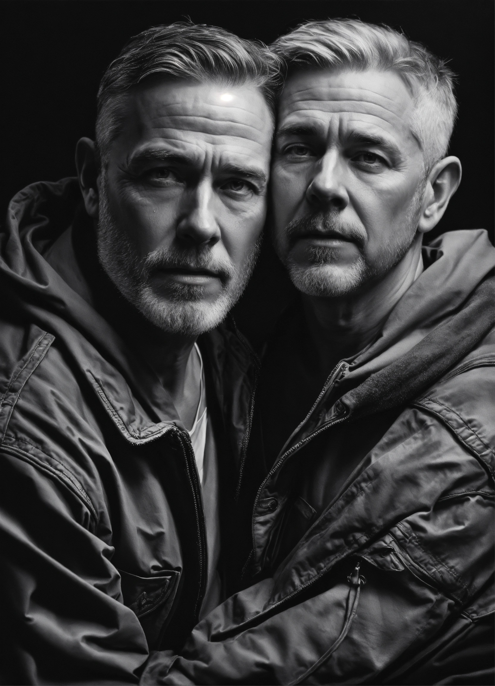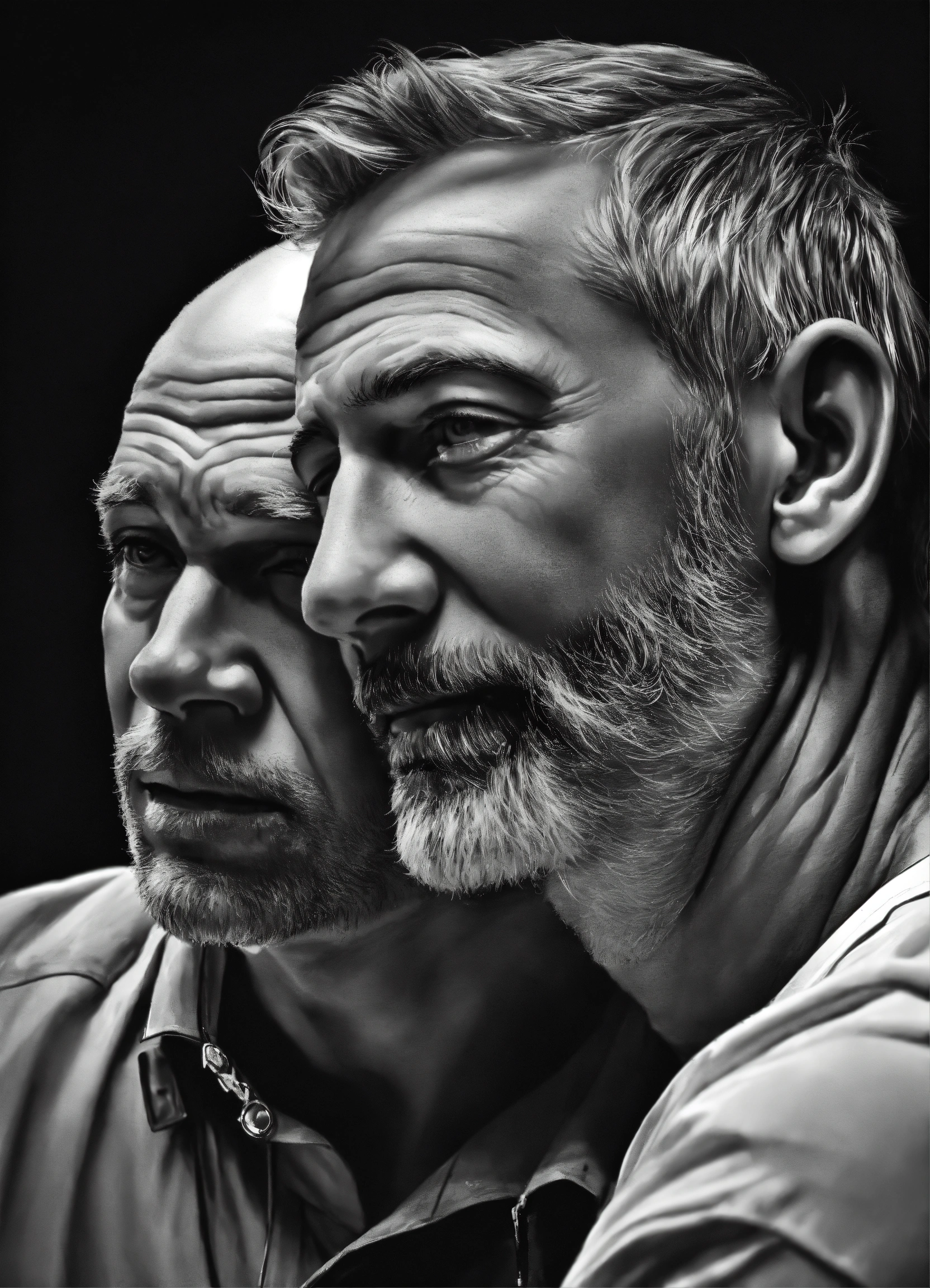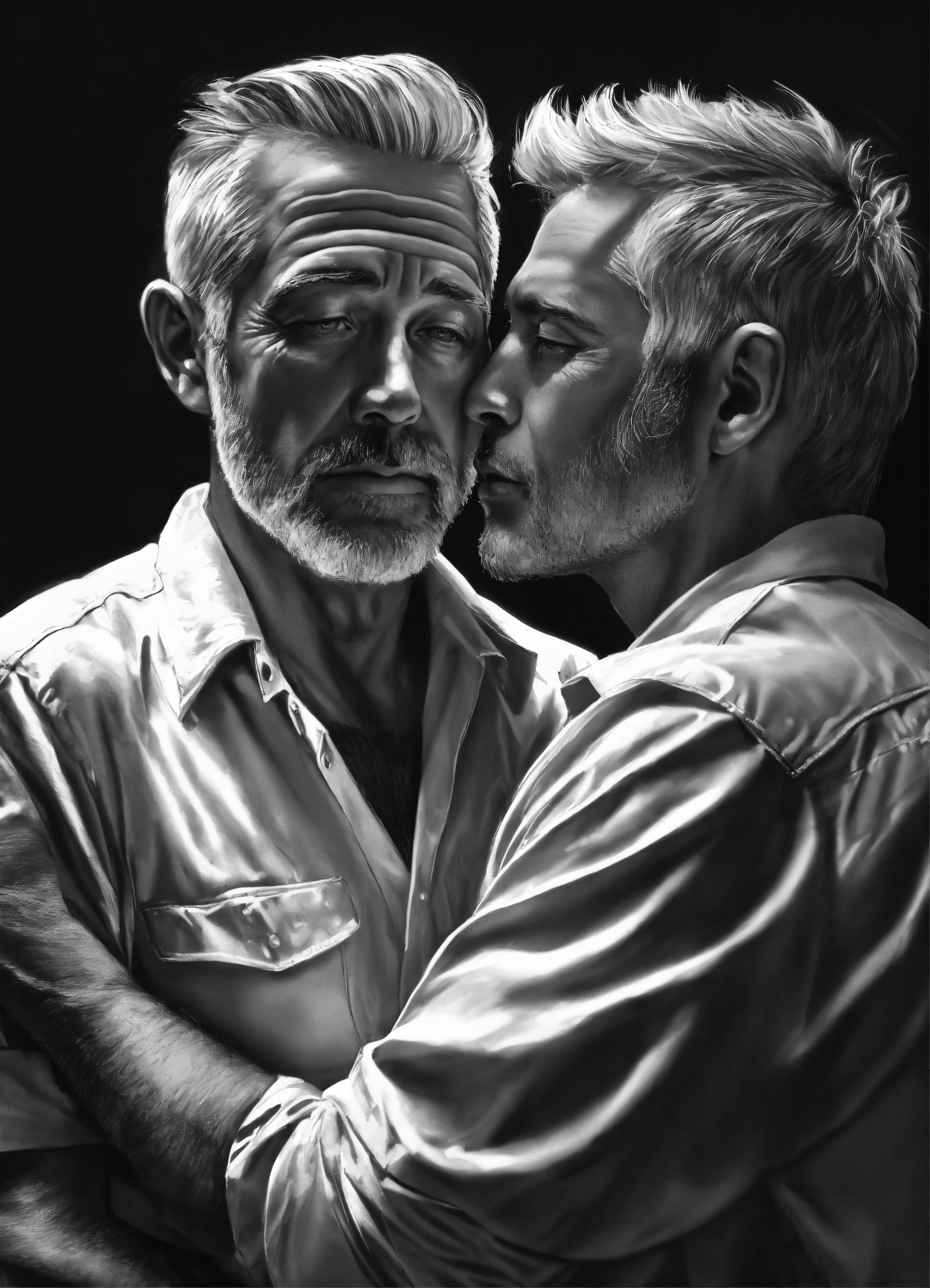 Pop art, hyperrealist portrait of white fifty year old man with twenty three year old boy embracing, black and white painting, fantasy art, photo realistic, dynamic lighting, artstation, poster, volumetric lighting, very detailed faces, 4 k, award winning