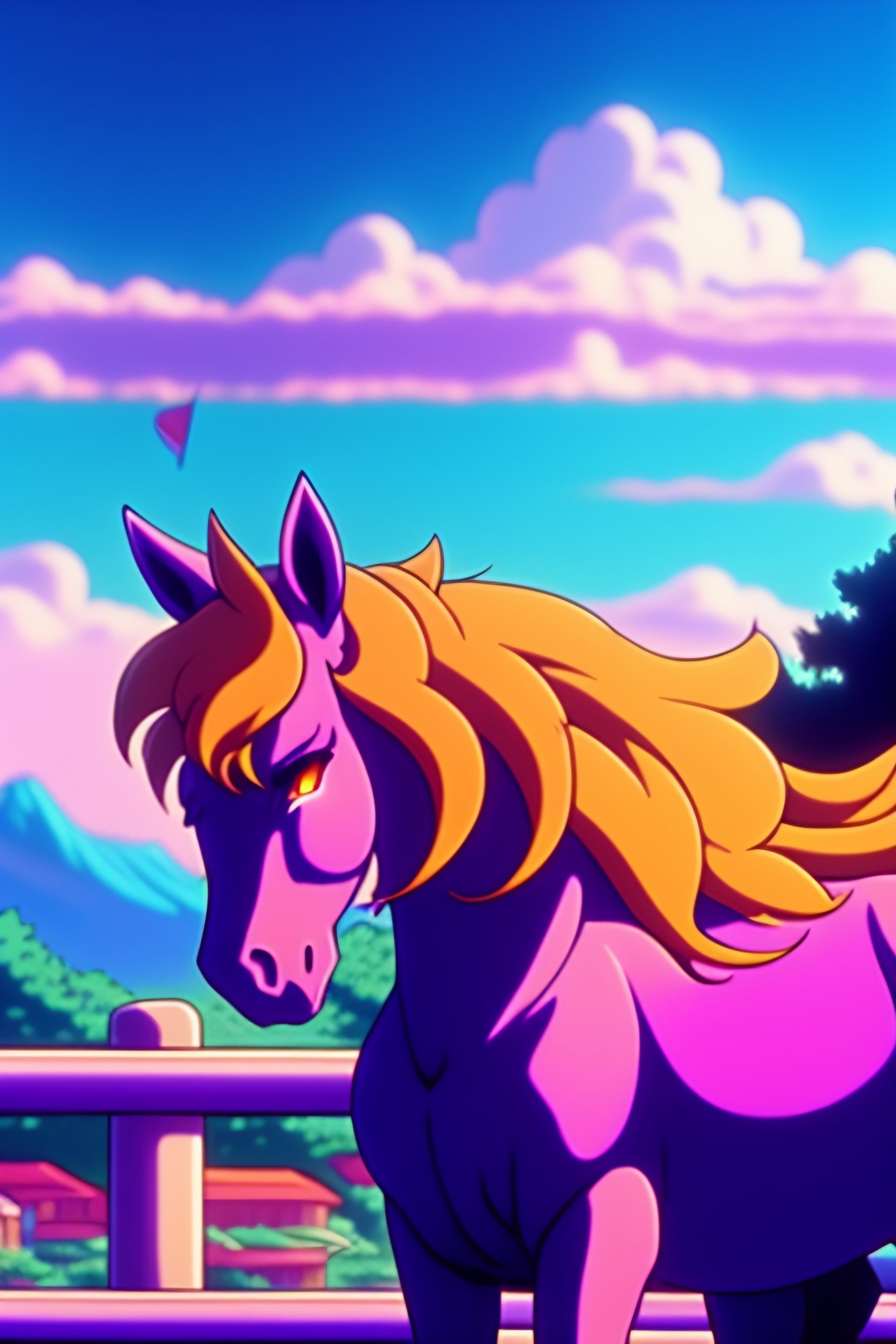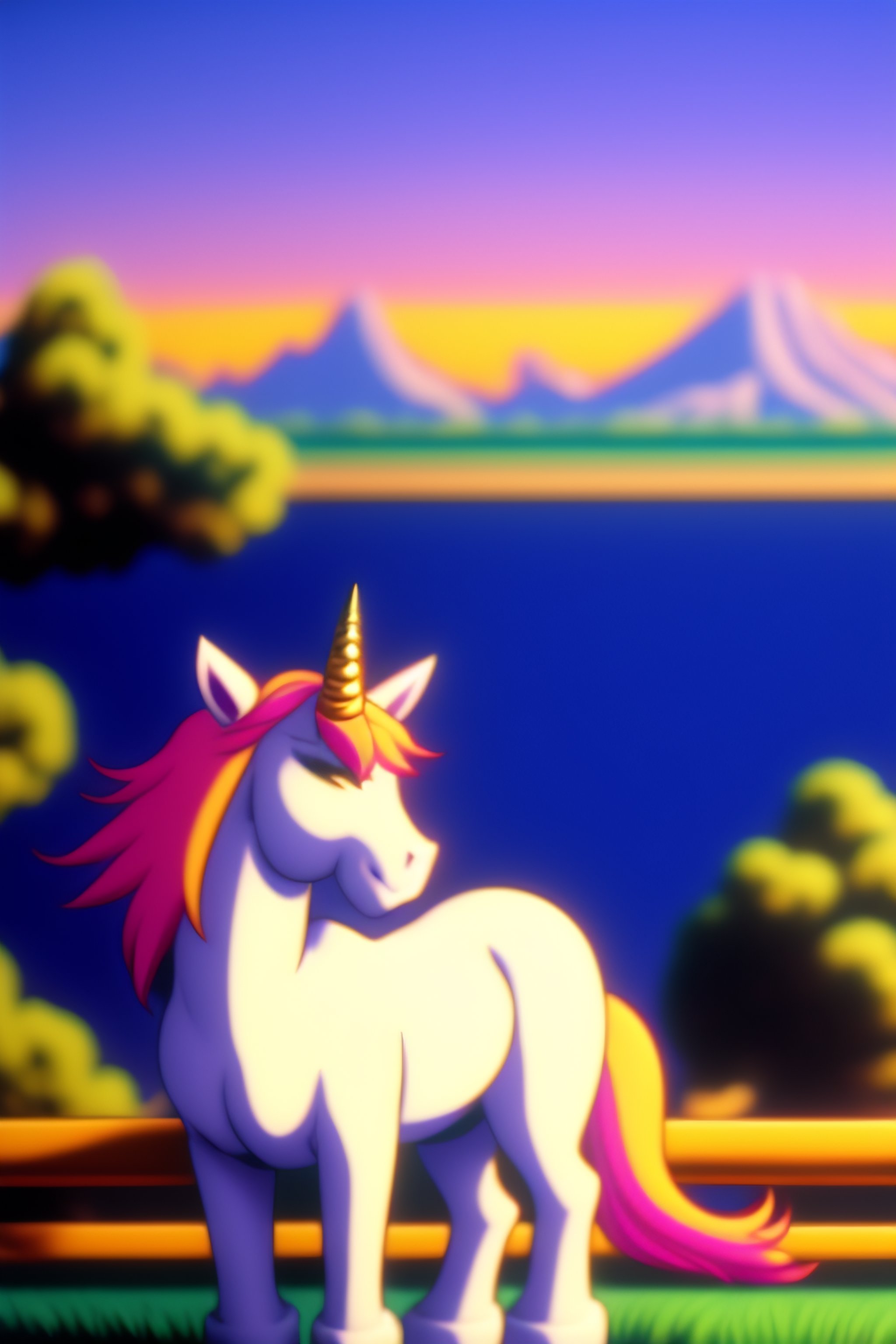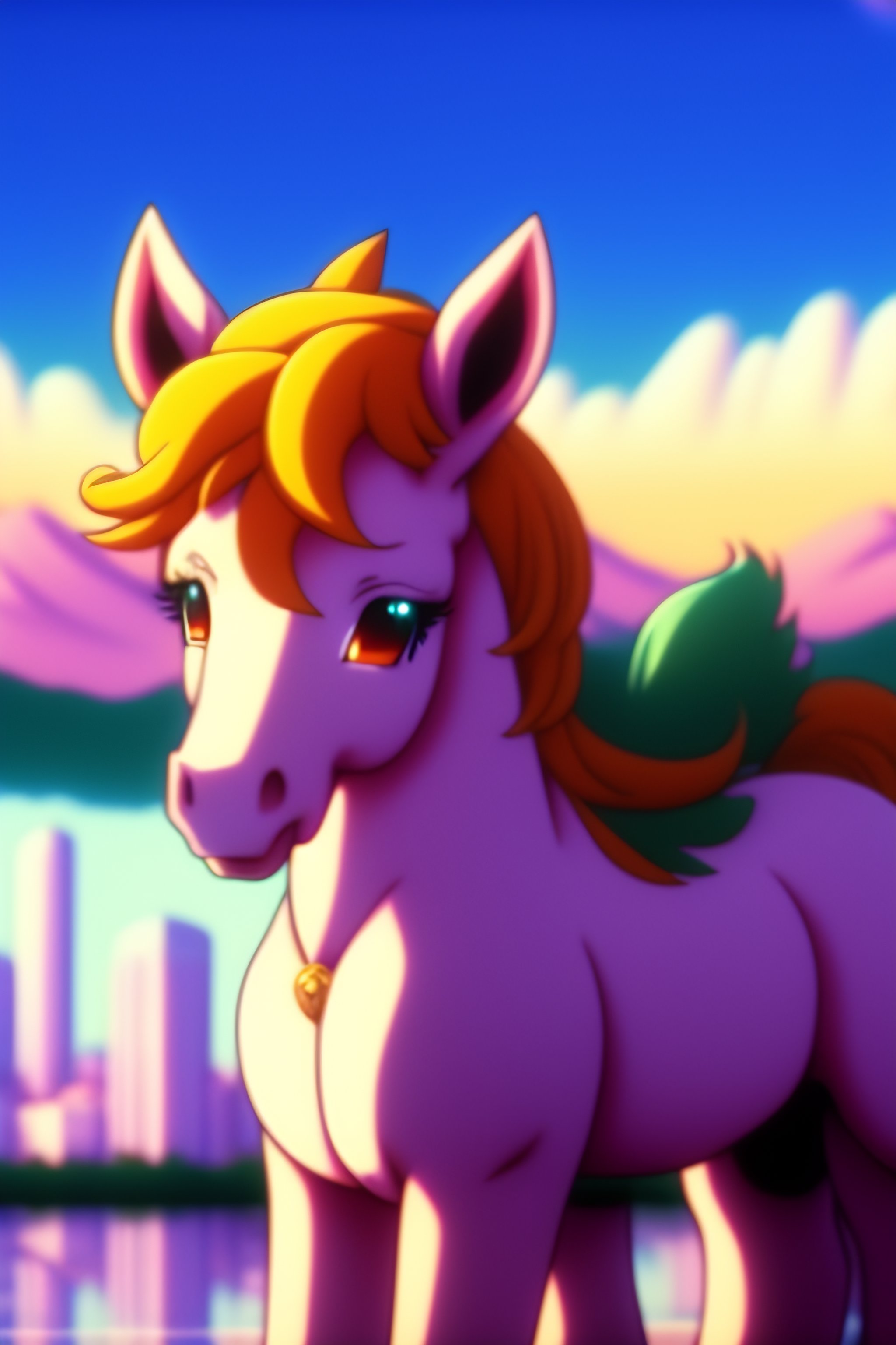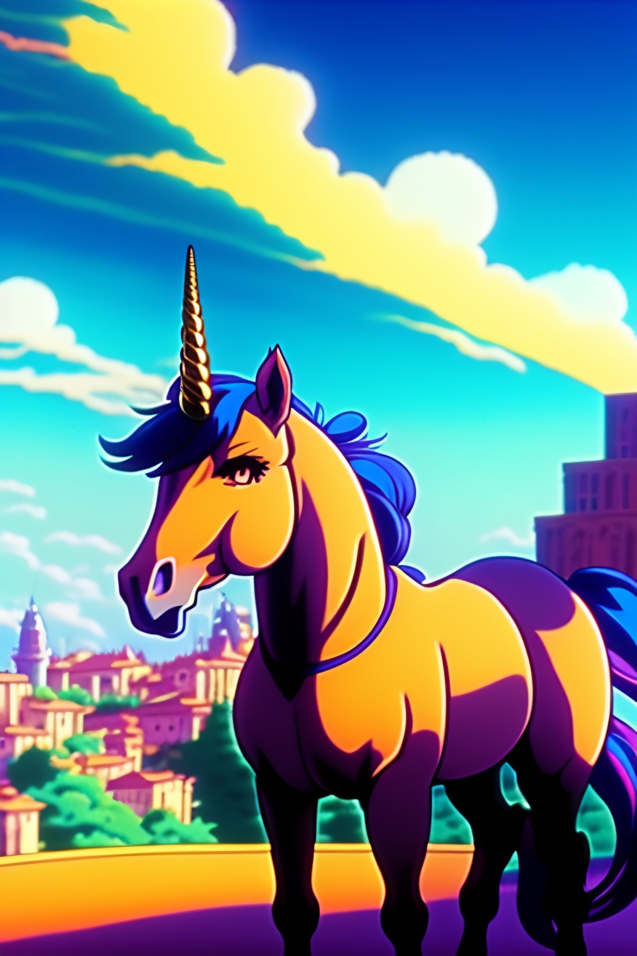 90's anime vintage anime screenshot joyful unicorn stay in front of post italian city landscape on the background, deep bokeh, close-up, anime masterpiece