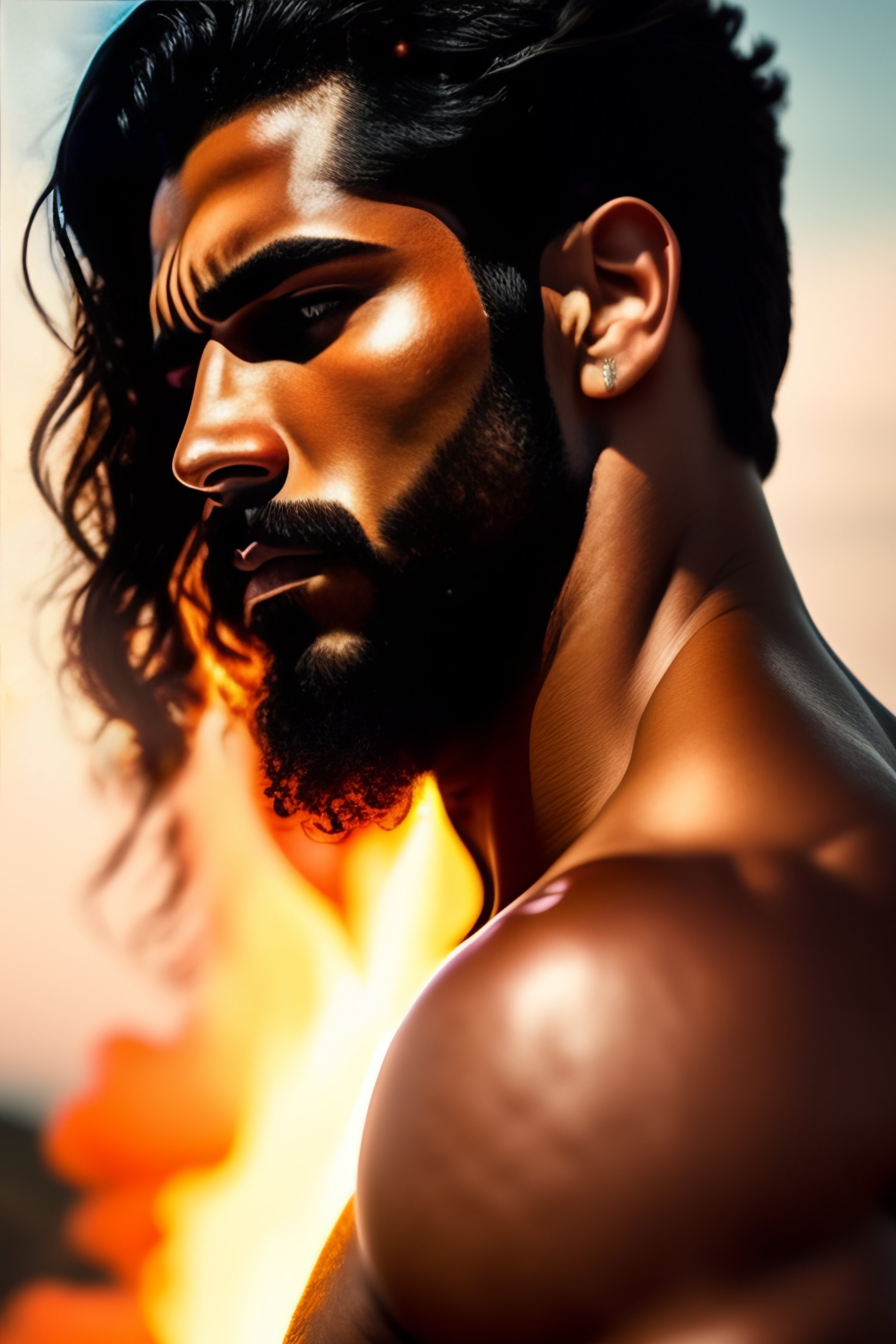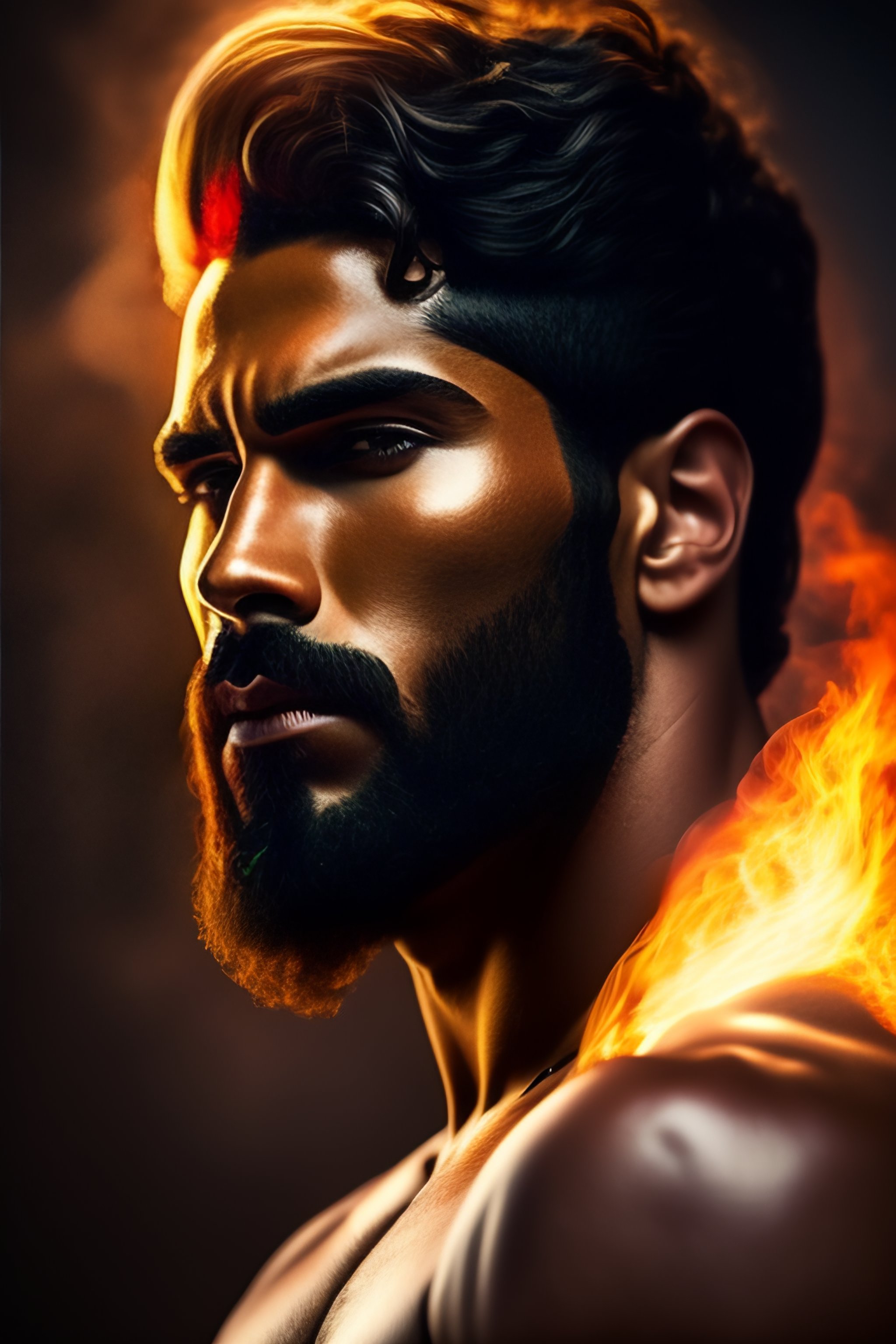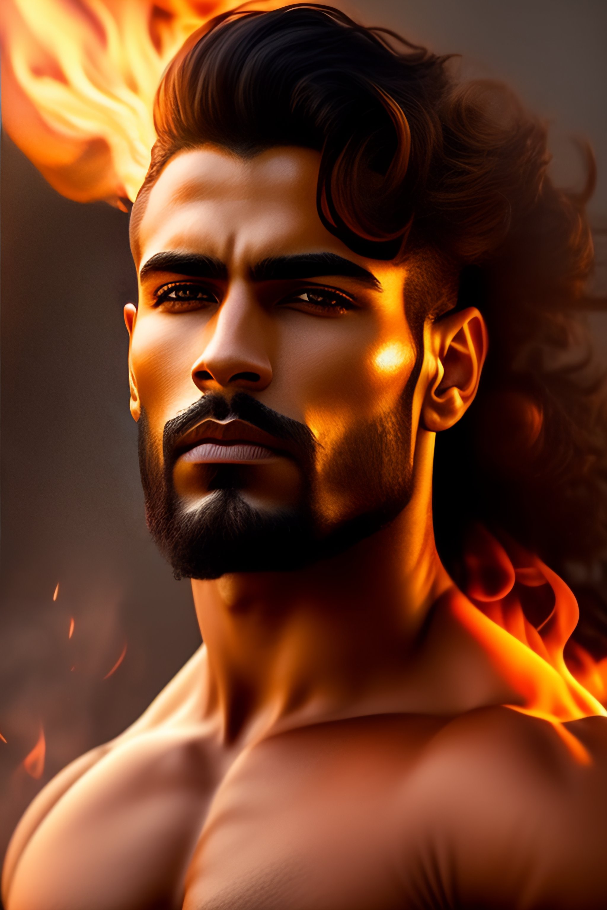 Hombre fuerte y poderoso, sin pelo en la cabeza y con bonitos ojos marrones, barba negra y bien perfilada, labios gruesos. renace como el ave feniz entre fuego y cenizas, expresando tristeza y desamor. tiene alas como icaro y belleza. cuerpo completo
