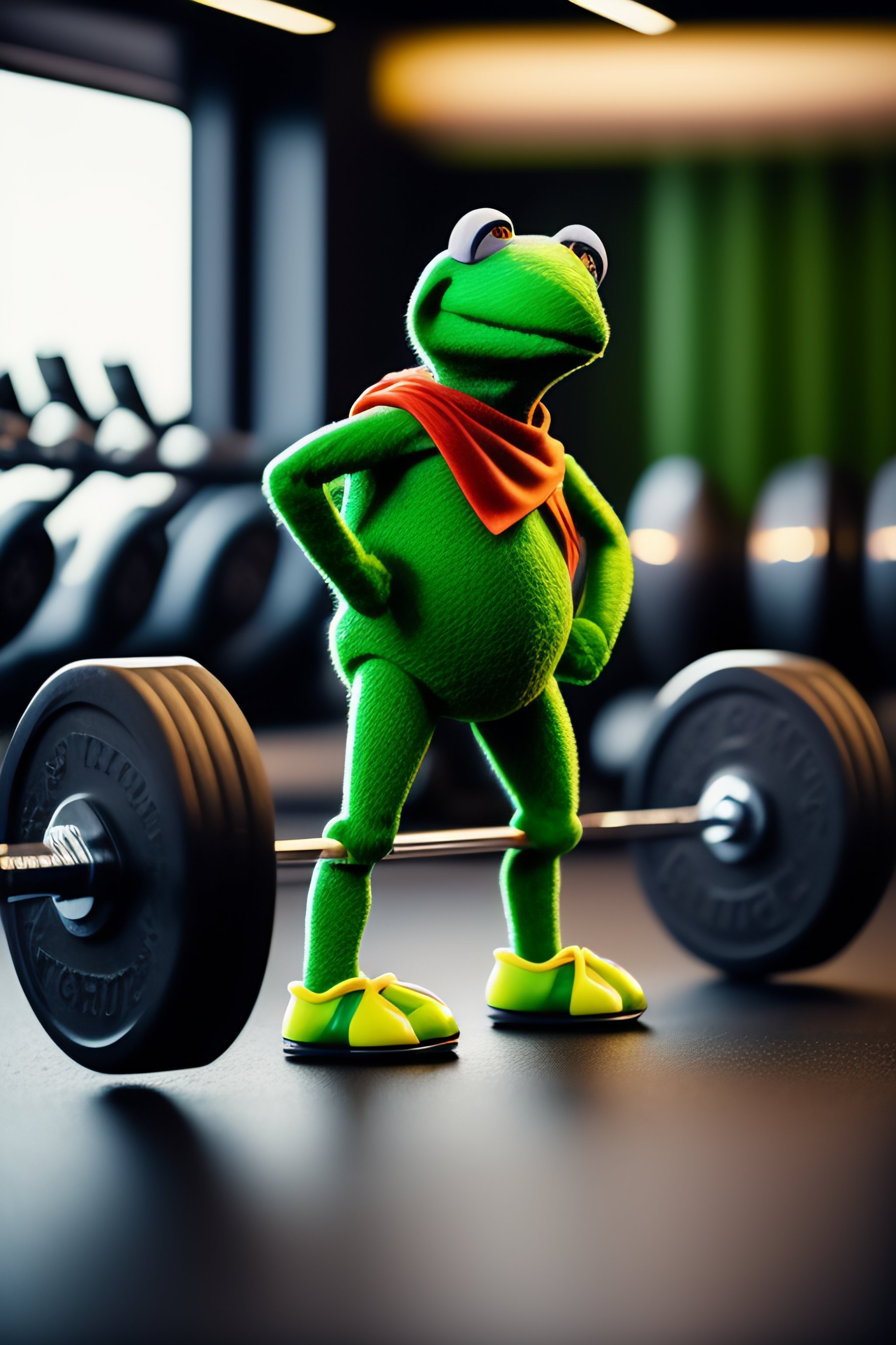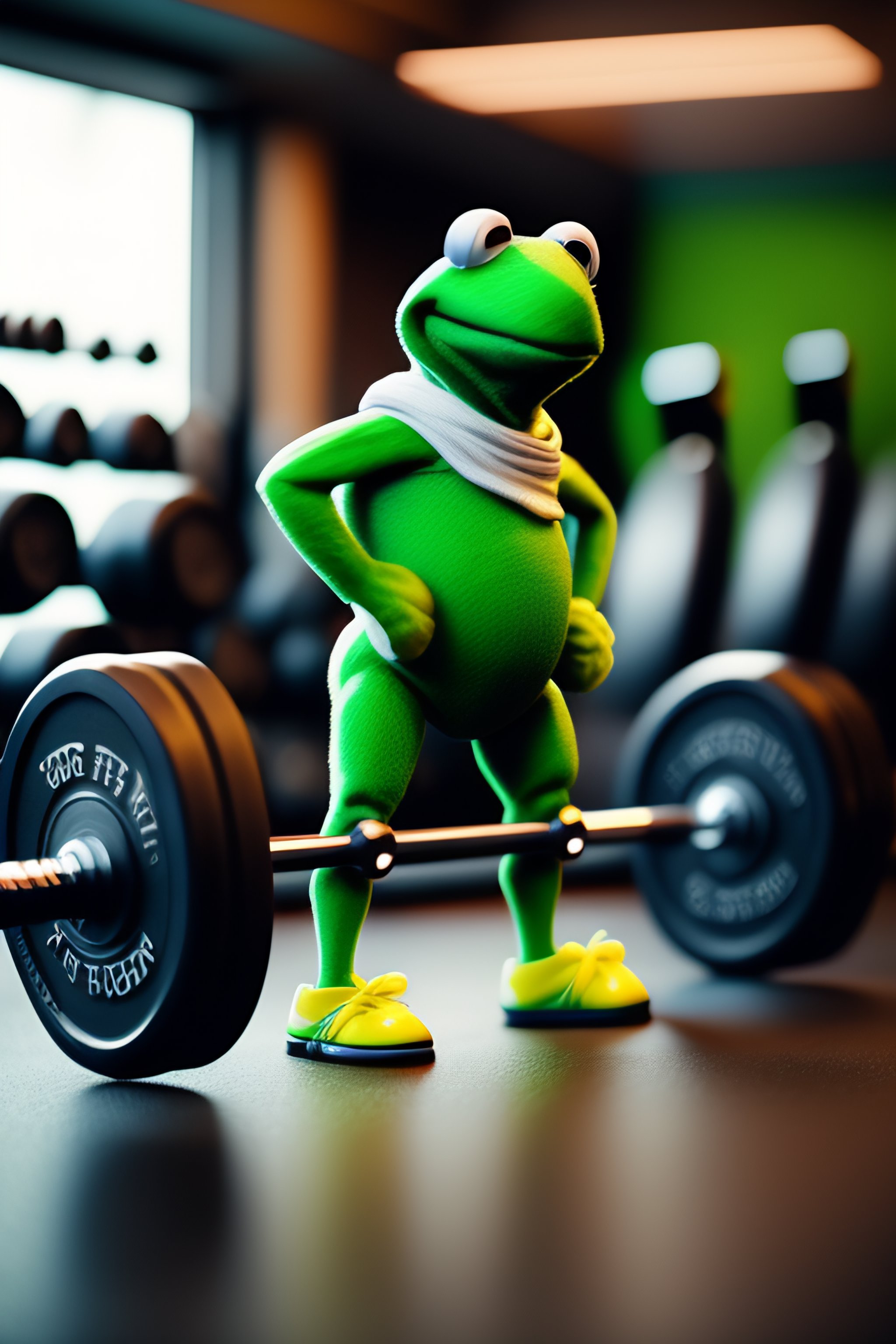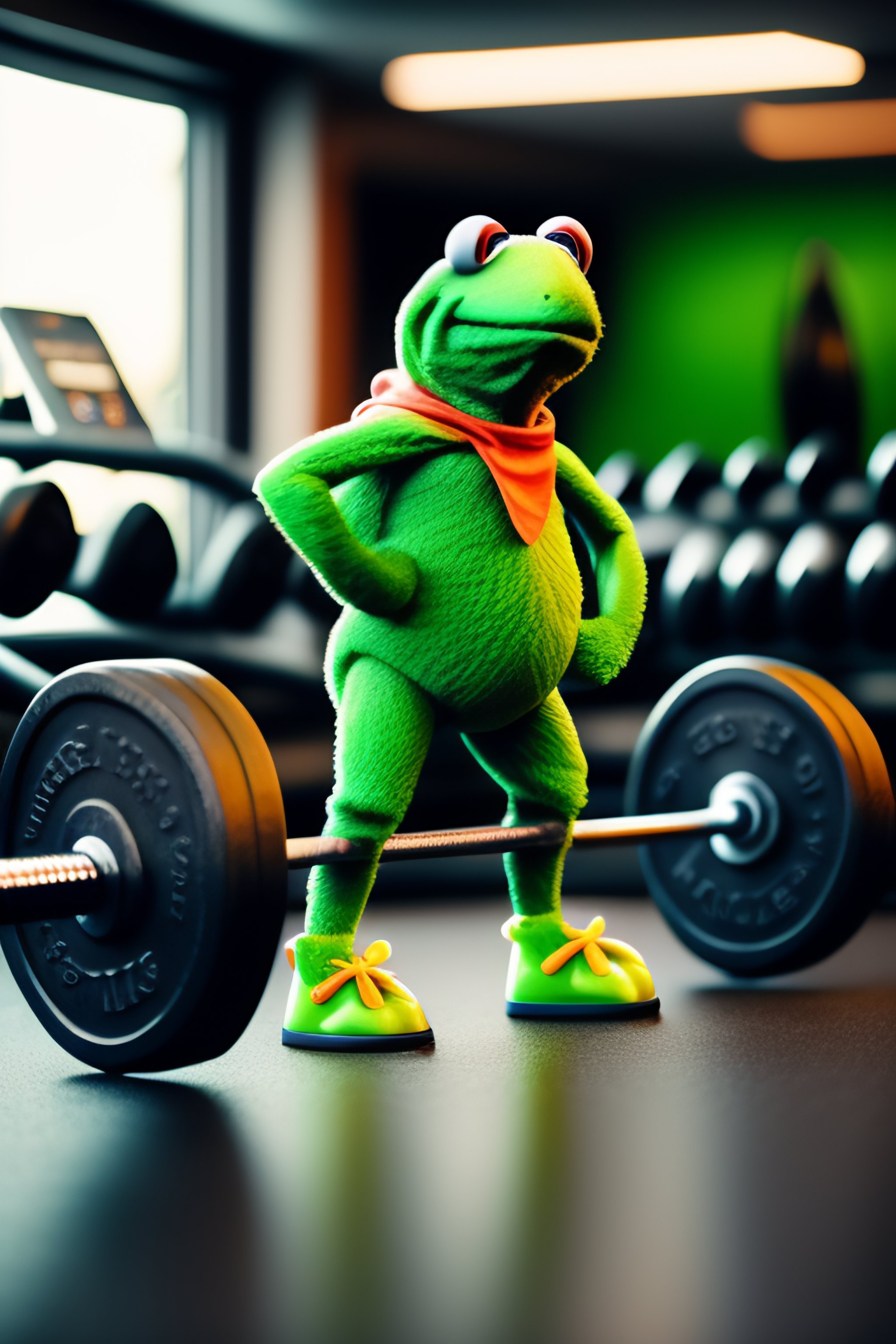 Kermit the frog doing deadlifts swole at a luxury gym
