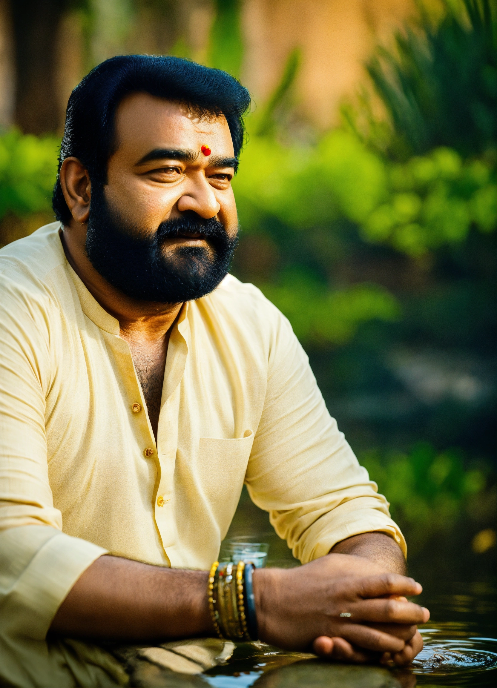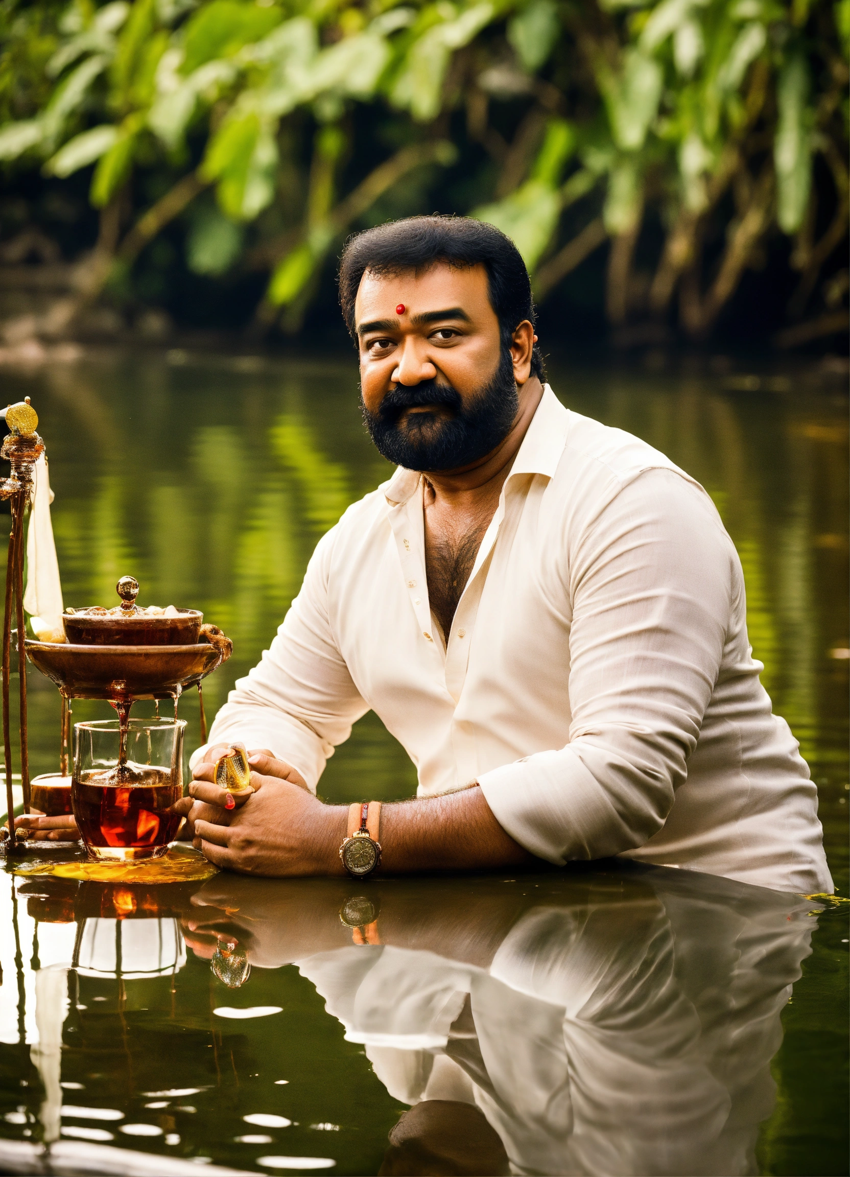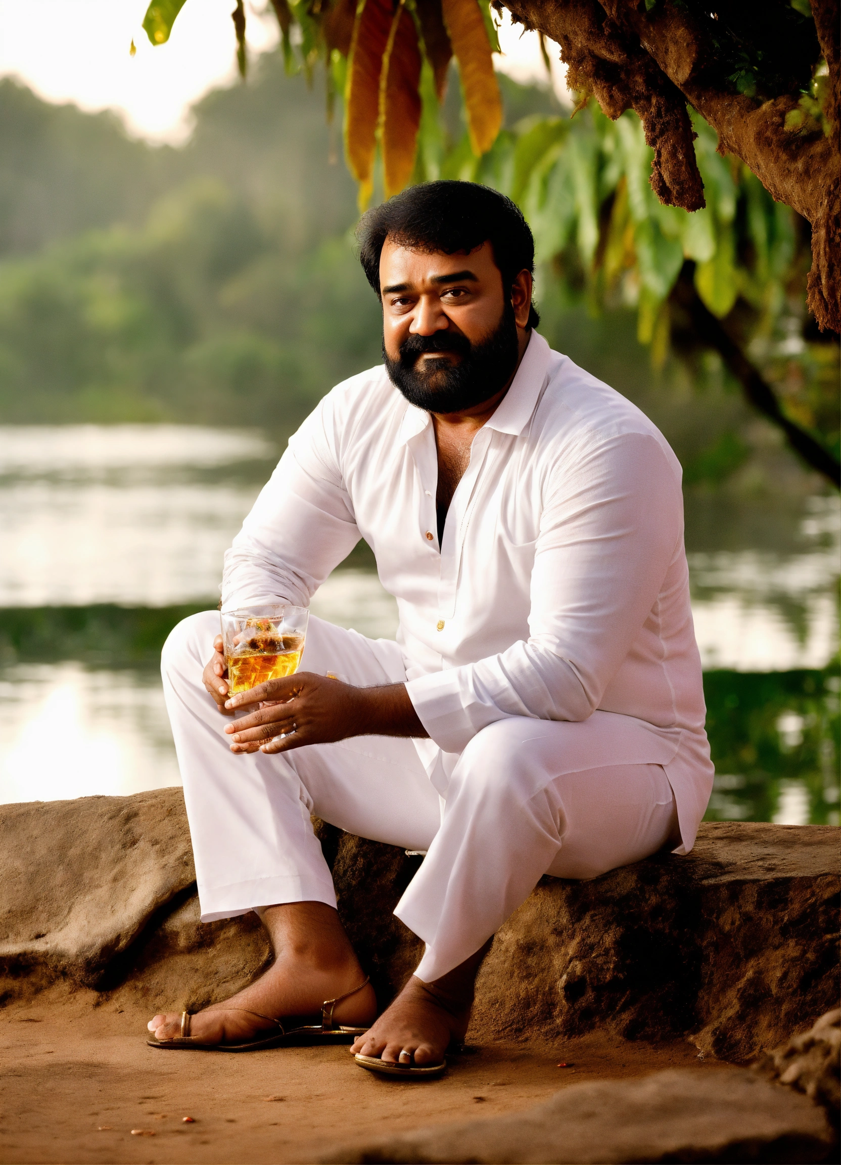 Malayalam actor mohanlal sitting near a pond with a glass of rum wearing white kurta
