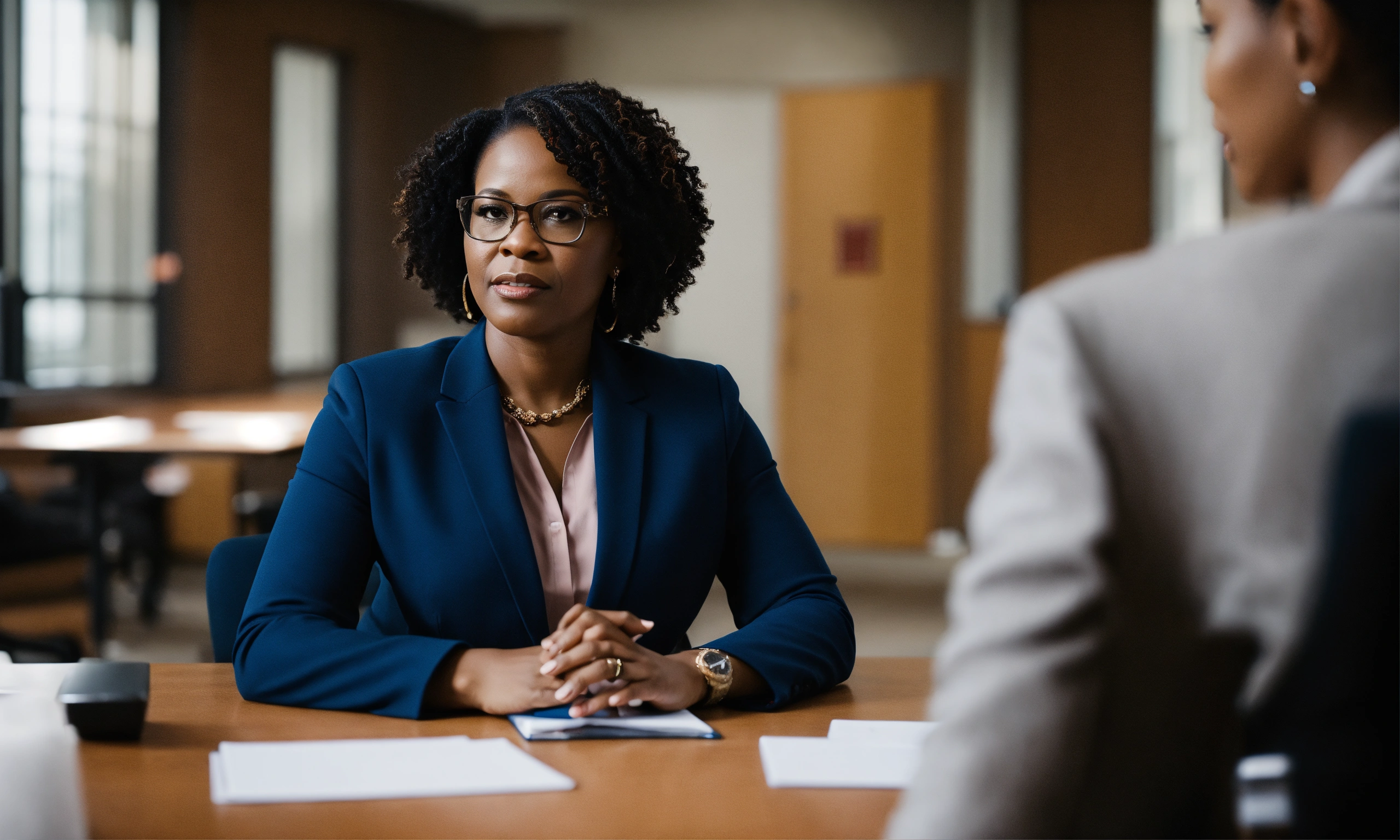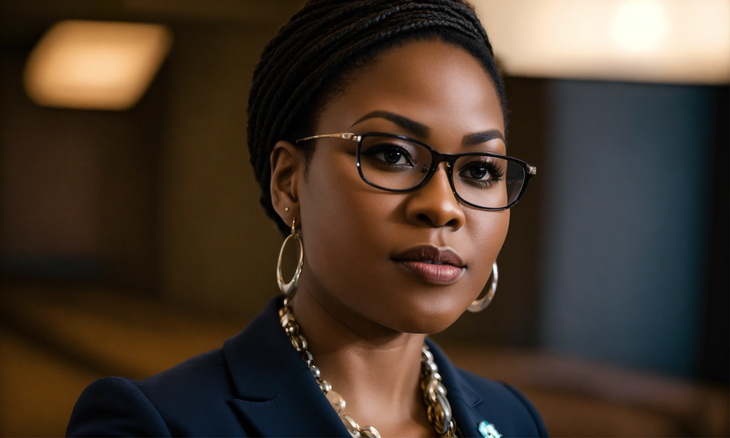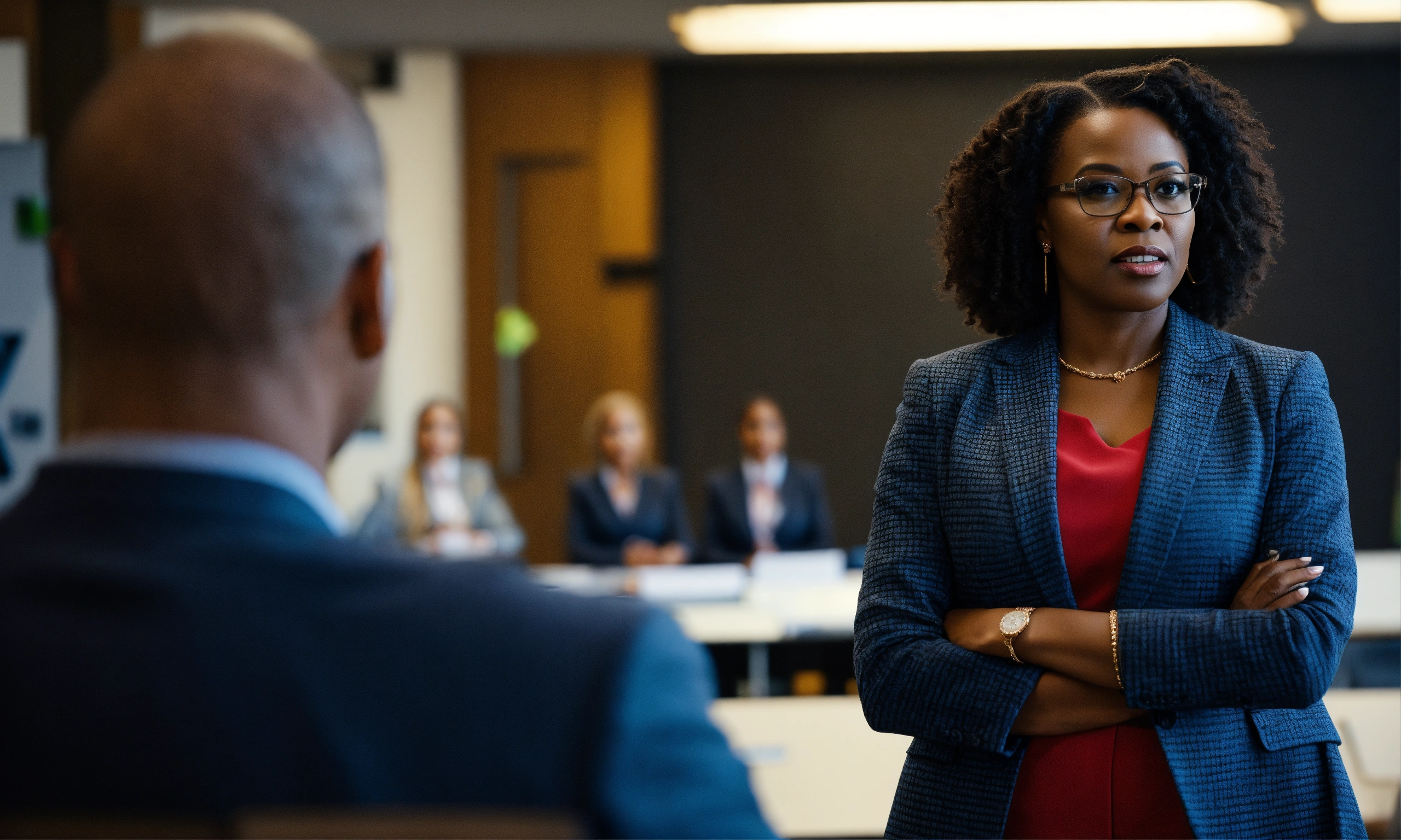 A personal portrait of well dressed black female executive principal leading a training session, cinematic, professional photoshoot