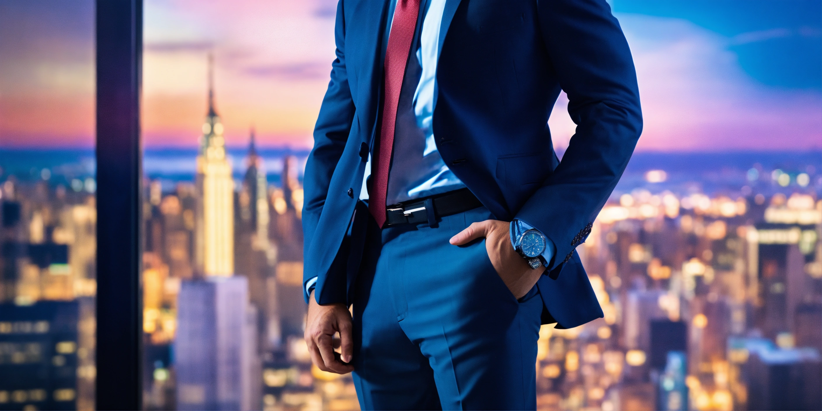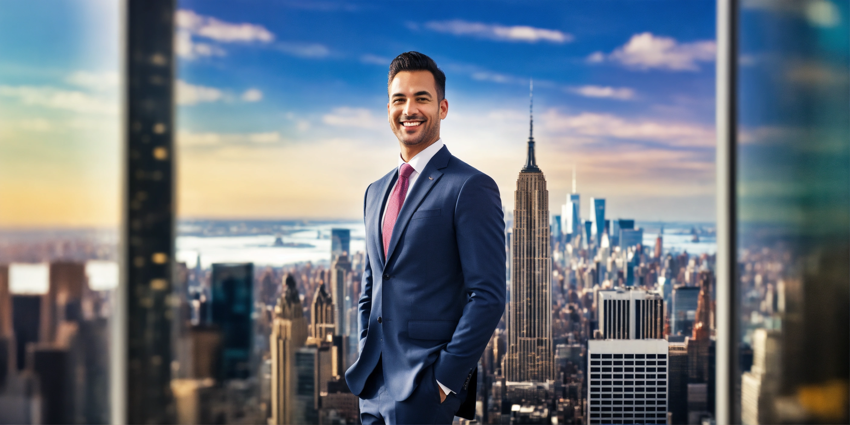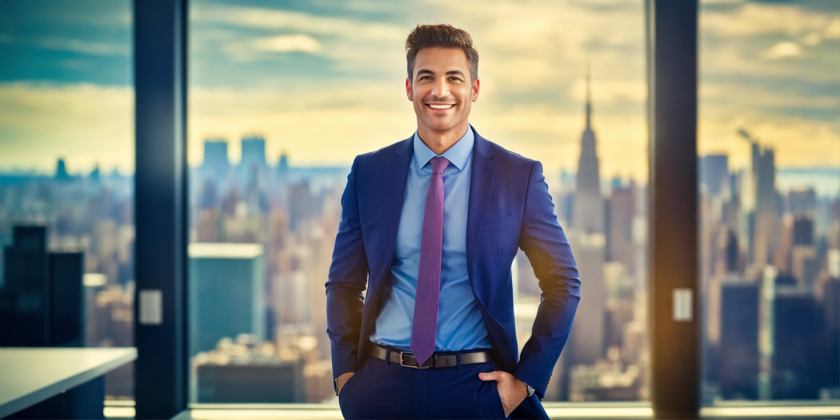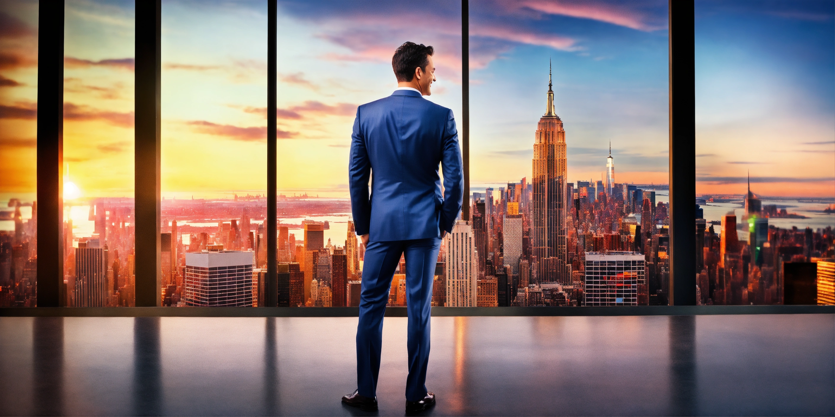 A vibrant image depicts a businessman with full body! hand in the pants, very small smiling, in the behind is defocus very modern office with the view to new york city