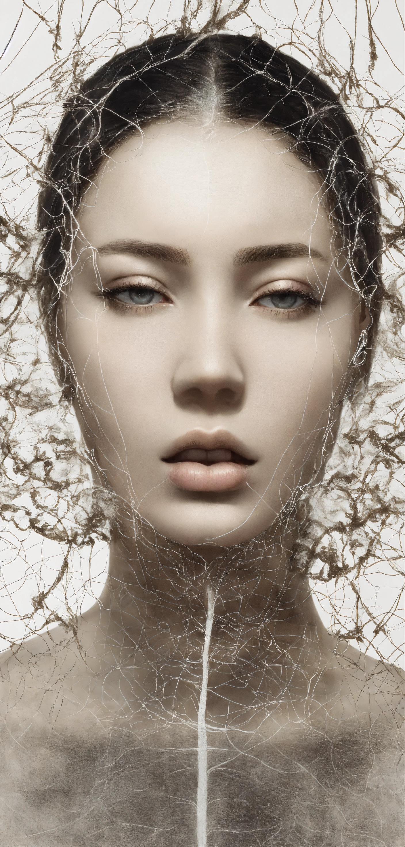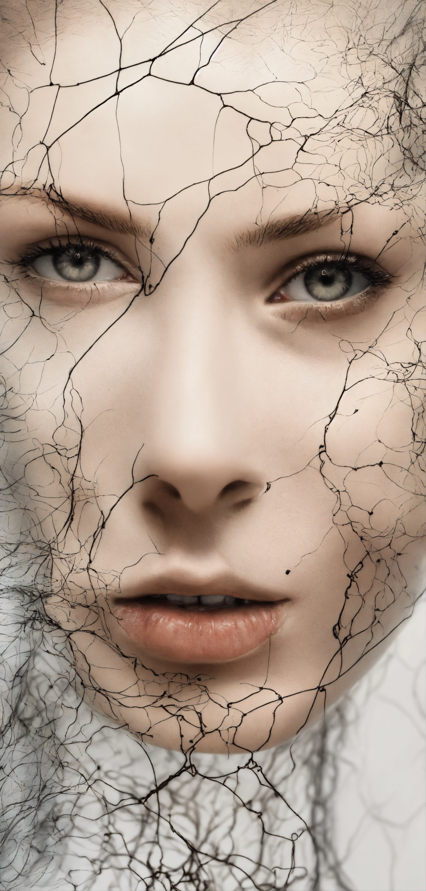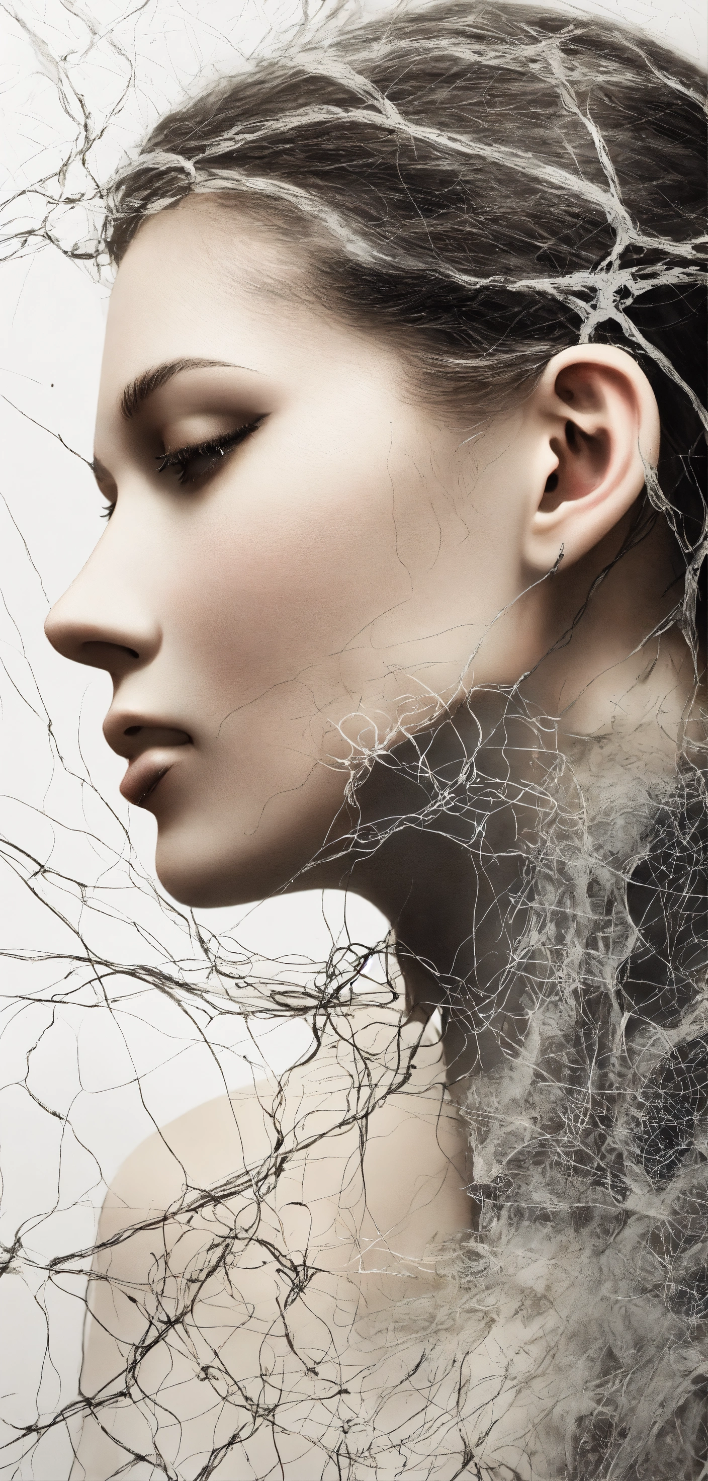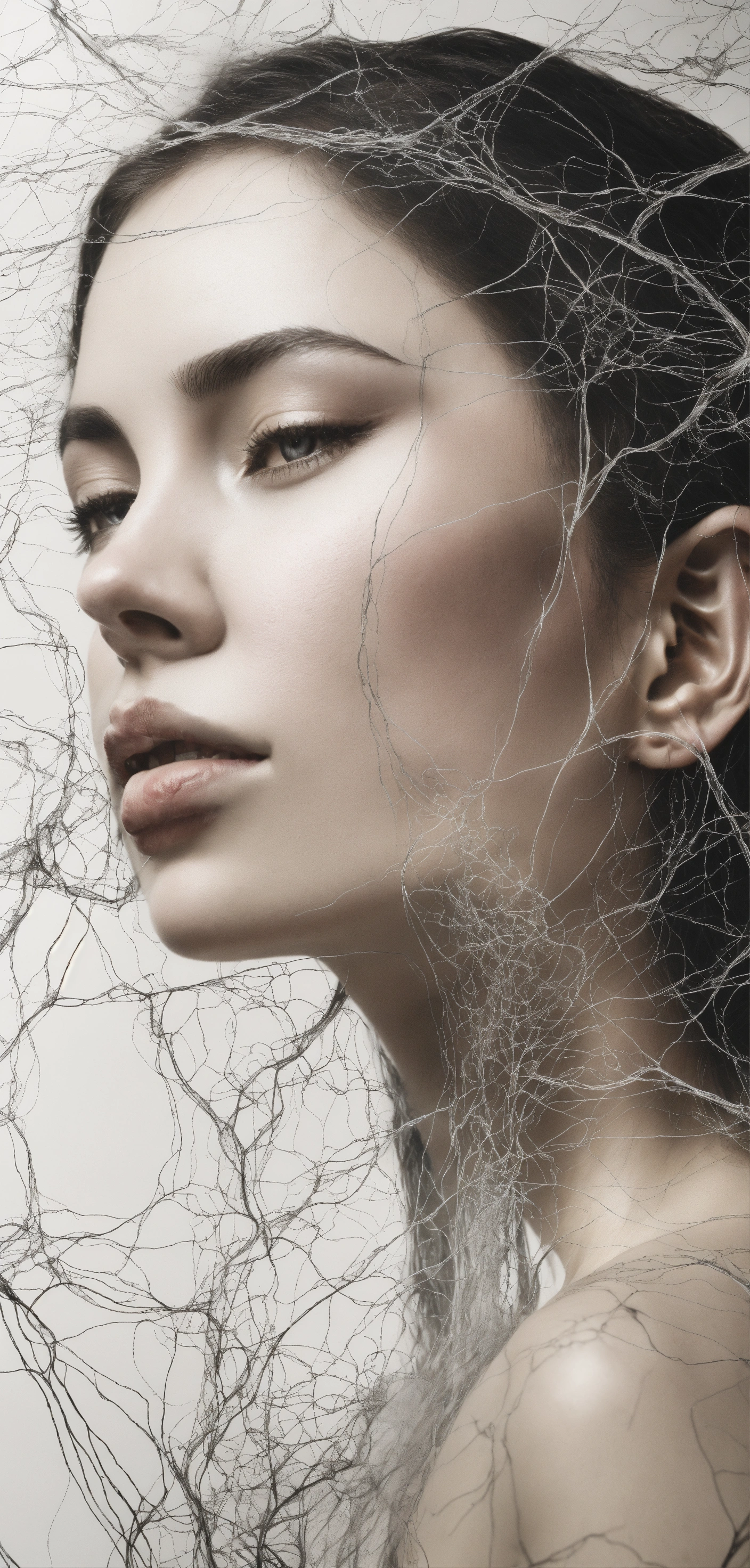 Photo 16k, ultra realist, variant compelling double exposure image of a woman juxtaposed with a black line drawing of a complex white water network of veins and arteries on a white background, intricate details
