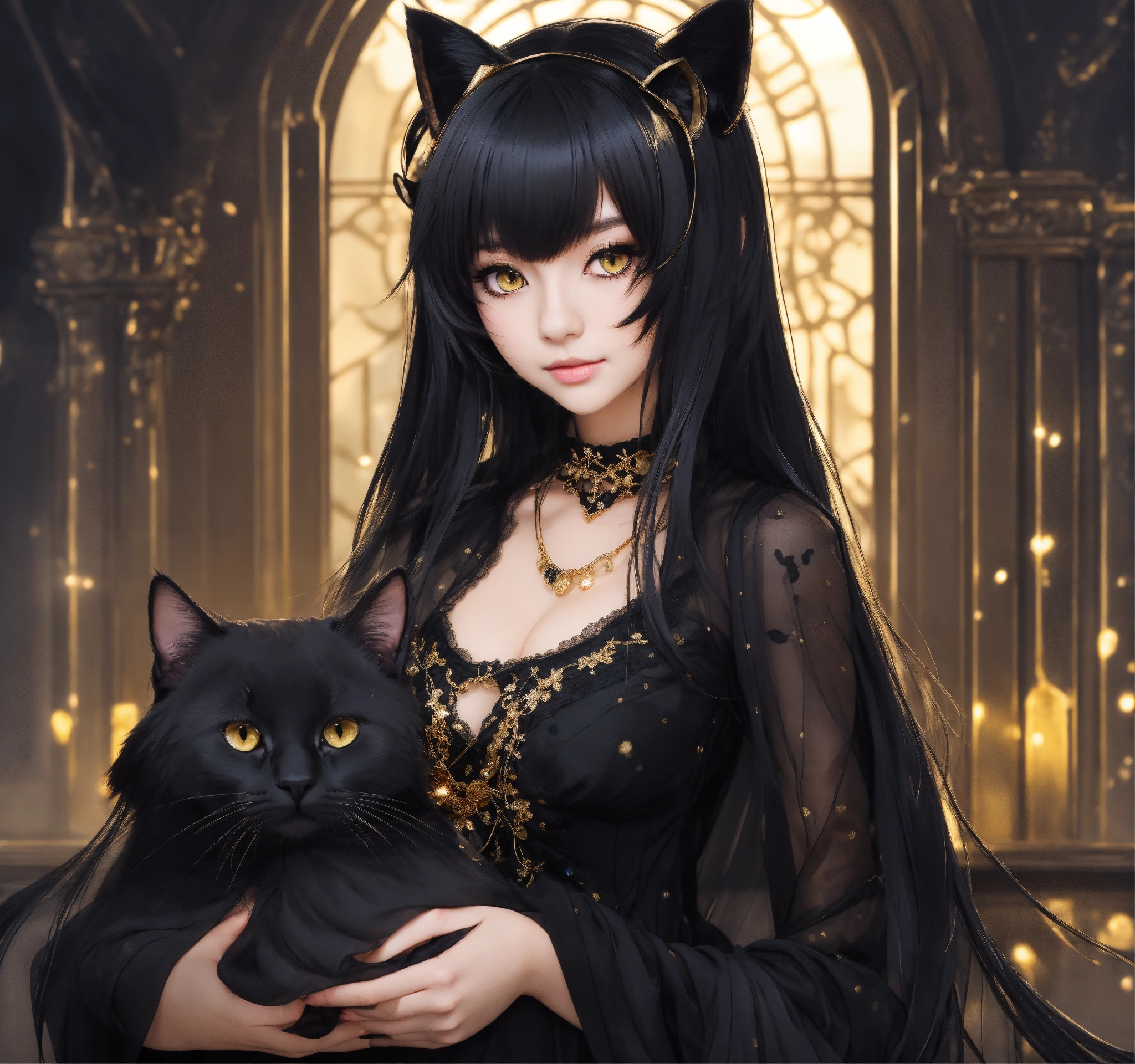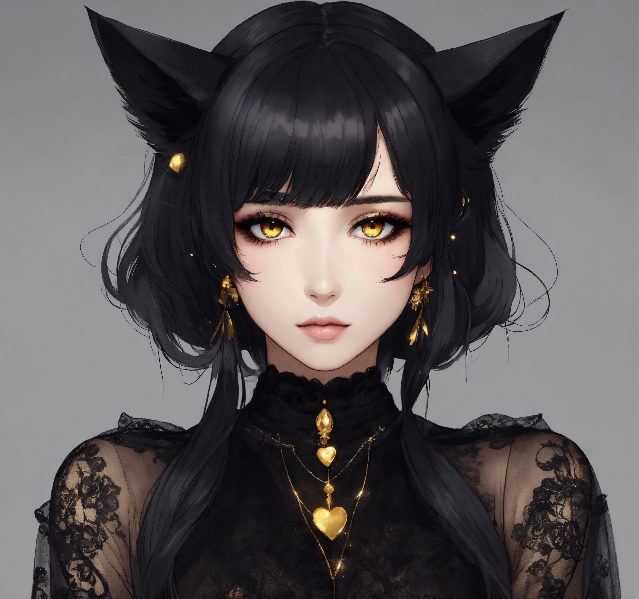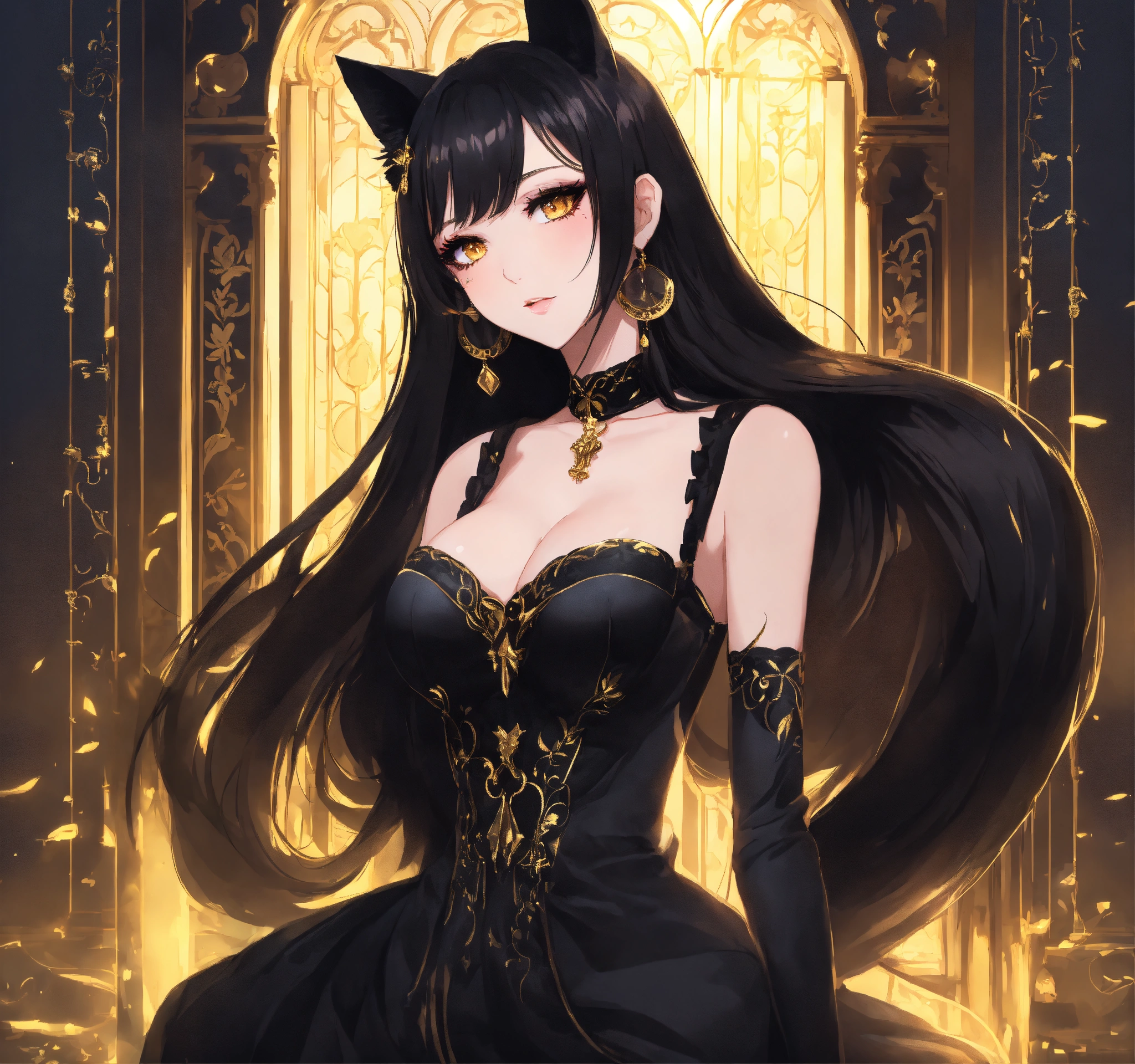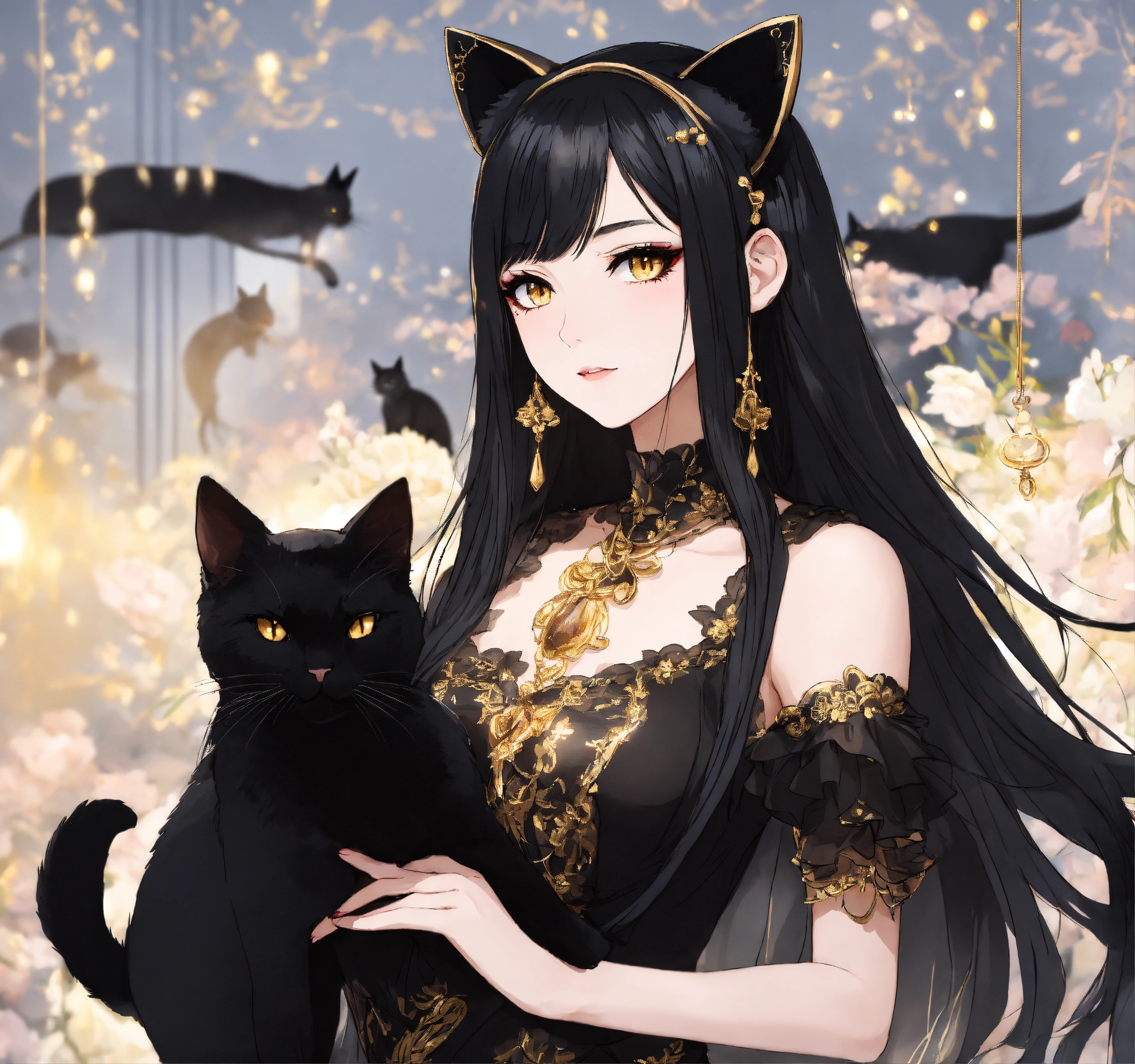 Beautiful woman with black only cat ears, long black hair, gold eyes, heavy black eyeshadow, wearing a black see-through dress, holding her long black cat tail, anime style