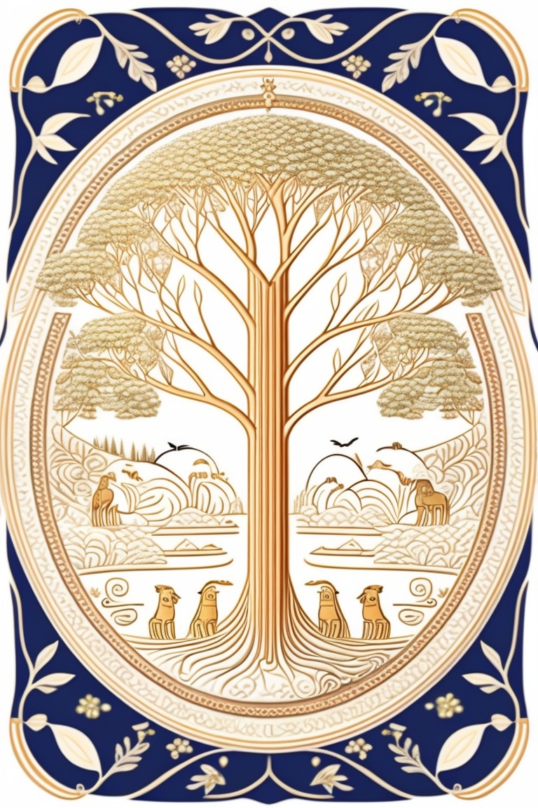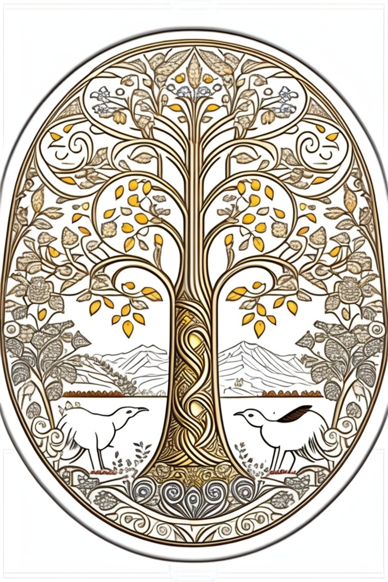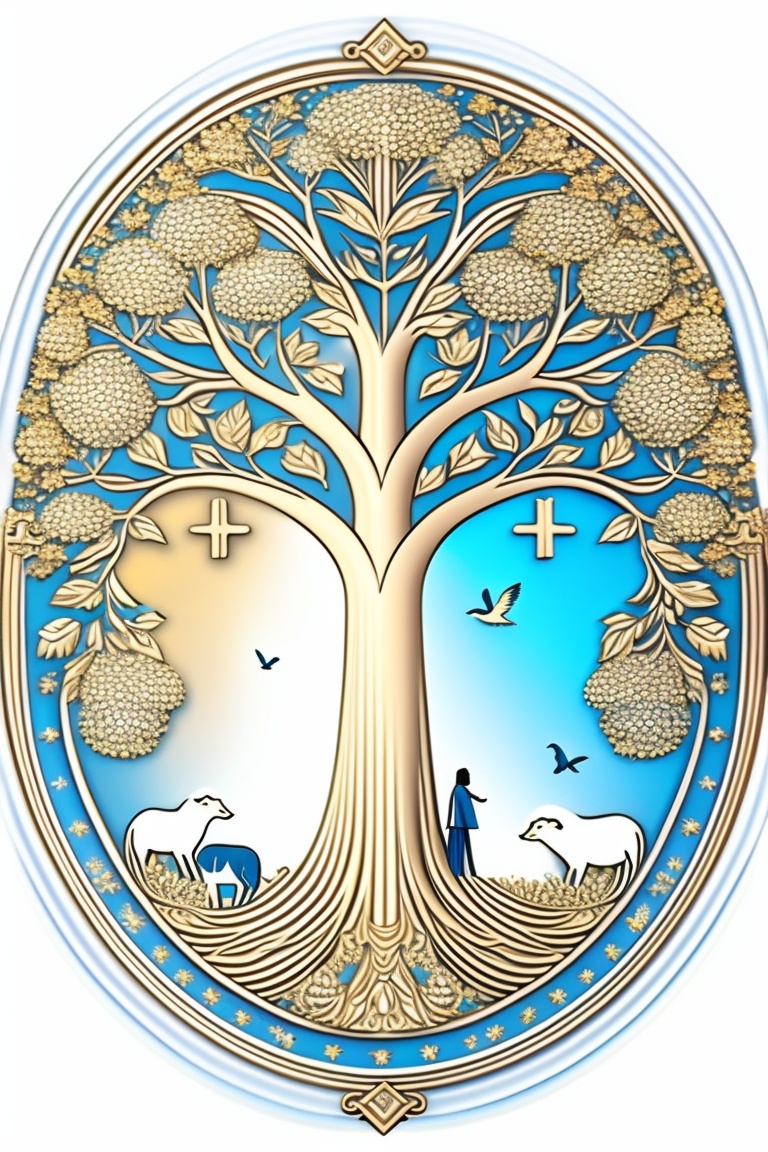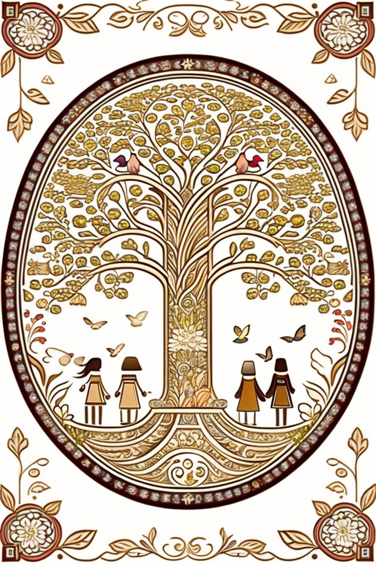 Christian tree of life with angels and animals close around. in the center of the image 5 people, a man and woman couple and 2 boys and 1 girl. coloring drawing.