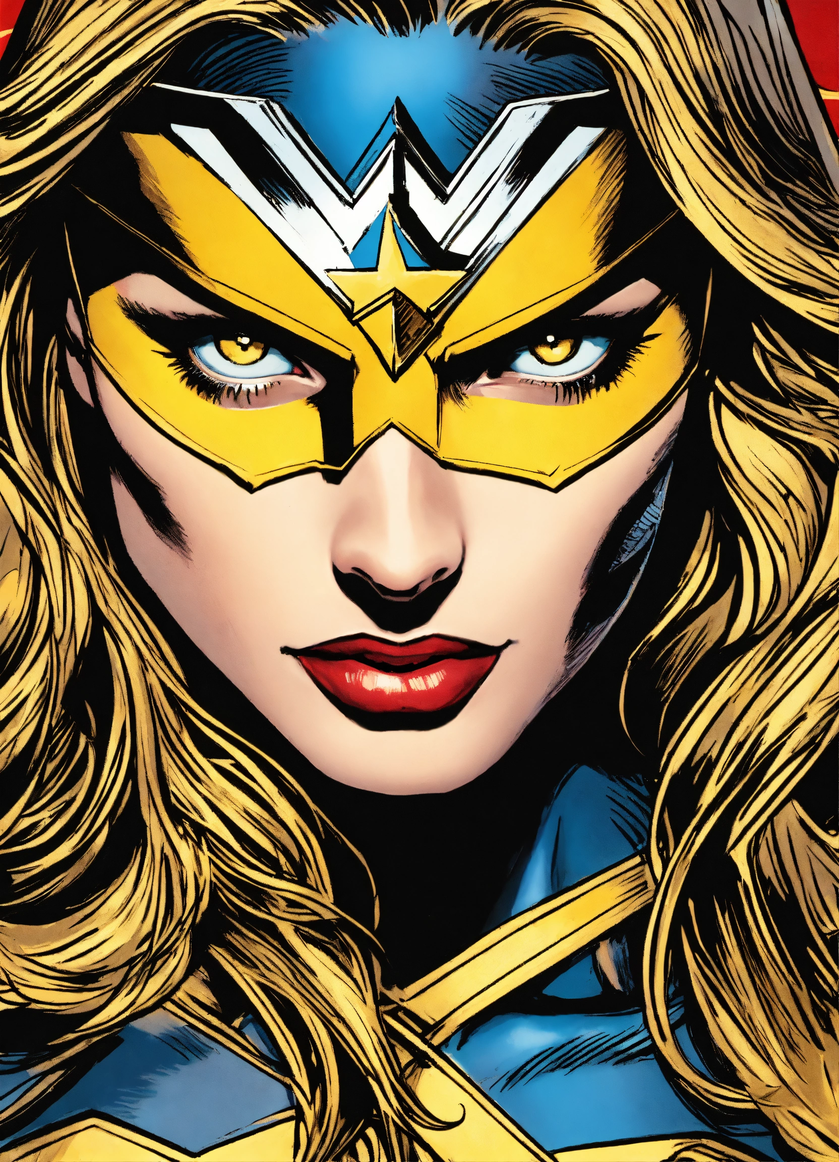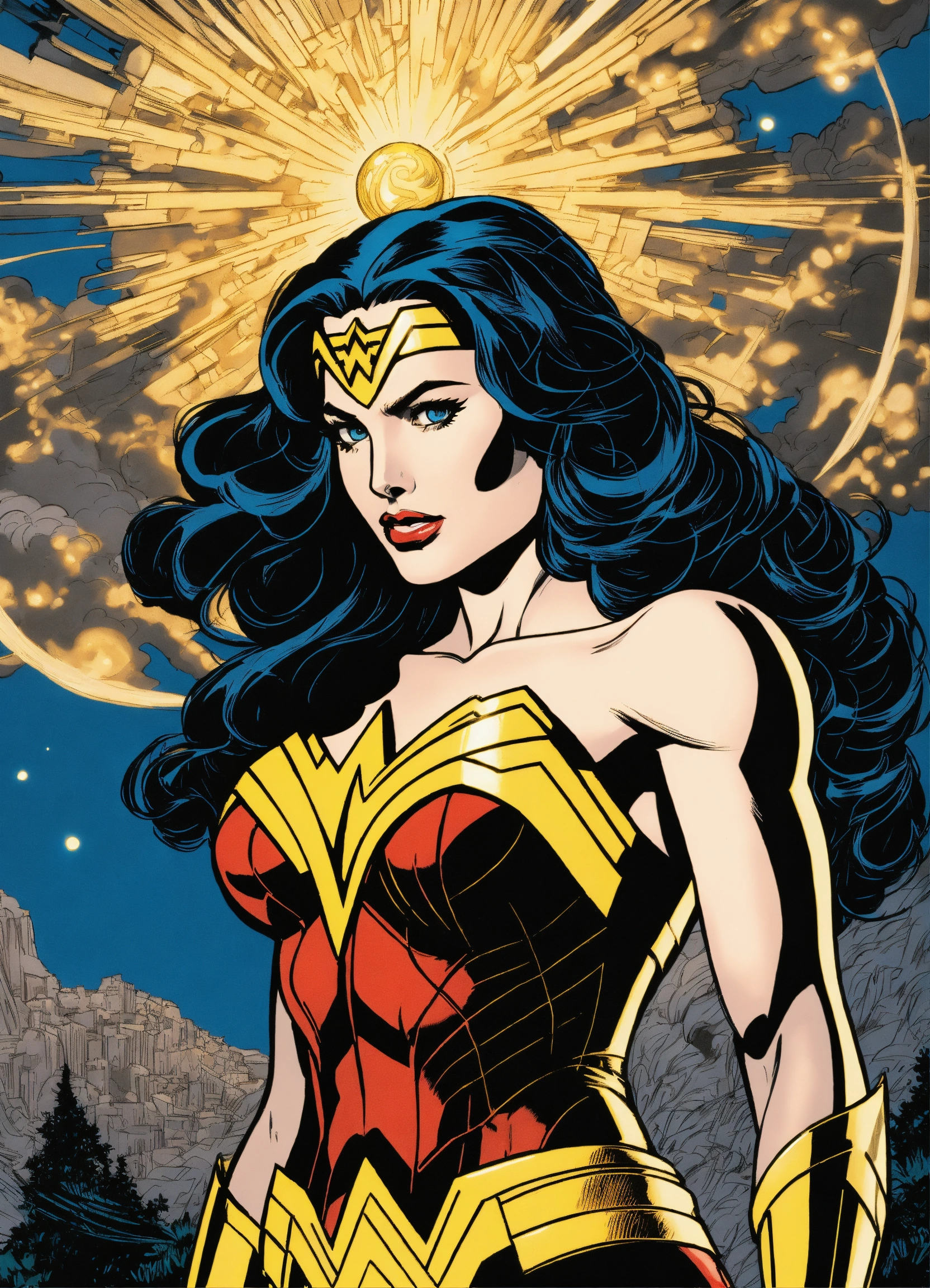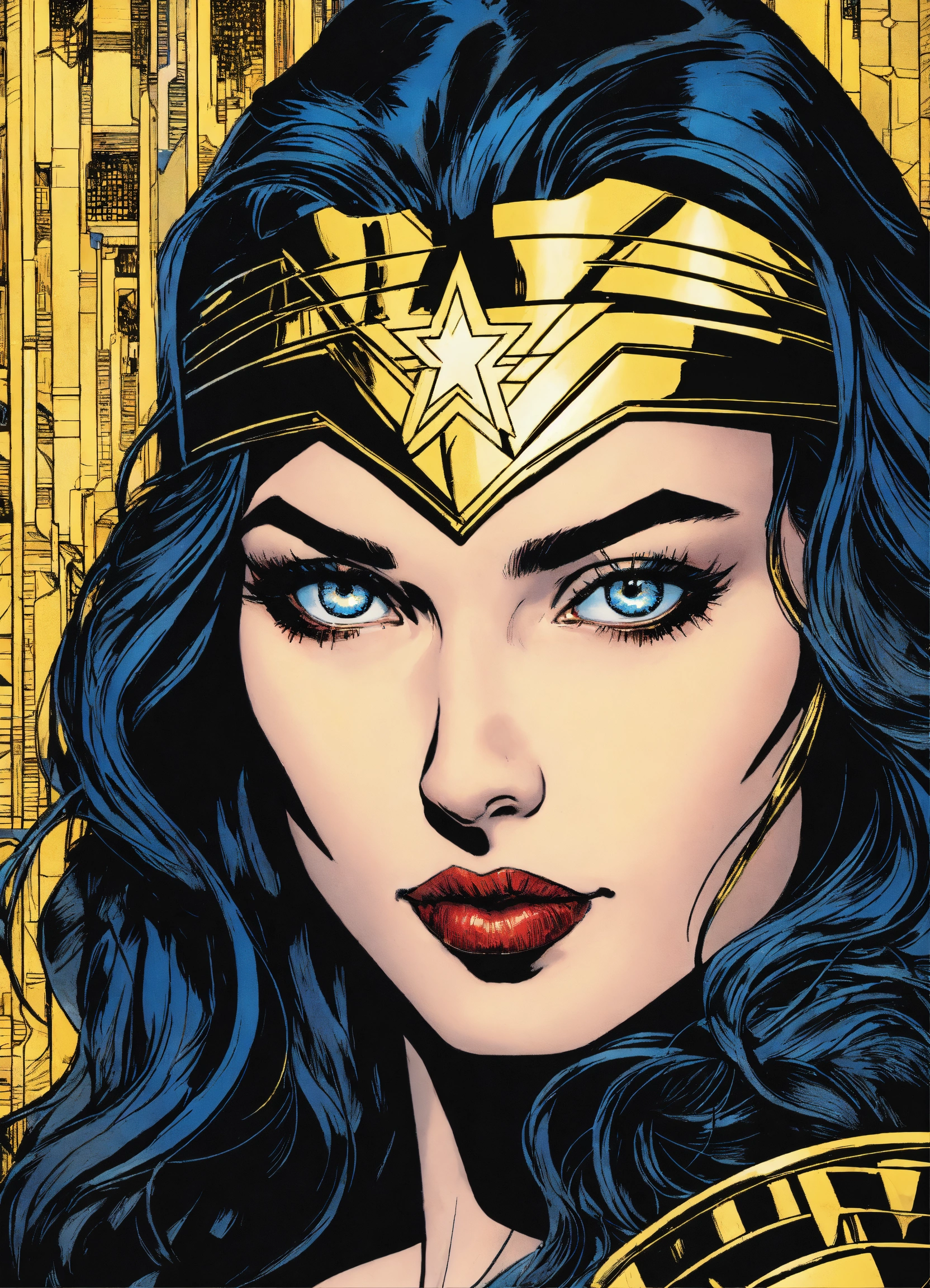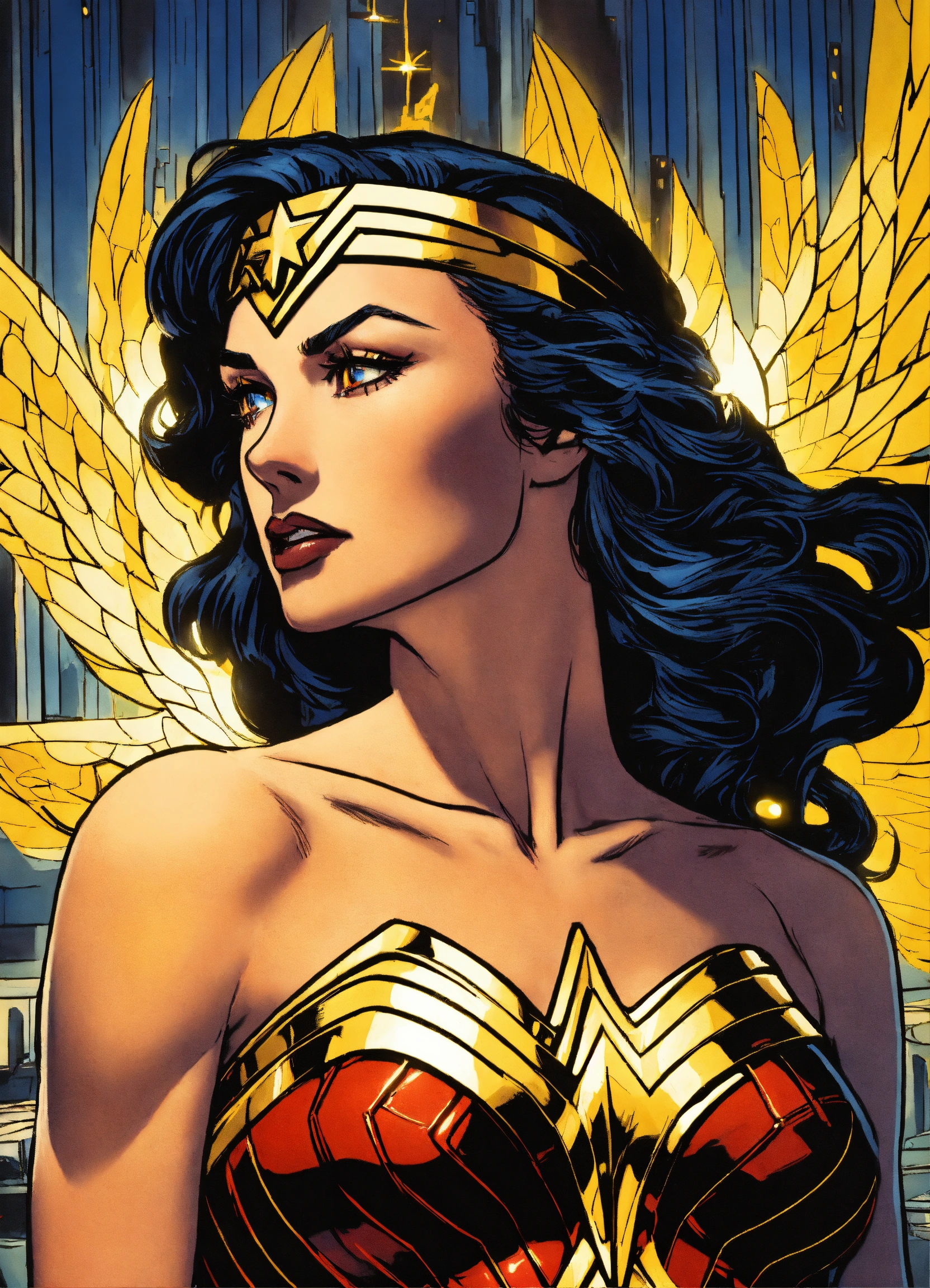 Surrealism, wonder woman, glowing golden eyes, concept art, sharp focus, intricate, highly detailed, smooth, soft glow of a nightlight, art by roy lichtenstein, comic book art style