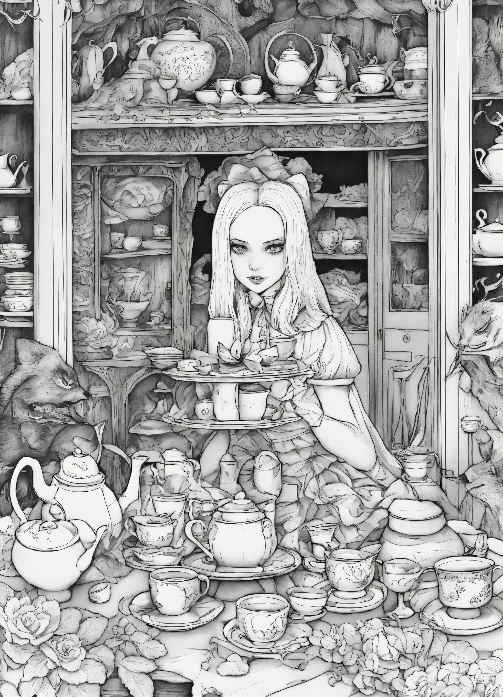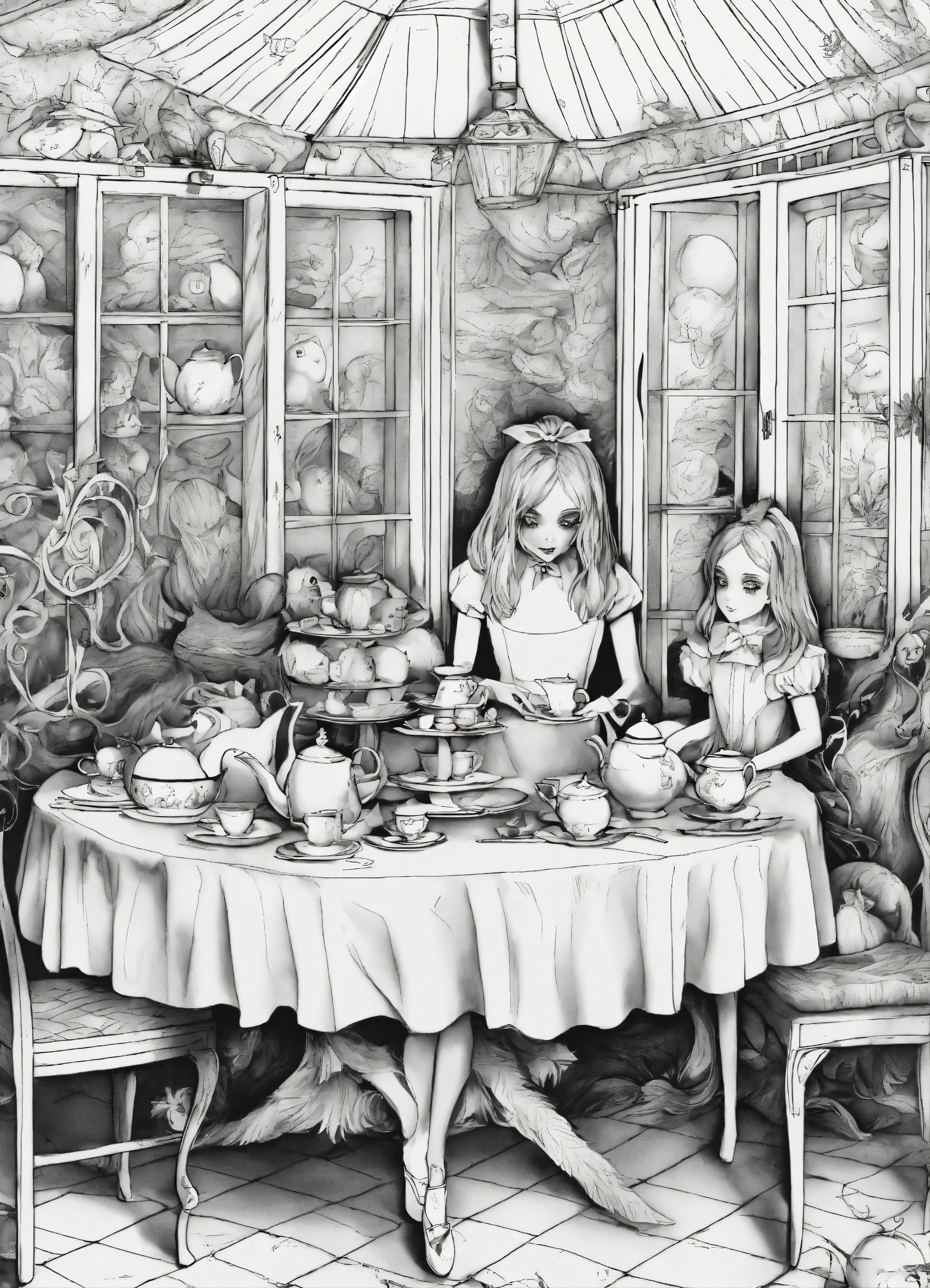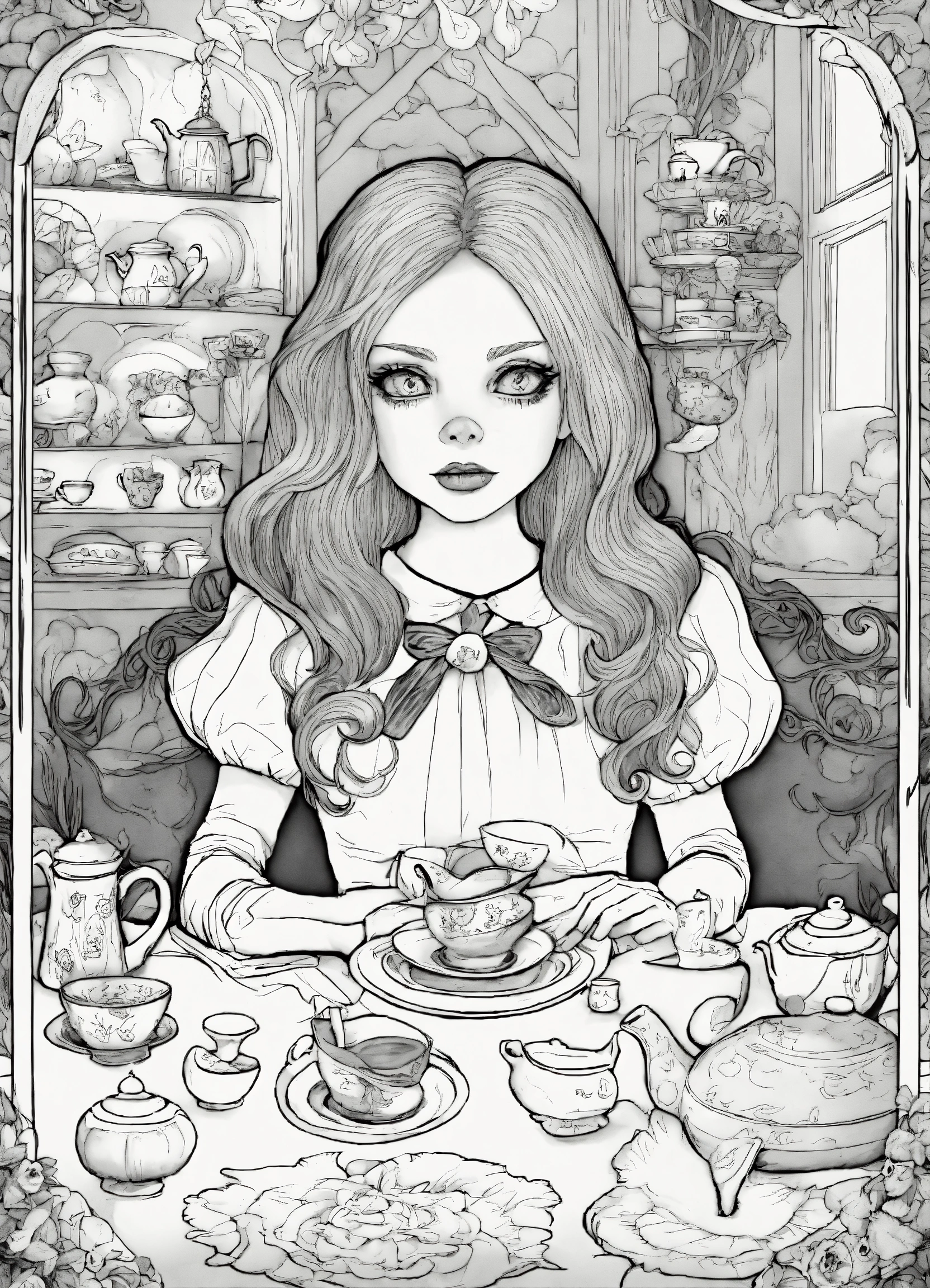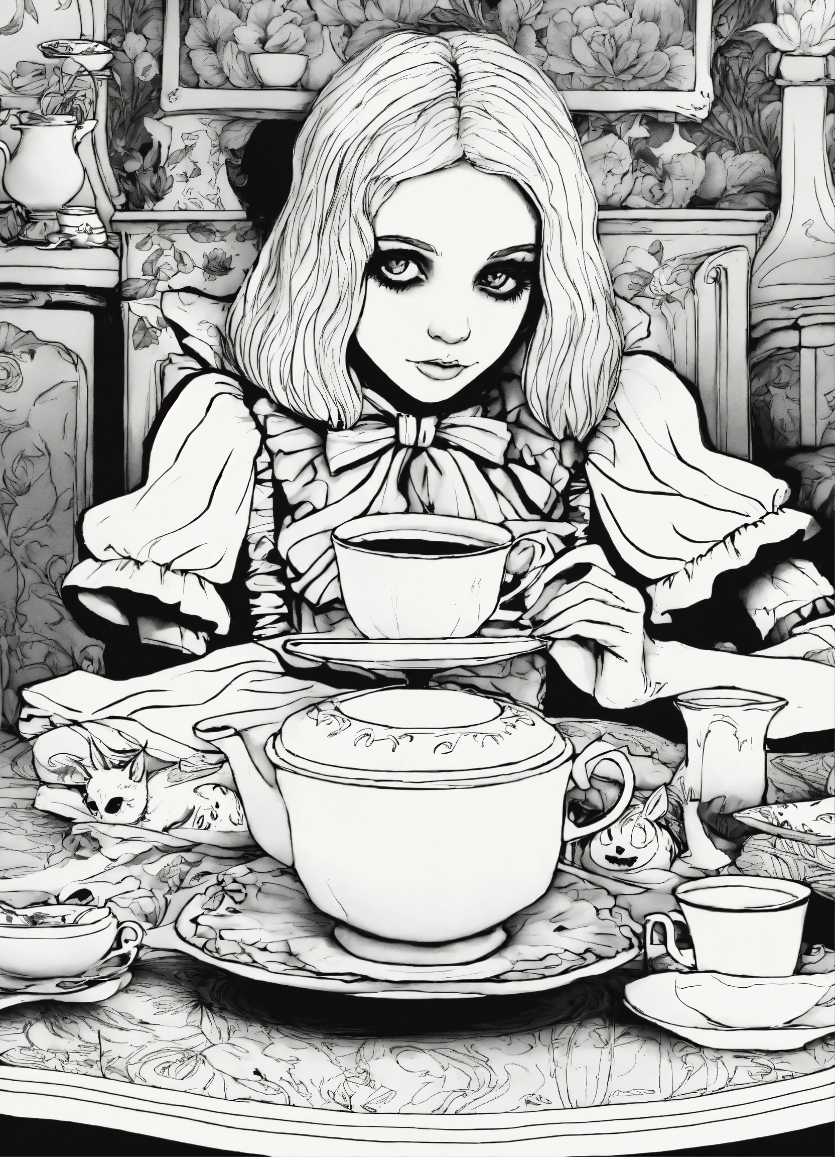 Ghoulish coloring book for adults, black and white, alice's adventures in wonderland, alice at a strange tea party, spine-chilling