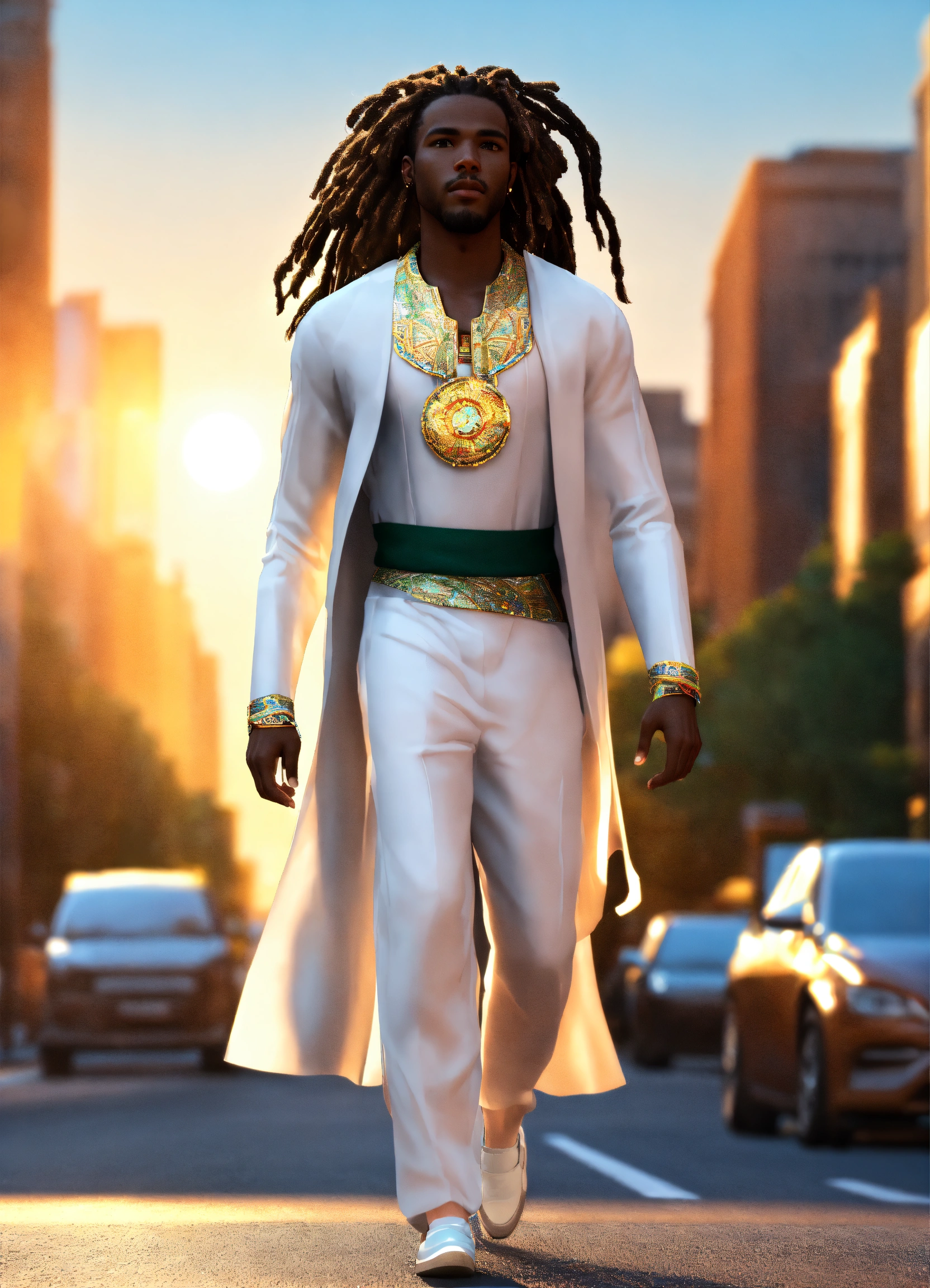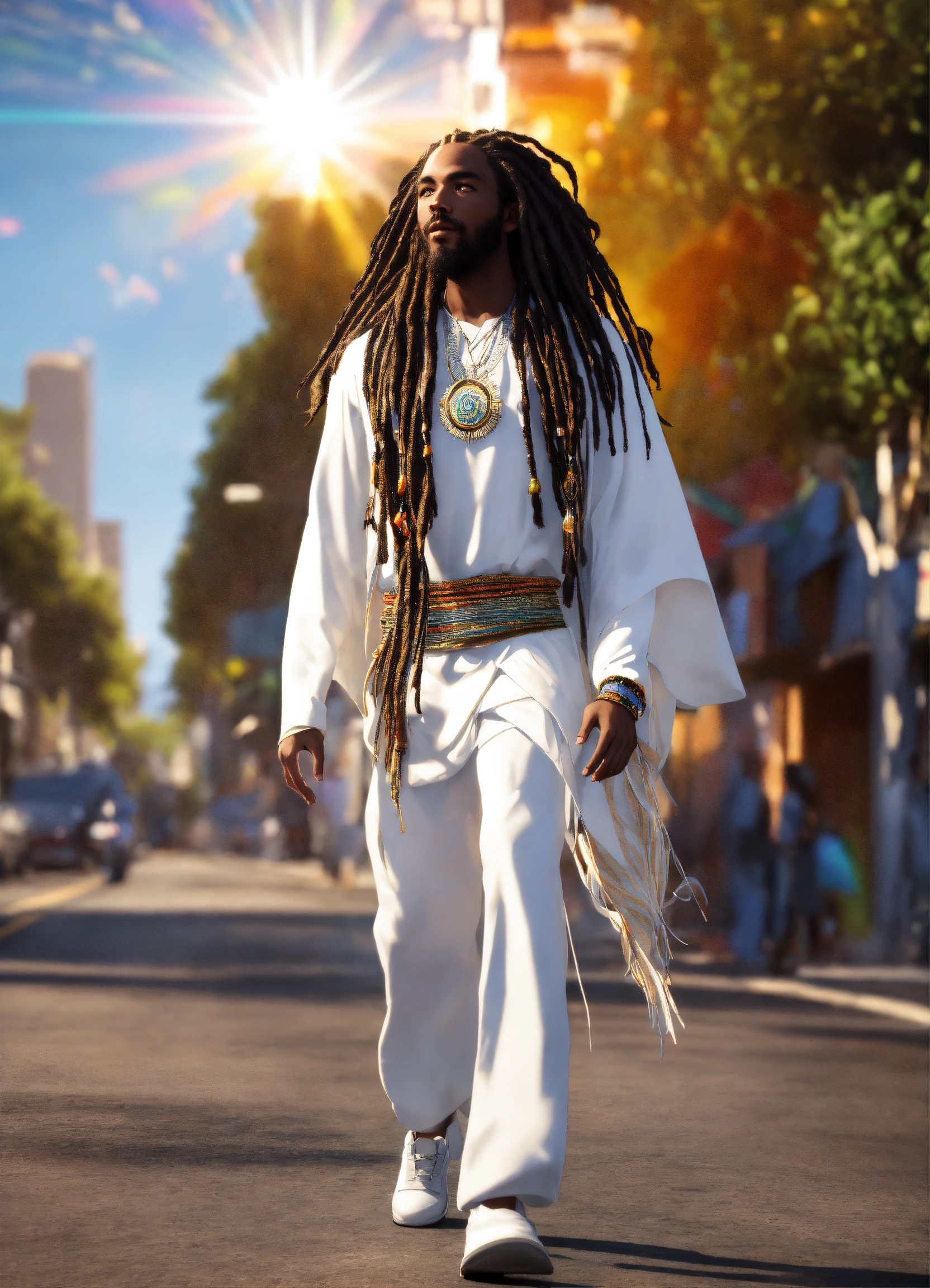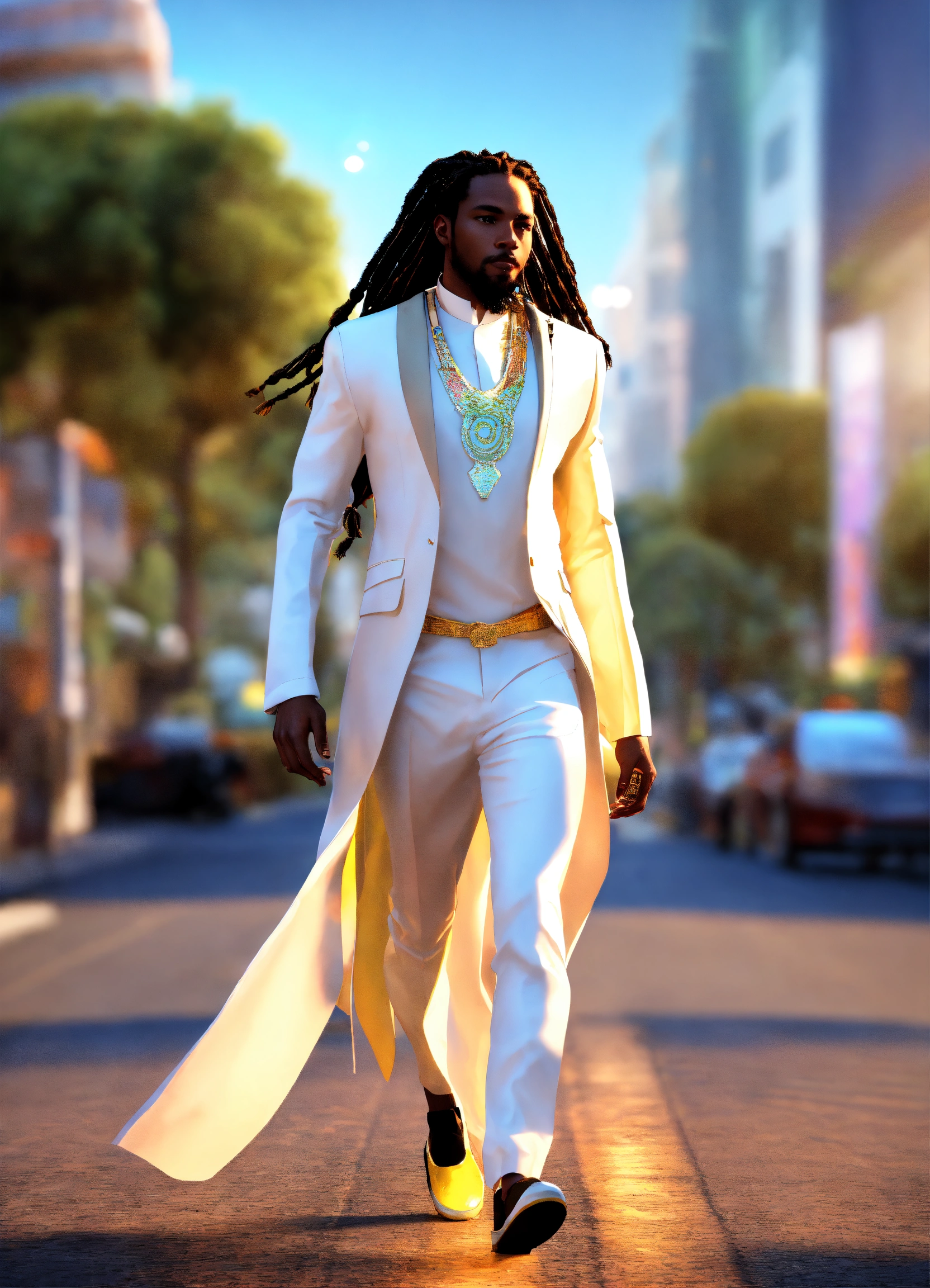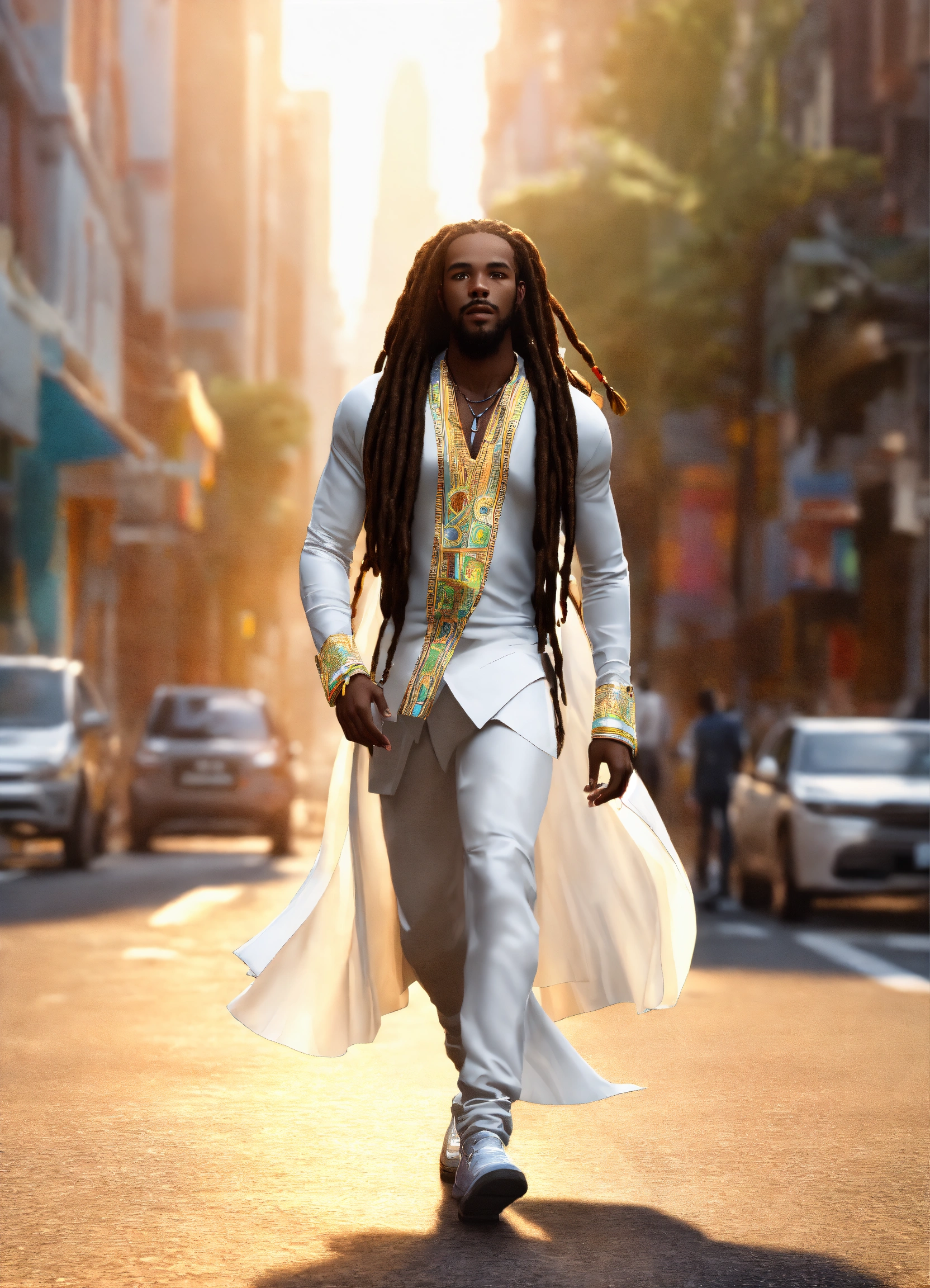 Black man with long flowing dreadlocks, 6' 5" tall, striding up the street confidently, wearing white iridescent african style clothing that refracts the sun, 3d render