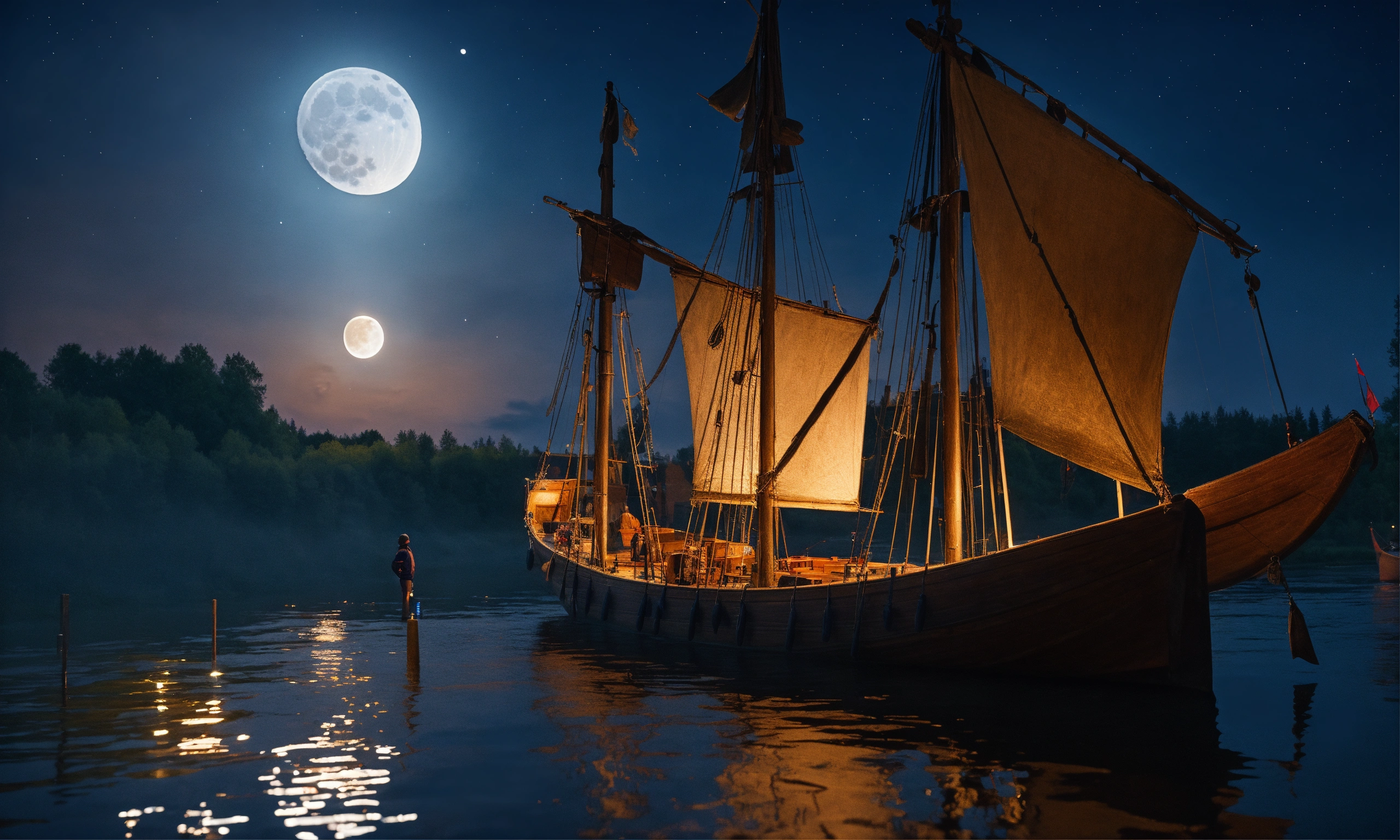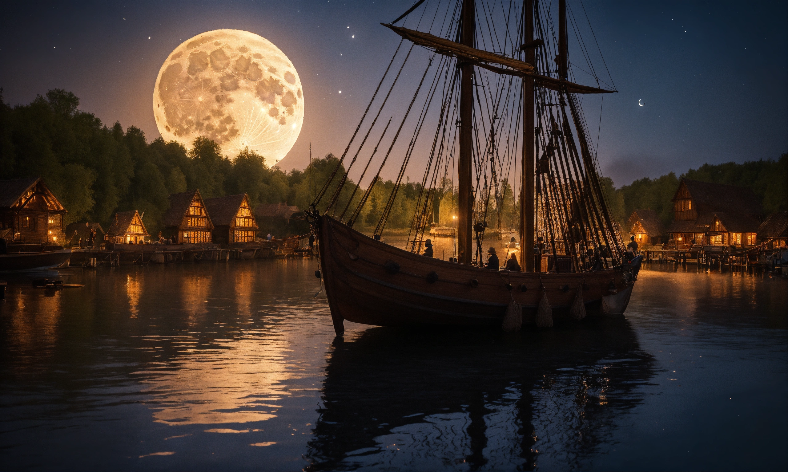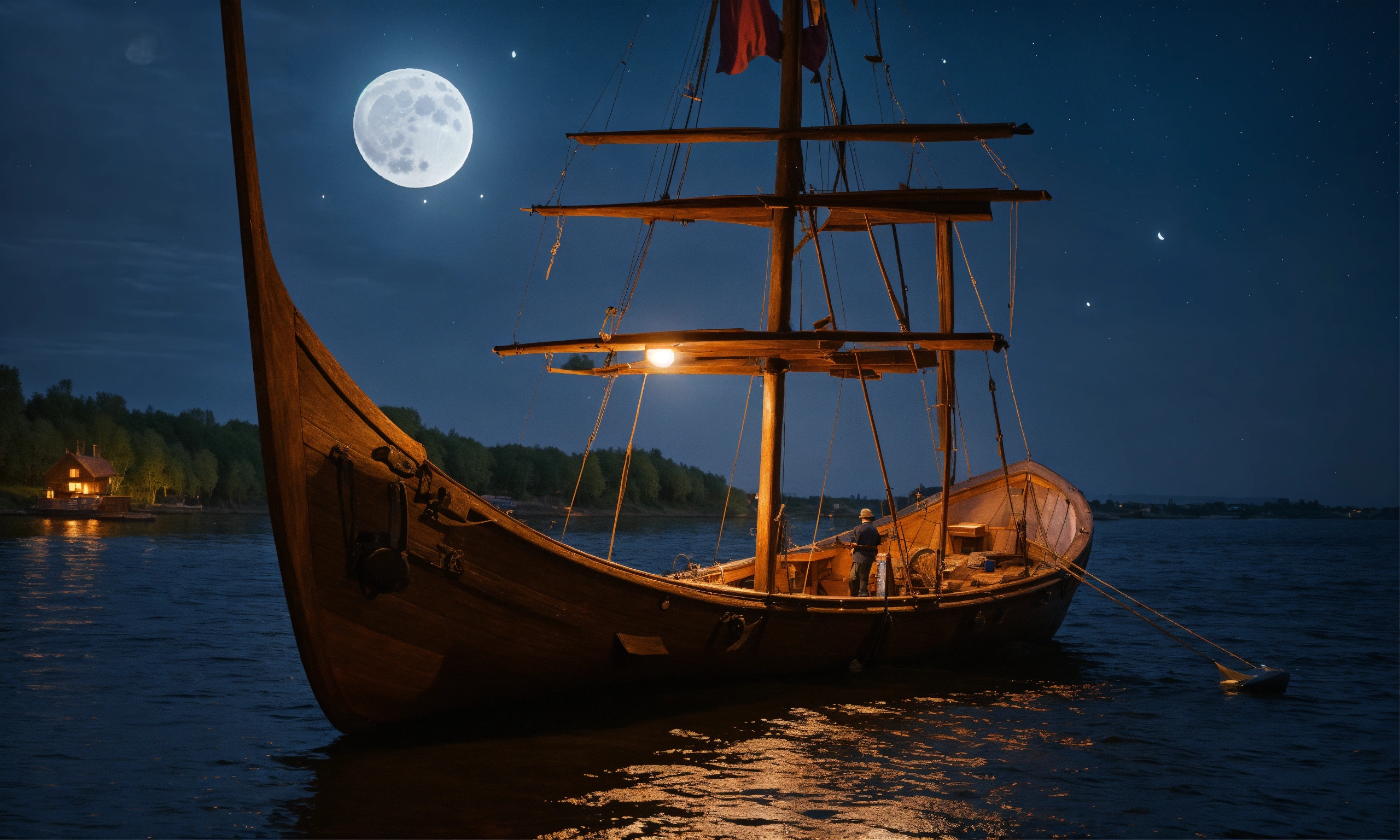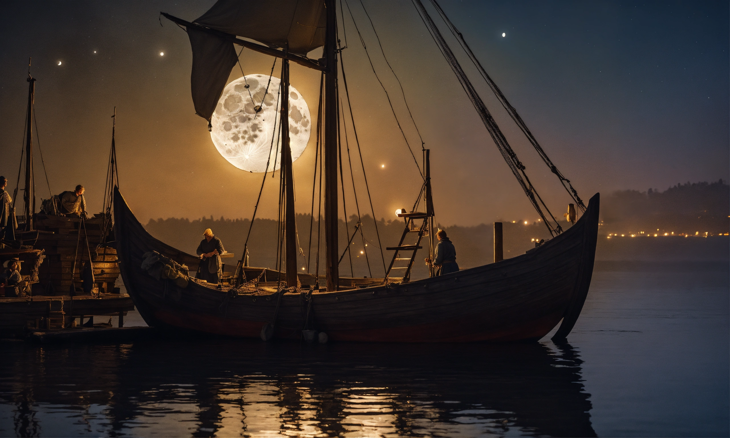 Scandinavian boat builder in medieval times during the night illuminated by the moon