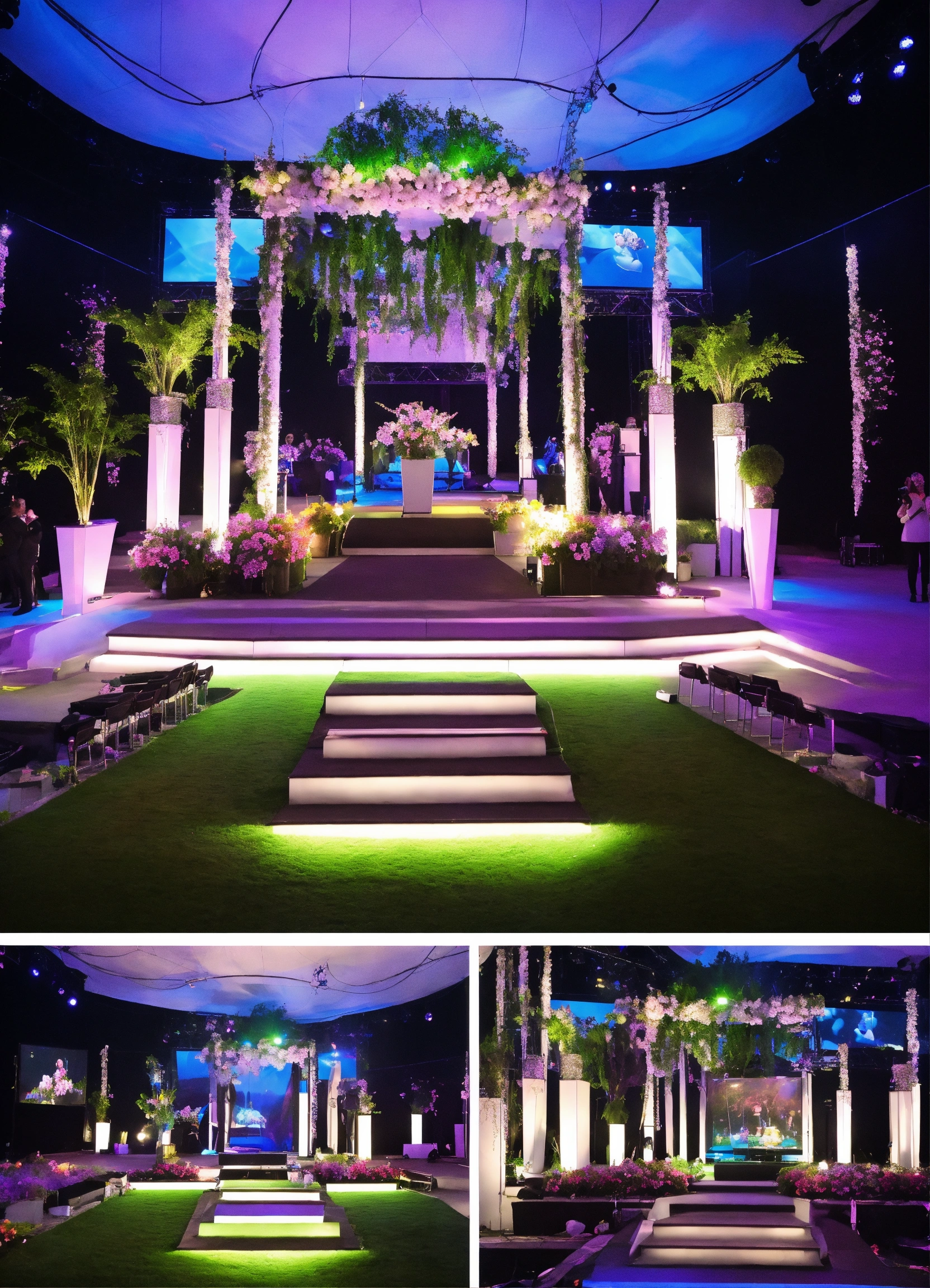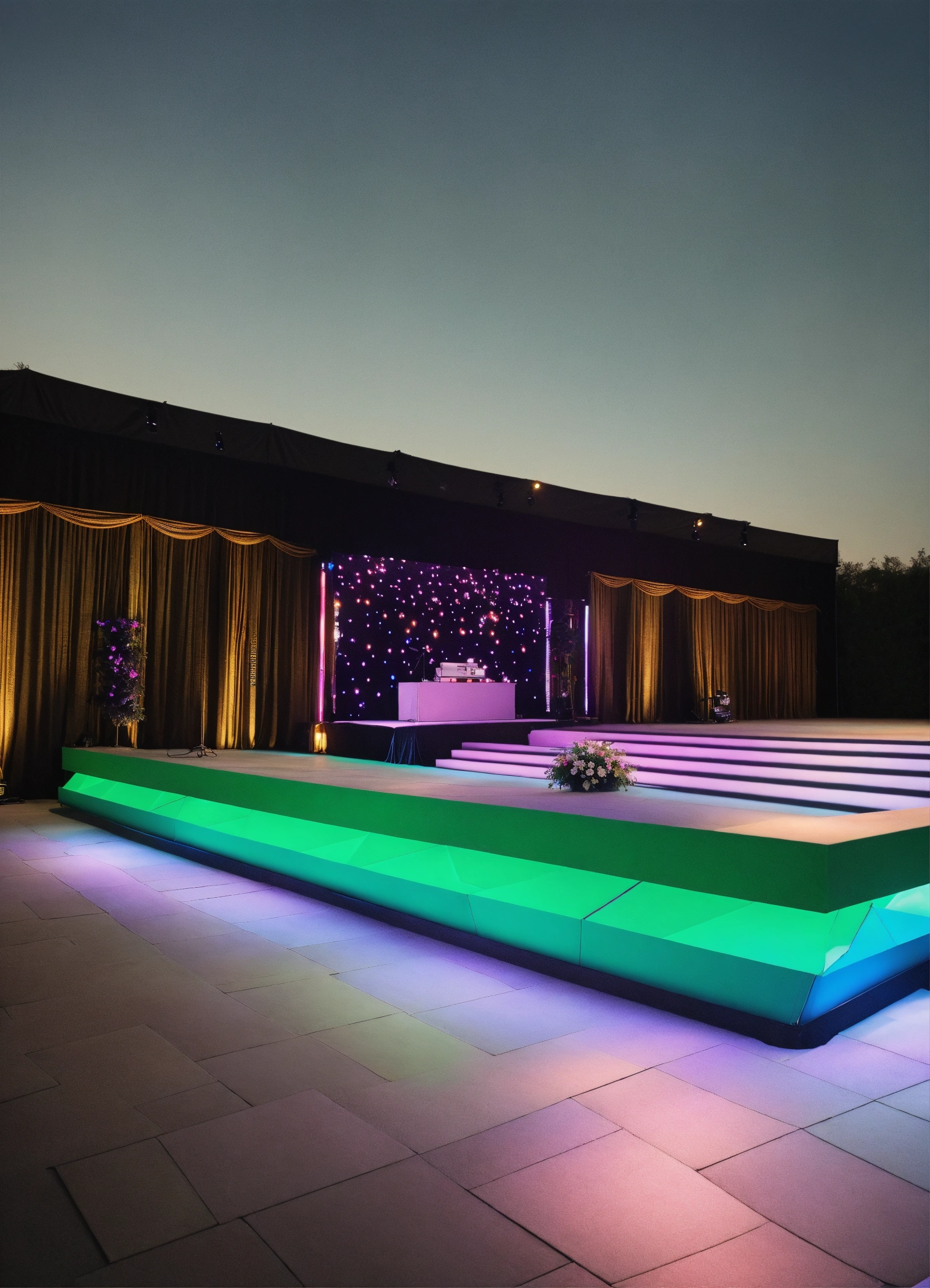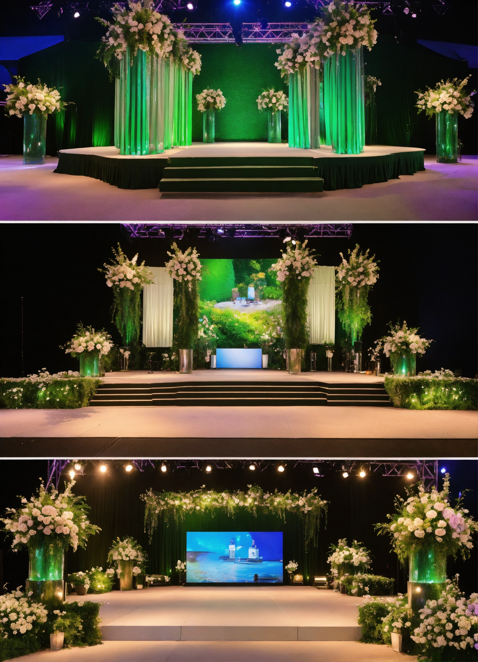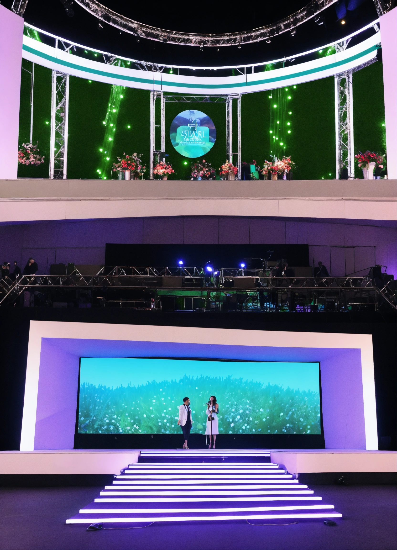Design a medium size garden prestigious stage for an awards ceremony similar to oscars with led screen main screen with 4 side vertical led screens separated from each other for display, add truss system with lighting towards the stage, add nice glamorous steps to the stage with lights including a premium skirting on the side as a decor, incorporate the theme to be about raising the bar concept, use blue white and green colors