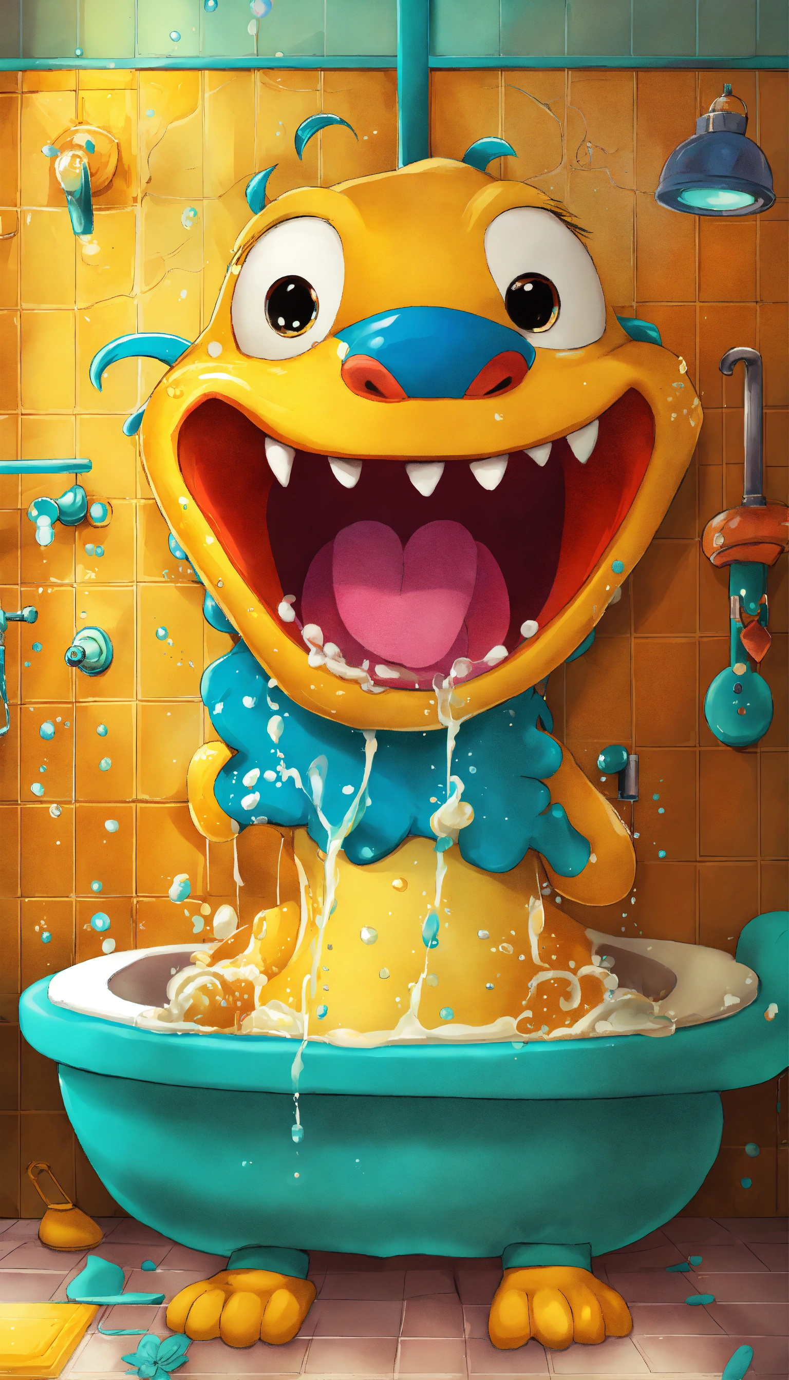 Cierre del grifo el baño genera una imagen que ilustre a un niño cerrando el grifo del baño mientras se cepilla los dientes, 8k, estilo cuento para niños, colores vibrantes