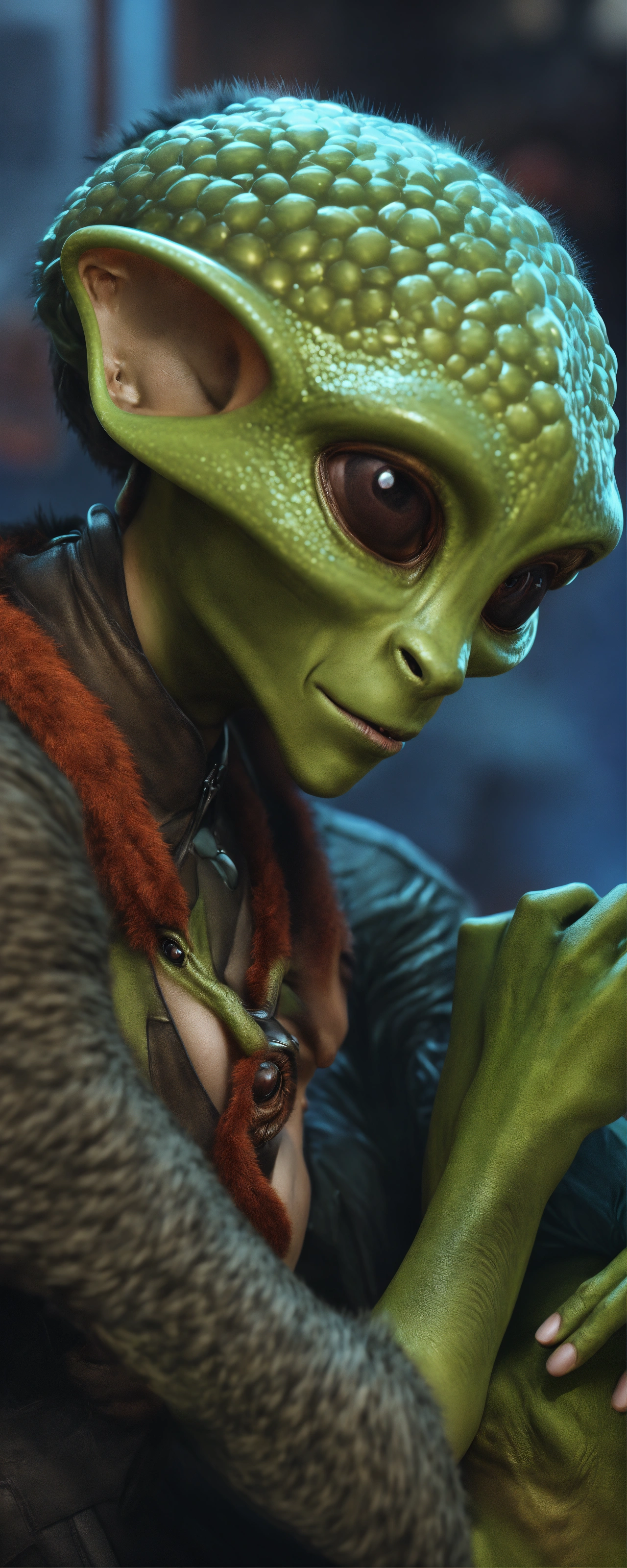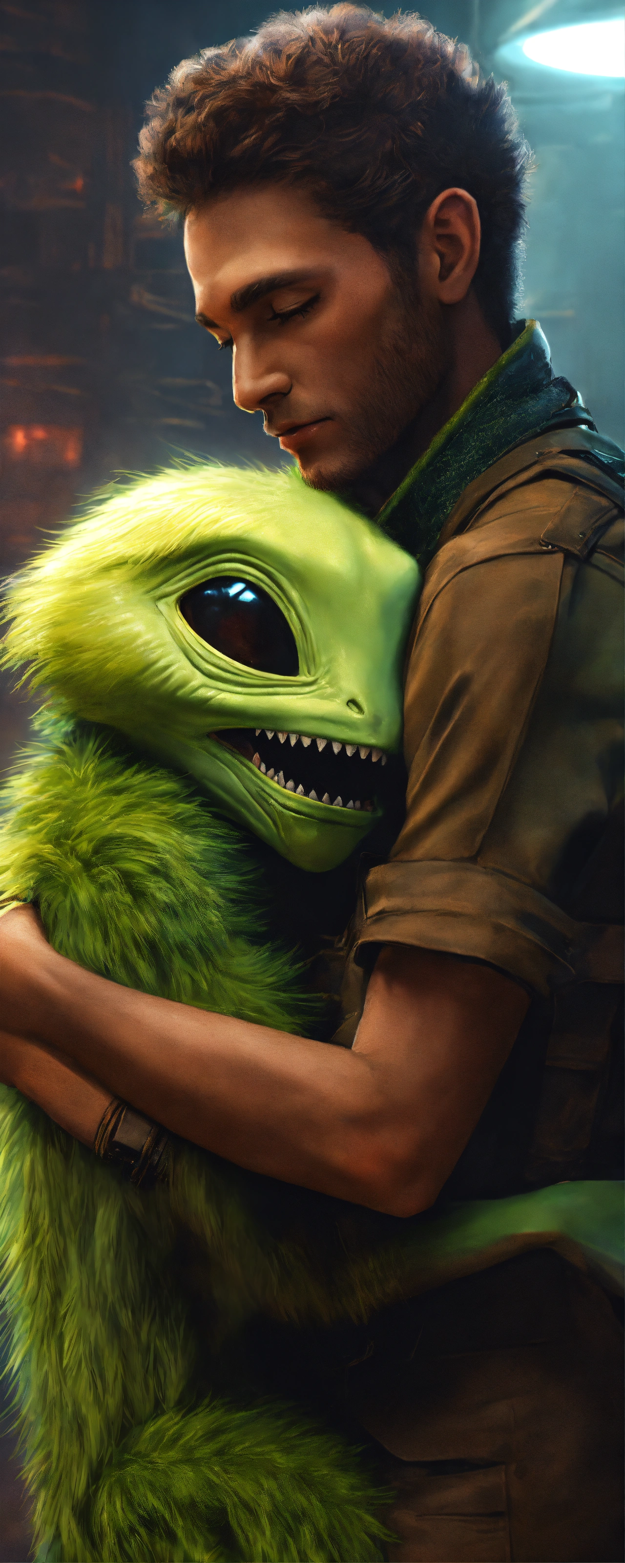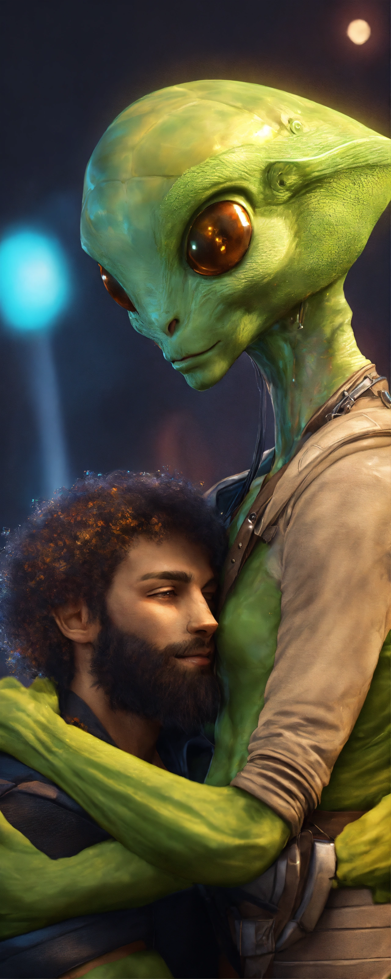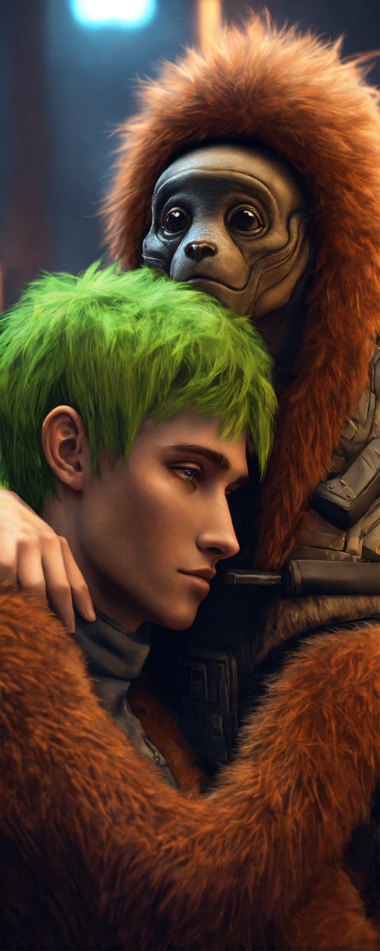 Furry alien male and a human male embracing