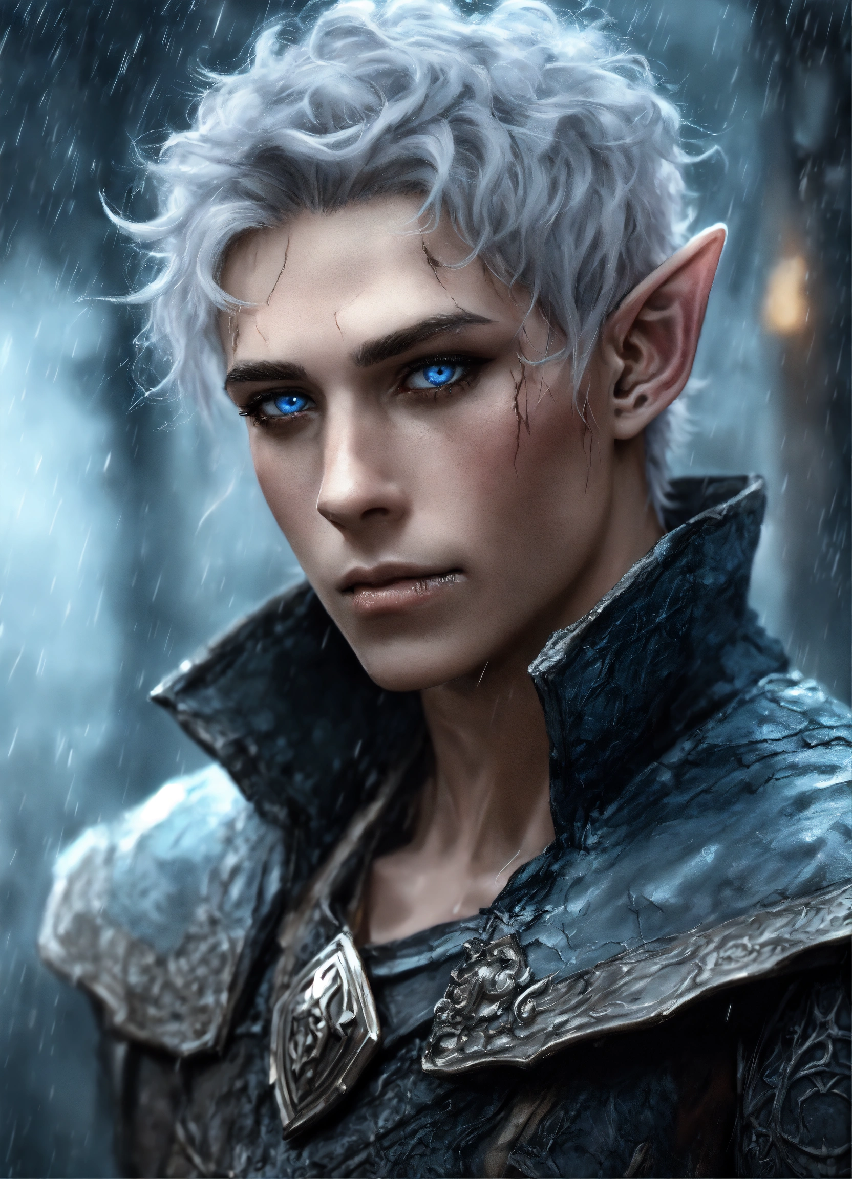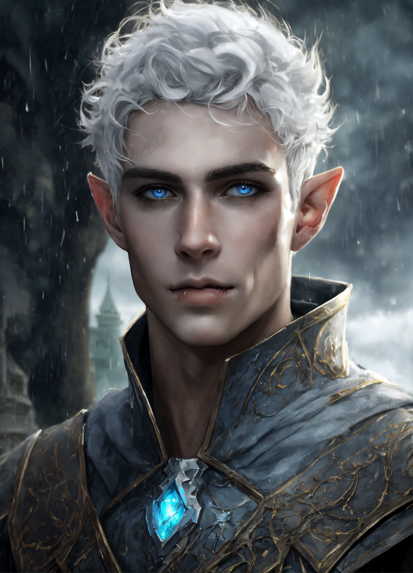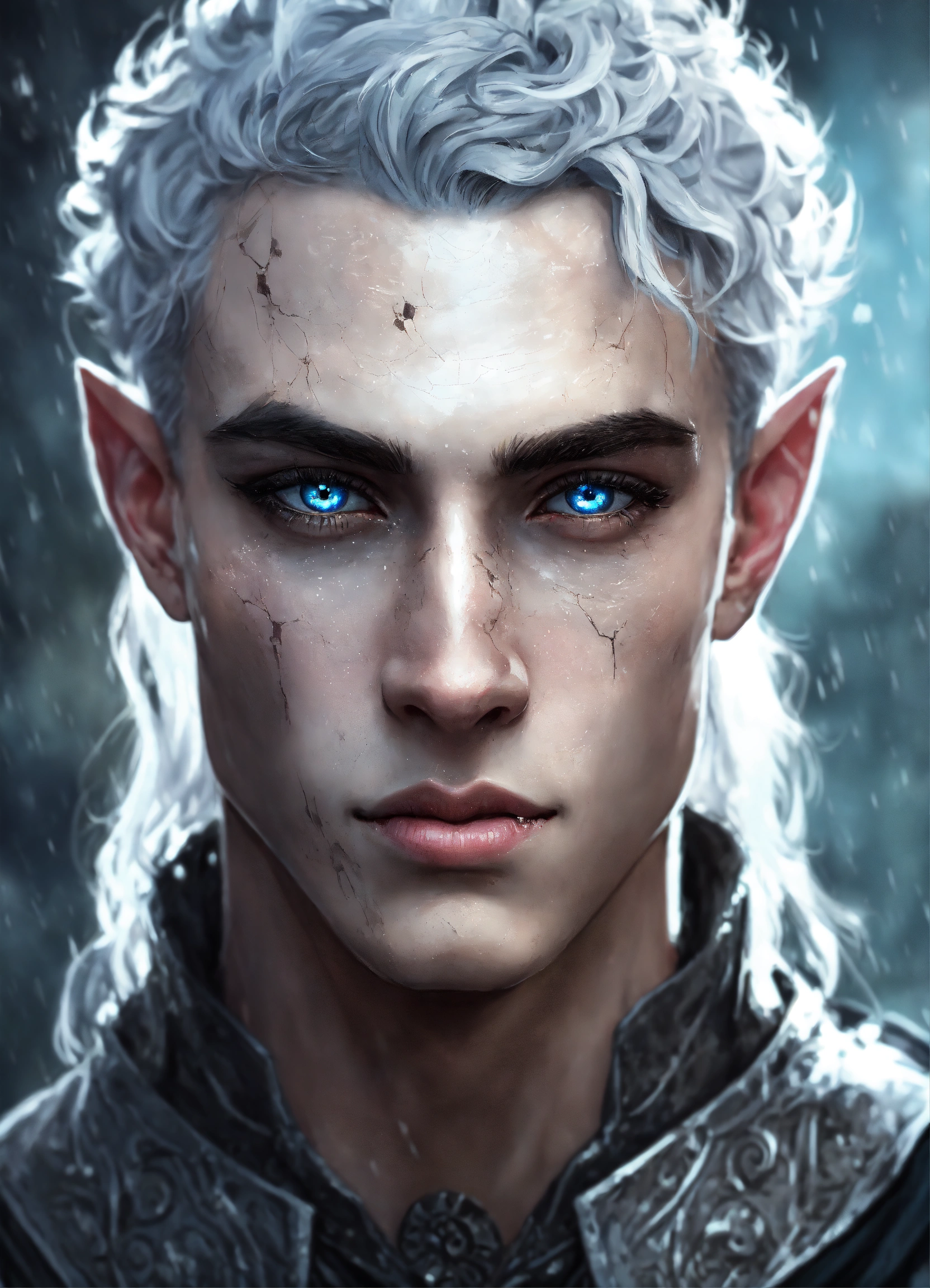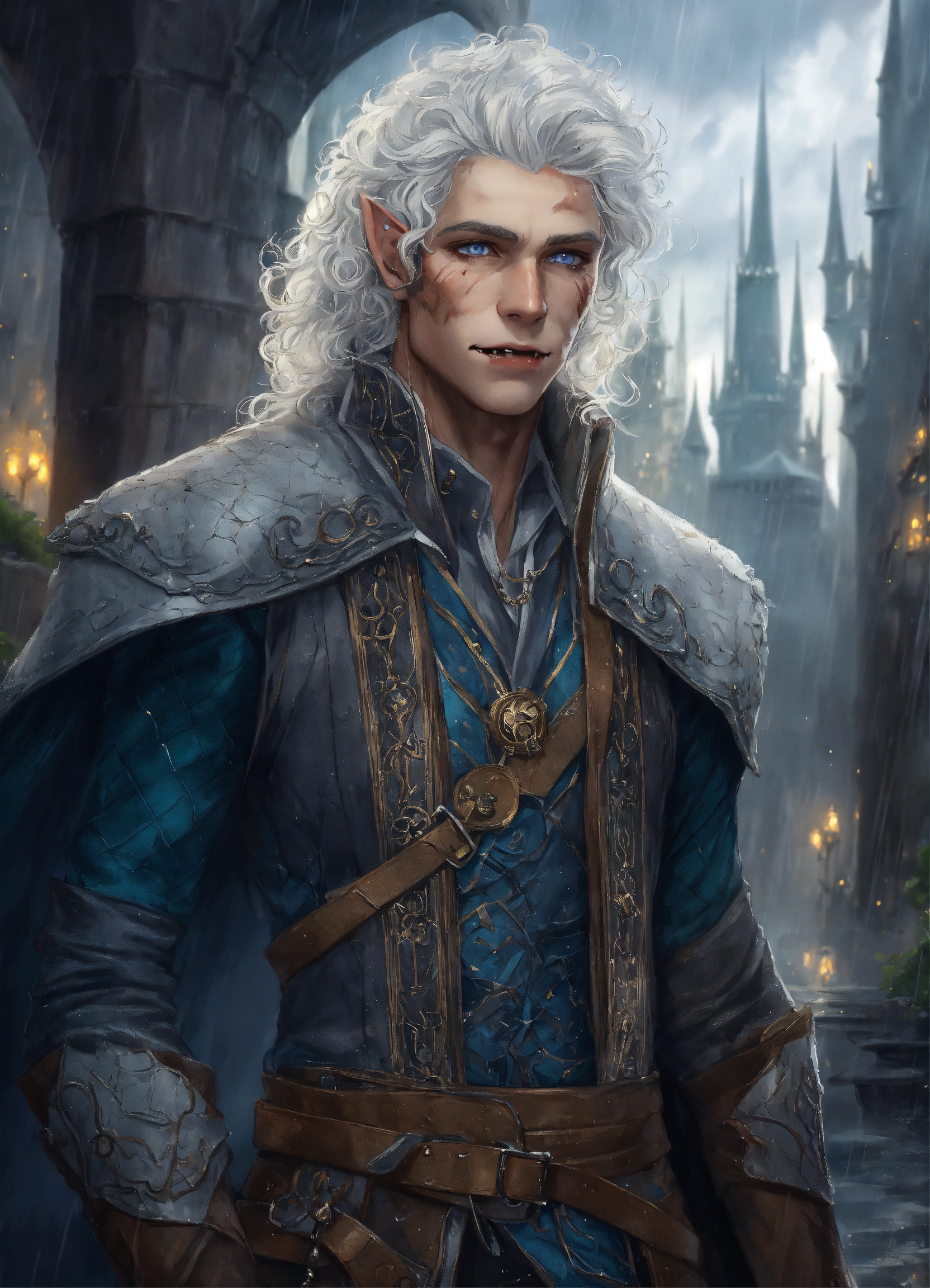 Fantasy portrait of a ash-grey skinned elf, masculine, androgynous, sorecerer, artificer, cracked face, black facial scars, asymmetrical features, pale blue eyes, sharp features, sad expression, fangs, soft smile, glowing white curly hair, rainy castle background, ultra detailed