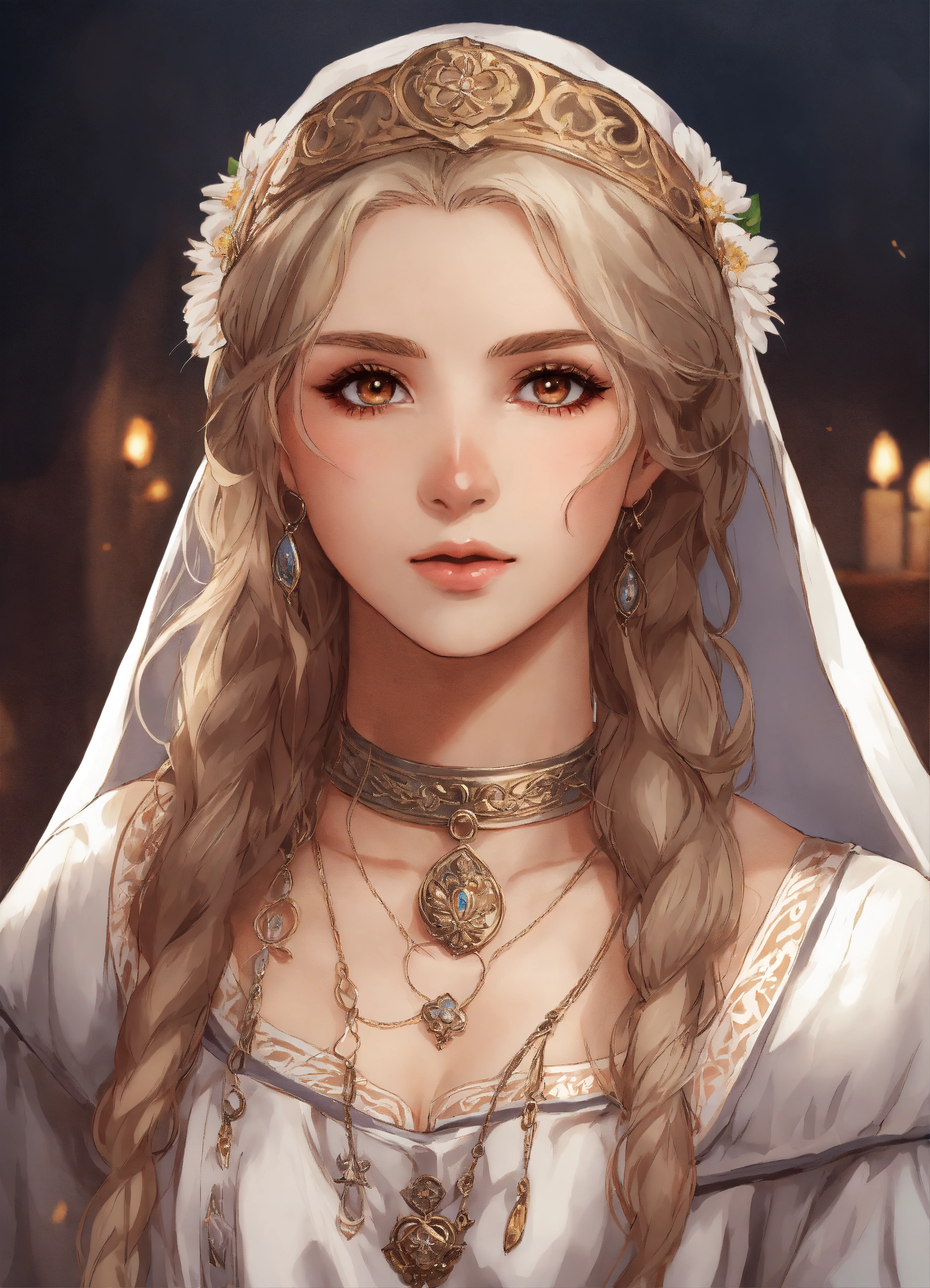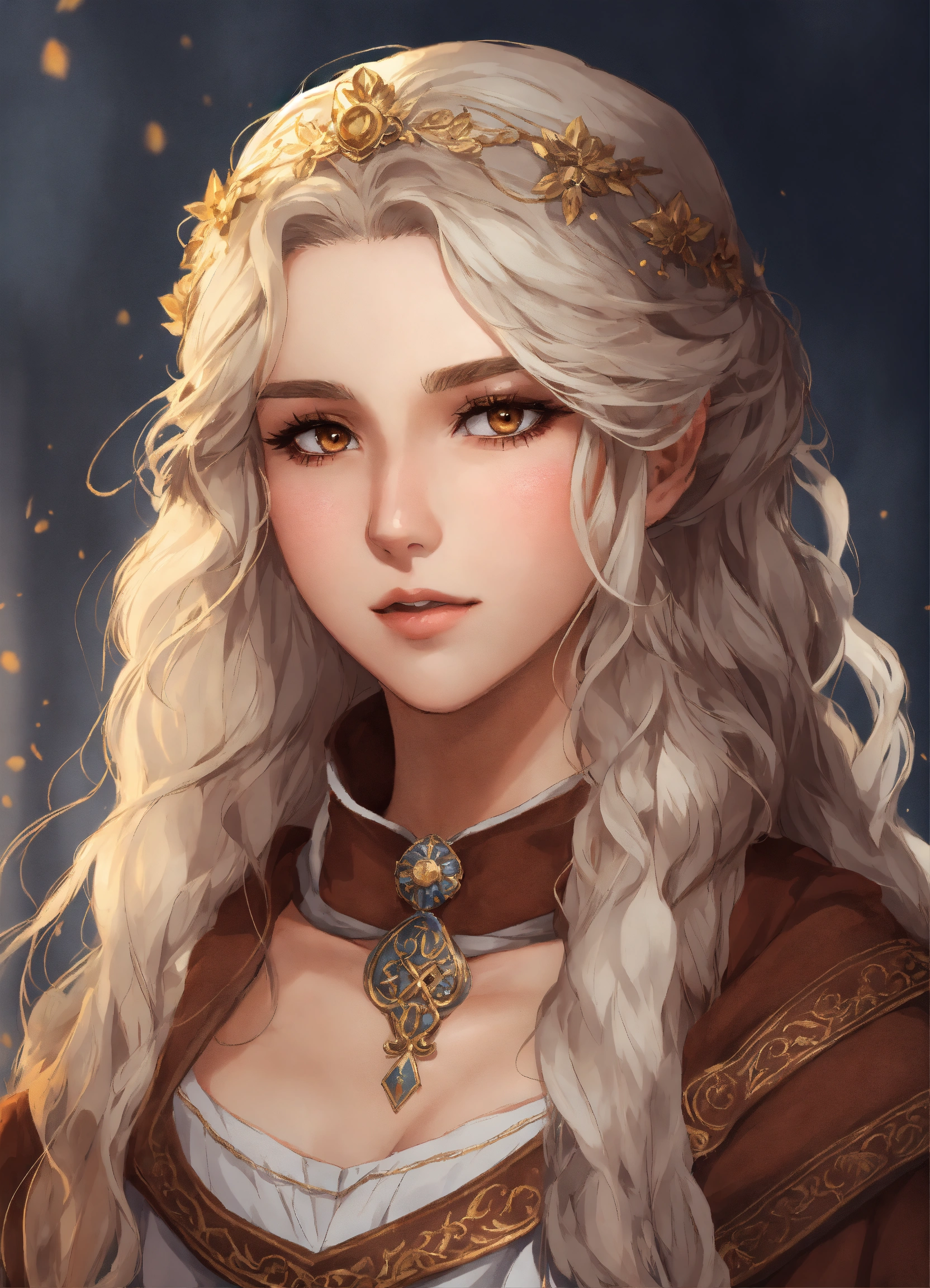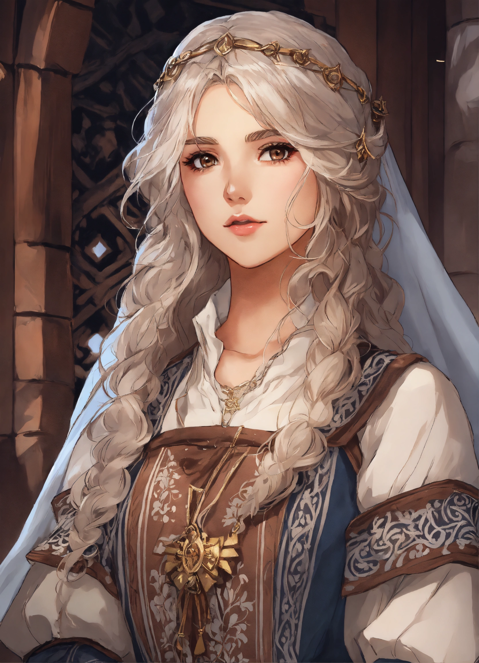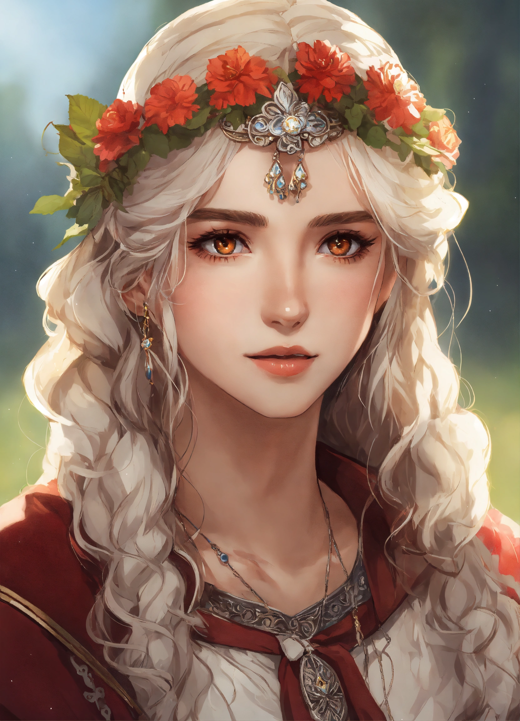 Anime reskin style a girl of 18 years old, slavic, beautiful face.with brown eyes, white wavy hair, dressed in medieval slavic clothes