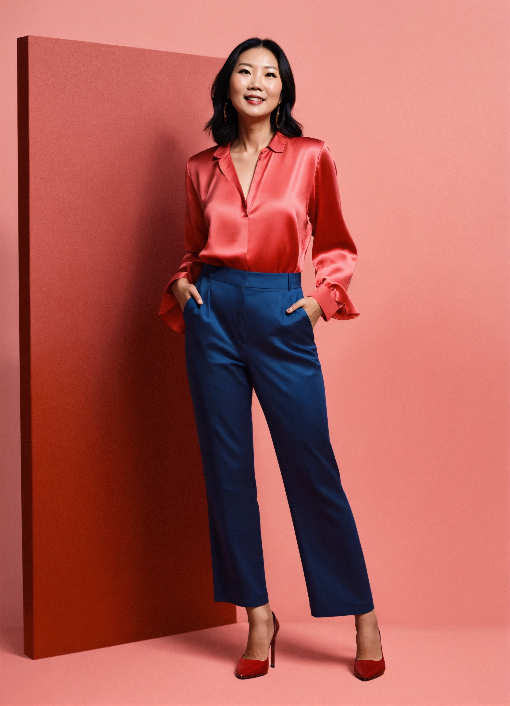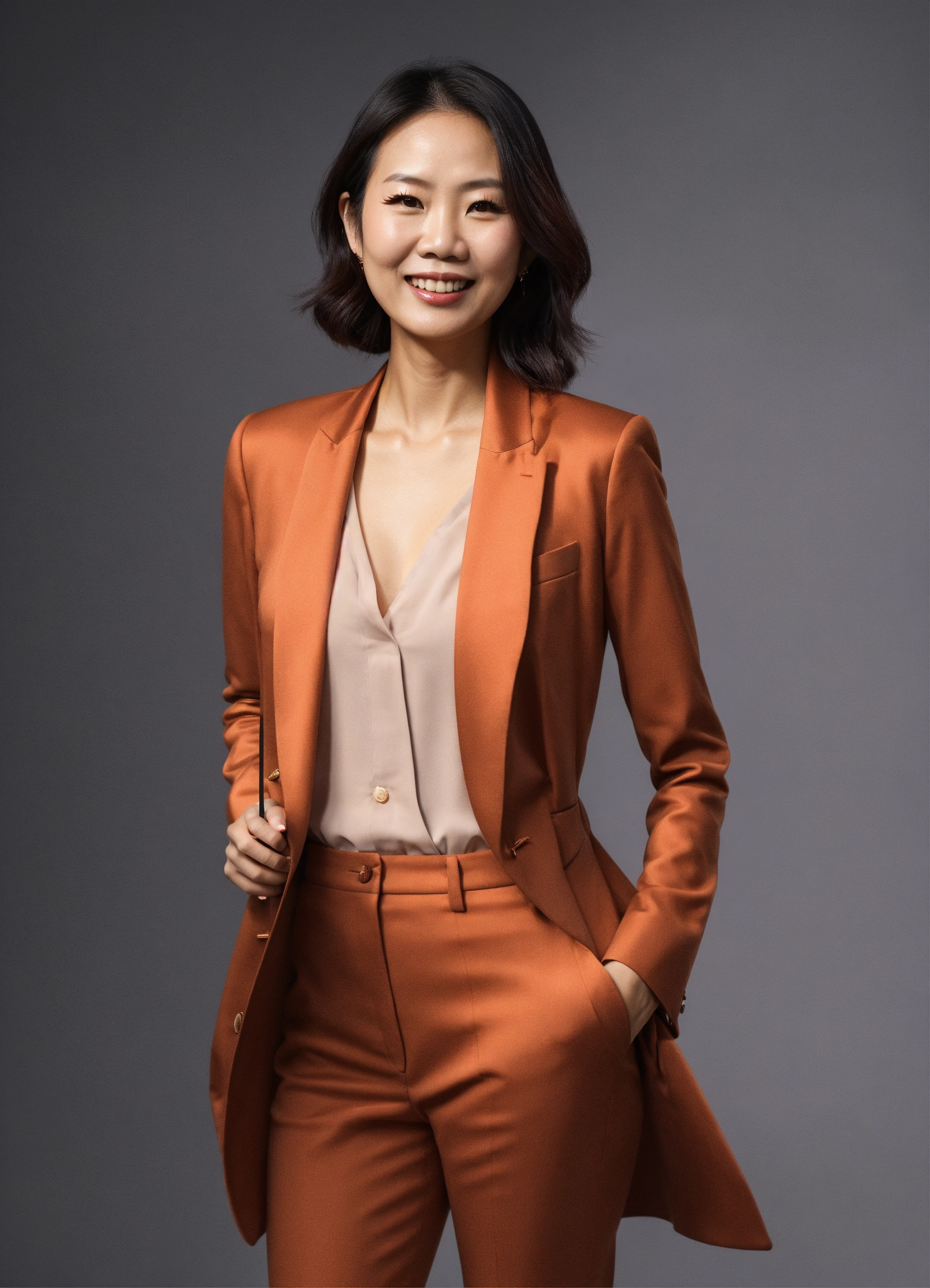 Photorealistic full-body image of one, glamorous, fashionable, happy hour, thirty-eight-year-old, asian woman, standing in front of a blank background