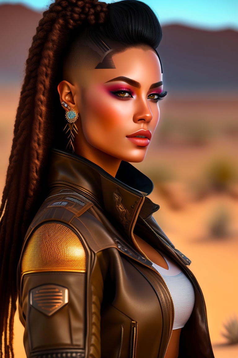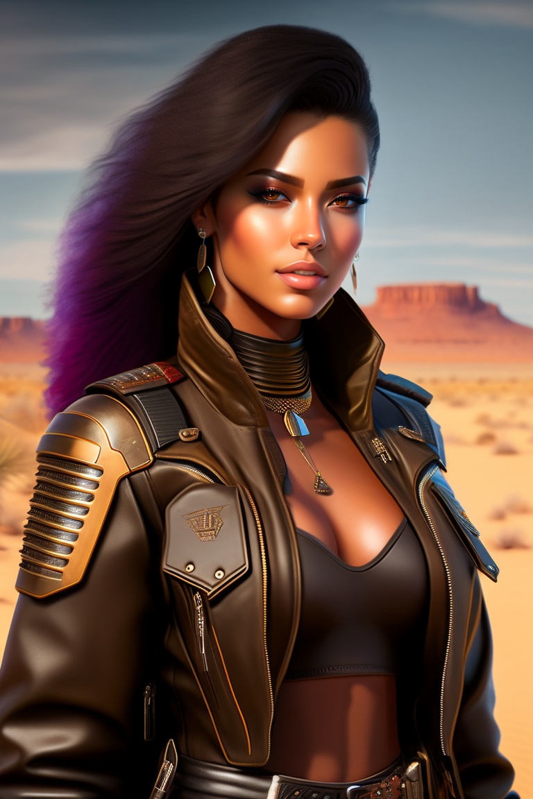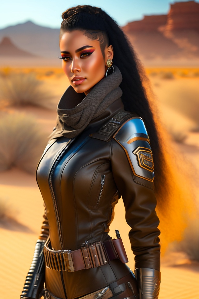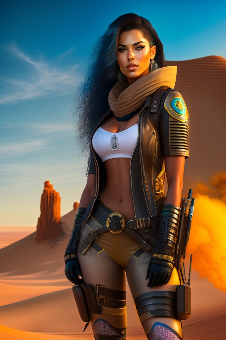 Female cyberpunk nomad hispanic feme fatale nomad biker, hot and tough, desert background modern desert combat clothing