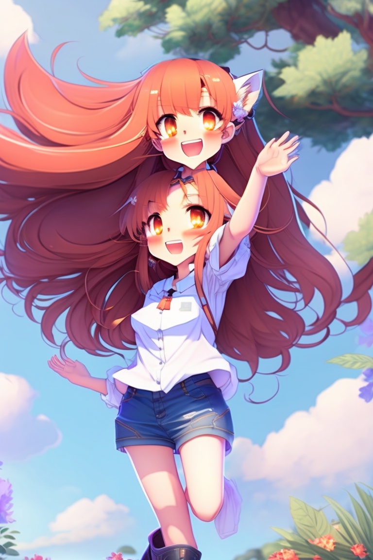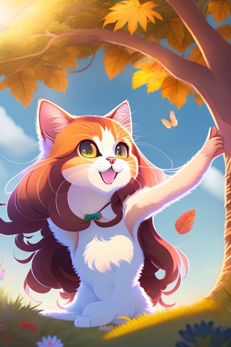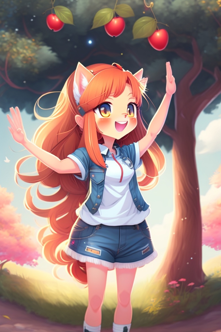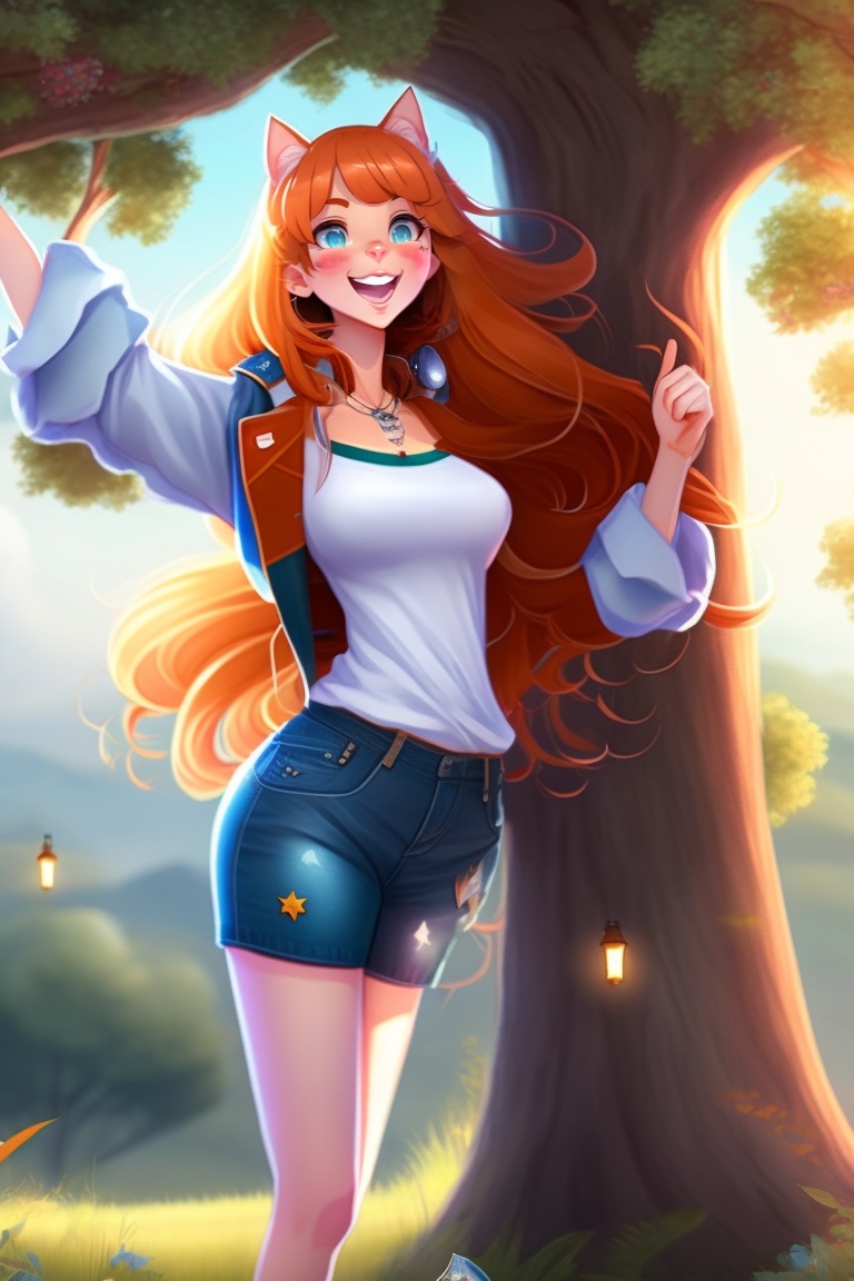 Anthropomorphic furry cat girl with white fur and red long hair in denim shorts and a top stands under a tree, raising her hands up and smiling, angle from below