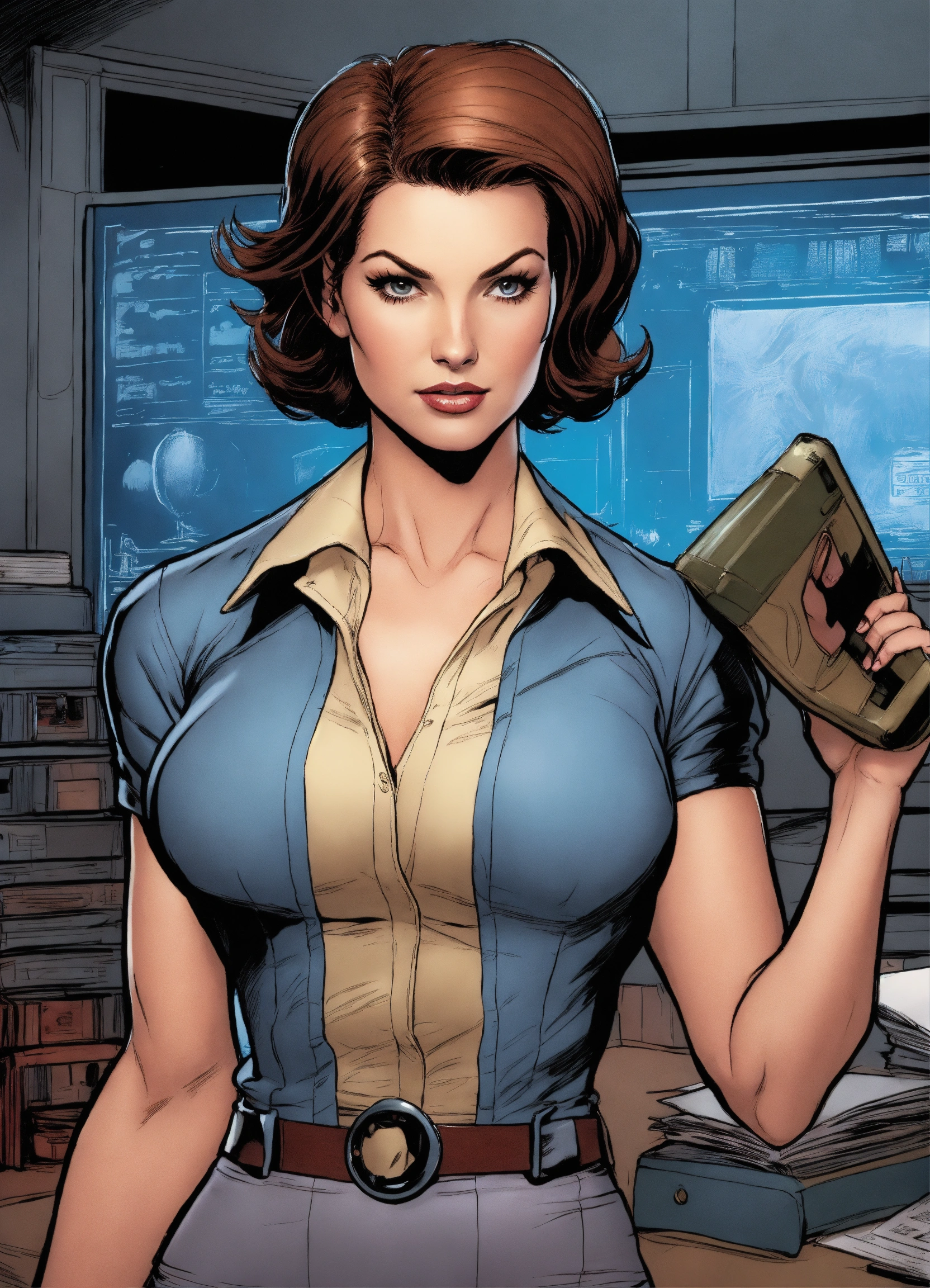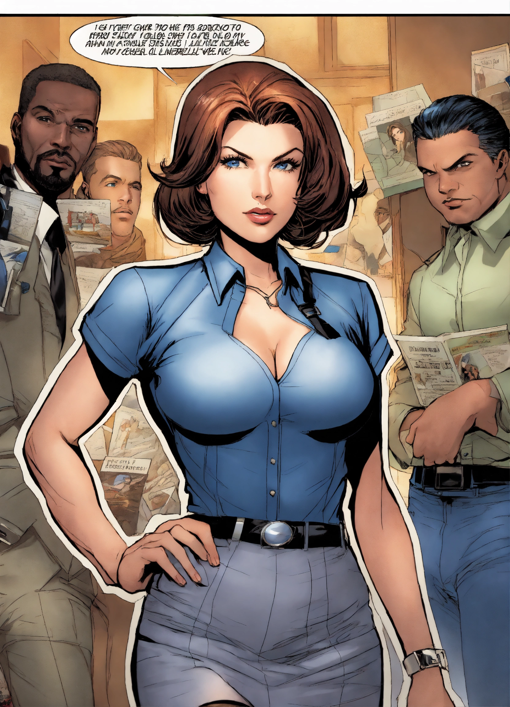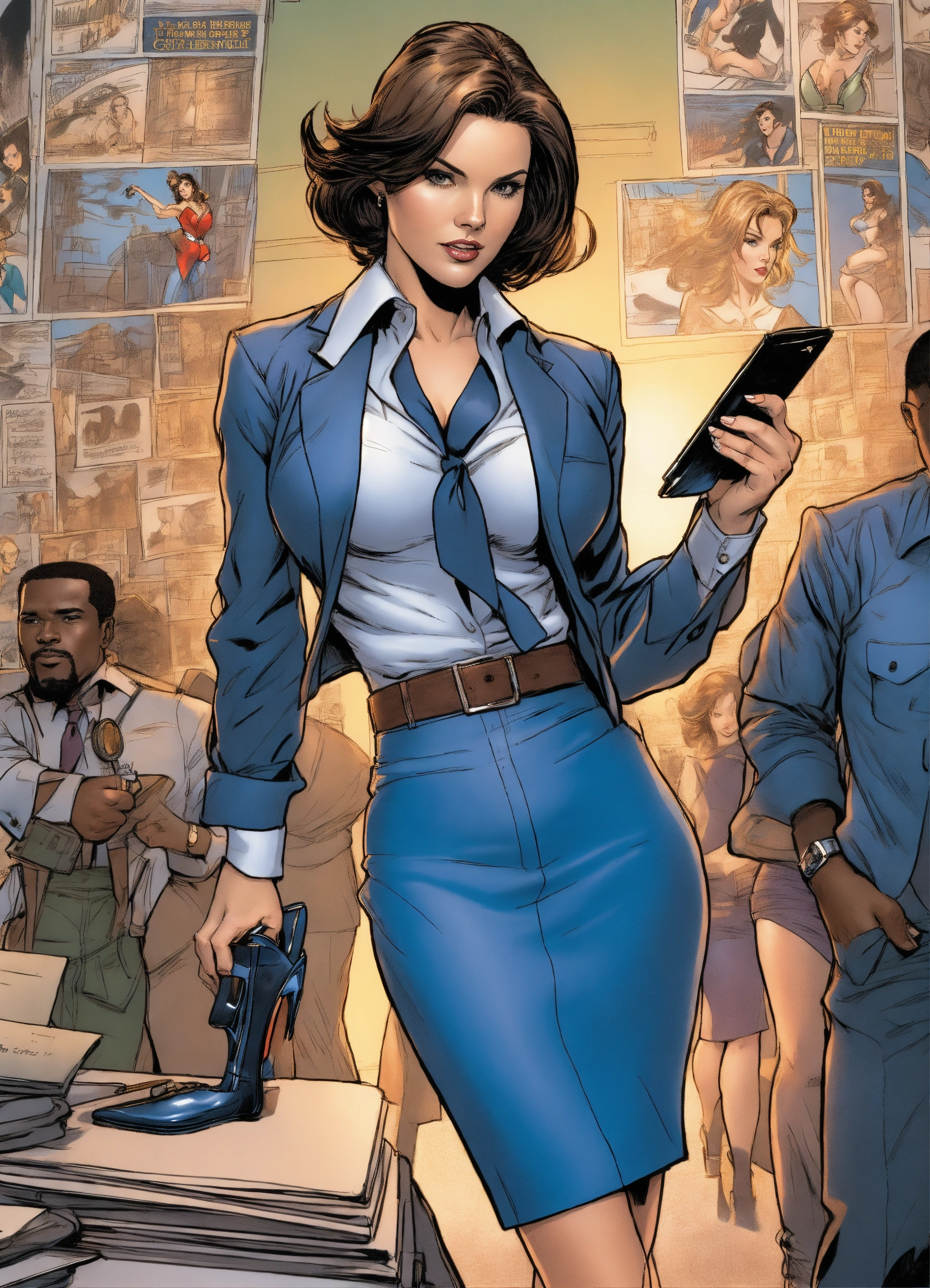 Older jill valentine as lois lane as a reporter, wearing a pencil skirt and stiletto high heels, art by jim lee, art by j. scott campbell, short brunette bob hair, carried by a black man