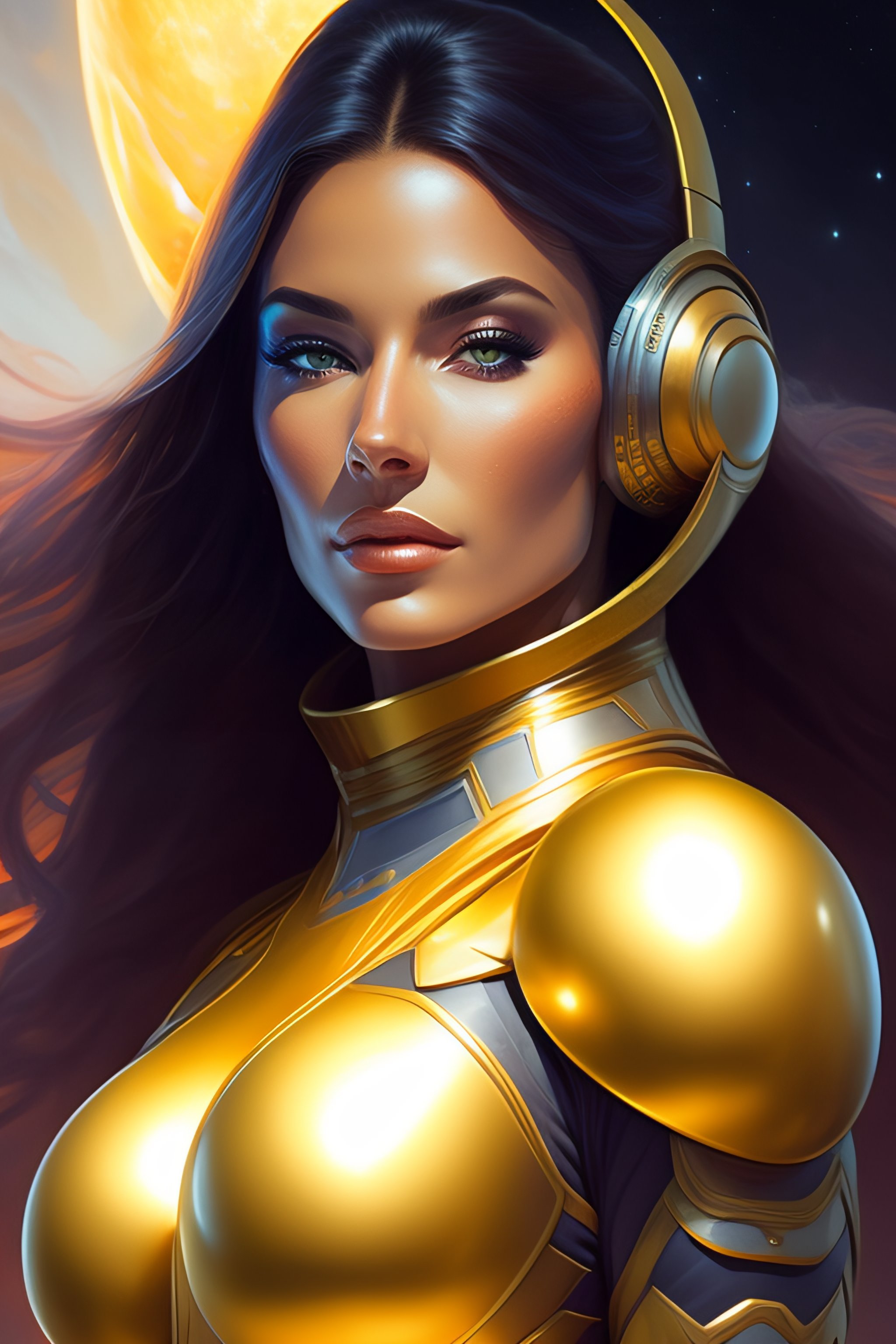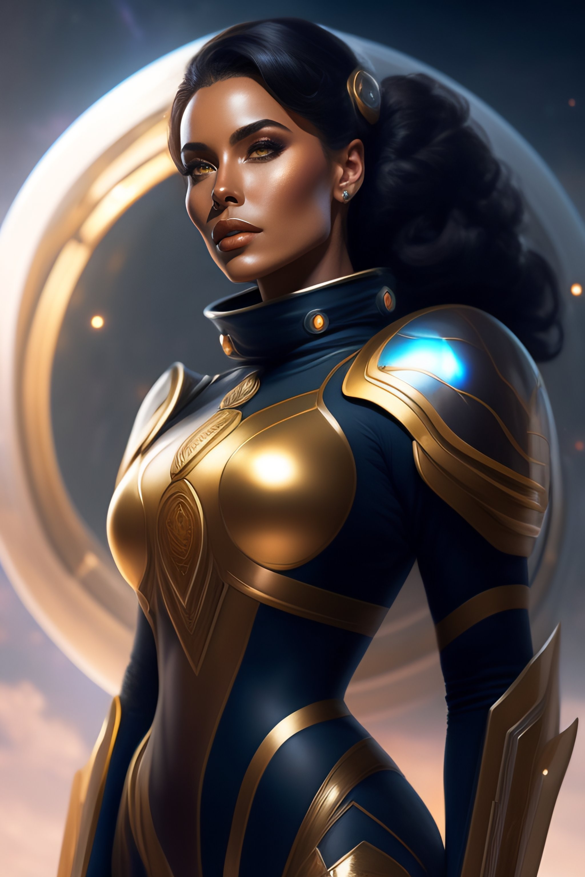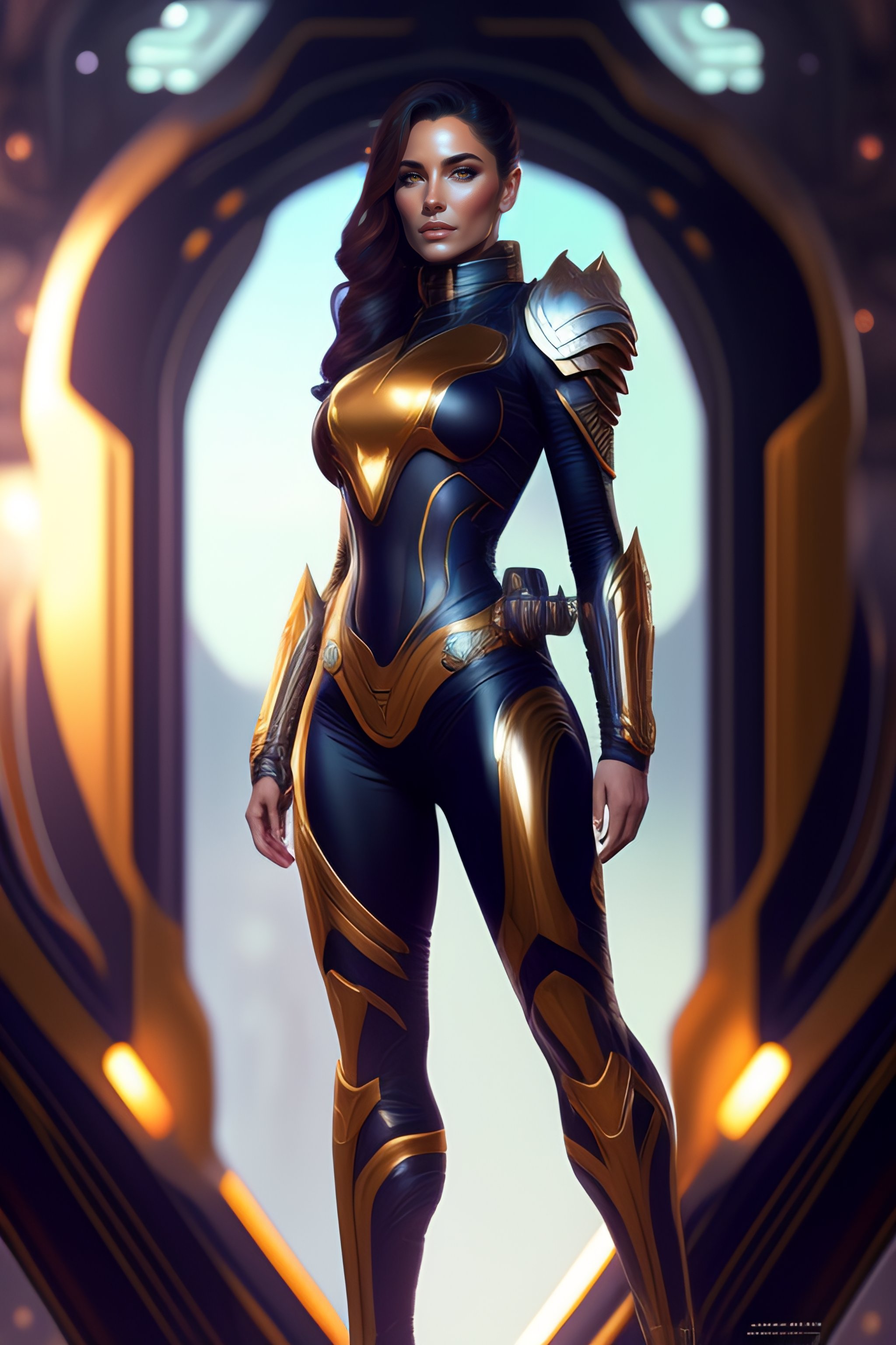 Portrait of a beautiful full body female space captain default pose, d & d, fantasy, front light, intricate, muscular, highly detailed, digital painting, artstation, concept art, smooth, sharp focus, illustration, art by simon bisley and greg rutkowski and alphonse mucha, 8 k, spaceship bridge on background