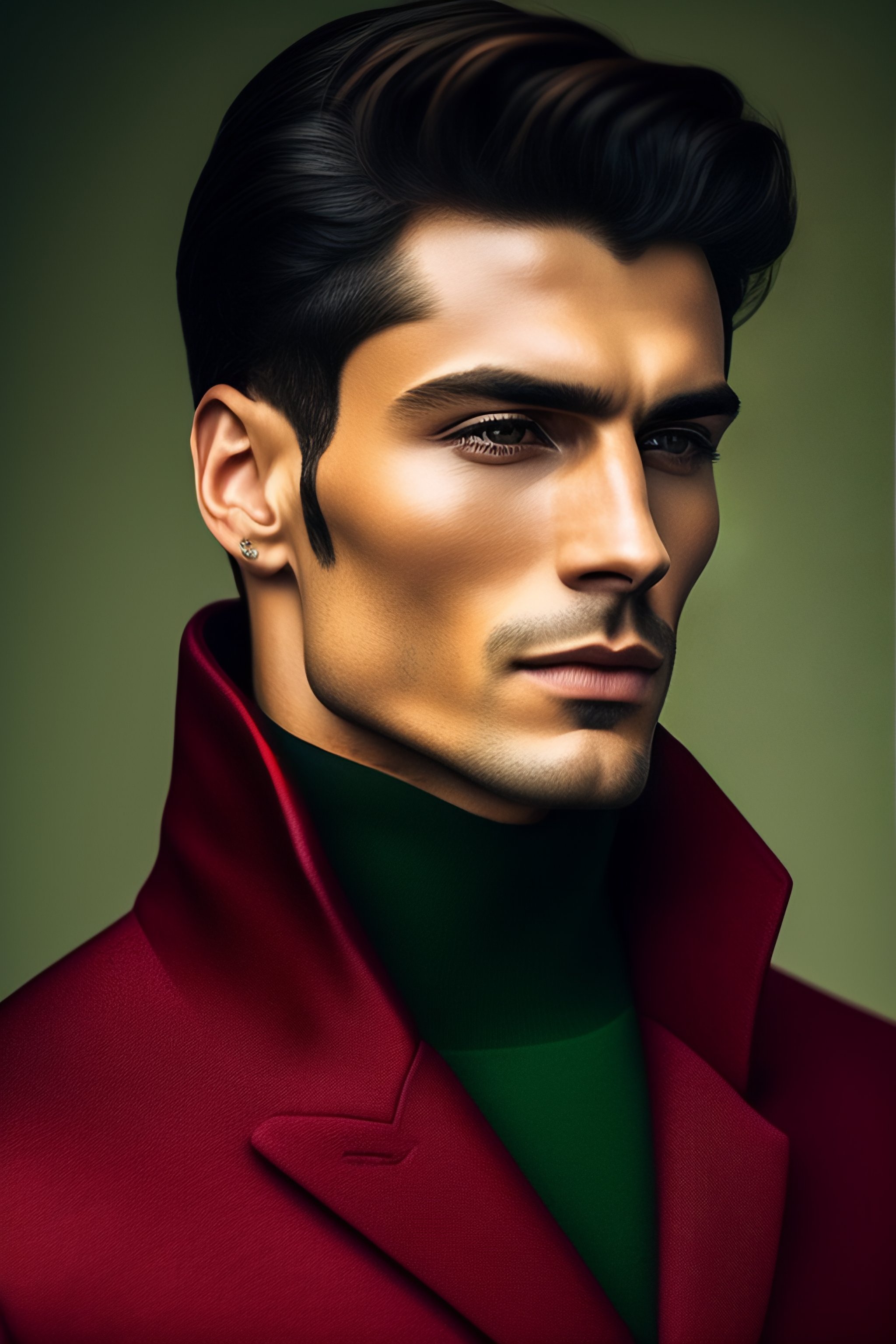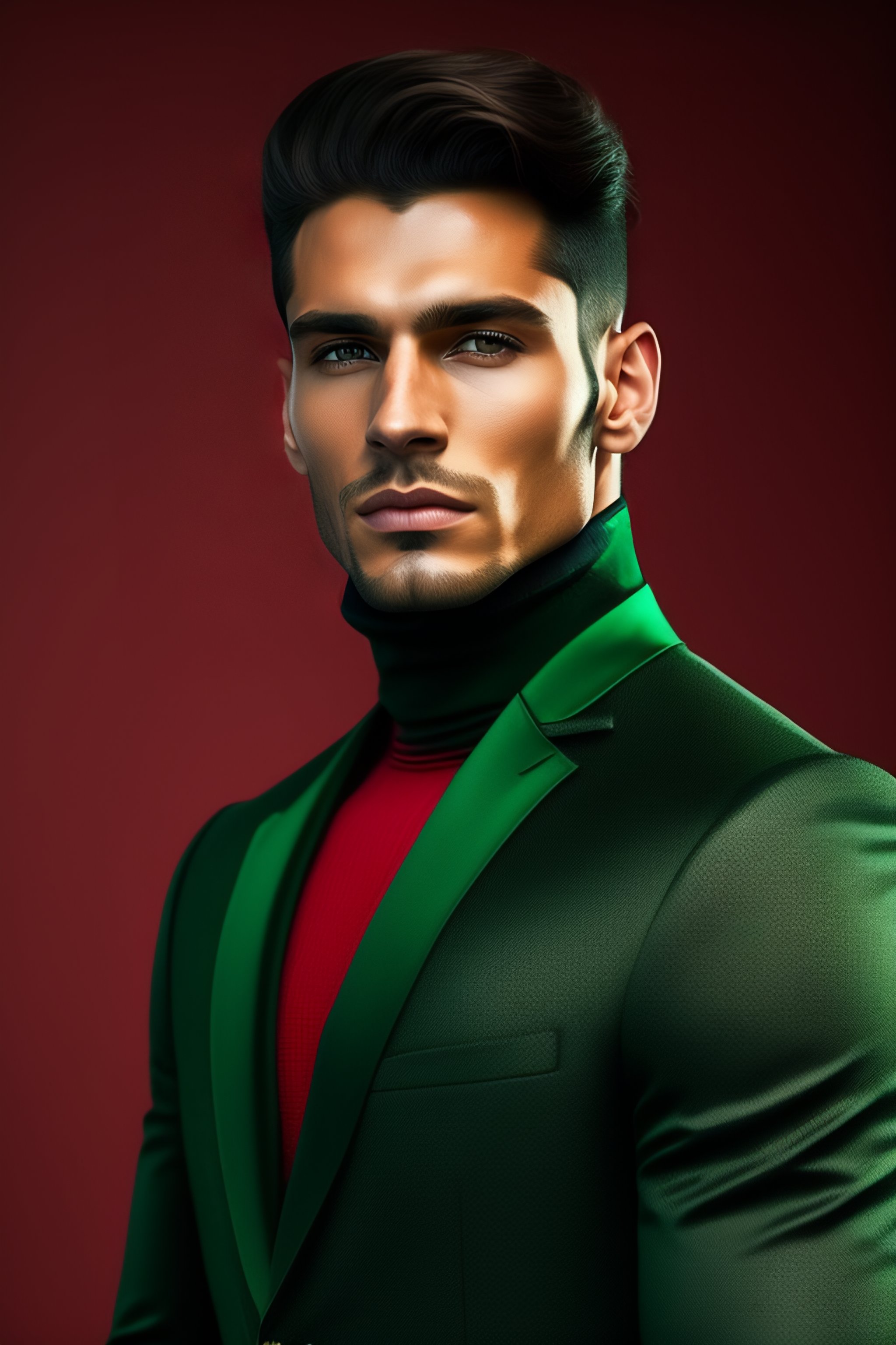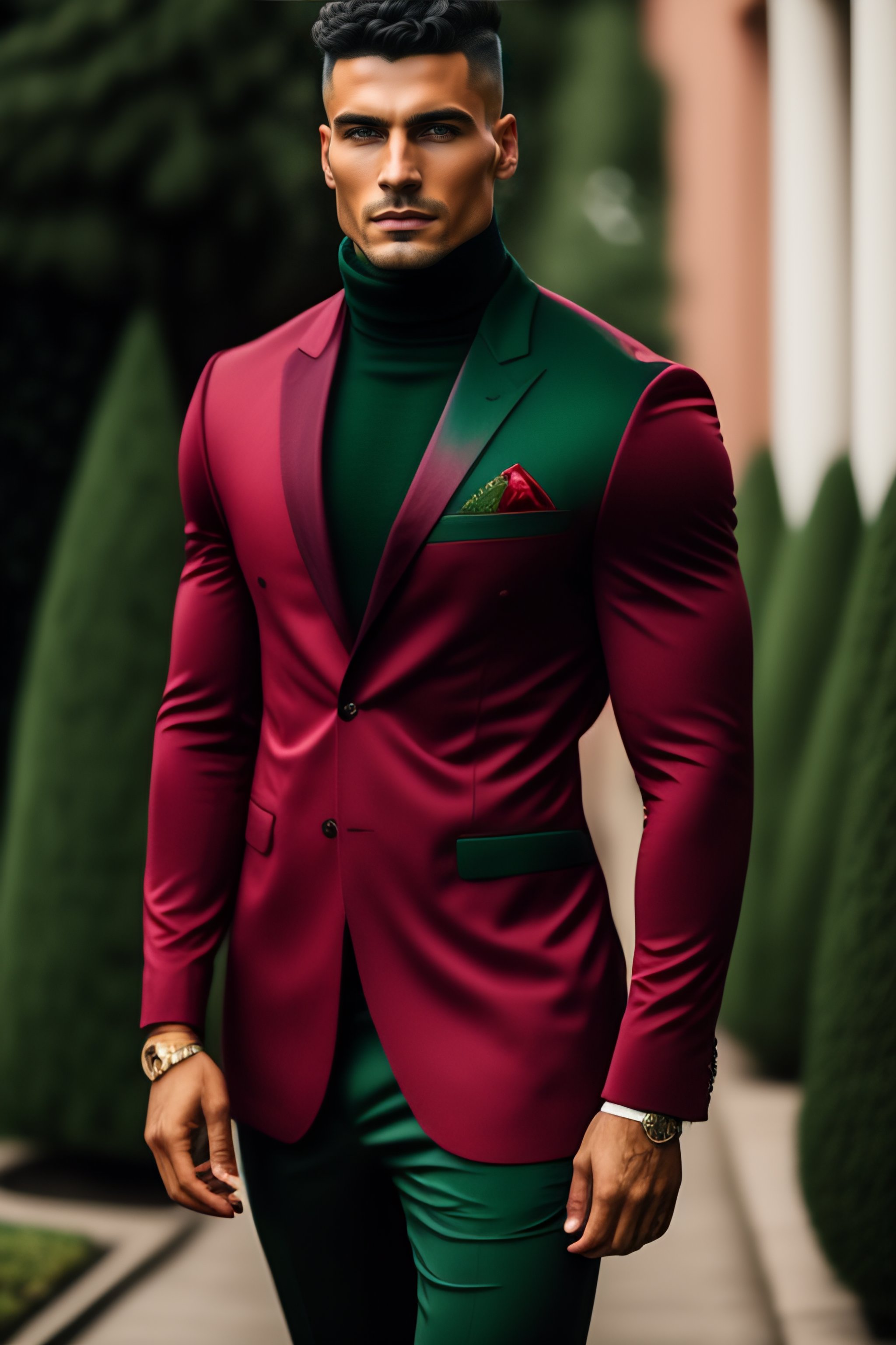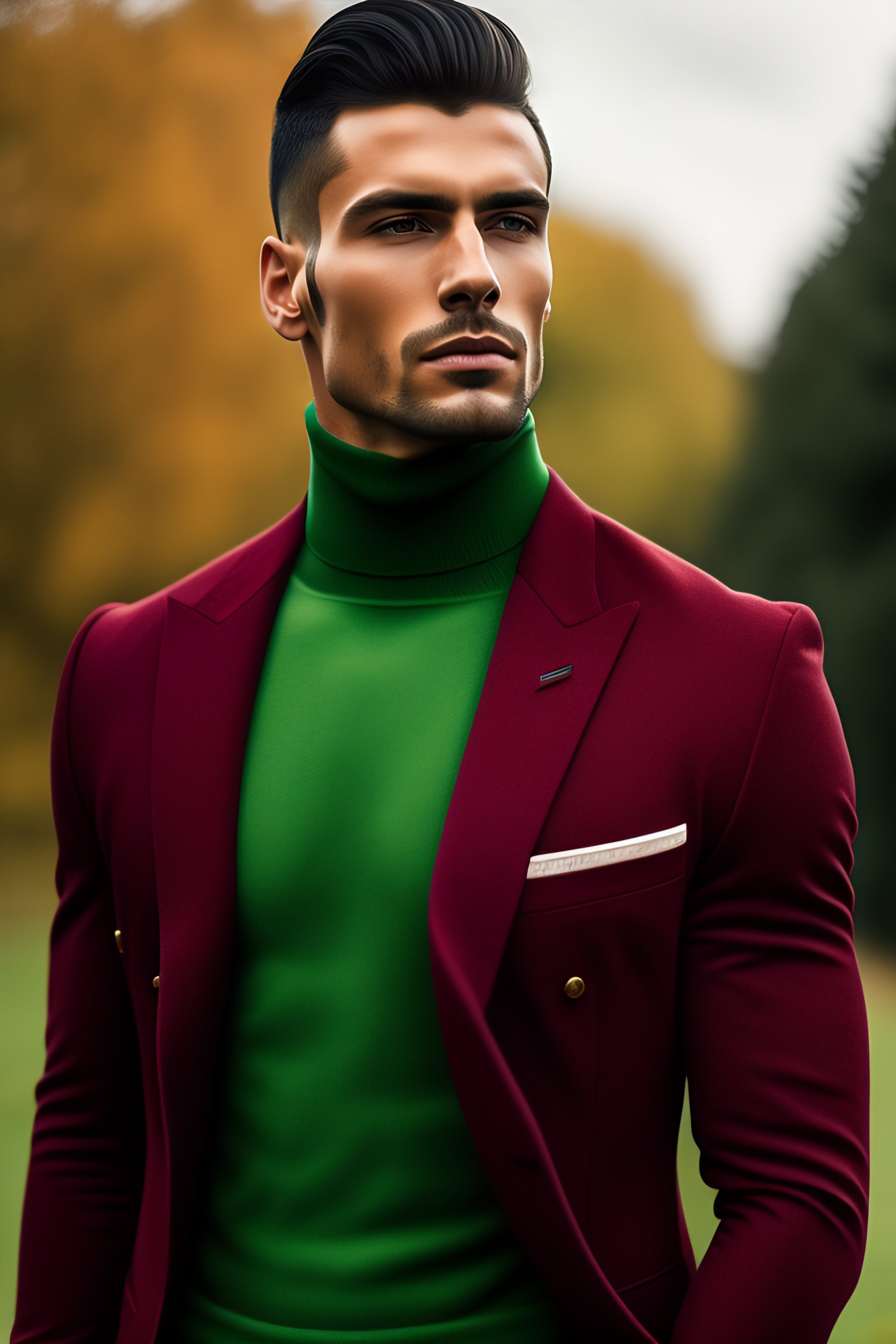 A romanian man wearing a maroon turtleneck and a dark green suit