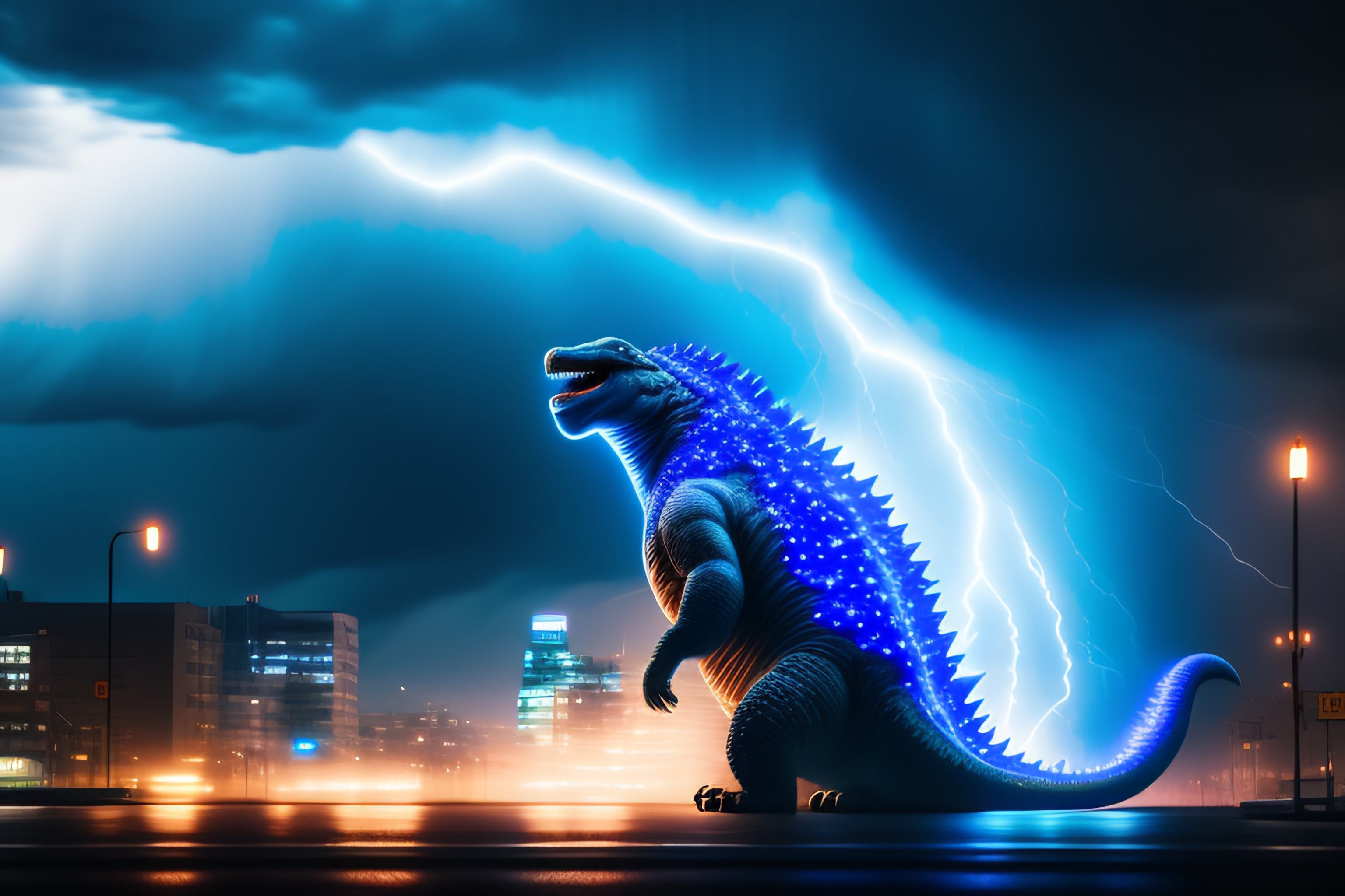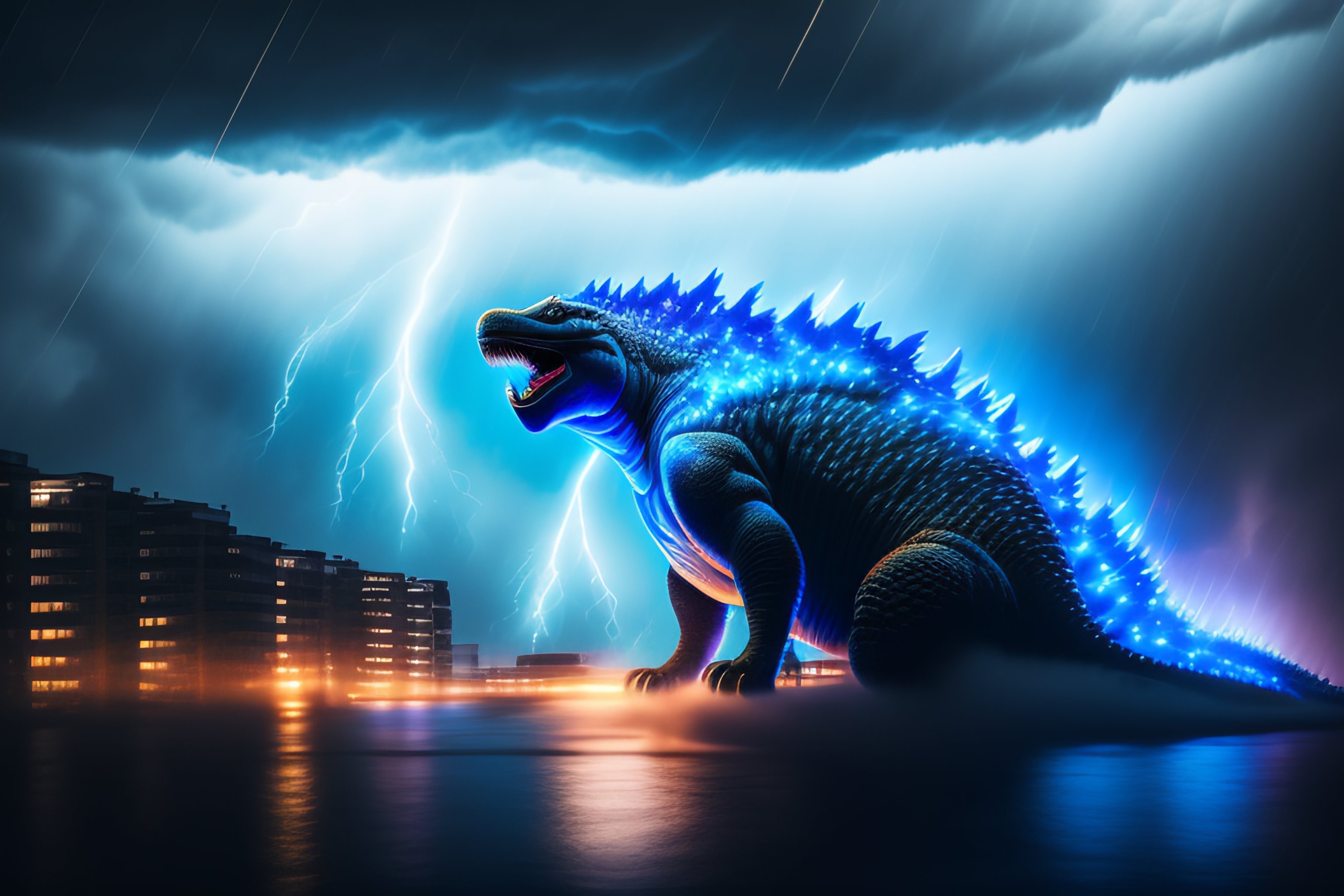 Hyperrealistic godzilla in a violent storm in the night with violent blue-colored lightning emitting from his body. cinematic, hyper realistic, broad view