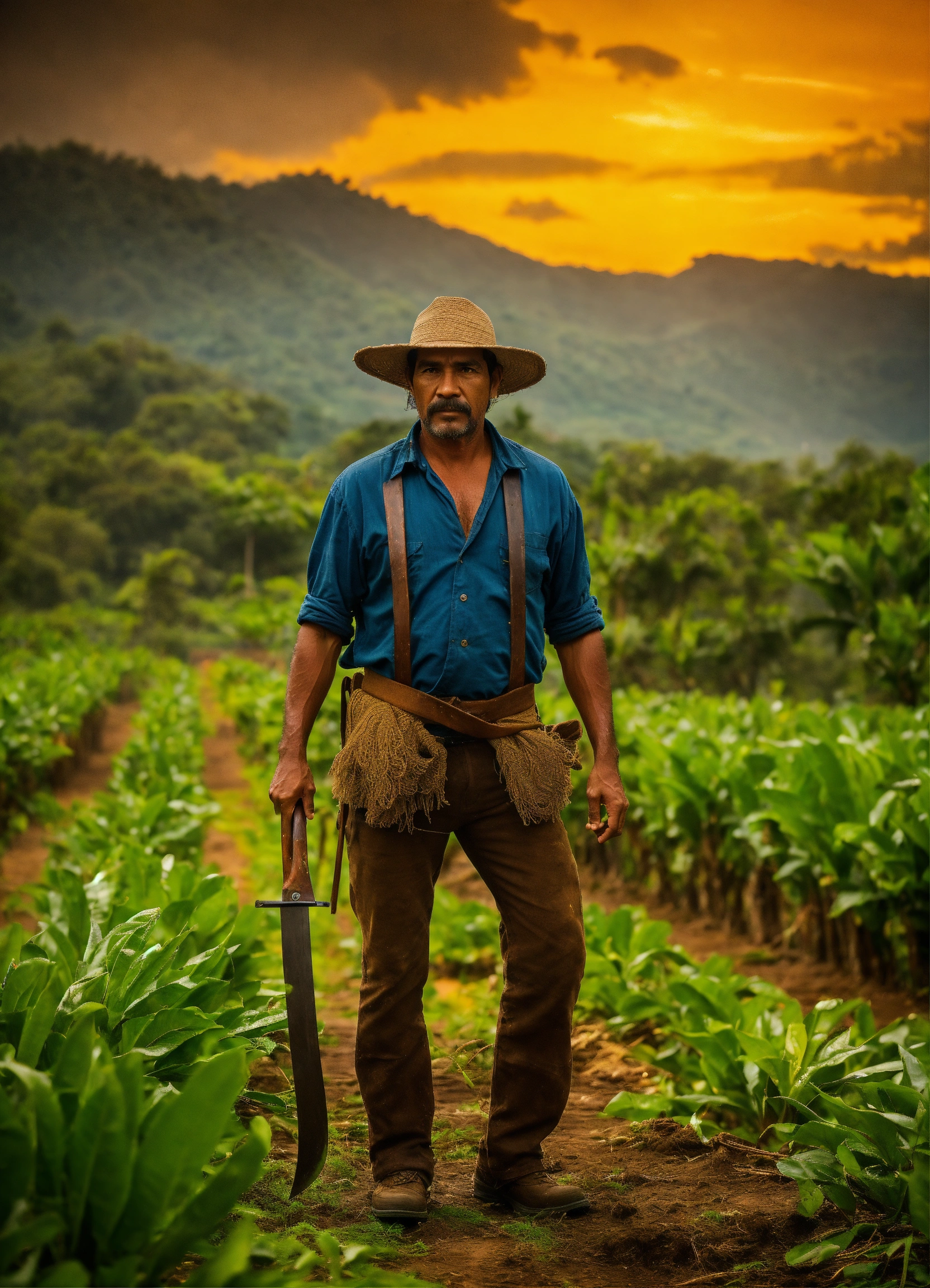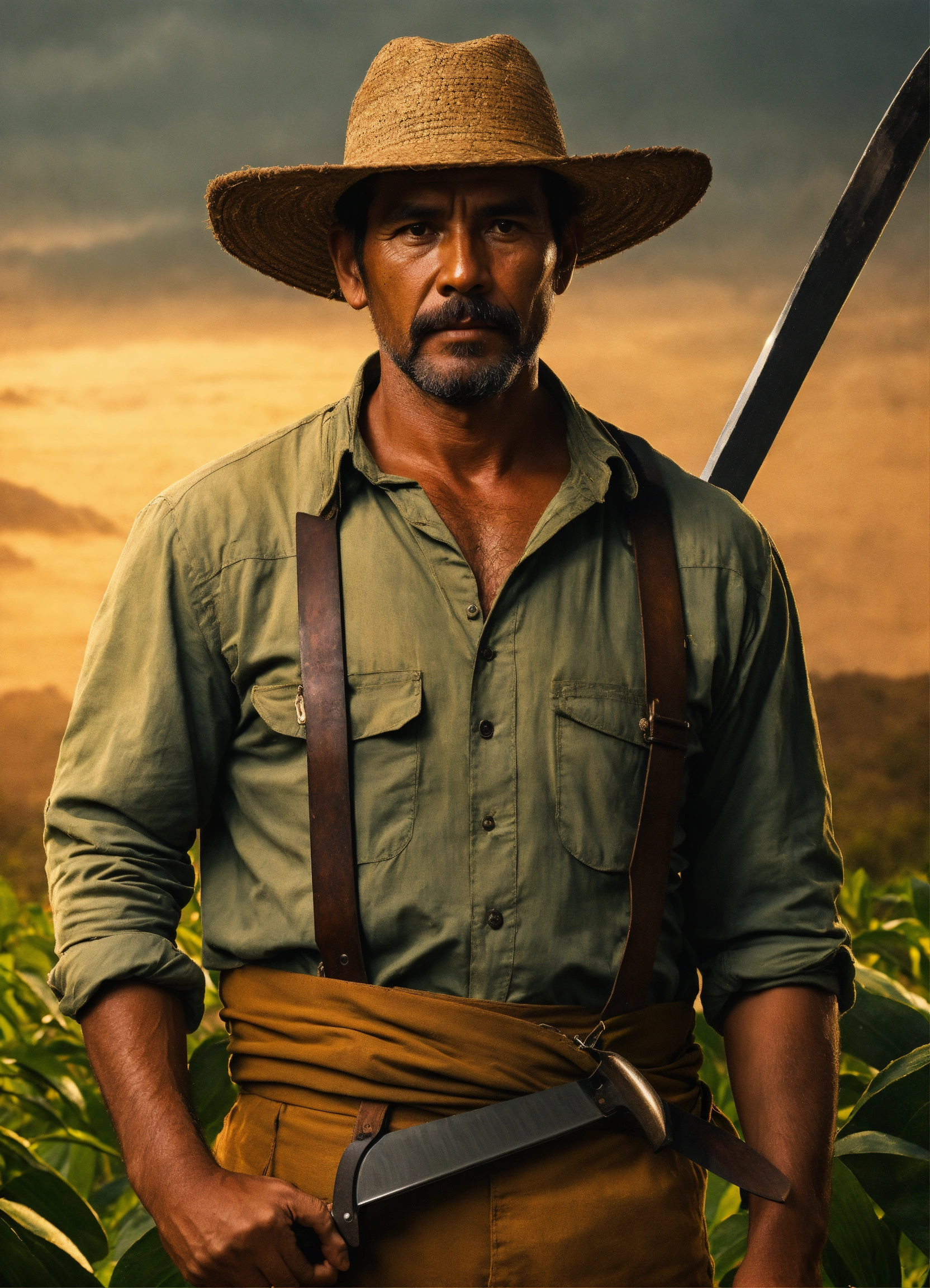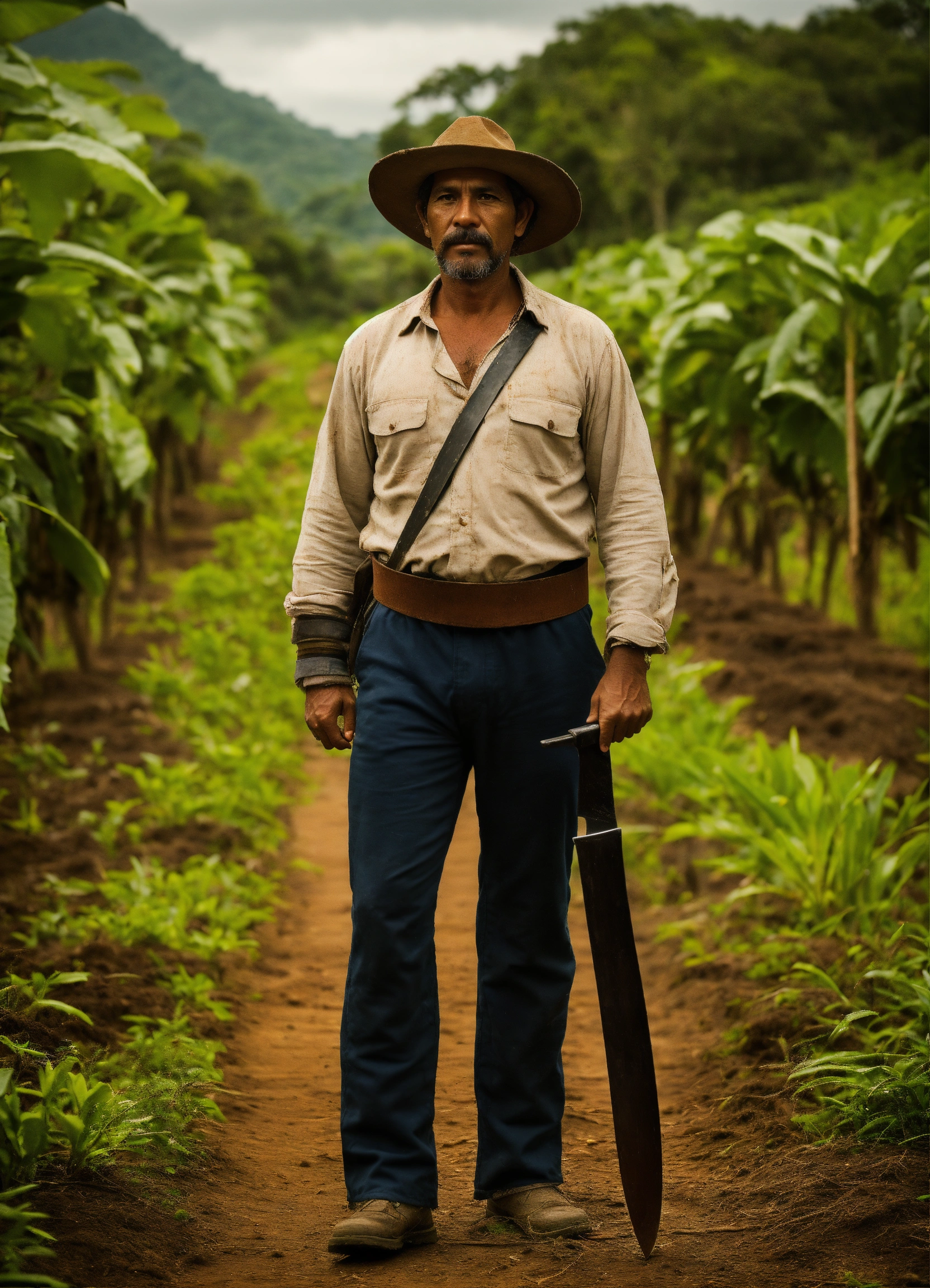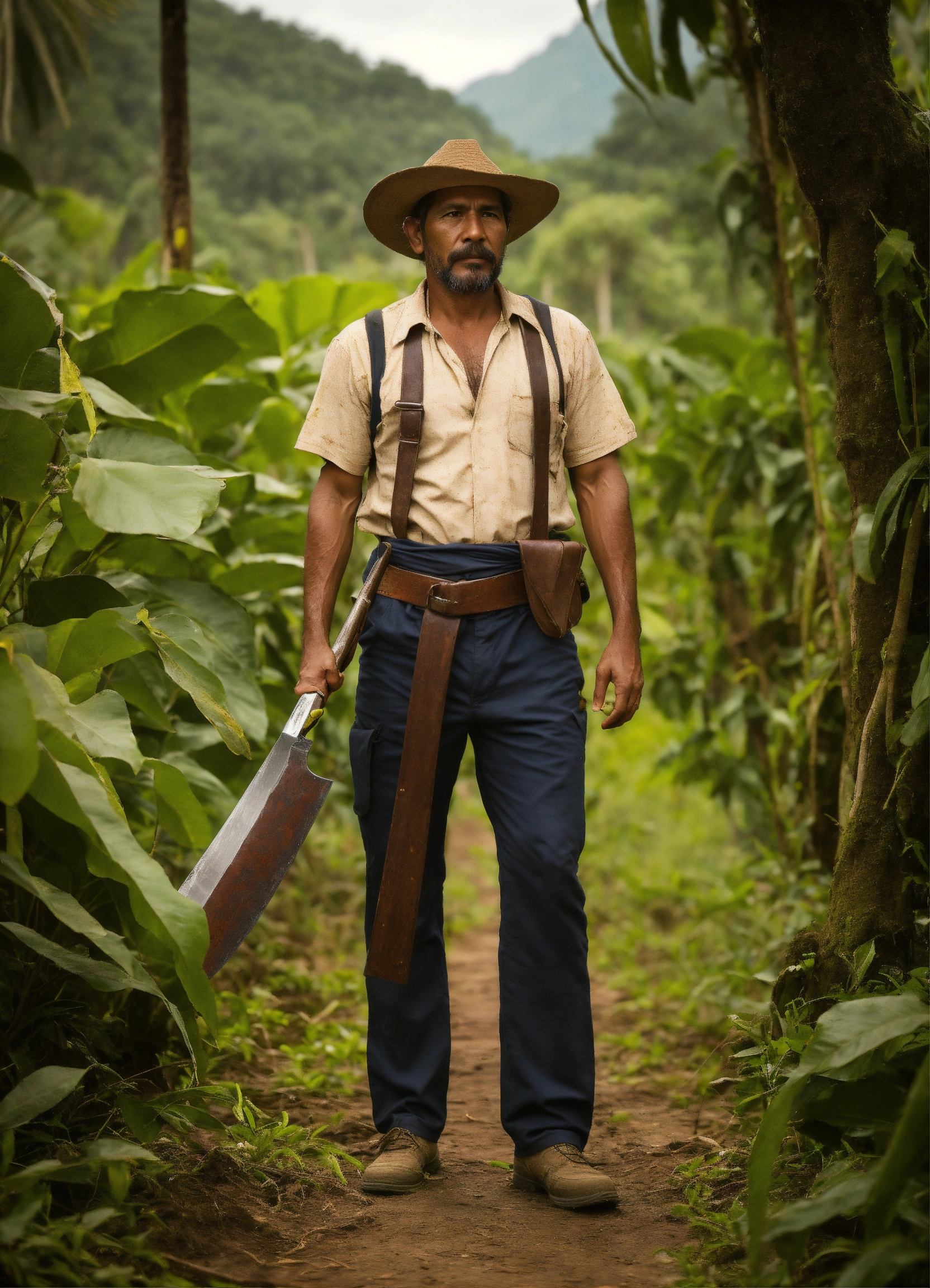 A costa rican farmer in his 40s with a machete hanging from his waist in the style of the arcane series